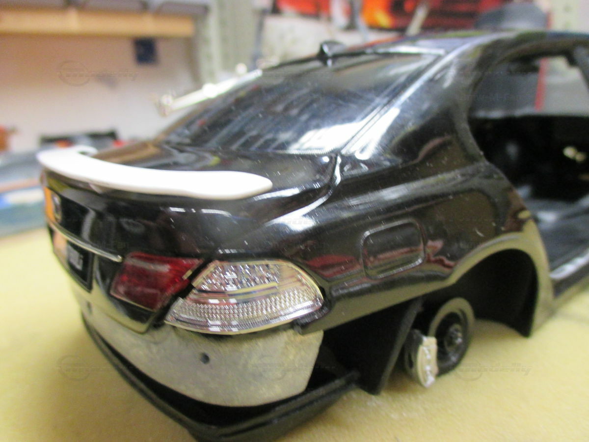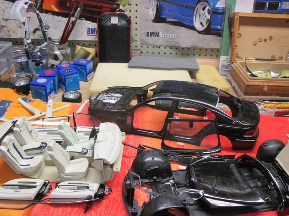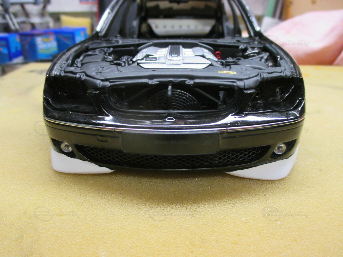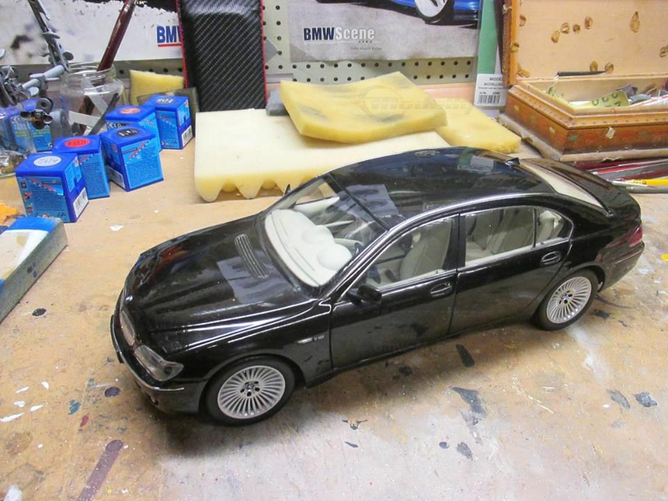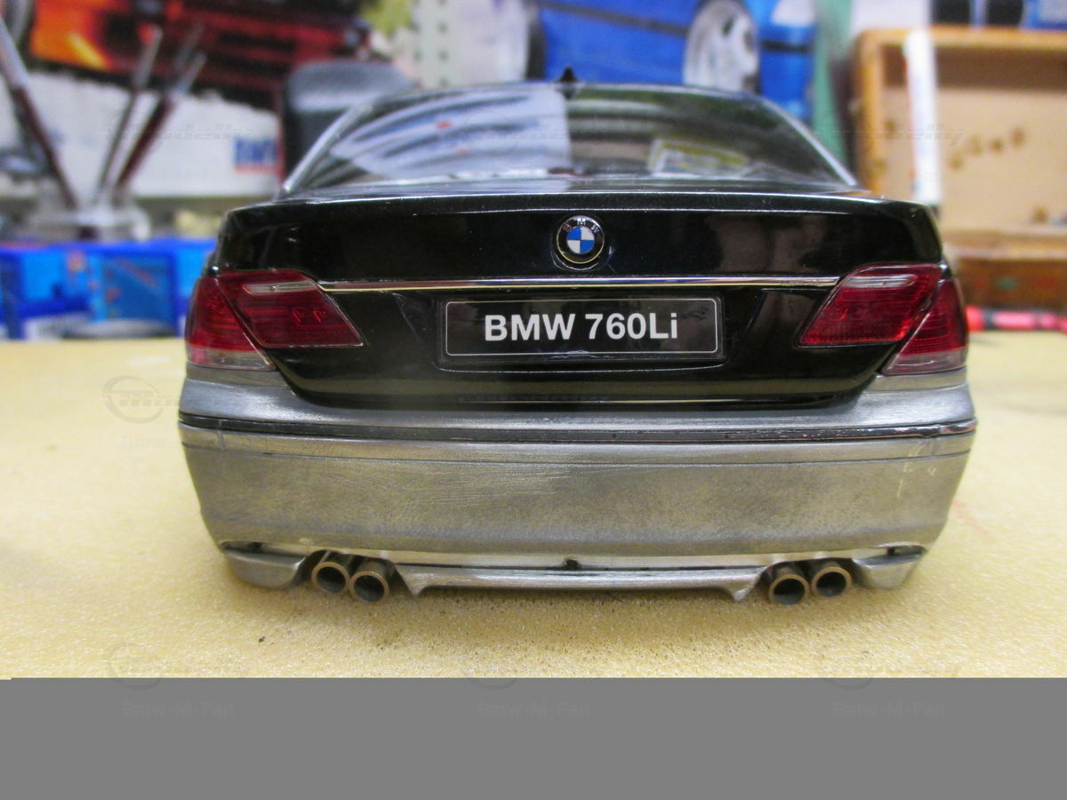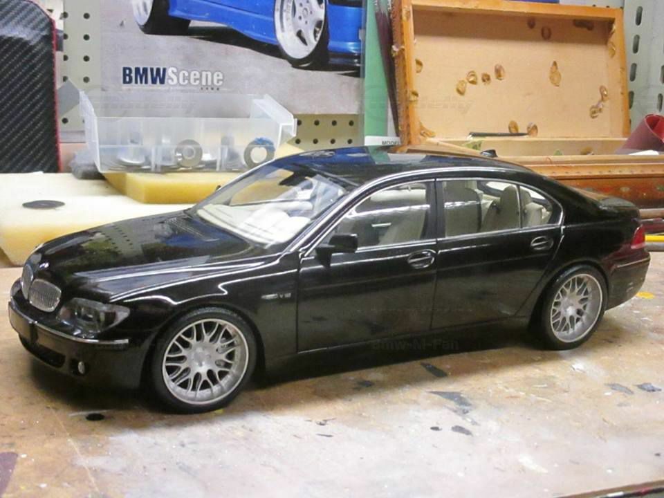 The model car shown here in 1/18 scale was manufactured by Kyosho. It is a precision replica of the BMW E66 760li. The model is made from diecast material and exhibits a high level of detail accuracy. It is worth noting that the displayed model is modified and does not represent the original product manufactured by Kyosho. This model belongs to the collection of "Modelly" member "Bmw-M-Fan". This modified version was particularly valued for its attention to detail and the distinctive black exterior. The external features, including the Hamann body kit, differentiate the model from the stock version.