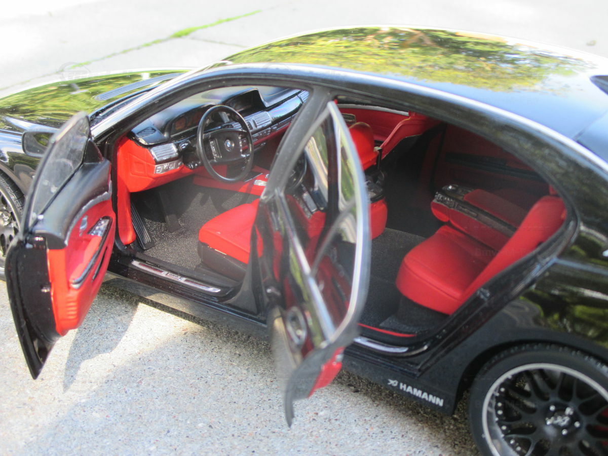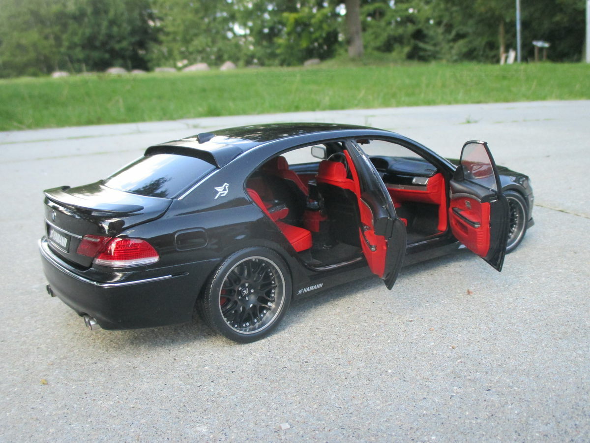 The BMW E66 760li model by Kyosho in 1/18 scale, crafted from diecast material, is an impressive replica of the original. However, the undertaken modifications give this model a unique touch, setting it apart from others and making it special for model car enthusiasts. The modified elements like the Hamann grille and BBS wheels contribute to a sportier appearance. Additionally, the finely tuned glossy black paint with red accents in the interior sets this model apart from many other reproductions, making it an exquisite collector's item that will surely captivate the hearts of many automotive enthusiasts.