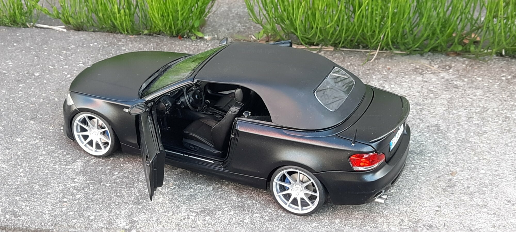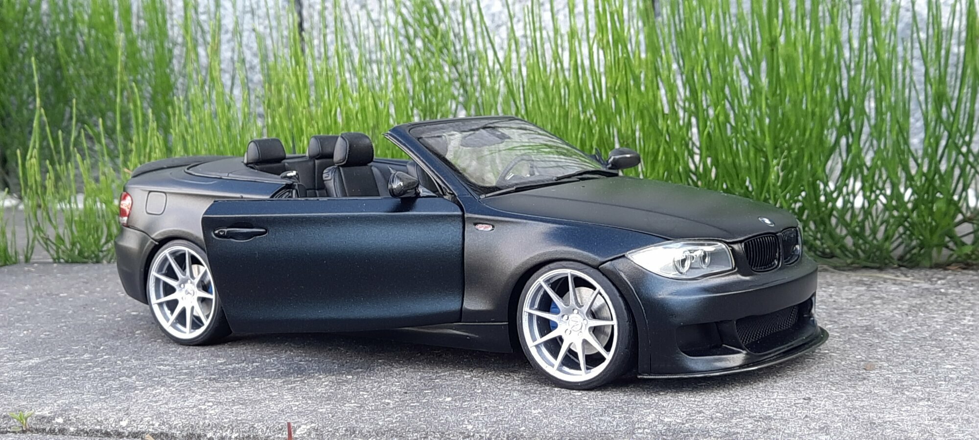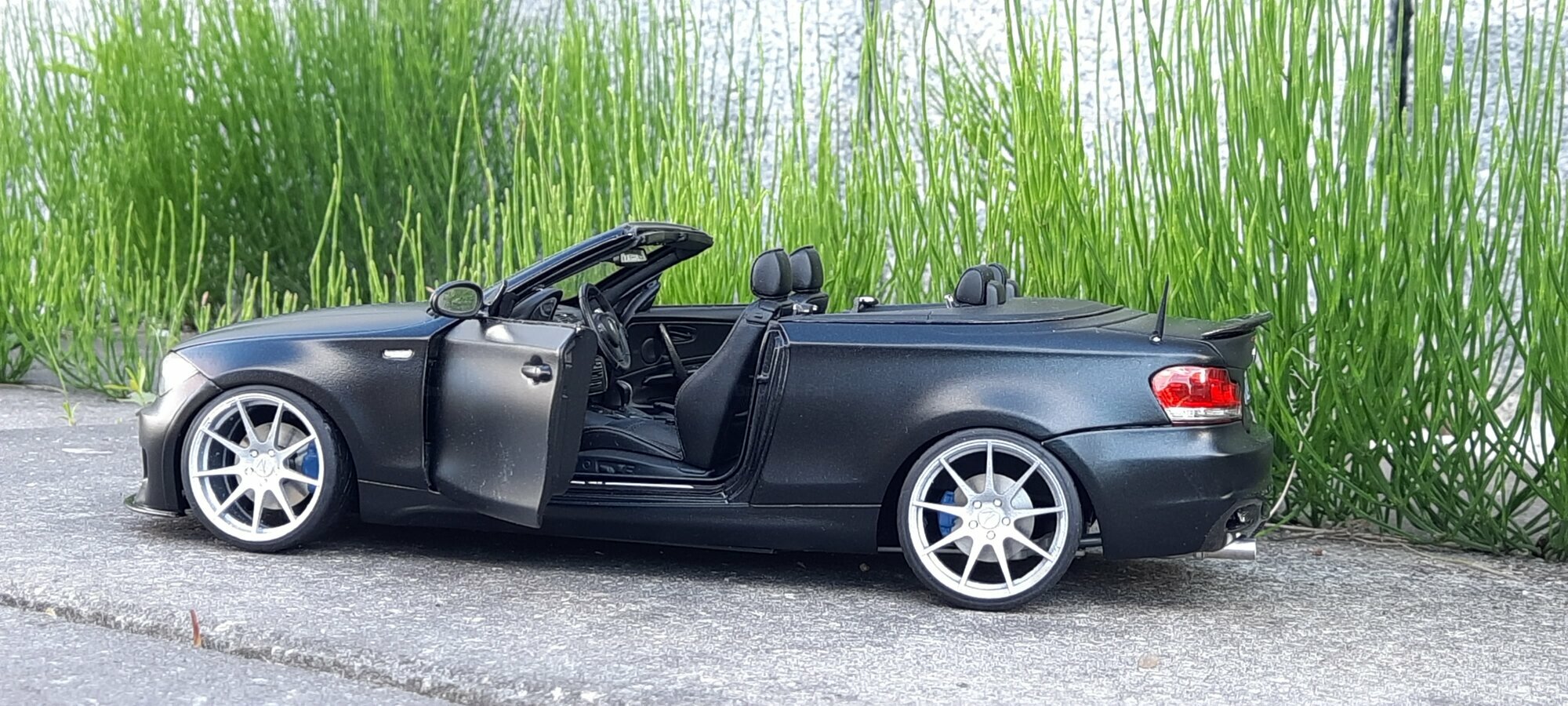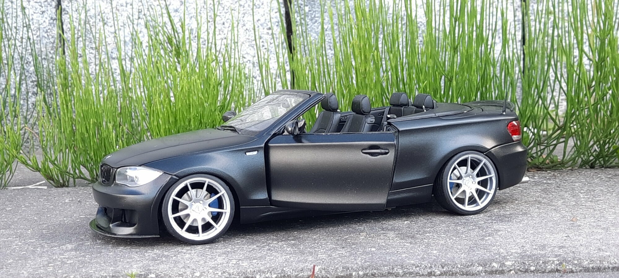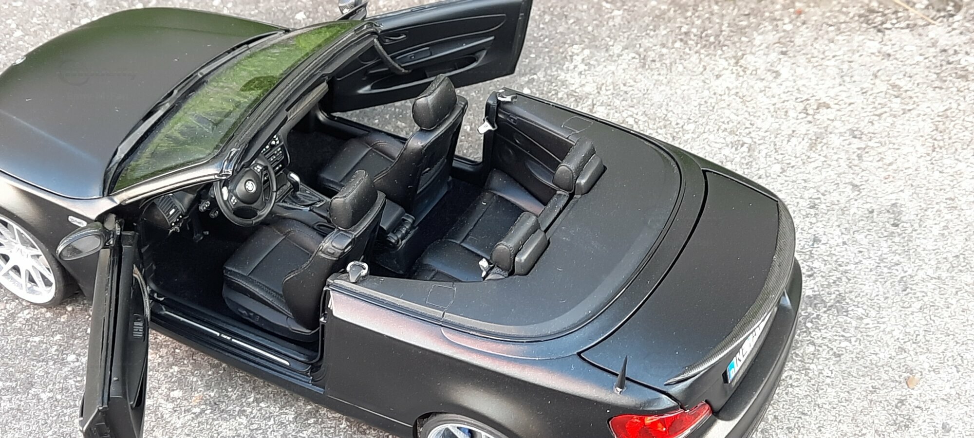 From the pictures, it can be seen that this model features special BBS wheels, a well-known manufacturer of high-quality alloy wheels. The specific wheel models contribute to the sporty look of the vehicle. The model's paint is matte black, giving the vehicle a modern and elegant appearance. The blue brake calipers, contrasting with the black body, are also eye-catching. The convertible's roof is shown in the open position, reflecting the sporty and open driving experience of the original. Such details make this model a valuable piece for collectors.