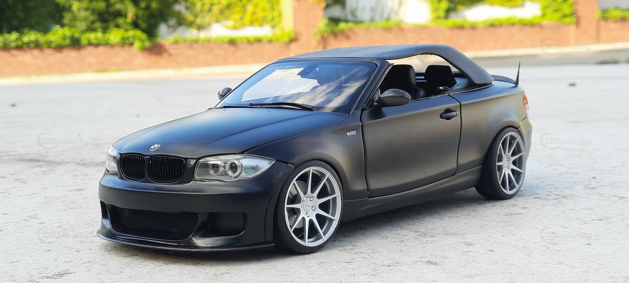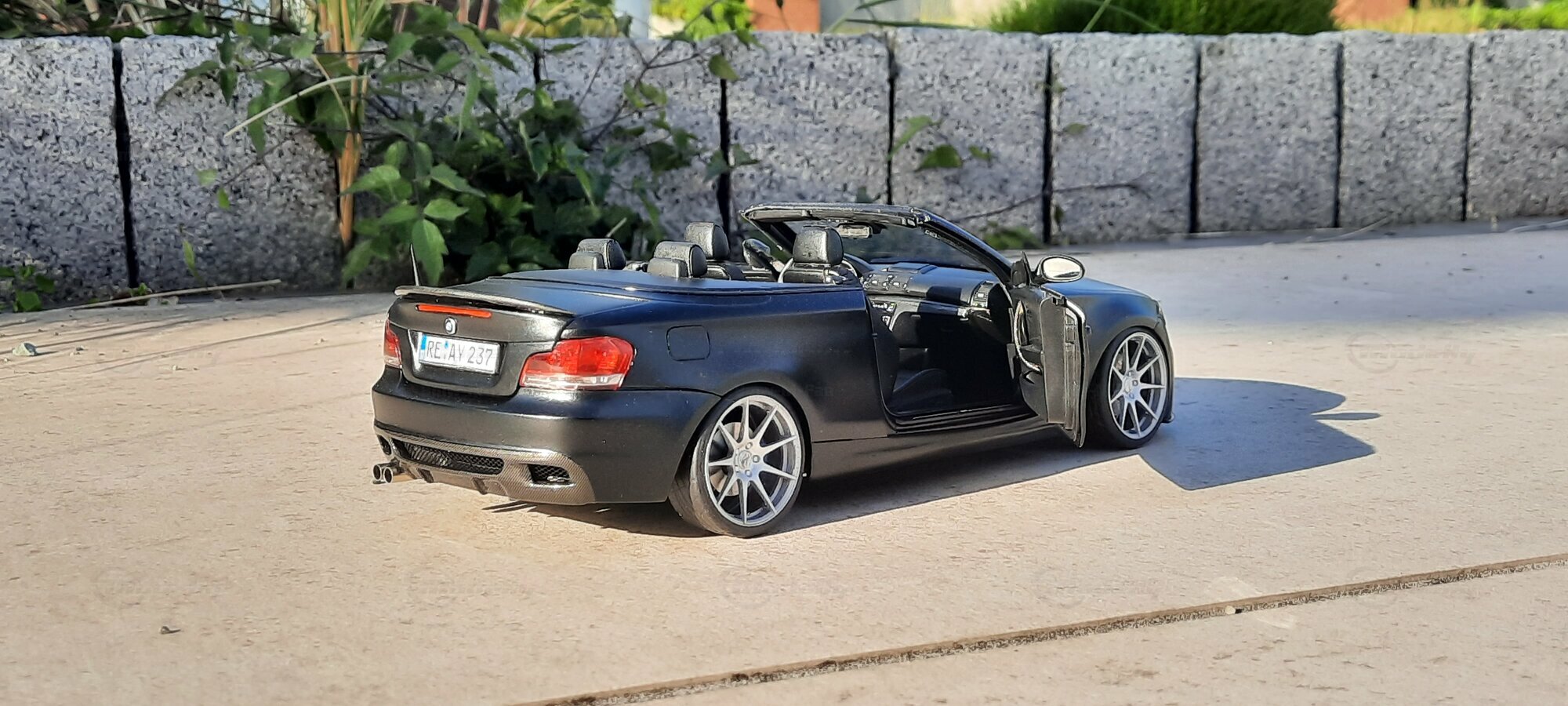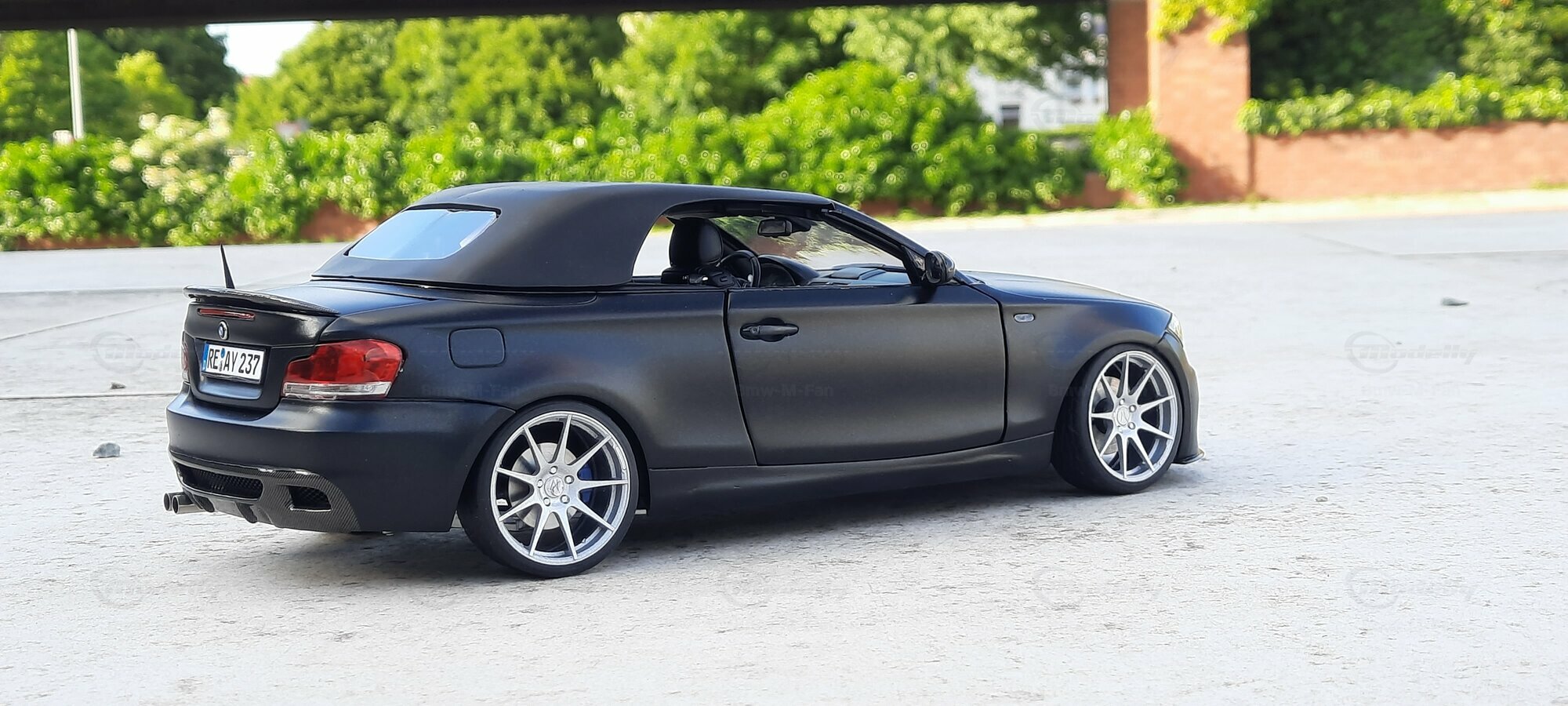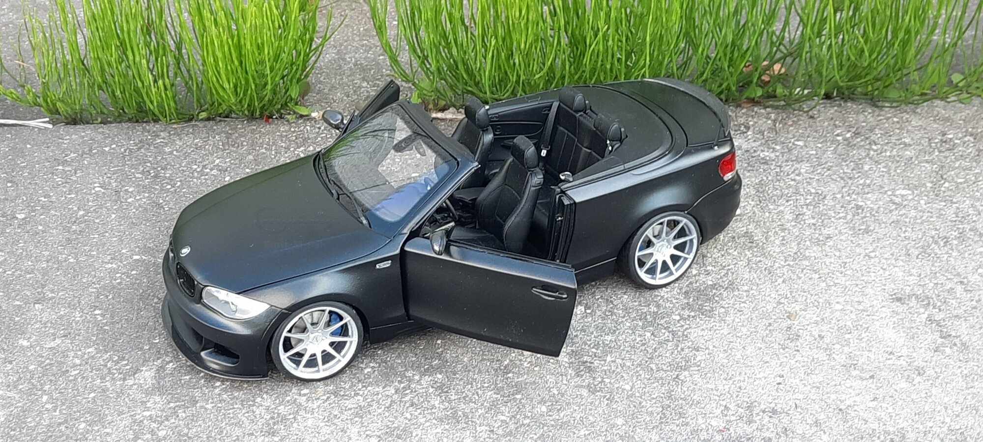 From the pictures, it can be seen that this model features special BBS wheels, a well-known manufacturer of high-quality alloy wheels. The specific wheel models contribute to the sporty look of the vehicle. The model's paint is matte black, giving the vehicle a modern and elegant appearance. The blue brake calipers, contrasting with the black body, are also eye-catching. The convertible's roof is shown in the open position, reflecting the sporty and open driving experience of the original. Such details make this model a valuable piece for collectors.