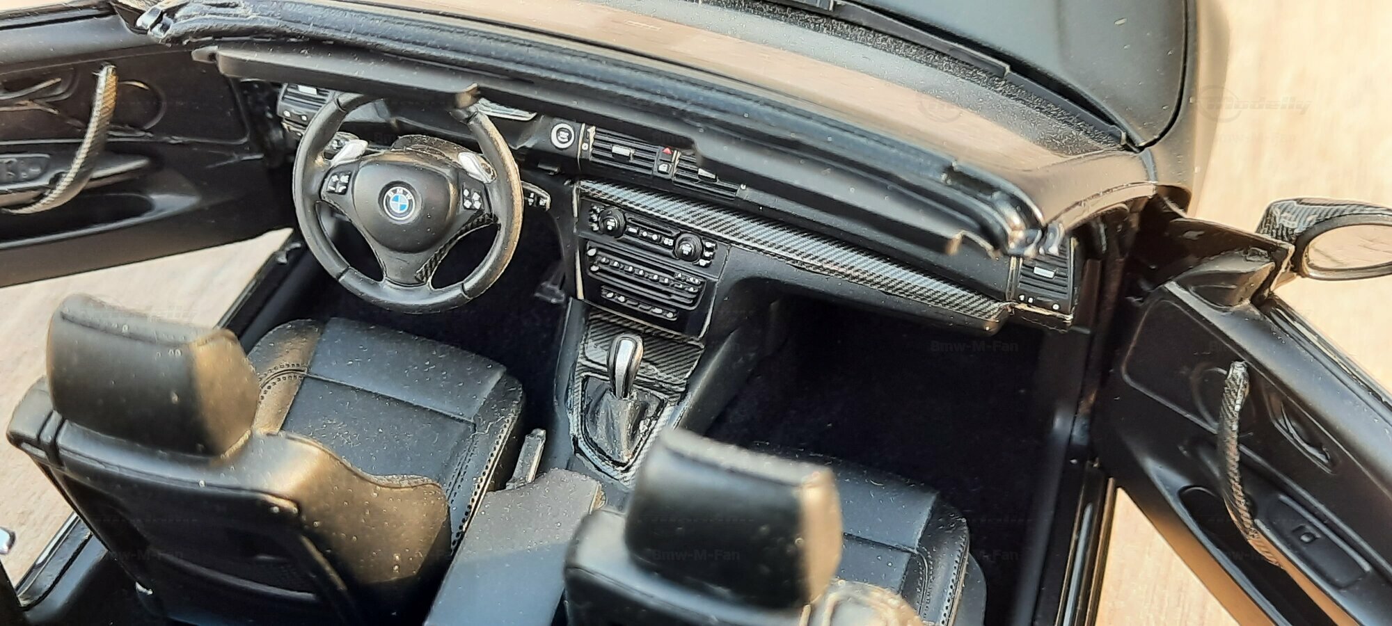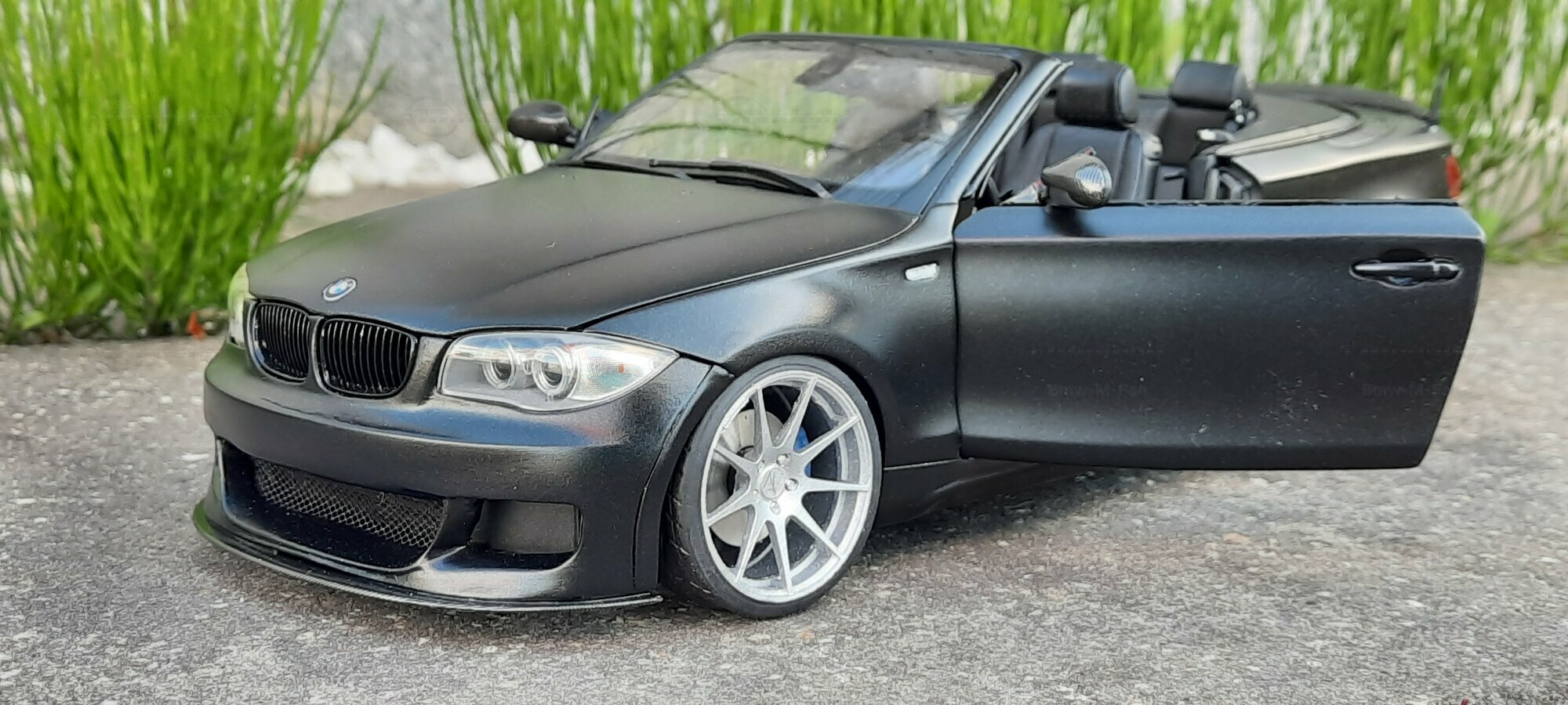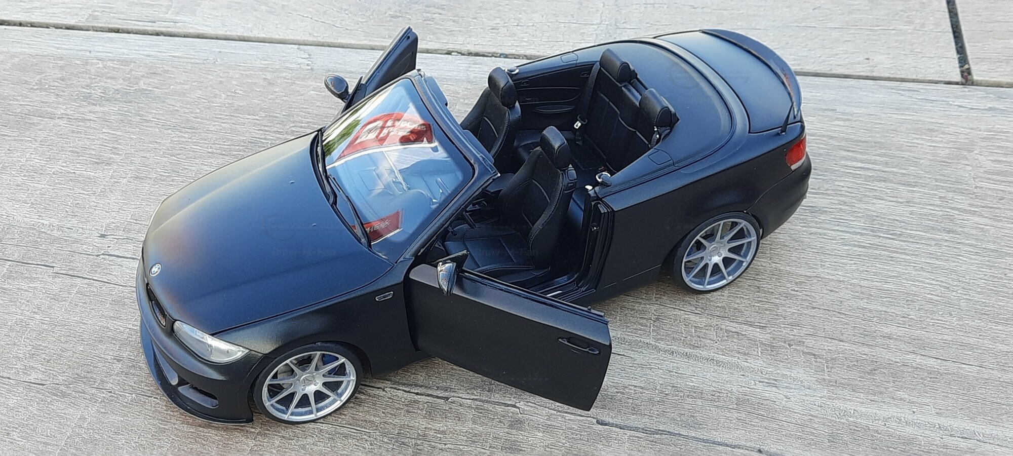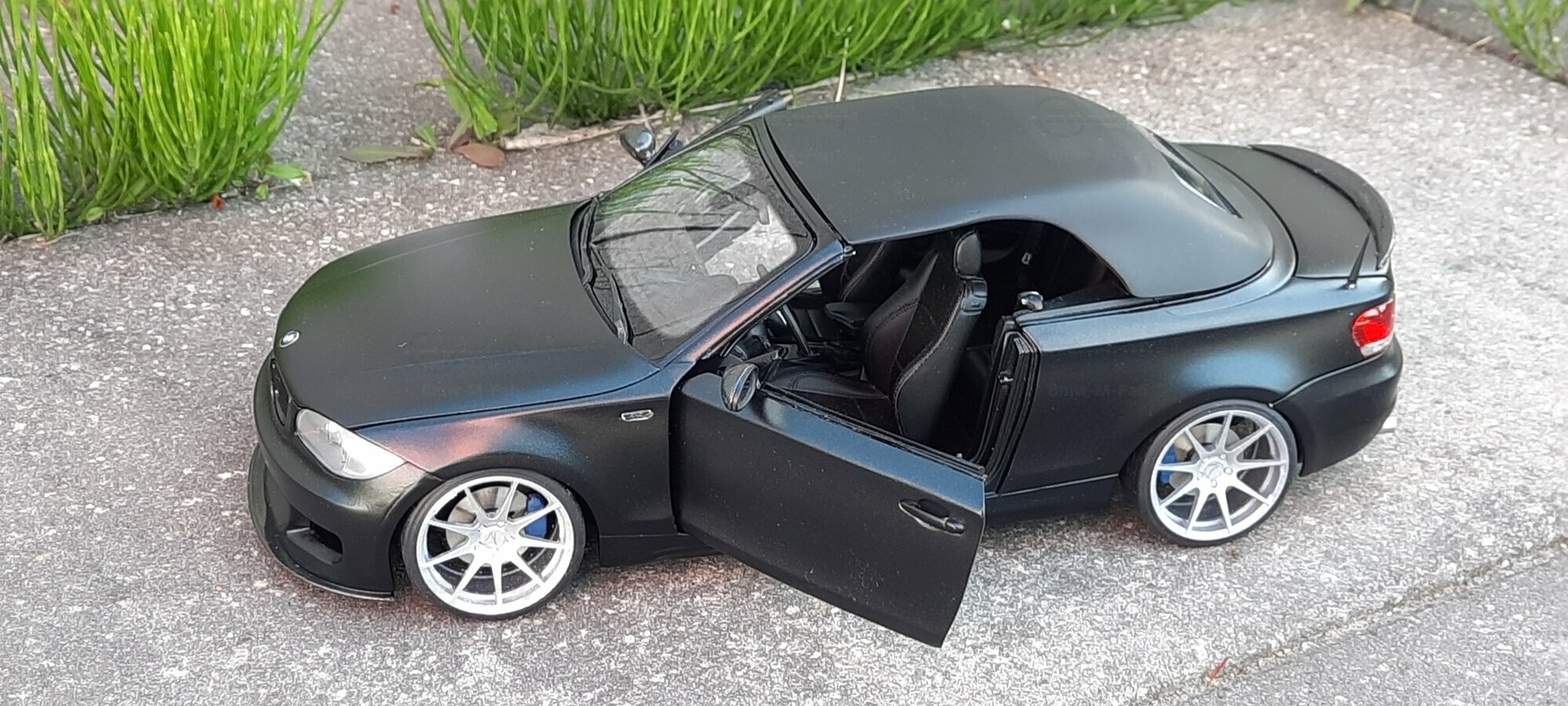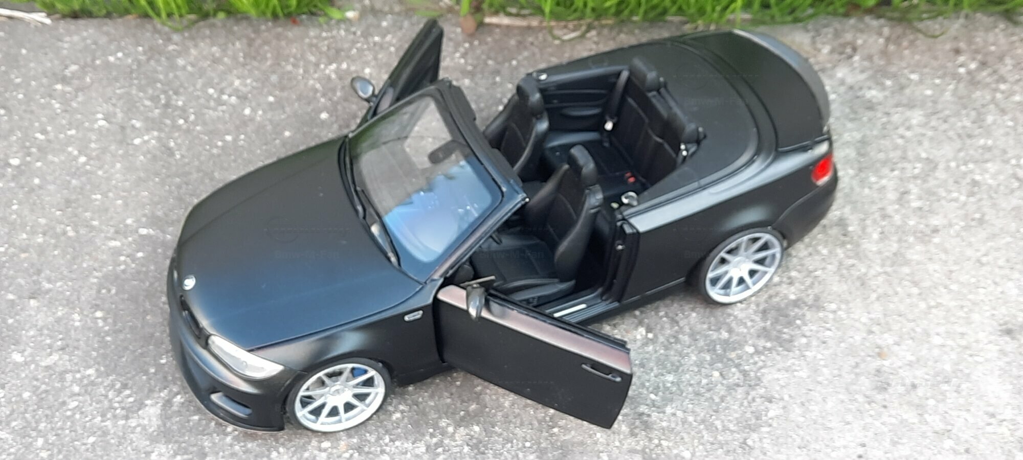 From the pictures, it can be seen that this model features special BBS wheels, a well-known manufacturer of high-quality alloy wheels. The specific wheel models contribute to the sporty look of the vehicle. The model's paint is matte black, giving the vehicle a modern and elegant appearance. The blue brake calipers, contrasting with the black body, are also eye-catching. The convertible's roof is shown in the open position, reflecting the sporty and open driving experience of the original. Such details make this model a valuable piece for collectors.
