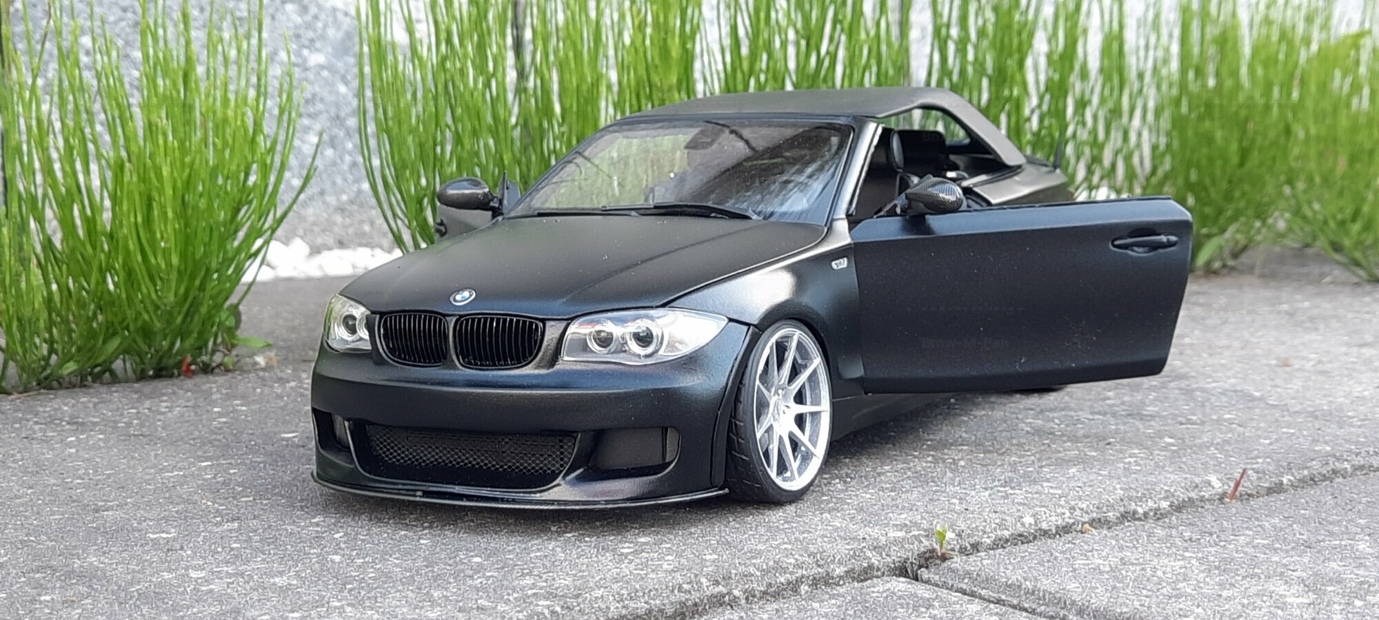 The 1/18 scale model car by Kyosho shown here is a miniature version of the BMW E82 120i "Individual". The model is made of high-quality diecast material and impresses with its attention to detail. It is important to note that this model has been modified and does not represent the product originally produced by Kyosho. The modifications are individually designed, making this model a unique collector's item in the collection of Modelly member "Bmw-M-Fan".