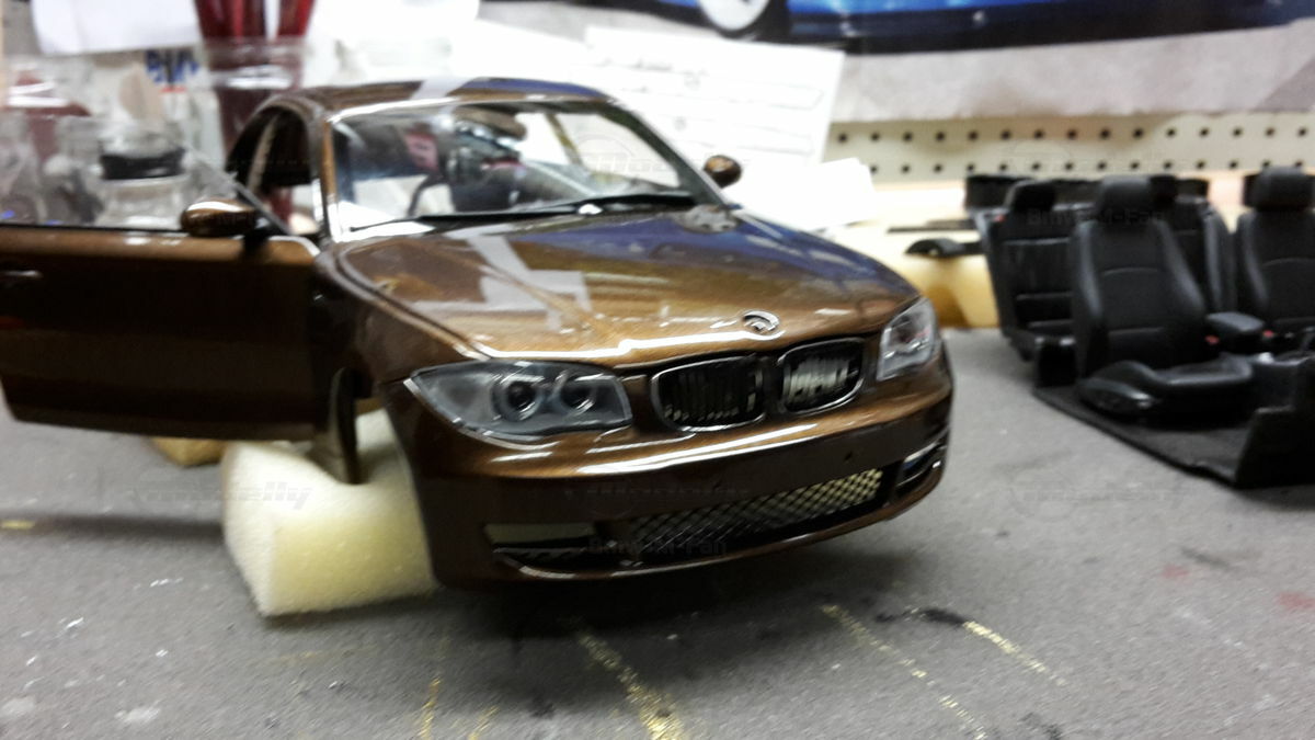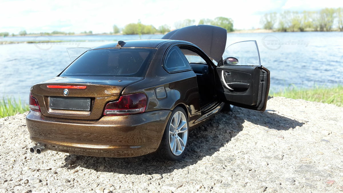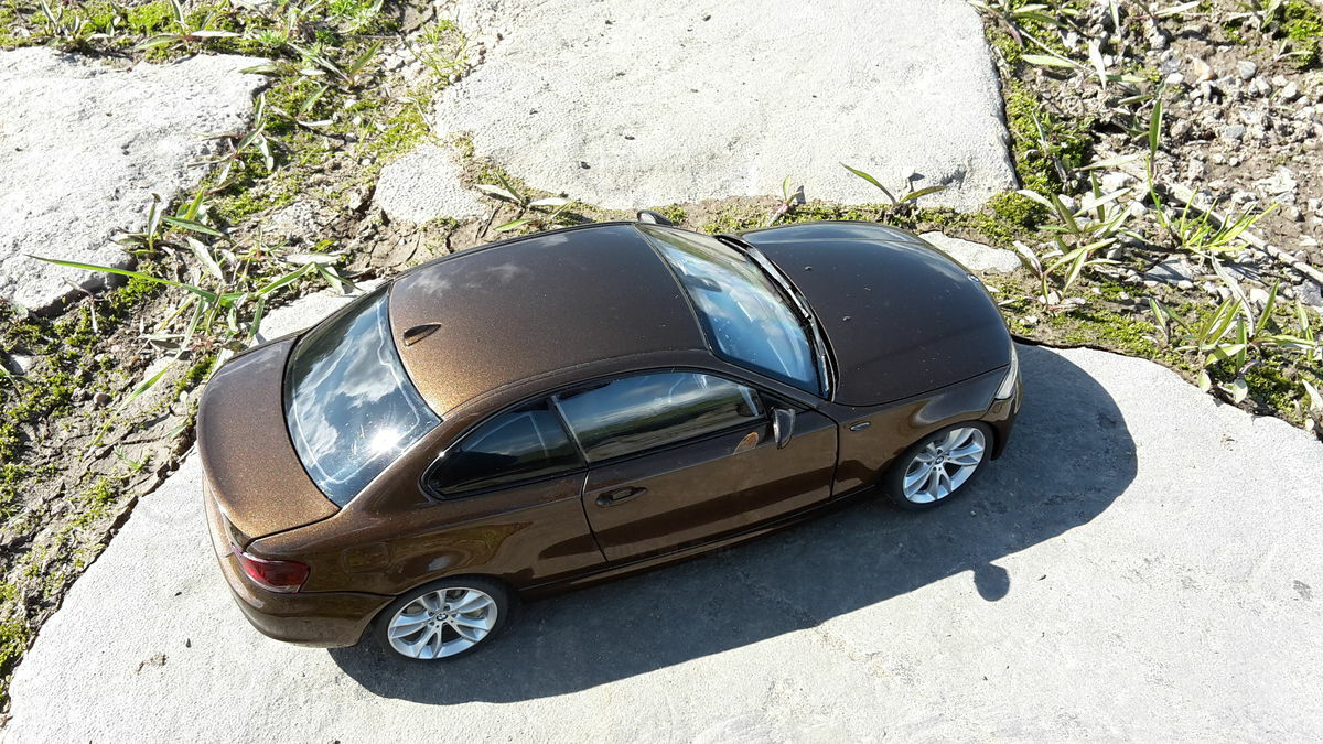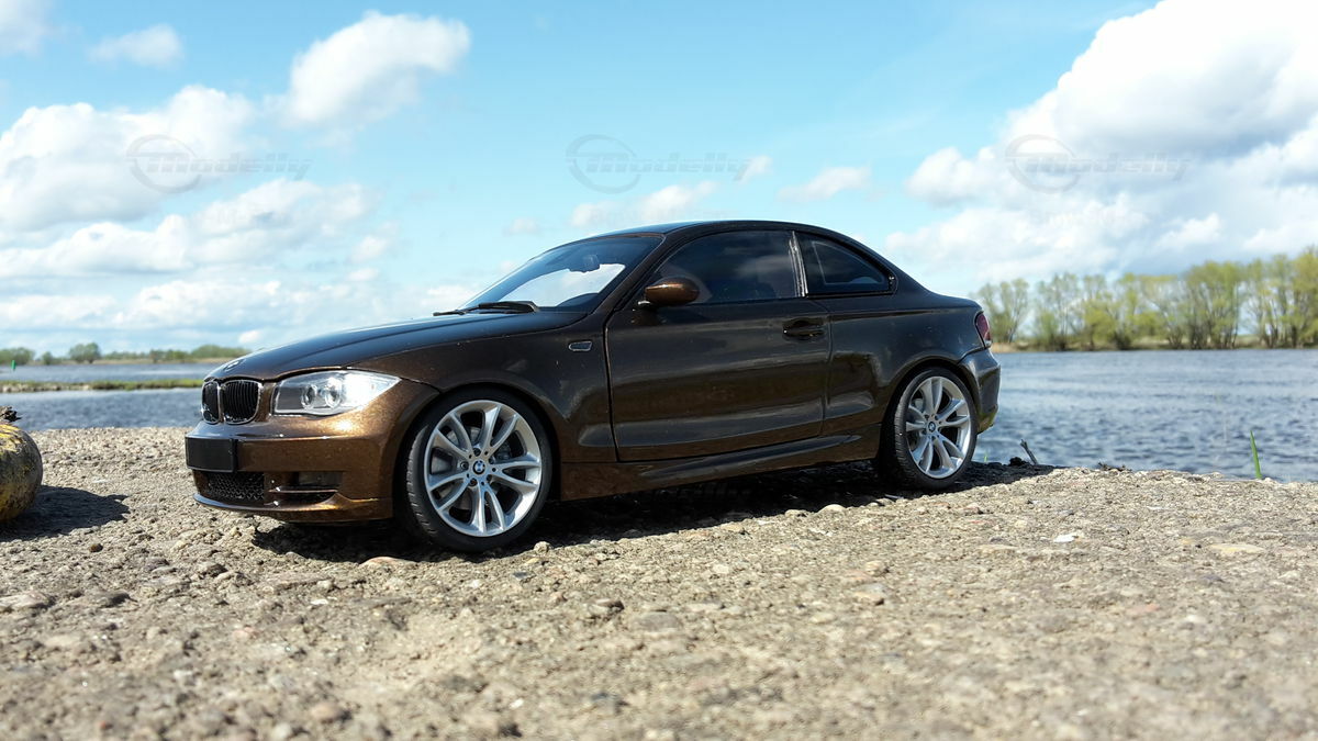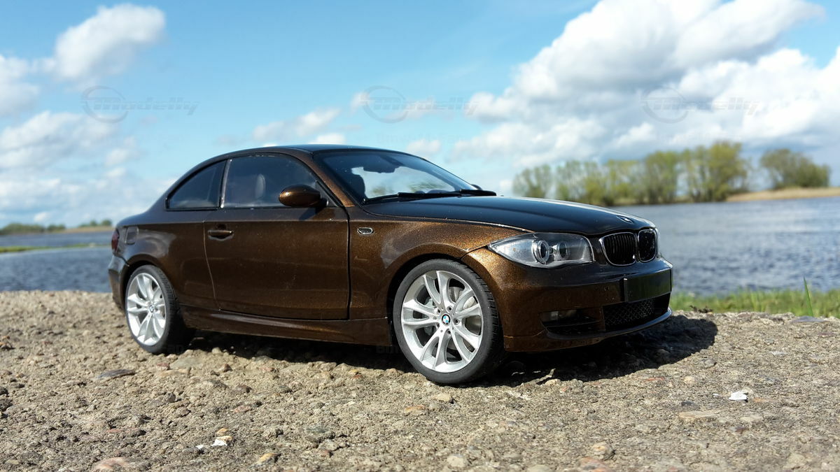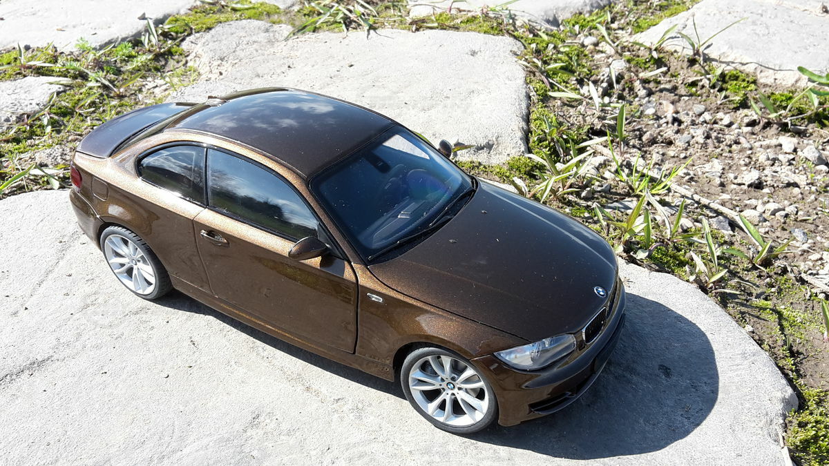 The showcased model car is a 1/18 replica manufactured by Kyosho. Crafted from durable die-cast material, ensuring longevity and high quality. This model is not just a replica but a modified version, specifically a unique creation personalized by Modelly member "Bmw-M-Fan". This means it may not have the exact features as the original Kyosho stock model. A standout highlight is the visible rims that accentuate the typical characteristics of the BMW 125i. The model boasts a detailed interior, reflecting the elegant and sporty nature of the original. The distinctive Marrakesh Brown color scheme lends an upscale and individual touch.