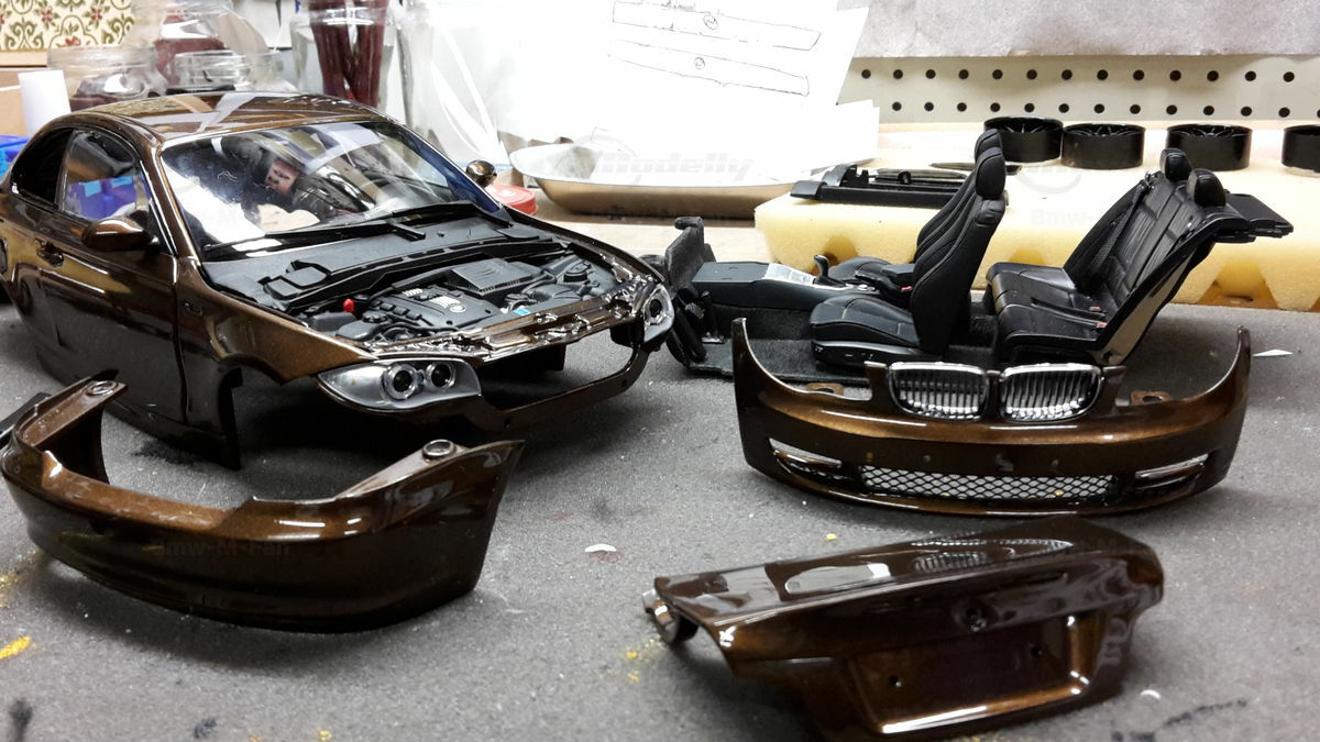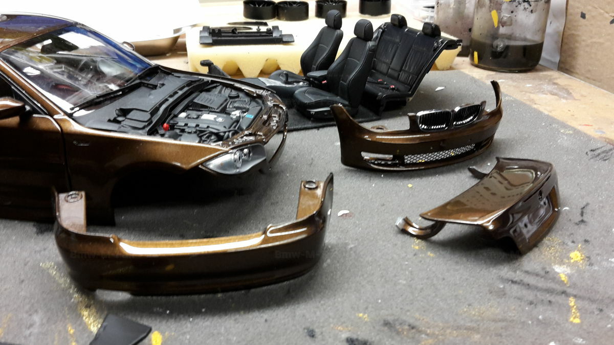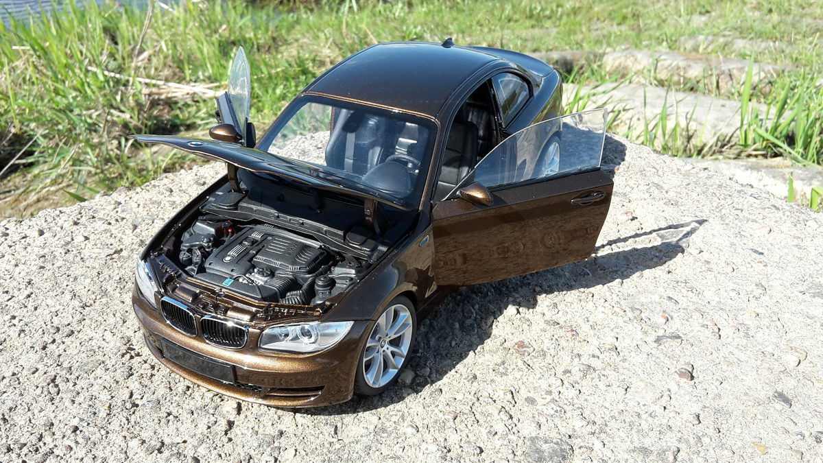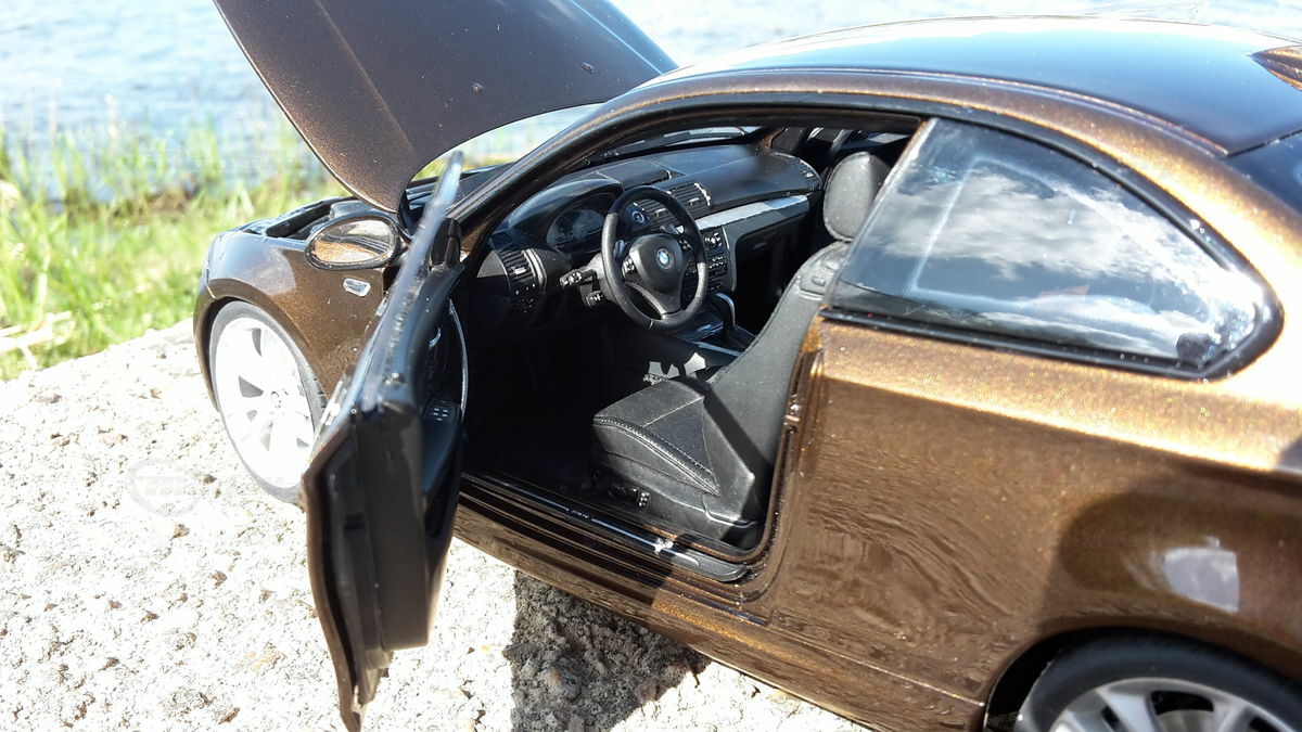 This 1/18 scale model is particularly appealing to collectors due to its detailed and realistic replication of the BMW E82 125i Coupe. The high-quality die-cast material along with the special modifications made by "Bmw-M-Fan" make it a valuable collector's item. The model, as seen in the pictures, showcases a superb Marrakesh Brown paint job, combined with realistic details like headlights, grille, and the characteristic lines of the BMW. The photos give a good impression of the precision and richness of detail in this model. It features special rims meticulously reproduced to match the original. Collectors will appreciate the authentic and high-quality representation of this vehicle.
