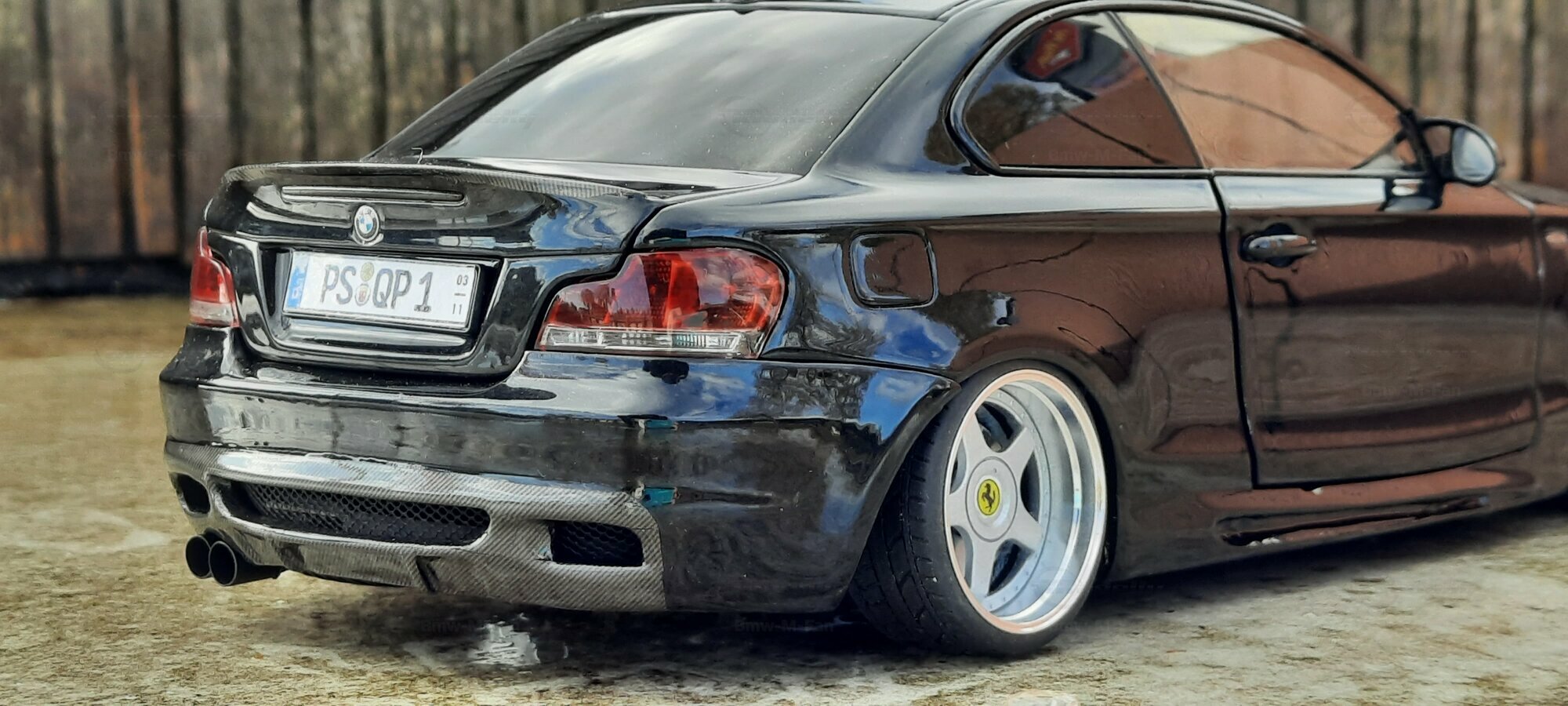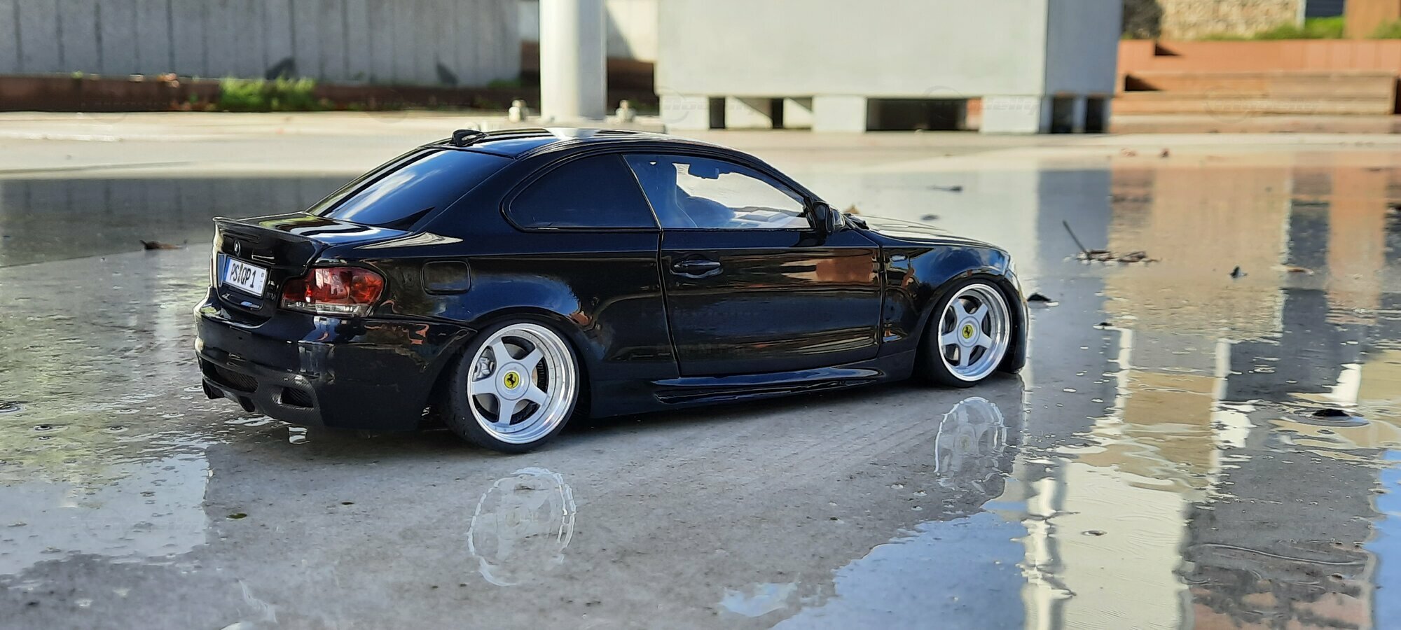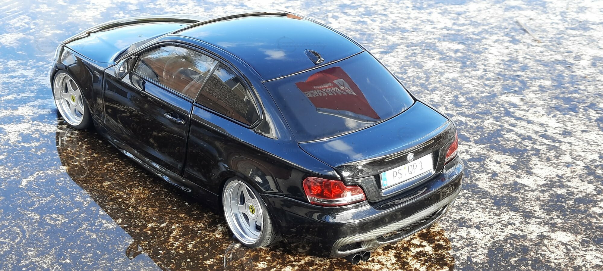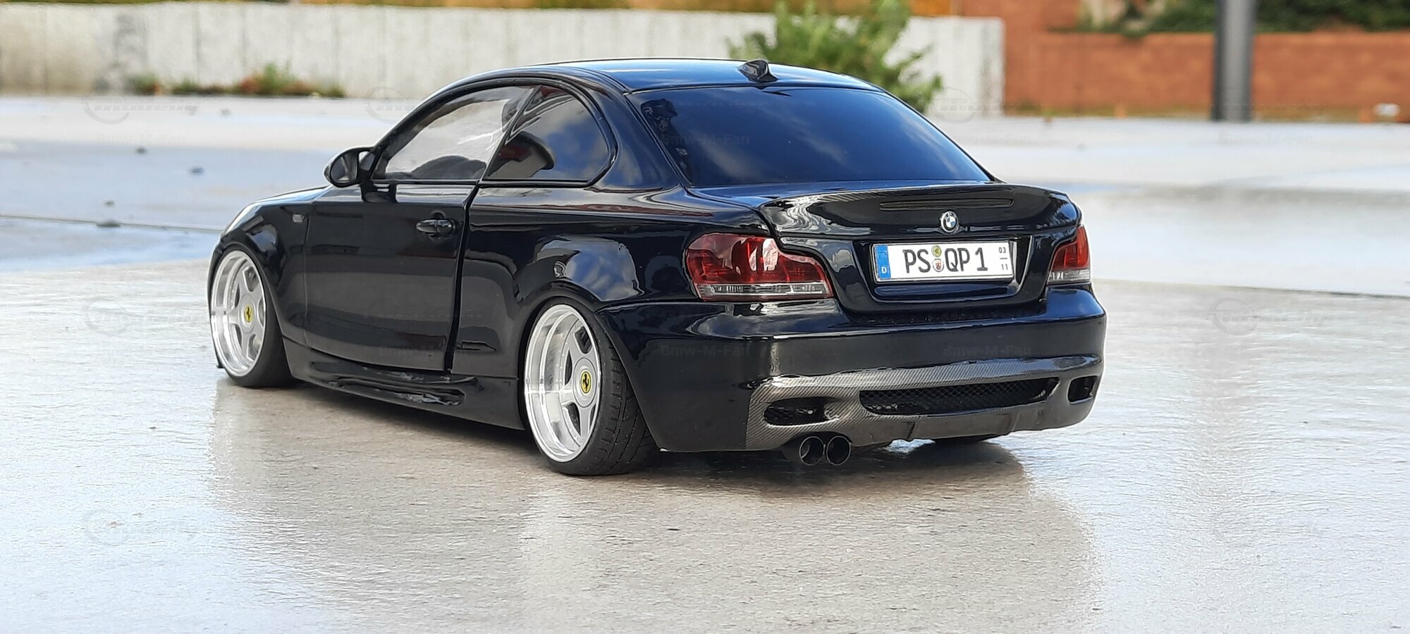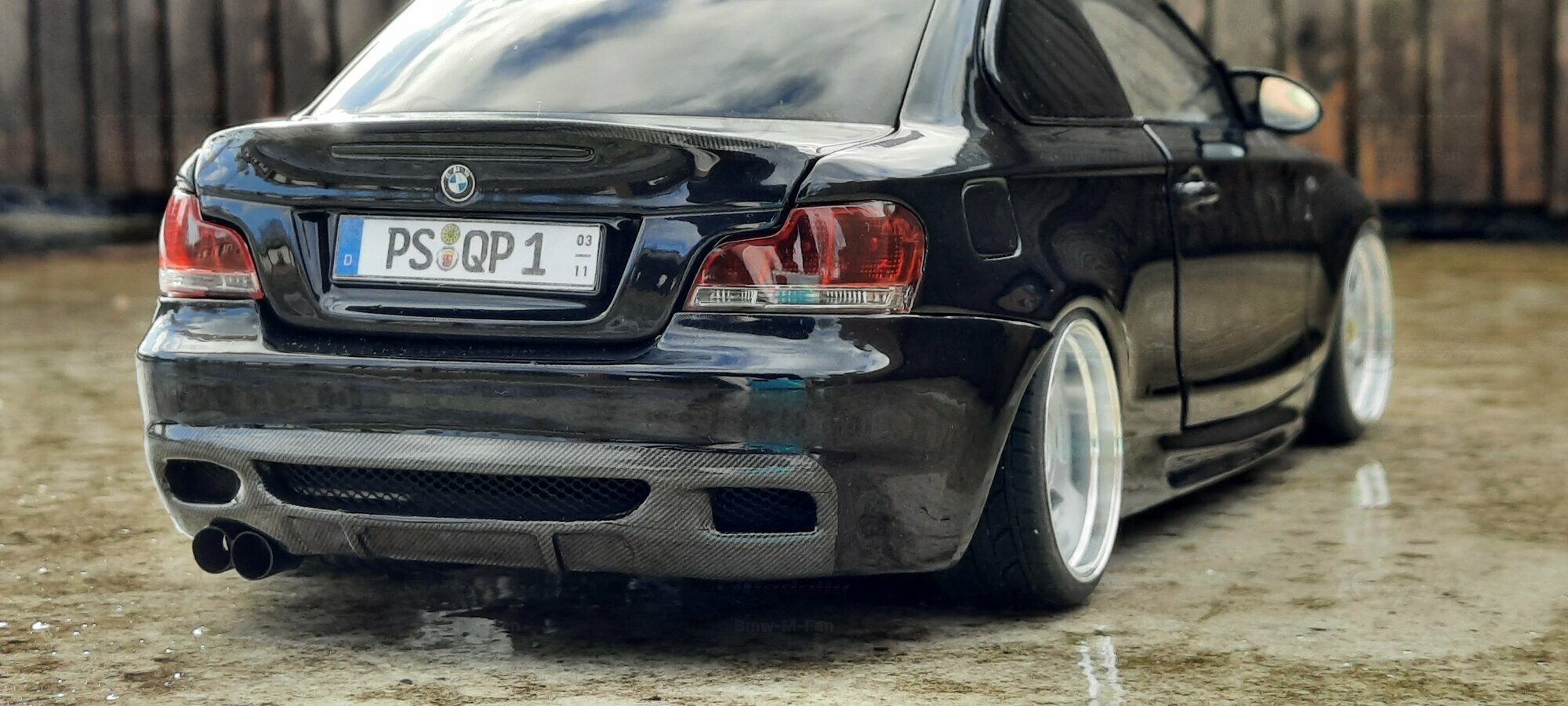 The striking paintwork of this modified miniature model is immediately eye-catching. The deep black color gives the model an elegant yet powerful presence. The shape of the BMW E82 135i has been faithfully recreated, with the distinctive double-ring design of the headlights and the bold lines exuding a sporty yet compact vibe. The taillights are intricately replicated, and even the BMW logo on the trunk is accurately placed. A standout detail is the carbon elements on the rear diffuser, accentuating the sporty appearance. Carbon-look side mirrors adorn the model above the side windows, further enhancing its premium look.