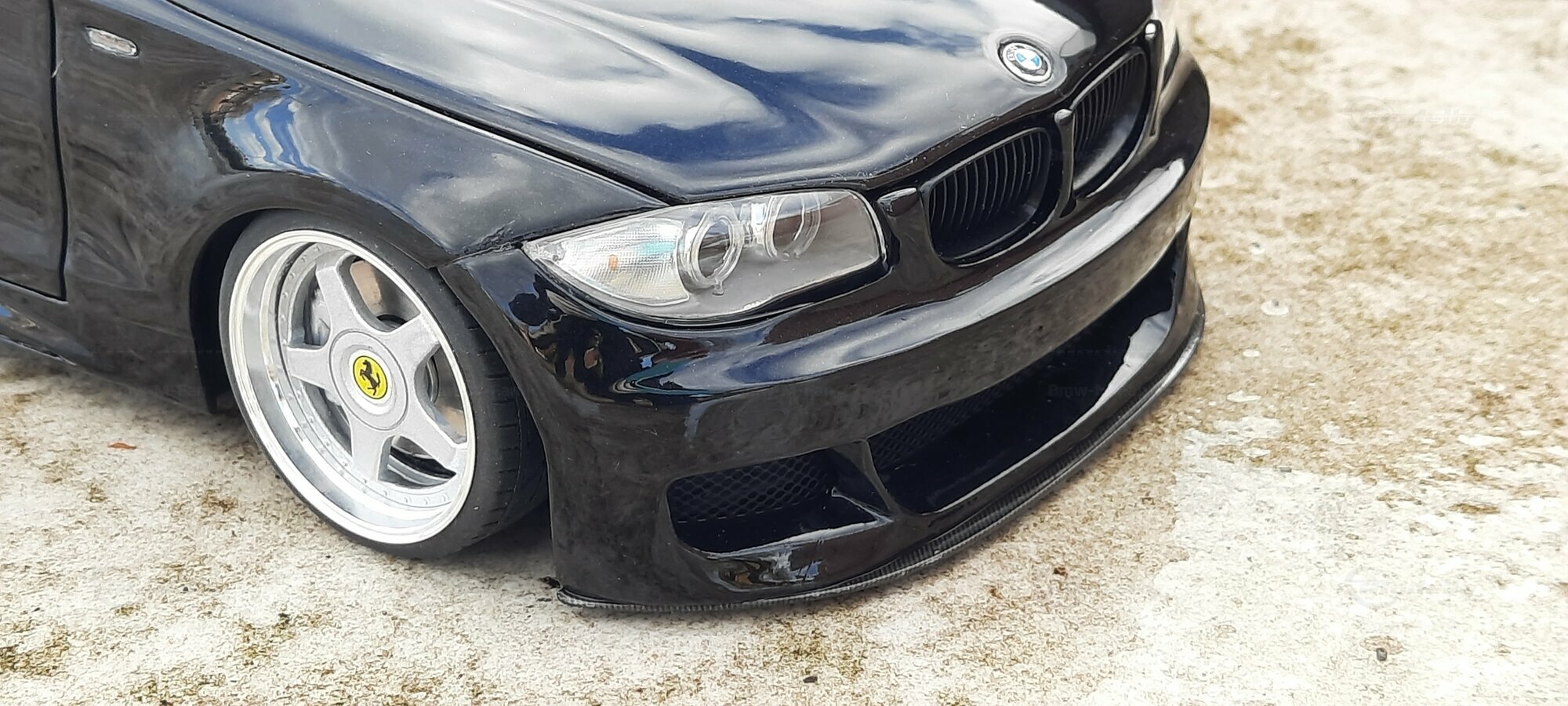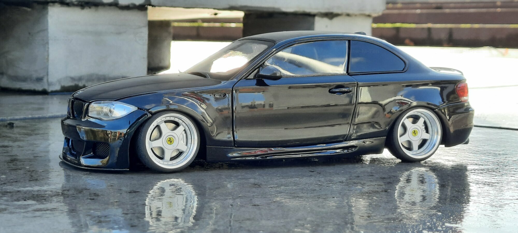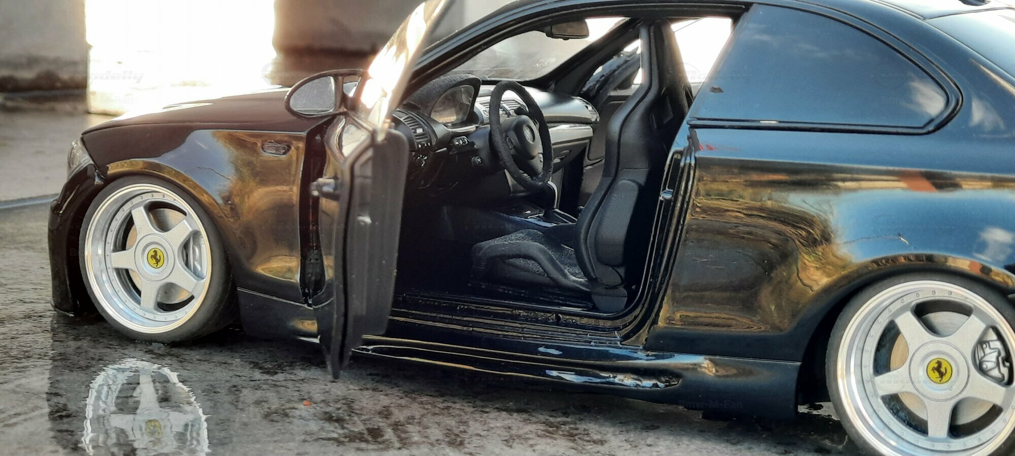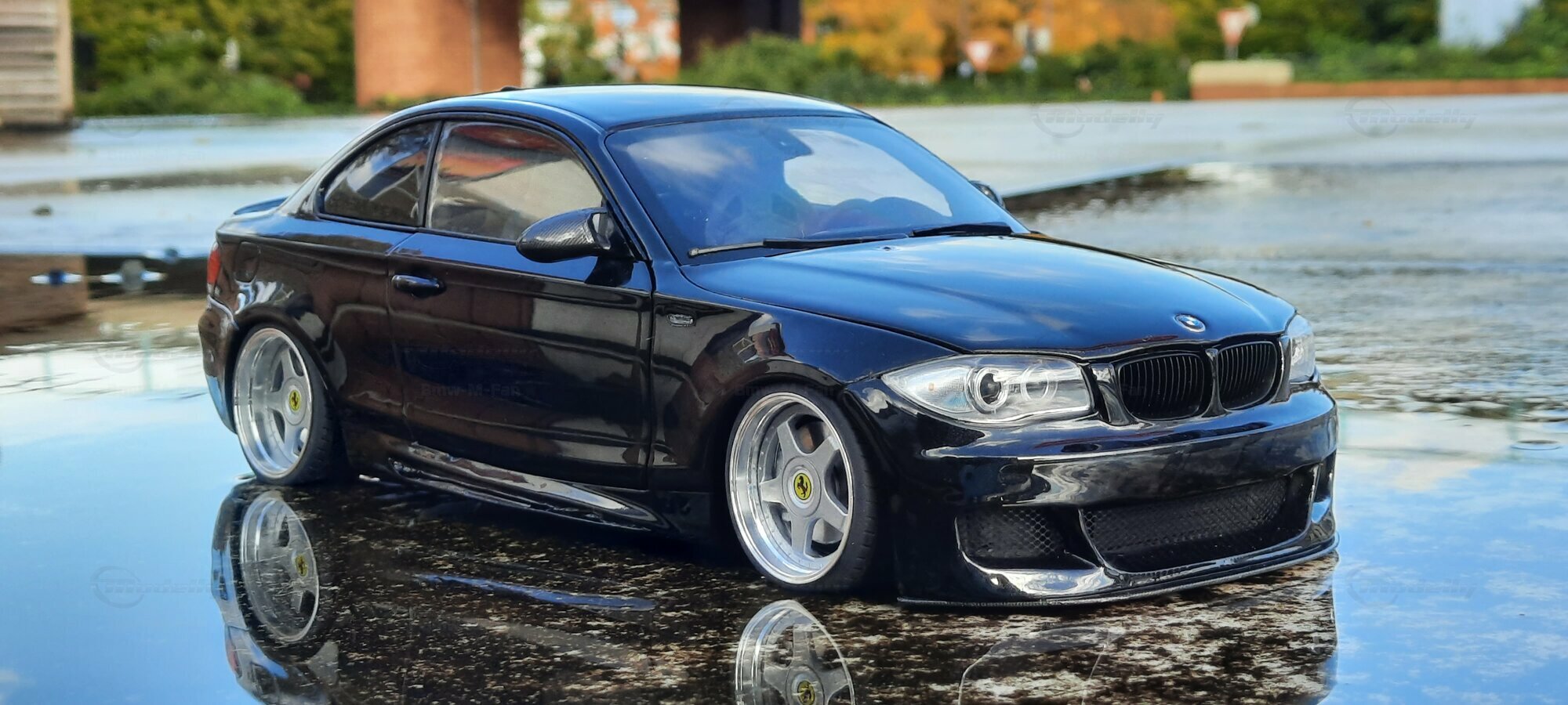 The striking paintwork of this modified miniature model is immediately eye-catching. The deep black color gives the model an elegant yet powerful presence. The shape of the BMW E82 135i has been faithfully recreated, with the distinctive double-ring design of the headlights and the bold lines exuding a sporty yet compact vibe. The taillights are intricately replicated, and even the BMW logo on the trunk is accurately placed. A standout detail is the carbon elements on the rear diffuser, accentuating the sporty appearance. Carbon-look side mirrors adorn the model above the side windows, further enhancing its premium look.