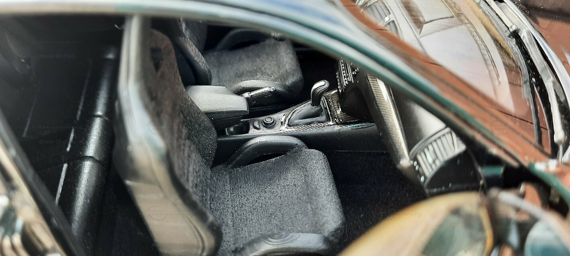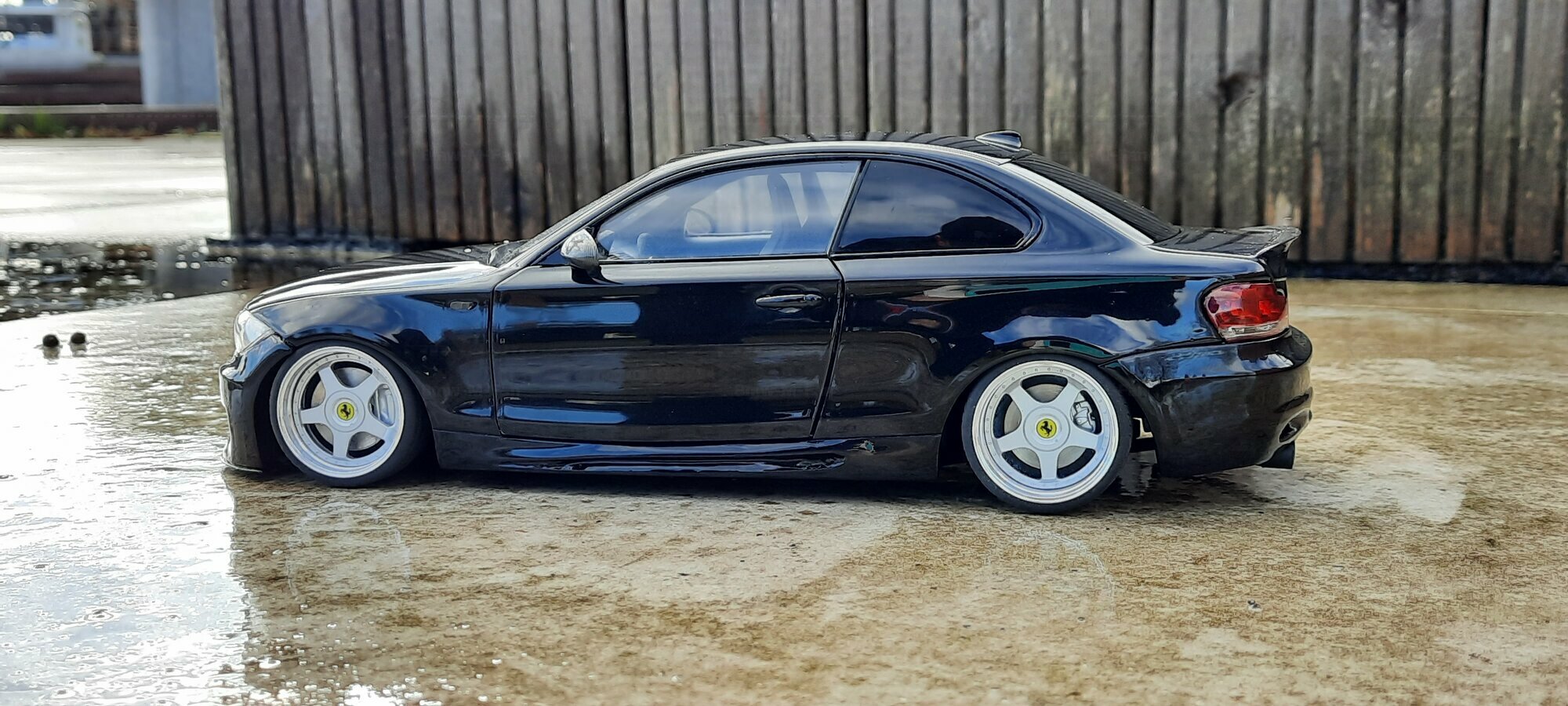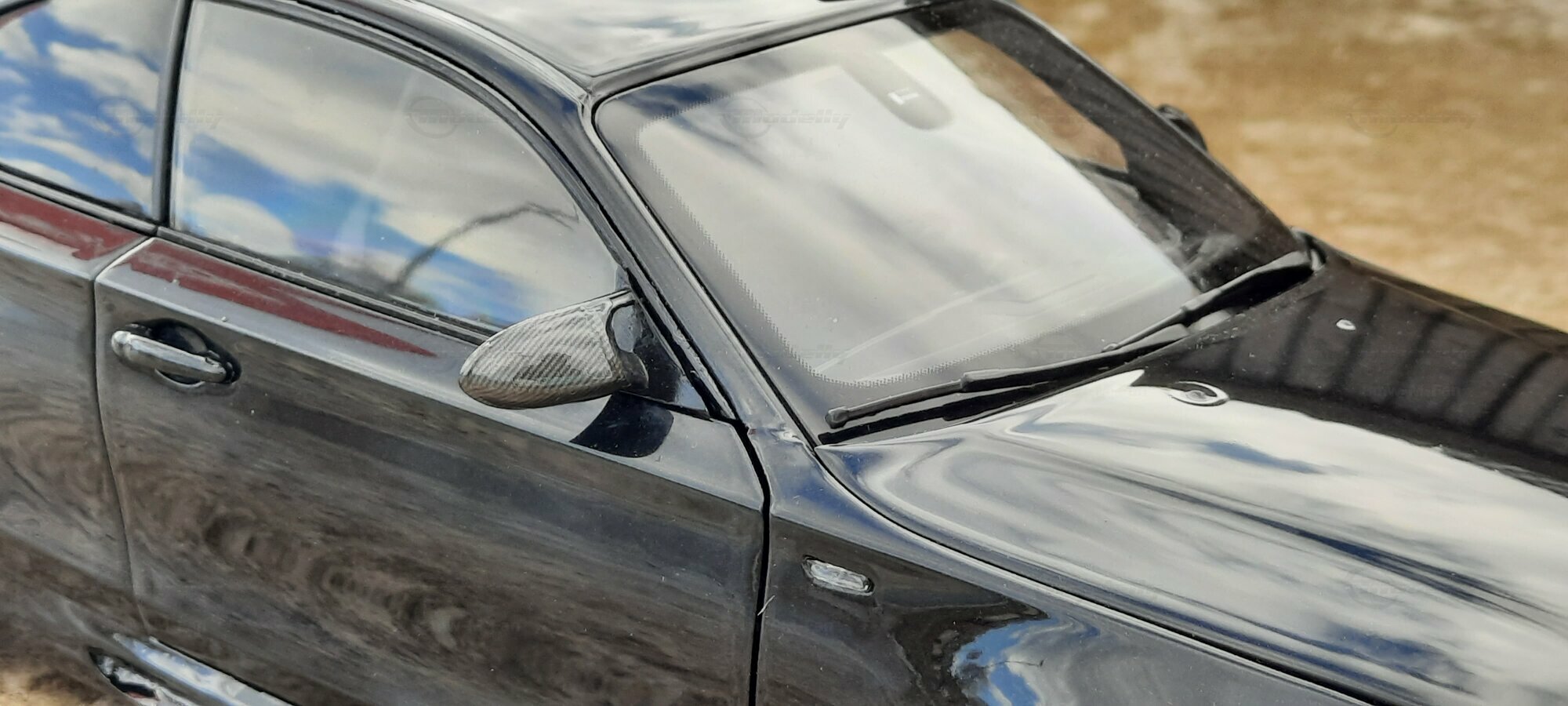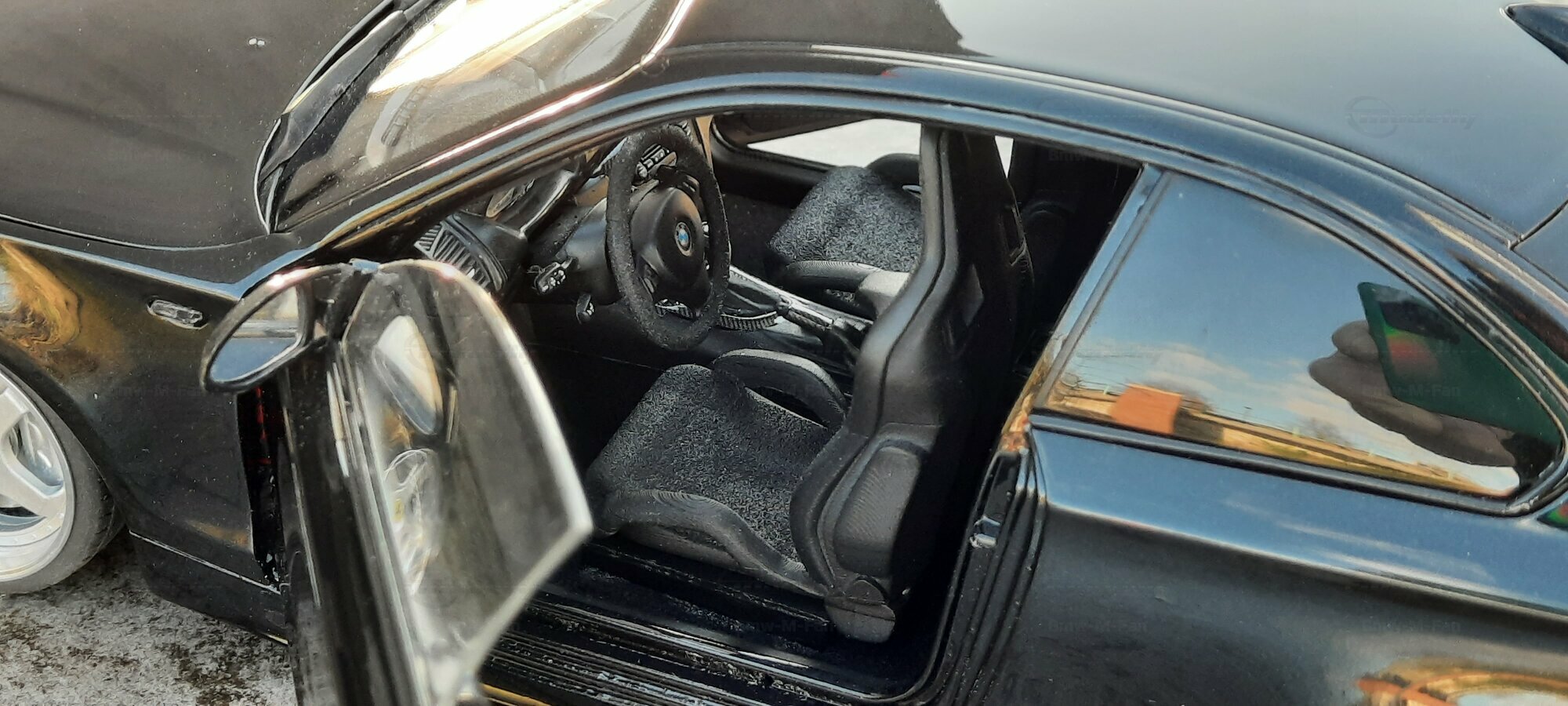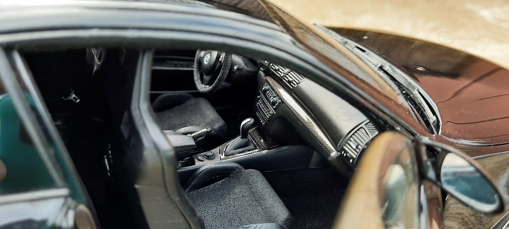 The striking paintwork of this modified miniature model is immediately eye-catching. The deep black color gives the model an elegant yet powerful presence. The shape of the BMW E82 135i has been faithfully recreated, with the distinctive double-ring design of the headlights and the bold lines exuding a sporty yet compact vibe. The taillights are intricately replicated, and even the BMW logo on the trunk is accurately placed. A standout detail is the carbon elements on the rear diffuser, accentuating the sporty appearance. Carbon-look side mirrors adorn the model above the side windows, further enhancing its premium look.