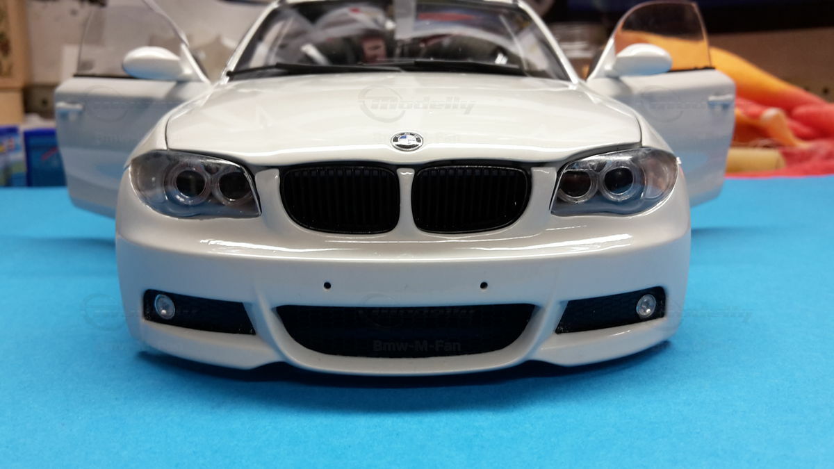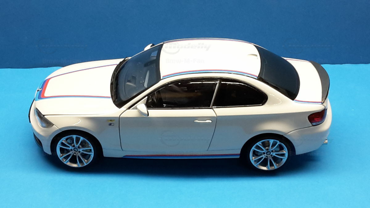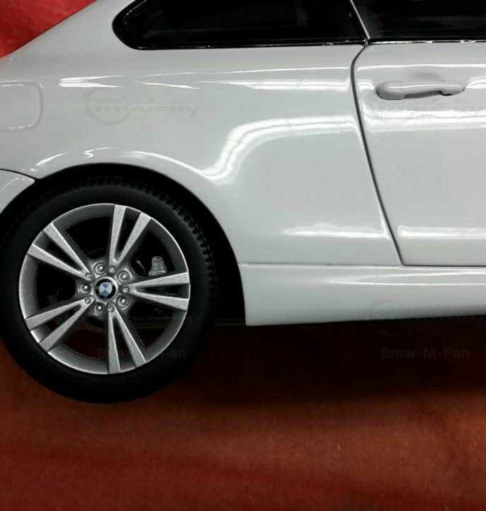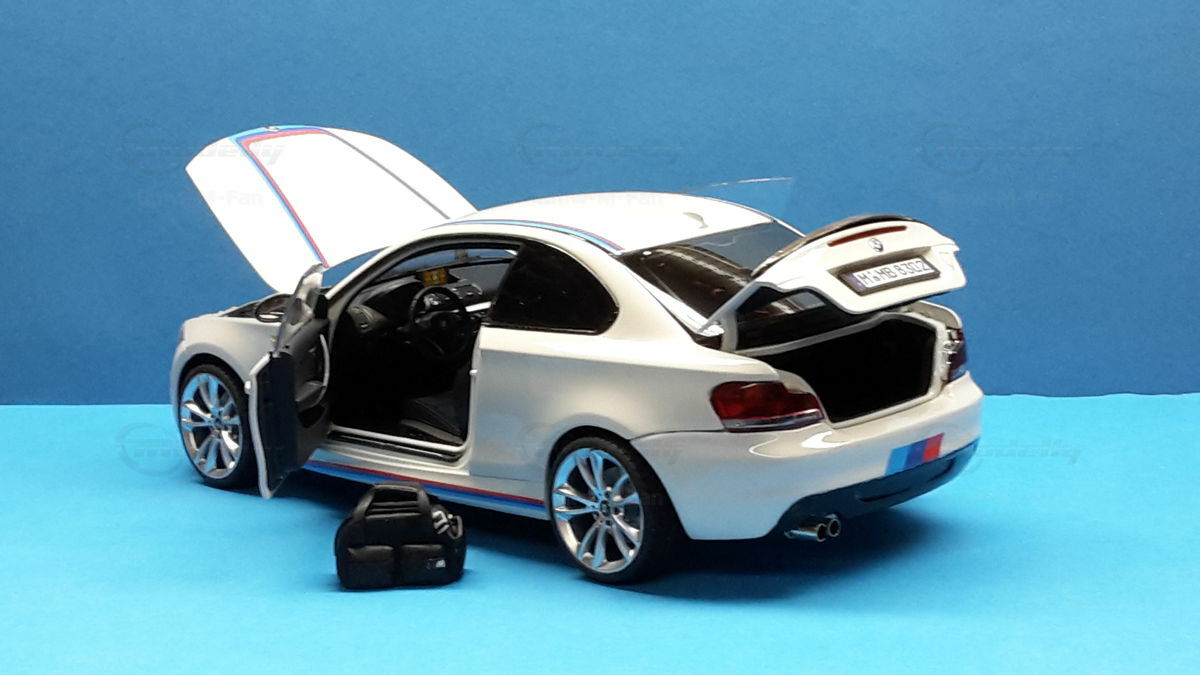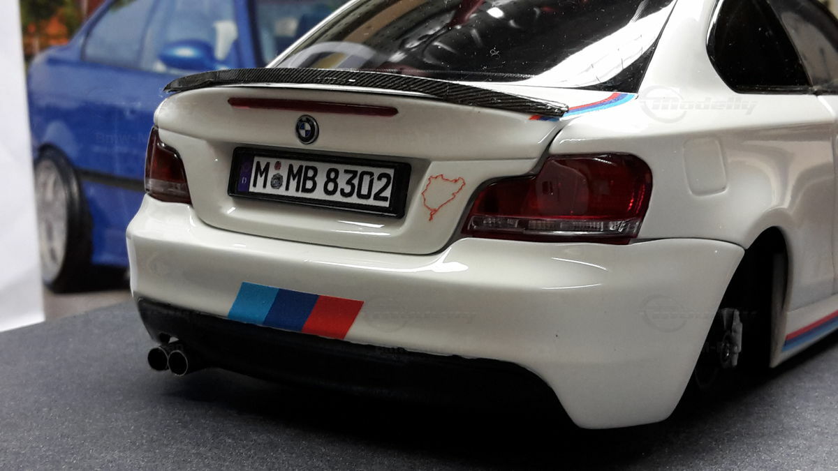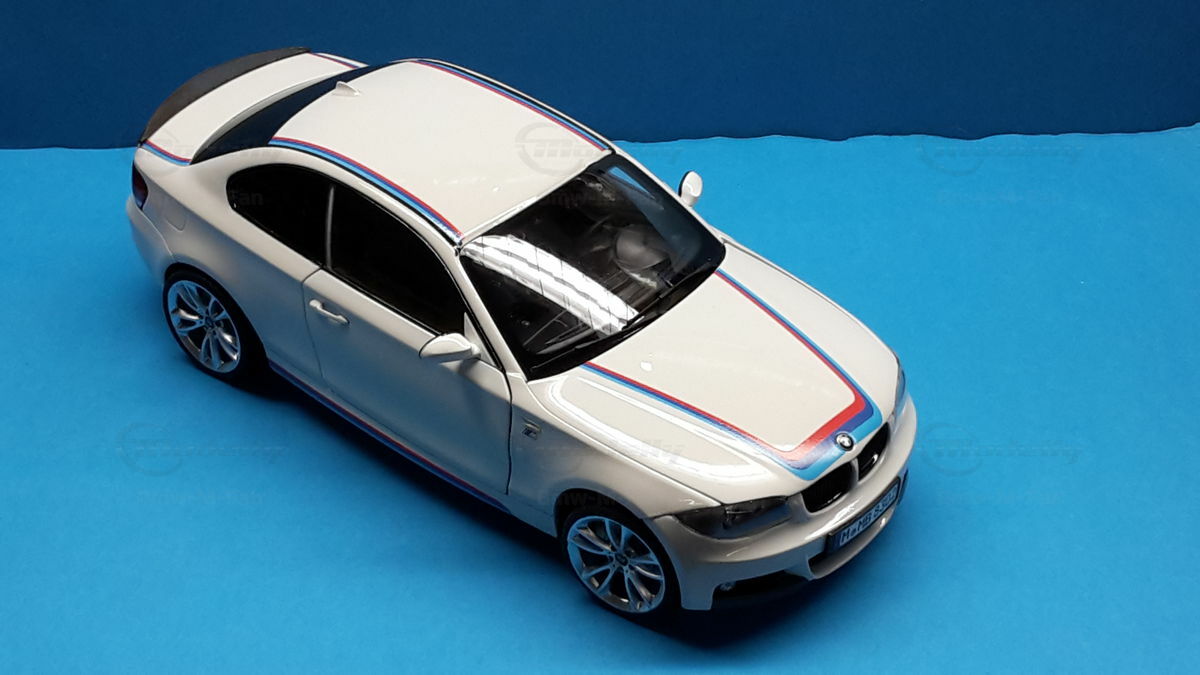 The model car presented here in a 1/18 scale, manufactured by Kyosho, showcases a modified version of the BMW E82 135i. It is important to note that this model does not represent the original product from Kyosho but has been altered by a collector. This particular model is constructed from diecast, a high-quality material known for its durability and detailed representation. The modifications include the special paintwork and added details visible in the photos.