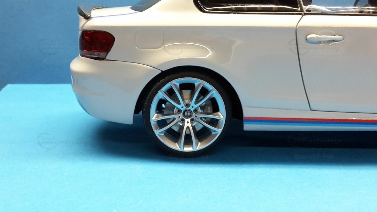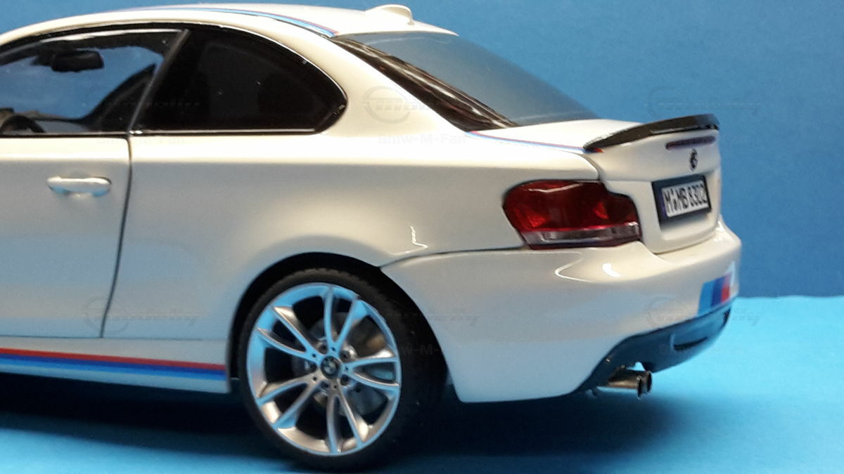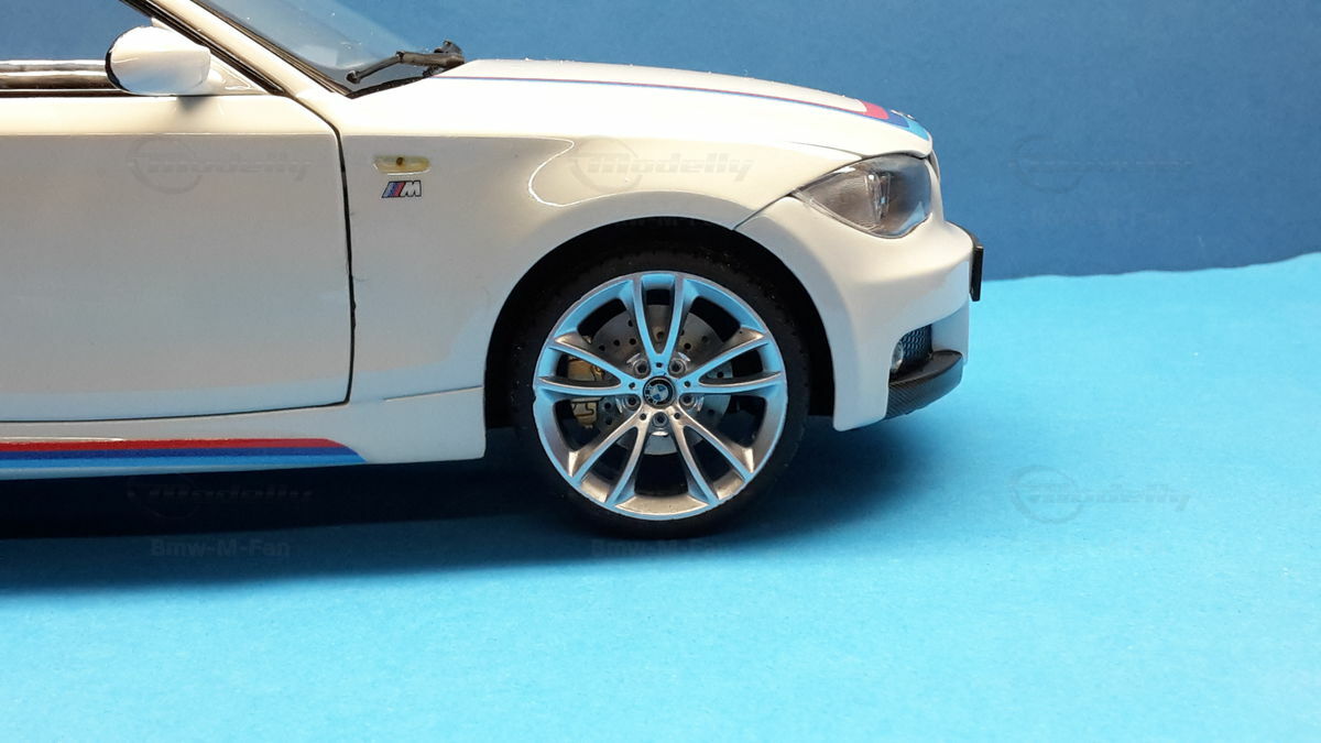 A striking feature of this model is the special paintwork in the colors of the BMW M logo. The white base colors of the vehicle are complemented by the distinctive stripes in blue, dark blue, and red that extend across the hood, roof, and sides of the car. This design gives the model a sporty and distinctive appearance. Additionally, the model is equipped with detailed rims that could be special reproductions of BMW M Performance wheels. Unfortunately, precise information about the manufacturer of the rims on the model is not available.
