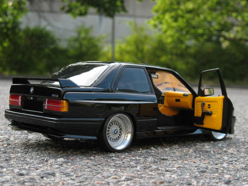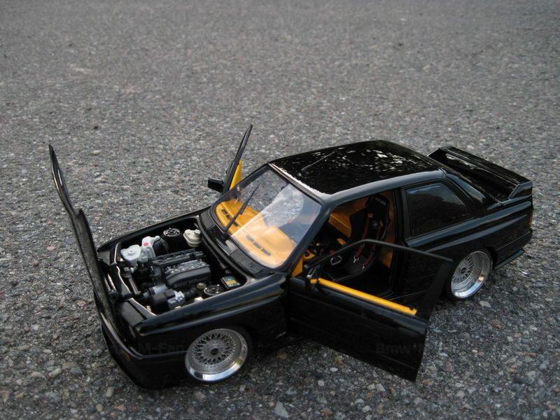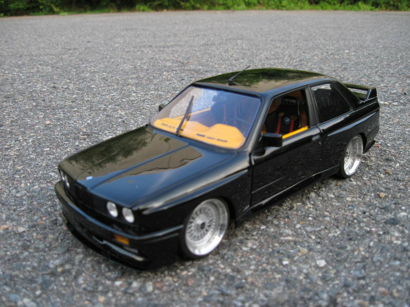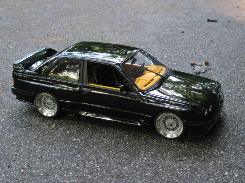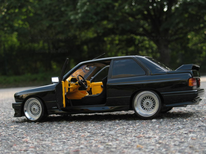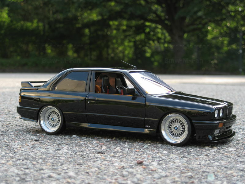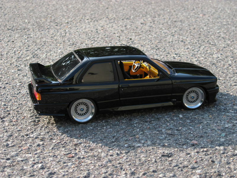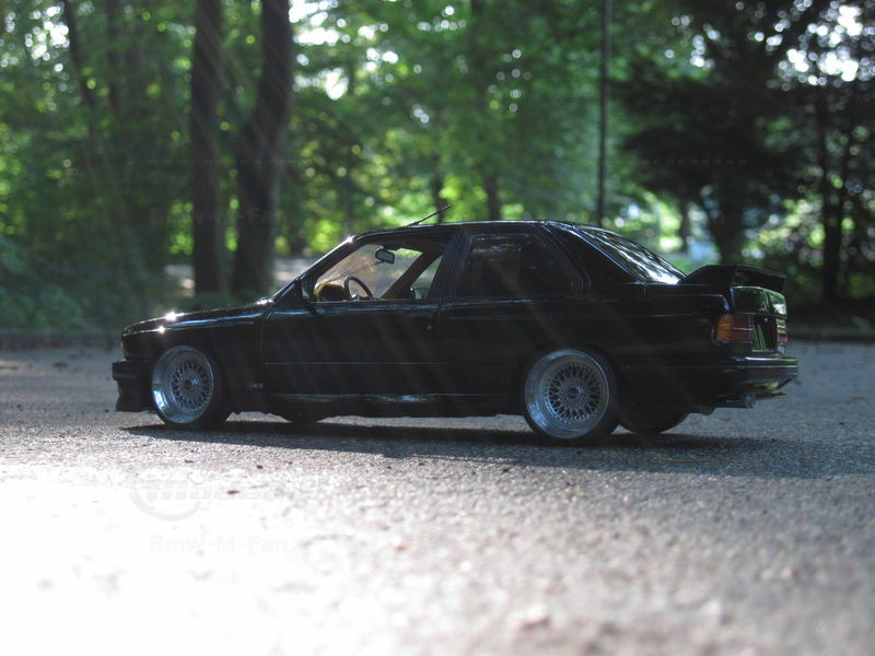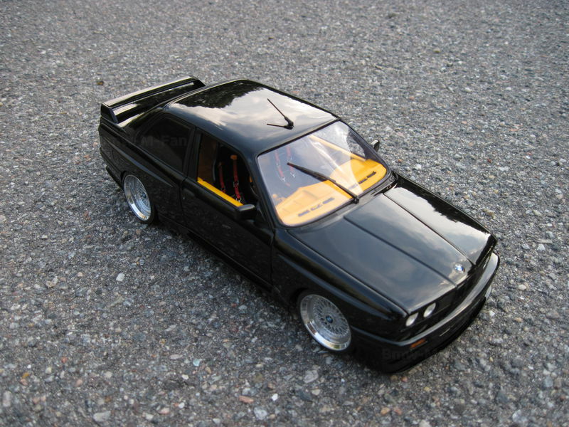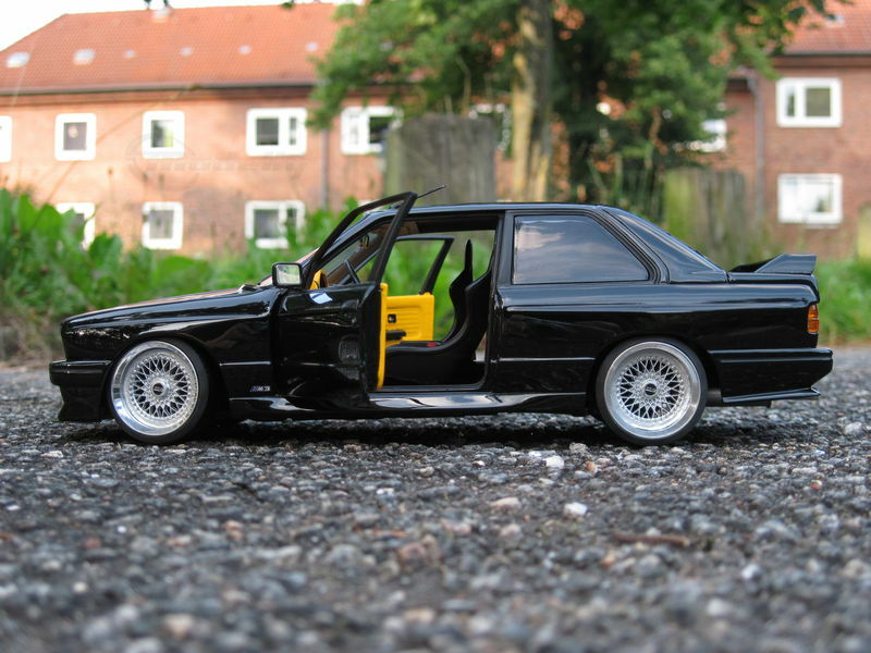 The modified rims of this model are particularly noteworthy. They were produced by a well-known manufacturer, BBS, and significantly contribute to the realistic appearance of the miniature car. The rim models feature the classic BBS multispoke design, which perfectly complements the vehicle. In terms of color scheme, the model has a deep black paint job. The paint reflects light in a way that accentuates the contours and sporty lines of the vehicle. This level of detail enhances the realistic look and makes the model a real eye-catcher in any collection.