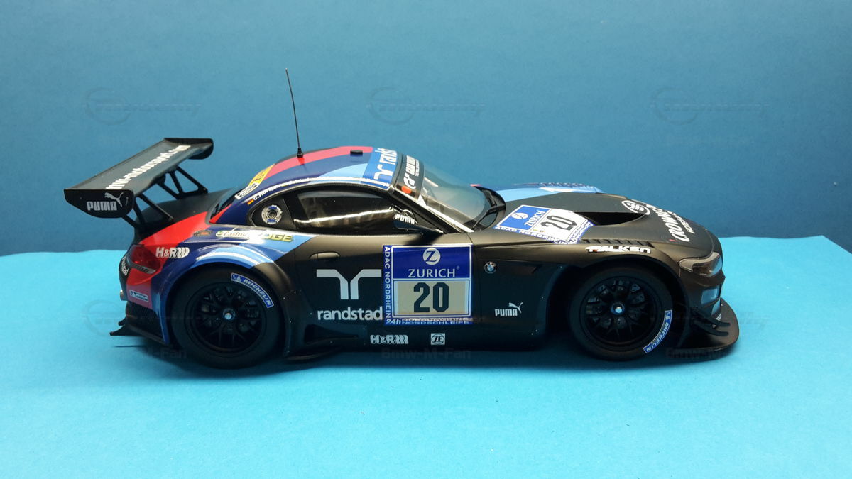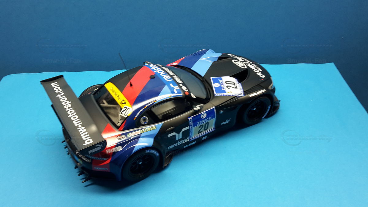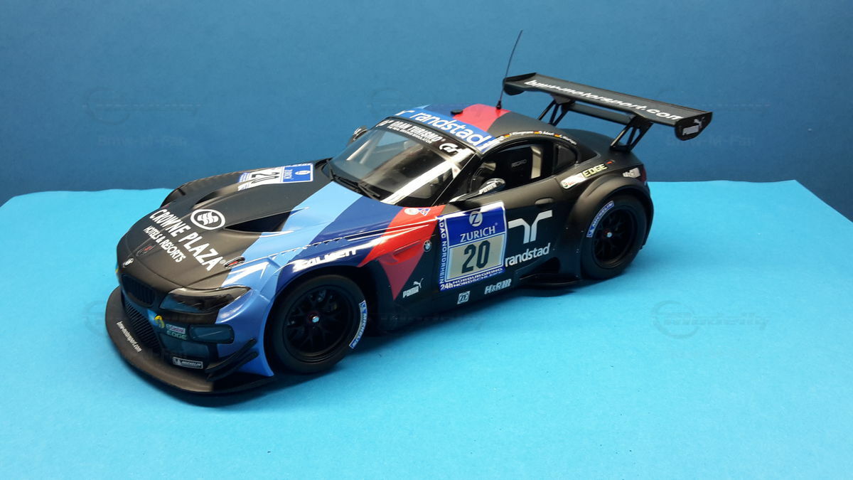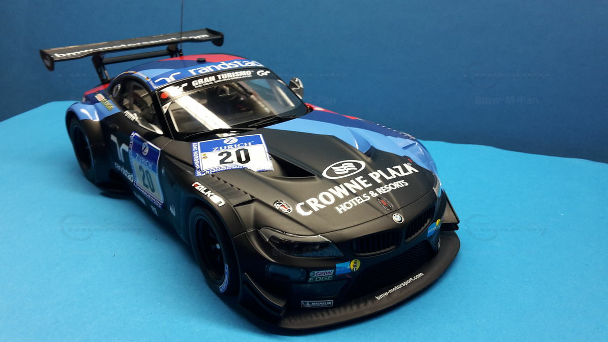 The model car you see in the photos is a detailed replica of the BMW E89 Z4 GT3, which was raced in the infamous 24-hour race on the Nürburgring Nordschleife in 2013 by BMW Team Schubert under #20. The original car belongs to the E89 Generation, built from 2009 to 2016. The BMW Z4 GT3 was designed to continue BMW's tradition in motorsport and is based on the road version of the BMW Z4. Its predecessor was the BMW Z4 M Coupe. The design was significantly influenced by Adrian van Hooydonk and Juliane Blasi, responsible for the iconic shape and aerodynamic details.