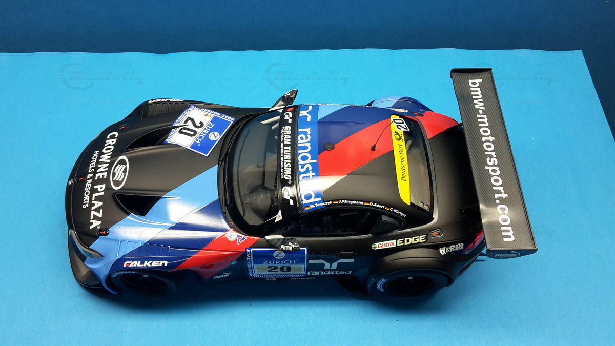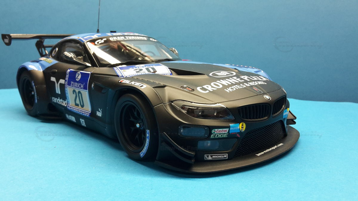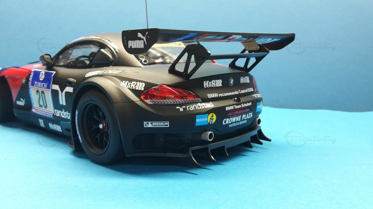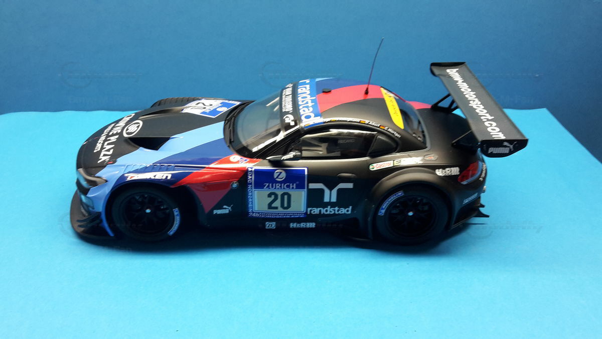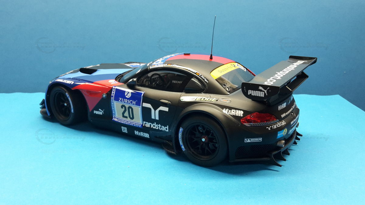 The model car you see in the photos is a detailed replica of the BMW E89 Z4 GT3, which was raced in the infamous 24-hour race on the Nürburgring Nordschleife in 2013 by BMW Team Schubert under #20. The original car belongs to the E89 Generation, built from 2009 to 2016. The BMW Z4 GT3 was designed to continue BMW's tradition in motorsport and is based on the road version of the BMW Z4. Its predecessor was the BMW Z4 M Coupe. The design was significantly influenced by Adrian van Hooydonk and Juliane Blasi, responsible for the iconic shape and aerodynamic details.