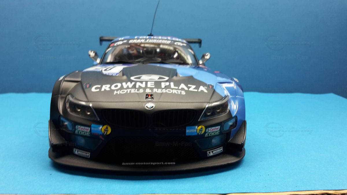 The showcased model car is a 1/18 replica of the BMW E89 Z4 GT3 manufactured by Minichamps and made from plastic. This model is an excellent example of the meticulous attention to detail that Minichamps puts into their products. The model's paint job showcases the distinctive design of the original car in a combination of blue, black, and red. Prominent sponsor decals like those of Randstad, Crowne Plaza, and Puma are visible on the model, reflecting the actual sponsors of the racing vehicle. Details such as the race-specific tires, the large rear wing, and the characteristic racing diffuser are accurately replicated. This model is part of the collection of Modelly member "Bmw-M-Fan" and represents an excellent example of high-quality scale 1/18 collectible models.