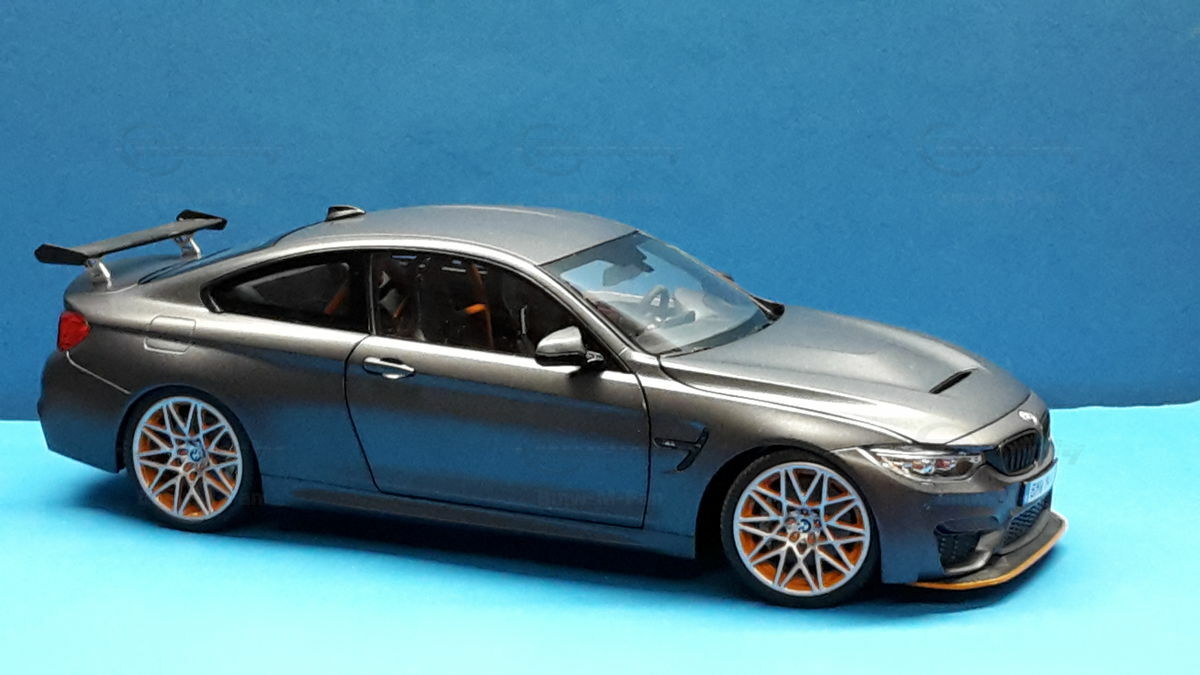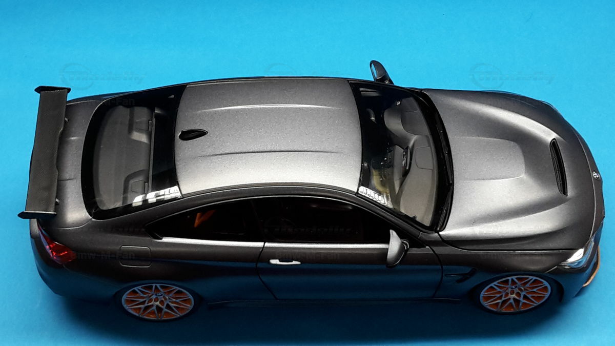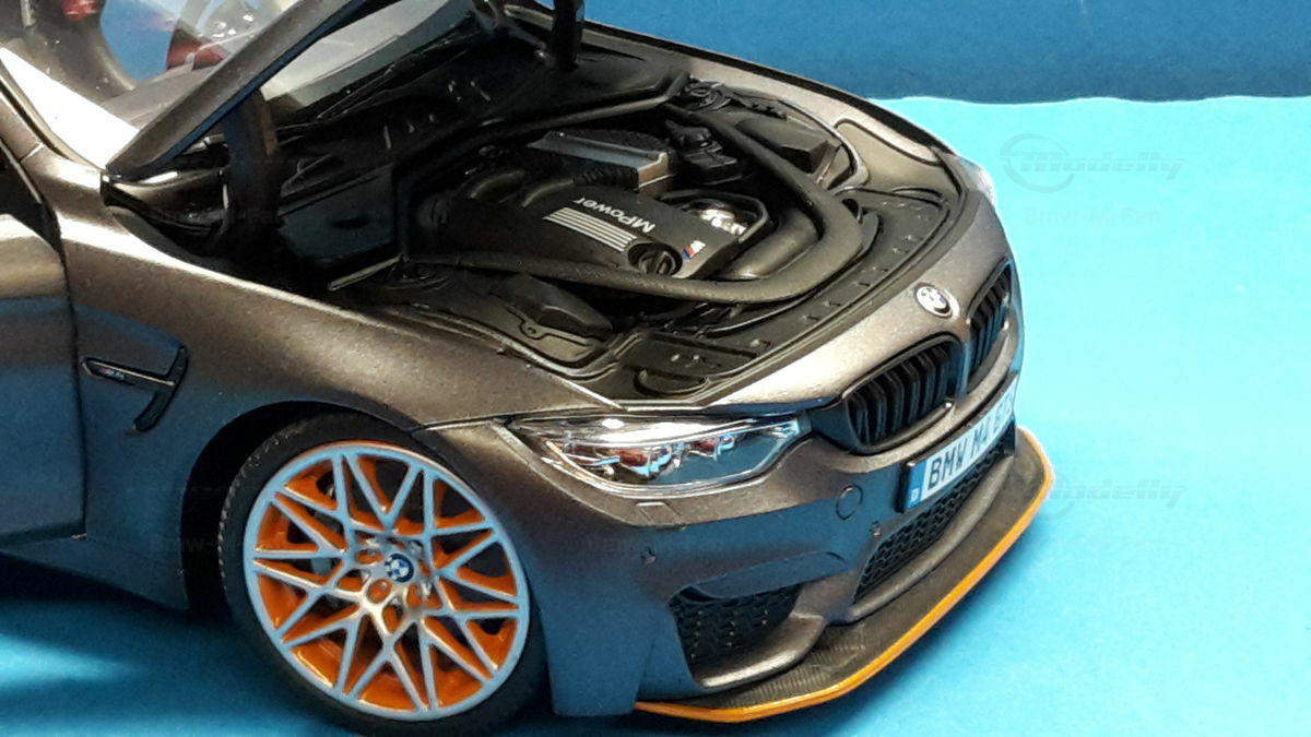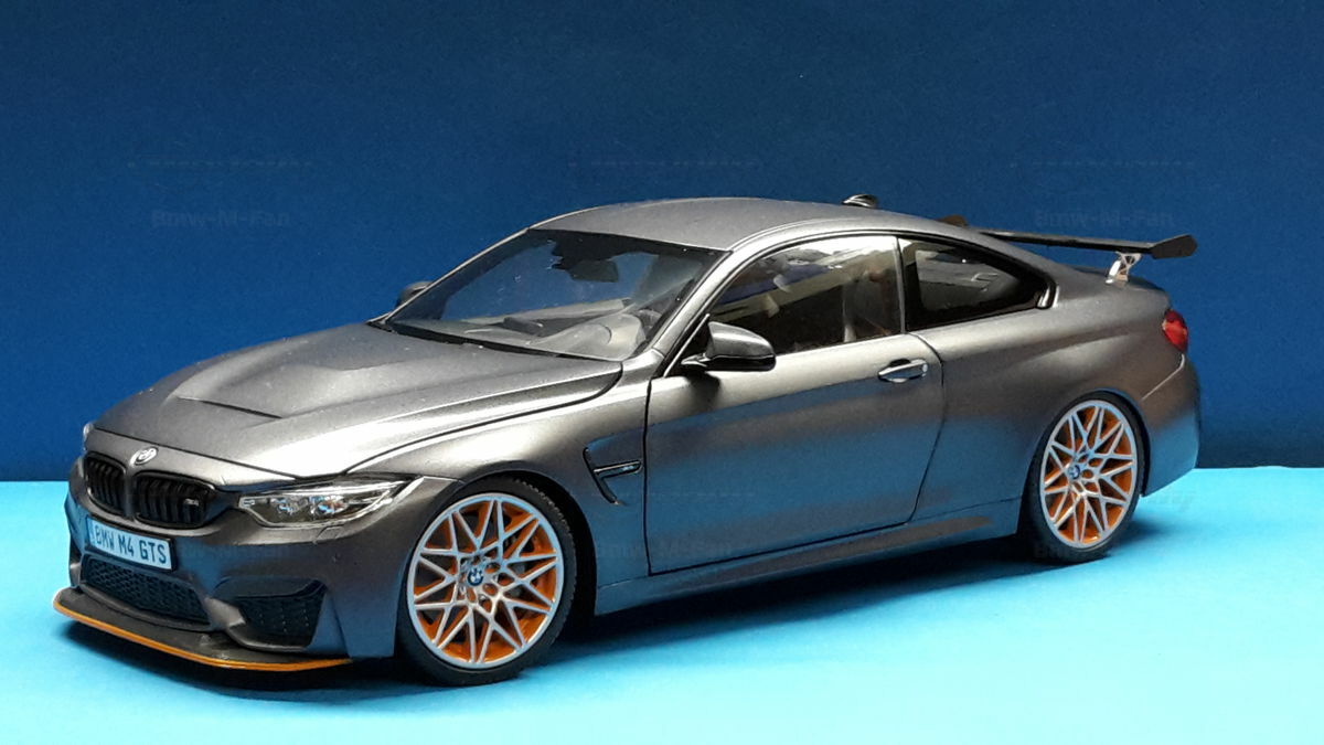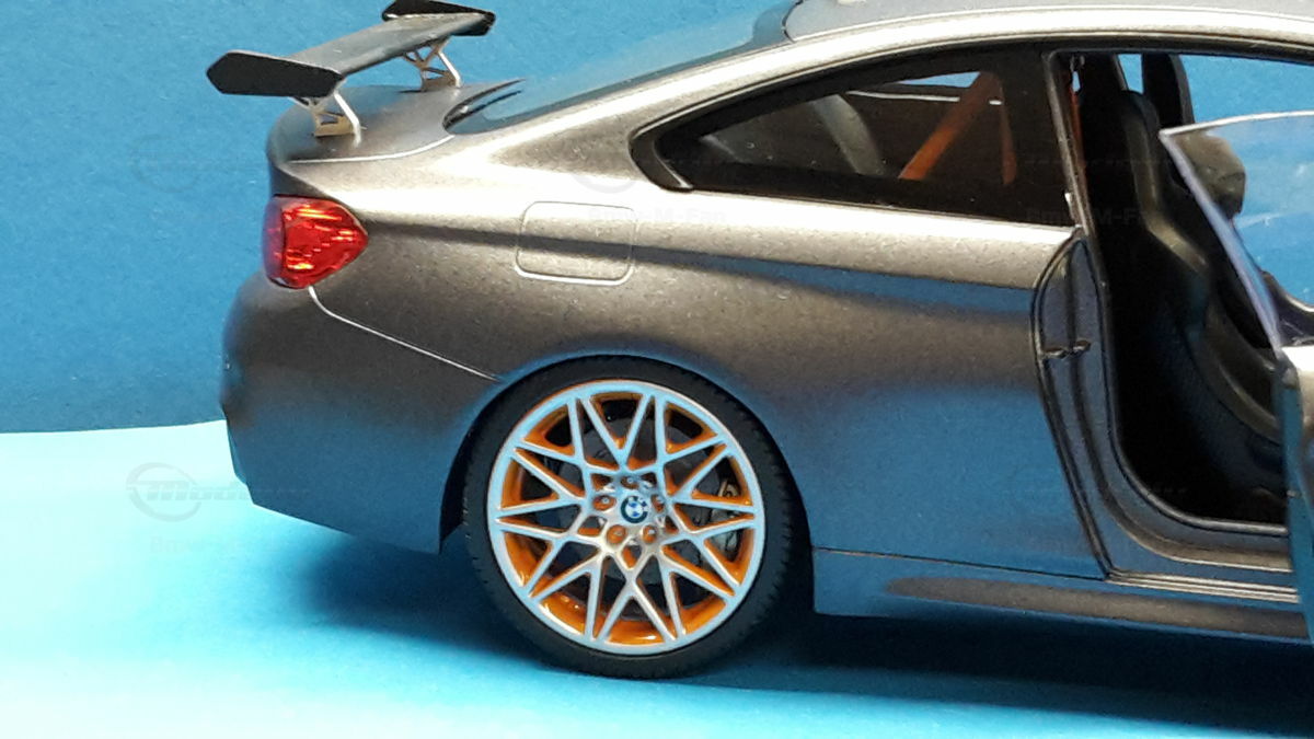 The model of the BMW F82 M4 GTS shown here is an exact replica in 1/18 scale by Minichamps. Made of die-cast metal, this model offers the highest level of detail and quality. The miniature manufacturer Minichamps is known for its precise and high-quality model cars, and this model is no exception. The color scheme of the model matches the original, including the exclusive “Frozen Dark Grey” color. The standout feature is the accurately reproduced orange wheels, enhancing the aggressive and sporty look of the vehicle.