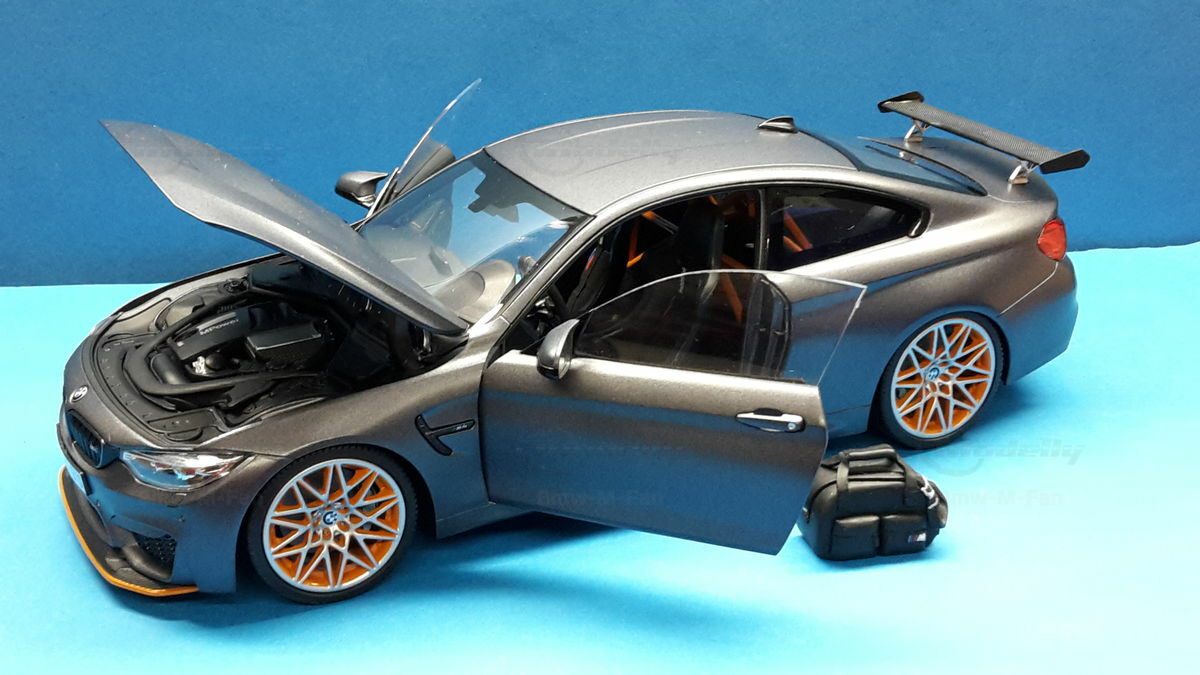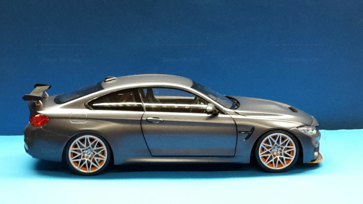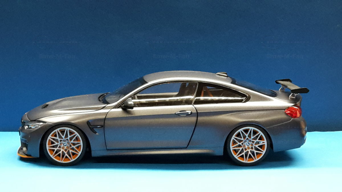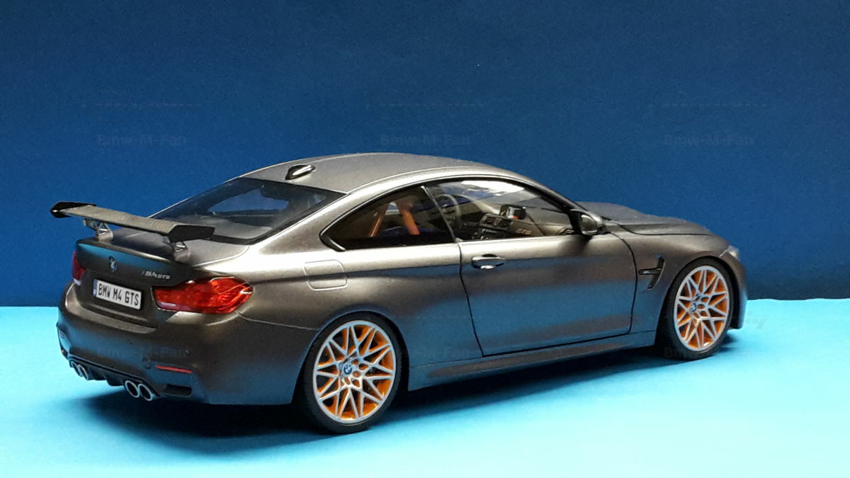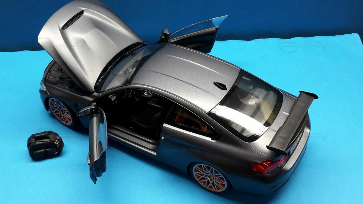 The model of the BMW F82 M4 GTS shown here is an exact replica in 1/18 scale by Minichamps. Made of die-cast metal, this model offers the highest level of detail and quality. The miniature manufacturer Minichamps is known for its precise and high-quality model cars, and this model is no exception. The color scheme of the model matches the original, including the exclusive “Frozen Dark Grey” color. The standout feature is the accurately reproduced orange wheels, enhancing the aggressive and sporty look of the vehicle.