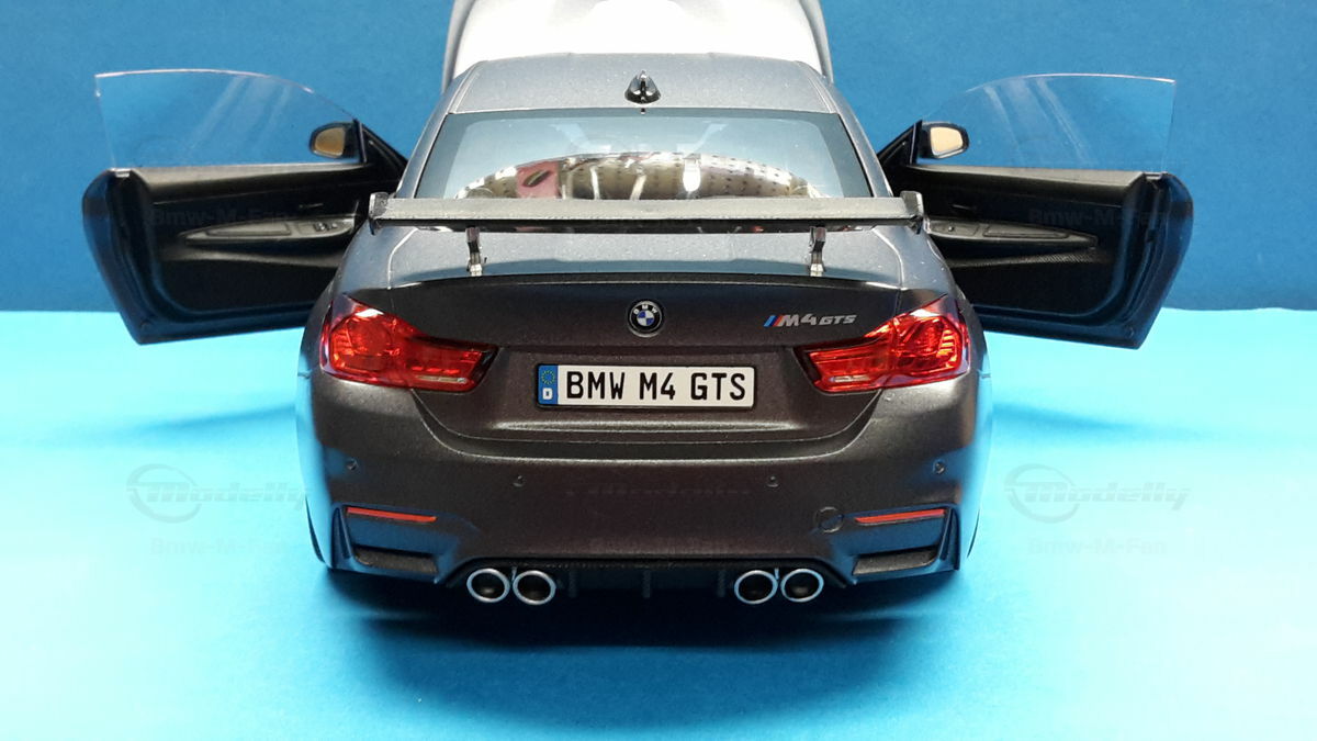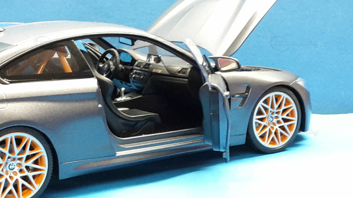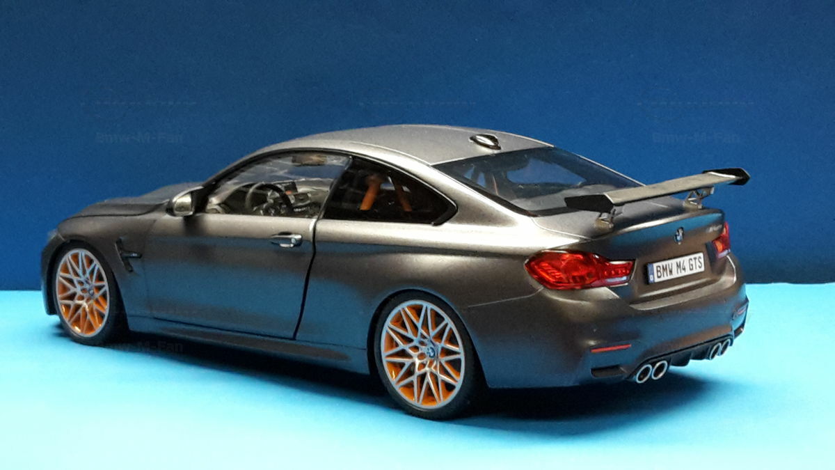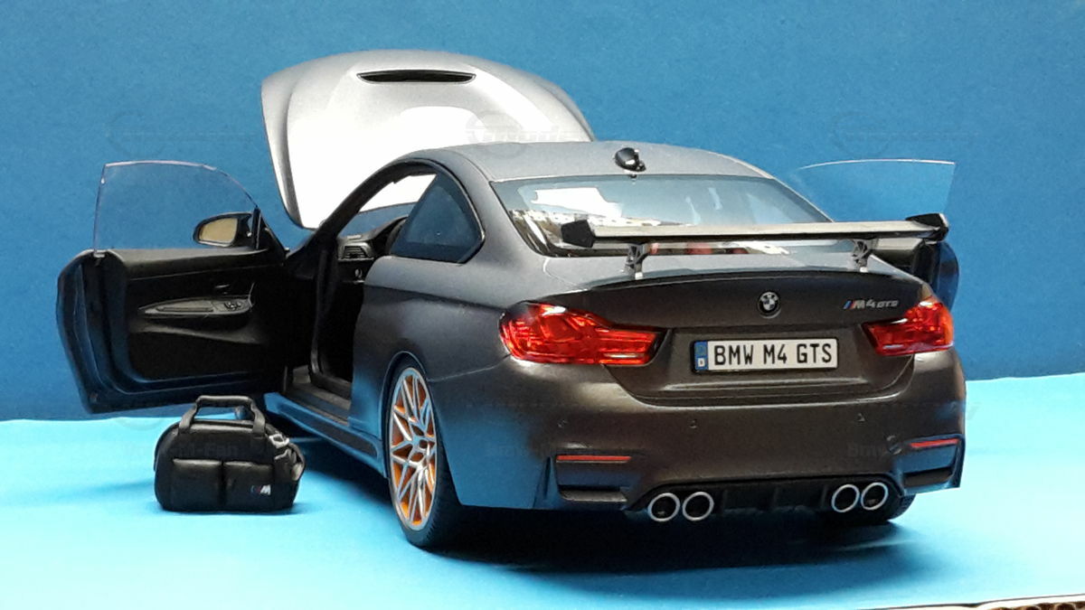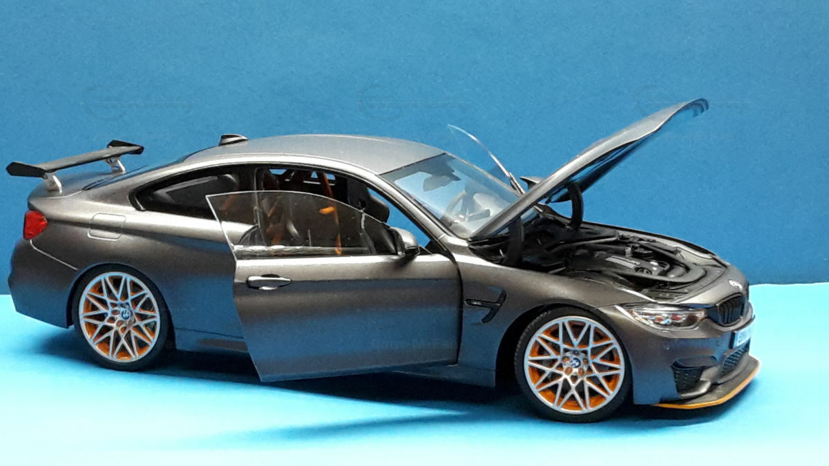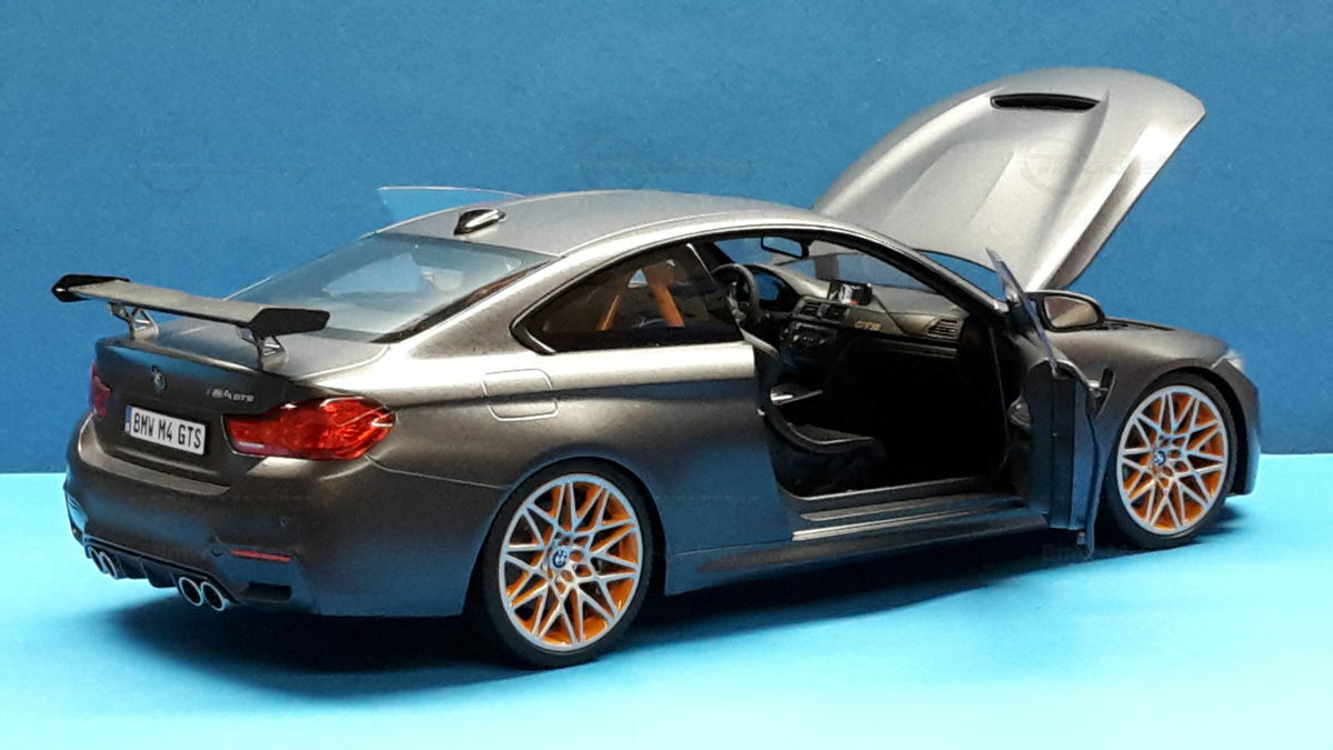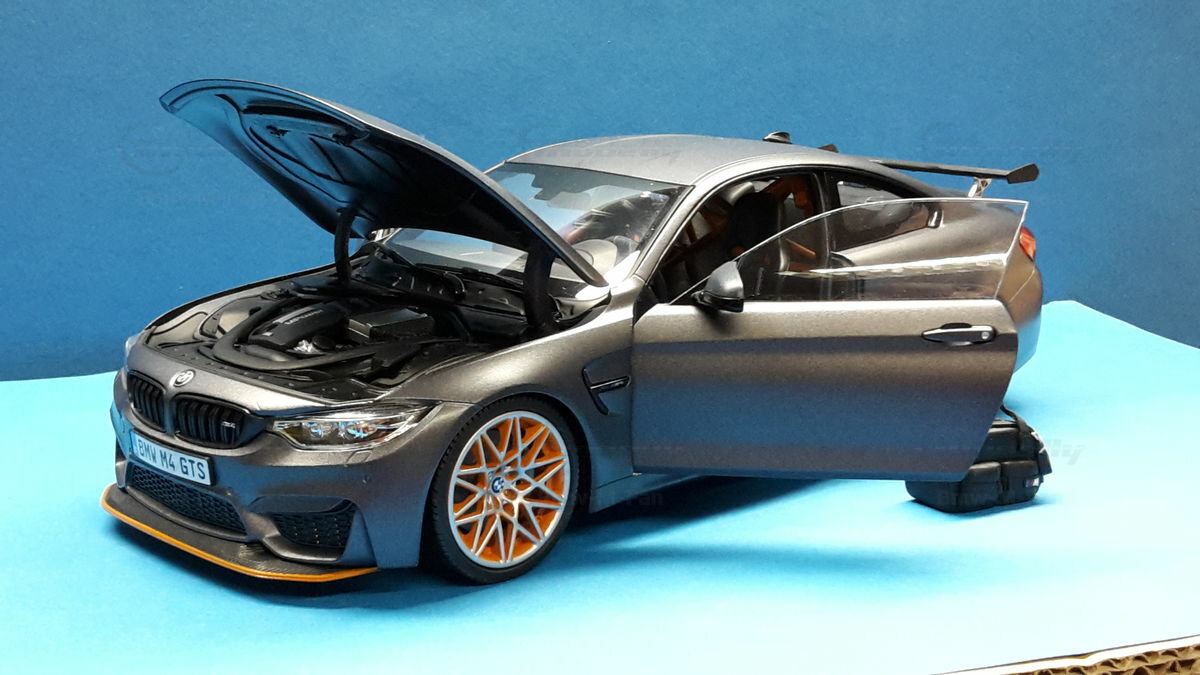 The original BMW F82 M4 GTS was heavily inspired by BMW's experiences and successes in motorsport. With a limited production run of only 700 units worldwide, this model is aimed at true motorsport enthusiasts. The M4 GTS can accelerate from 0 to 62 mph in 3.8 seconds and achieve a top speed of 190 mph, making it one of the fastest BMW production models. The model's replicated wheels, like the BMW M Performance forged wheels, also contribute to its authenticity, as well as the lifelike brakes and exhaust systems, detailed to perfection.