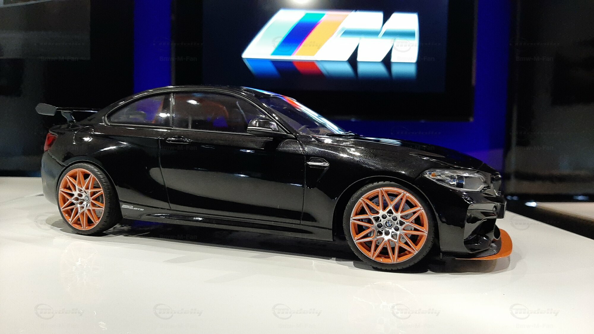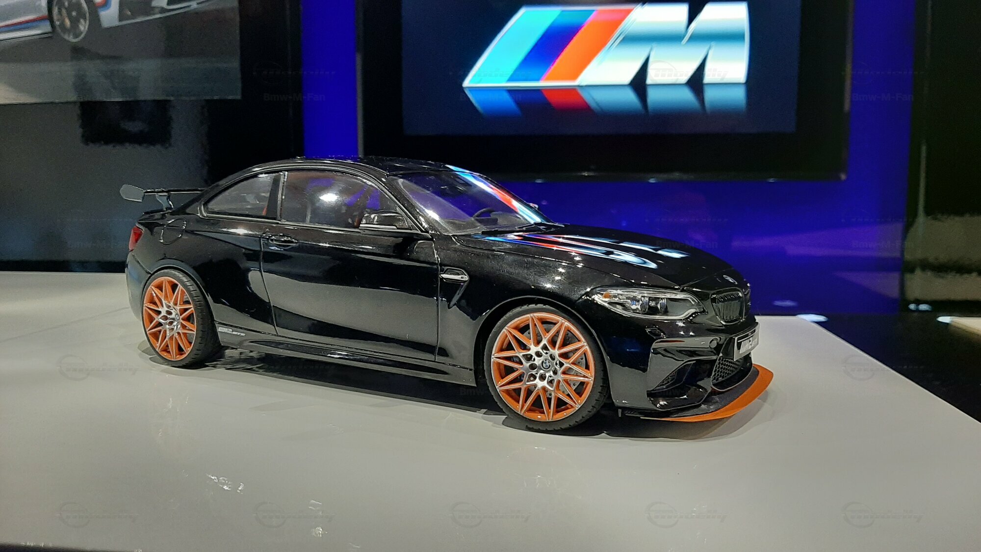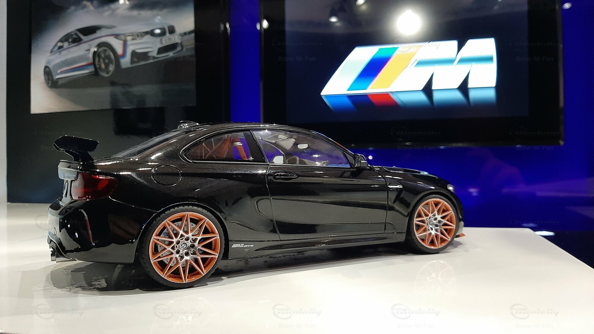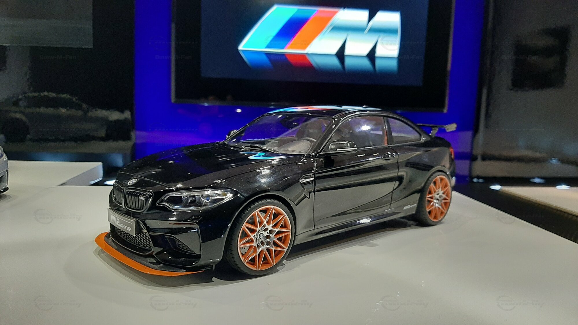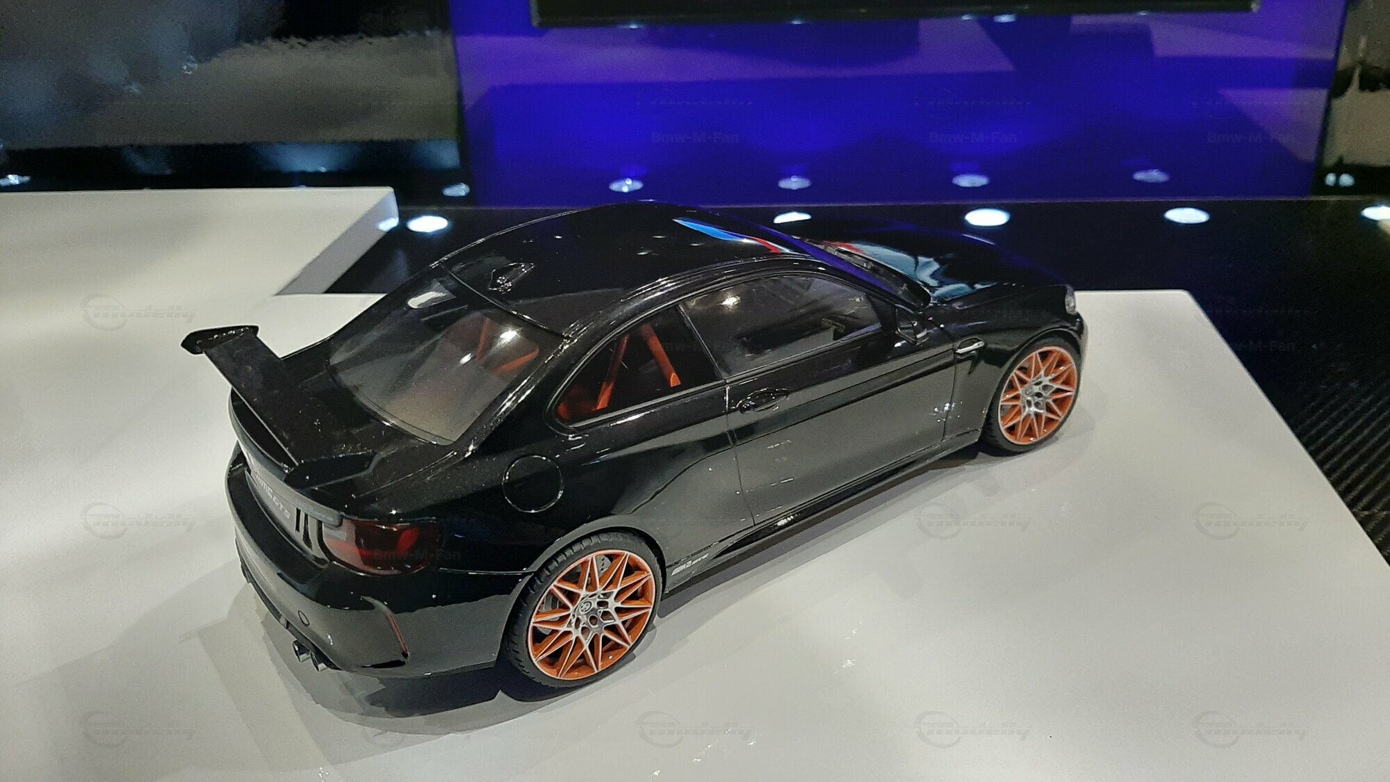 The model presented here is a modified version, not representing the original Minichamps product, but altered through individual adjustments and additions. This miniature is part of the collection of Modelly member "Bmw-M-Fan" and stands out with precise details that highlight the uniqueness of the model. The striking aerodynamic design of the original BMW F87 M2 GTS has been carefully replicated, along with the brightly orange wheels and rear wing, adding exciting accents. The presentation of the model on the display platform with the large M logo in the background gives the model a professional and glamorous appearance, attracting the attention of collectors worldwide.