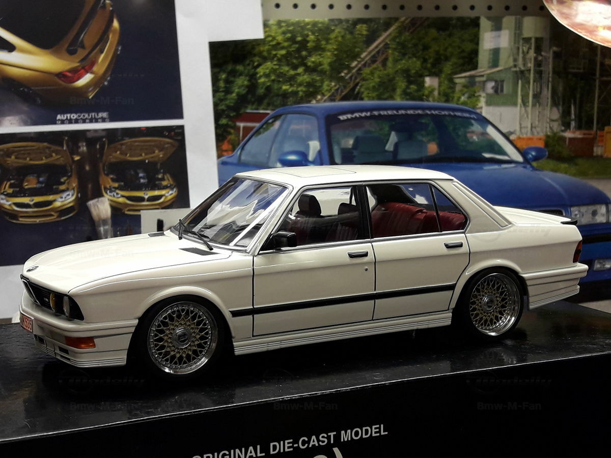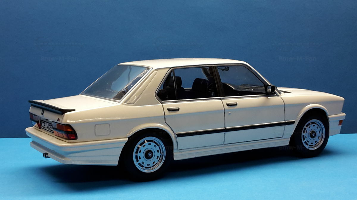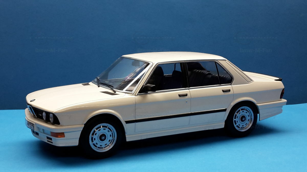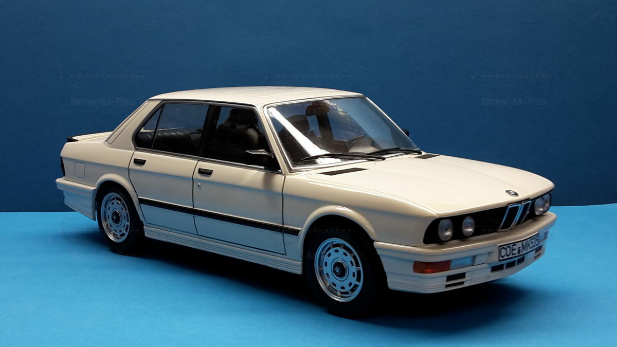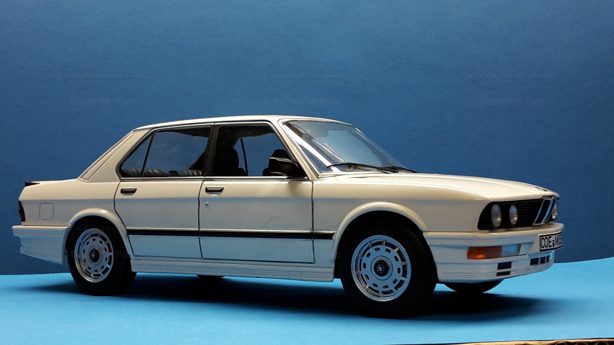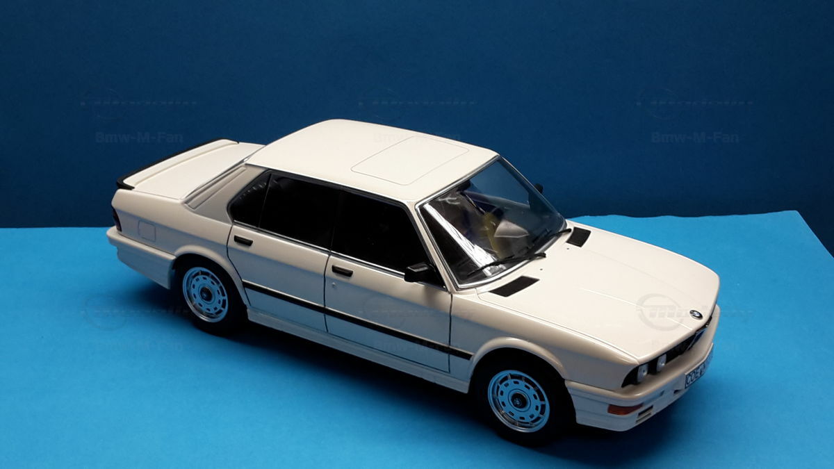 The model pictured here is a 1/18 scale replica of the BMW E28 M535i produced by Norev. The collector, who calls himself a "BMW-M-Fan," has this meticulously detailed replica in his collection. The model stands out for its precise attention to detail and excellent craftsmanship, typical of die-cast material production. The model's elegant white paint scheme is accentuated by fine black side stripes, while the red sports seats in the interior contrast effectively. The replicated BBS wheels are also striking, matching the original wheels of the BMW E28 M535i and completing the sporty design of the model. This 1/18 die-cast version by Norev showcases carefully crafted elements like the front spoiler, mirrors, and body details.