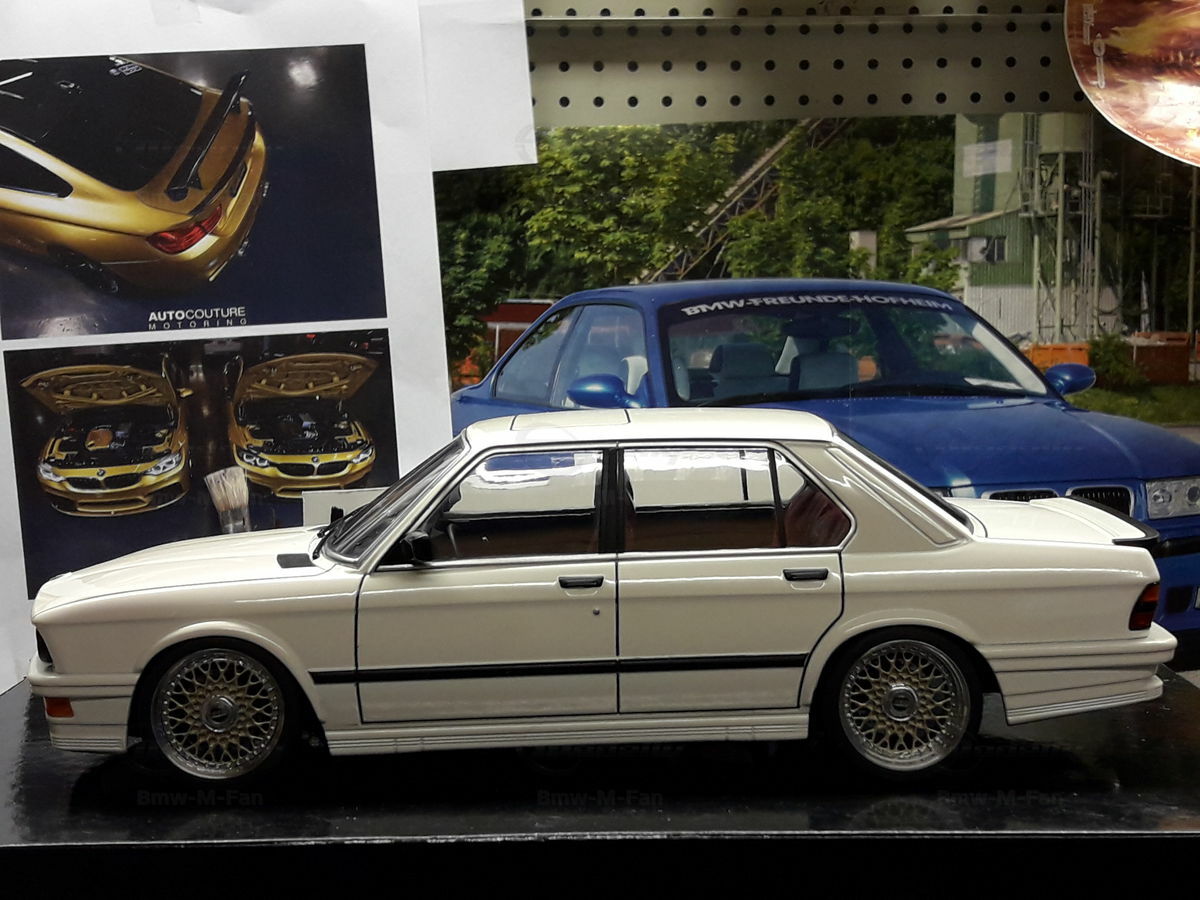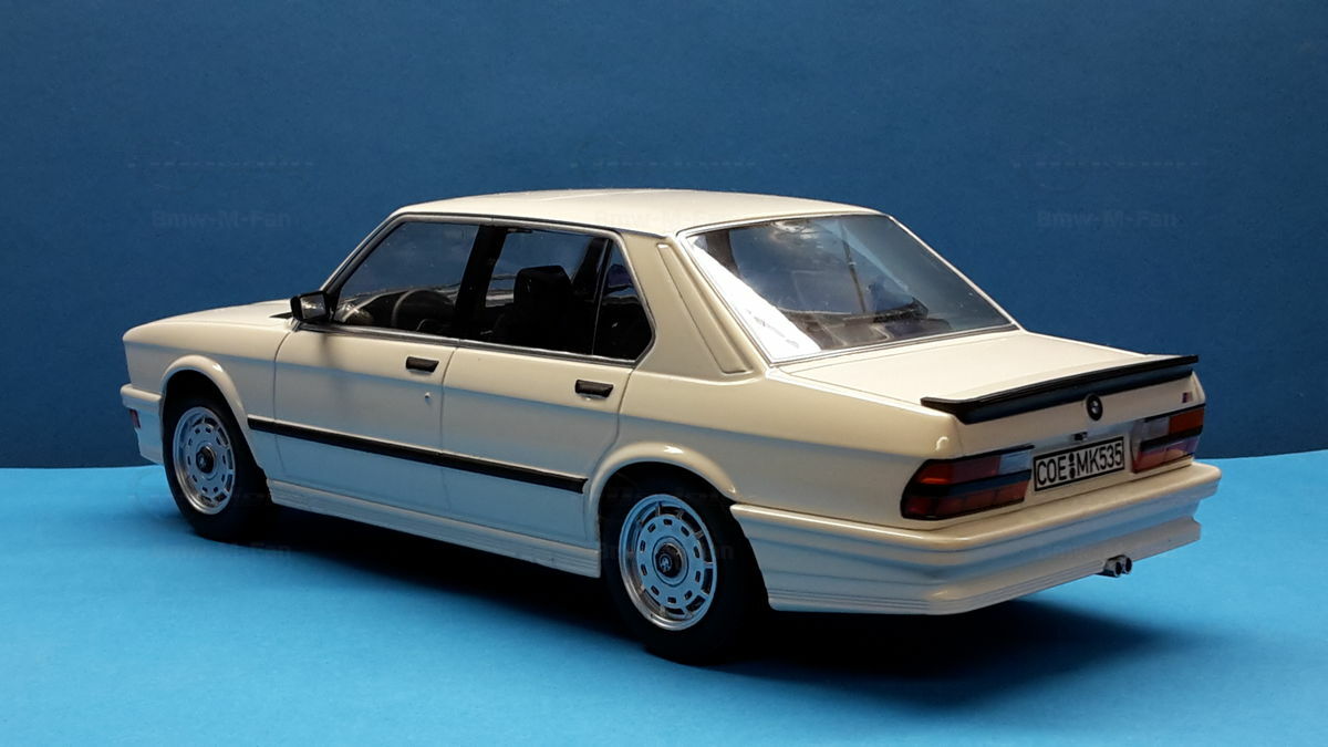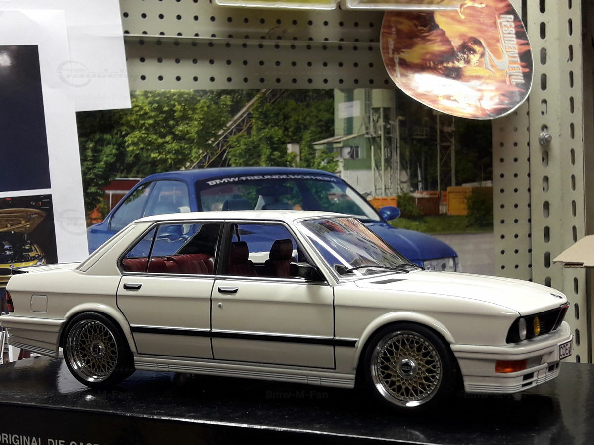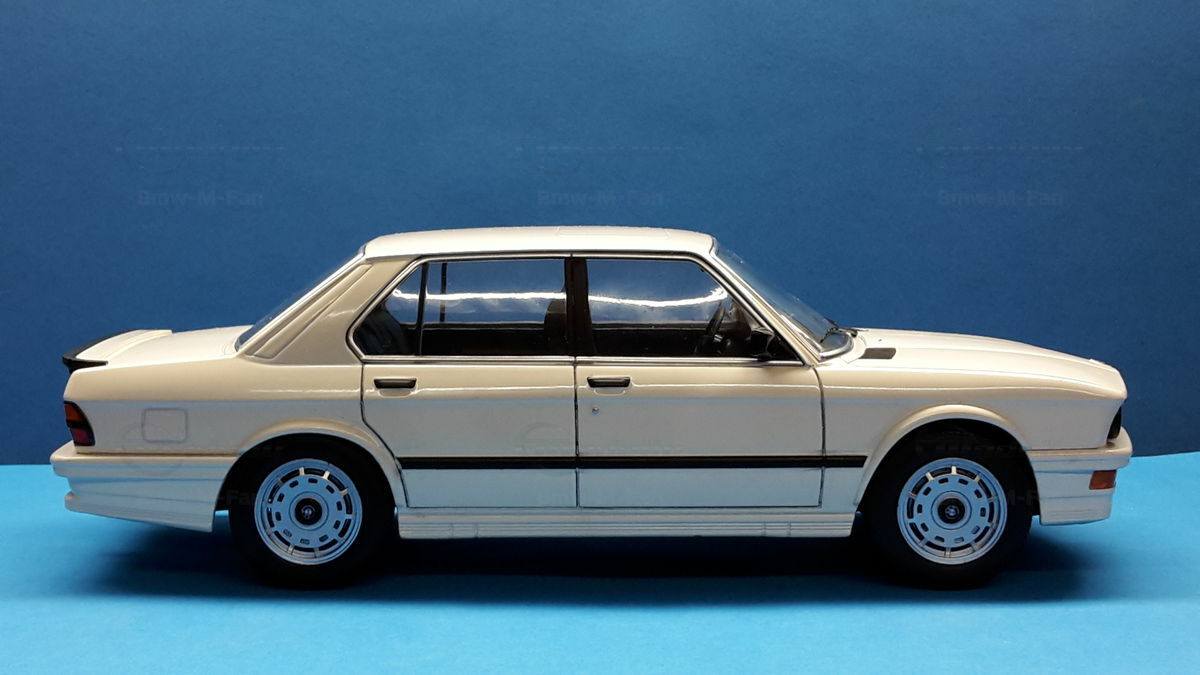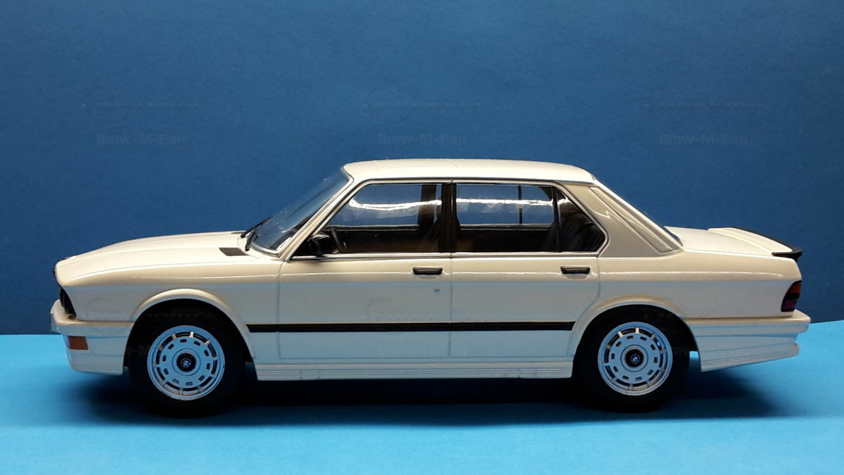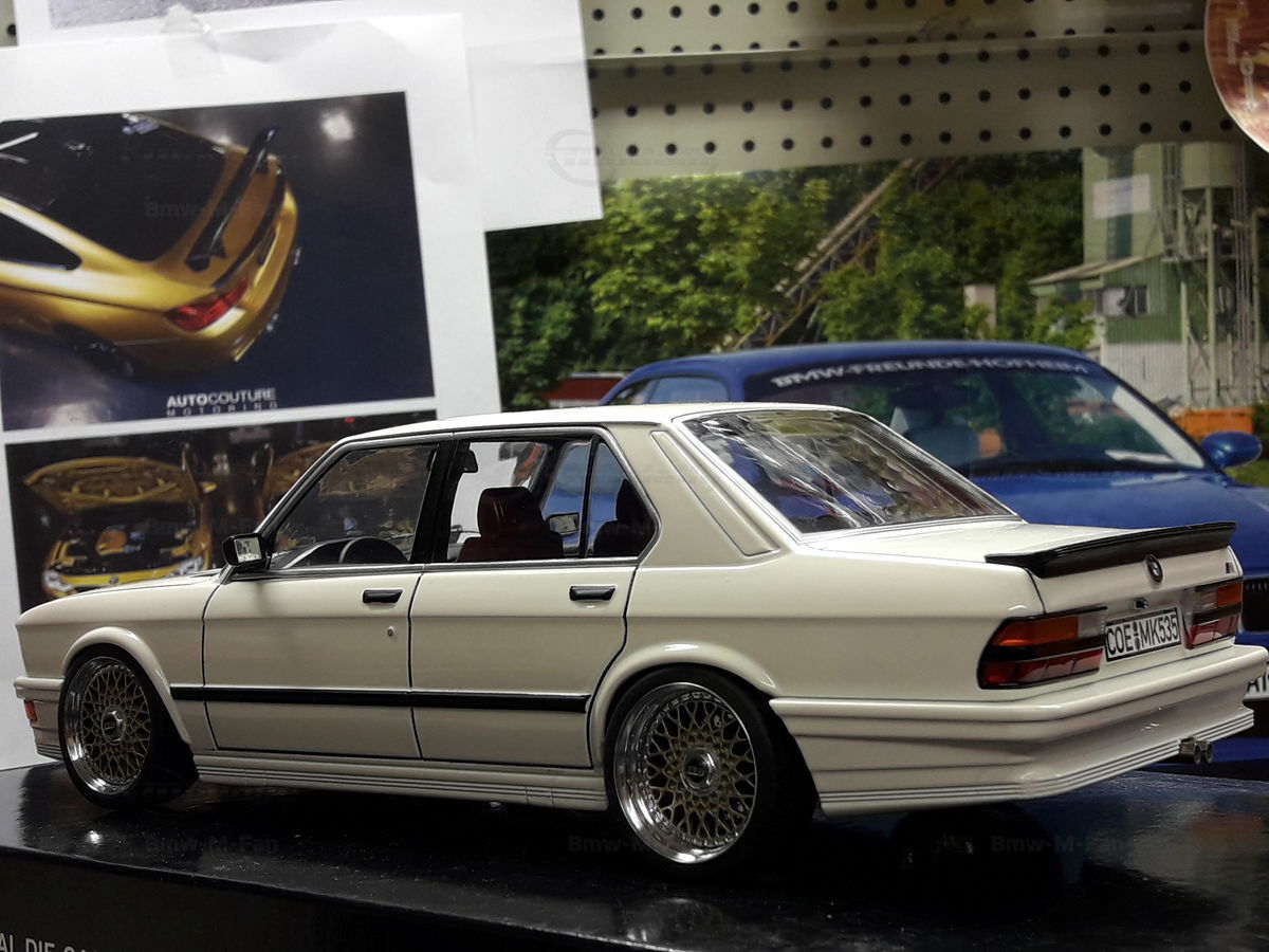 The model pictured here is a 1/18 scale replica of the BMW E28 M535i produced by Norev. The collector, who calls himself a "BMW-M-Fan," has this meticulously detailed replica in his collection. The model stands out for its precise attention to detail and excellent craftsmanship, typical of die-cast material production. The model's elegant white paint scheme is accentuated by fine black side stripes, while the red sports seats in the interior contrast effectively. The replicated BBS wheels are also striking, matching the original wheels of the BMW E28 M535i and completing the sporty design of the model. This 1/18 die-cast version by Norev showcases carefully crafted elements like the front spoiler, mirrors, and body details.