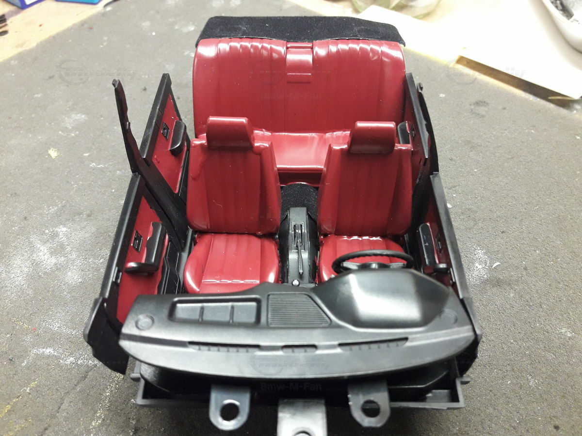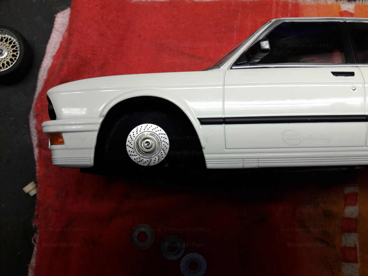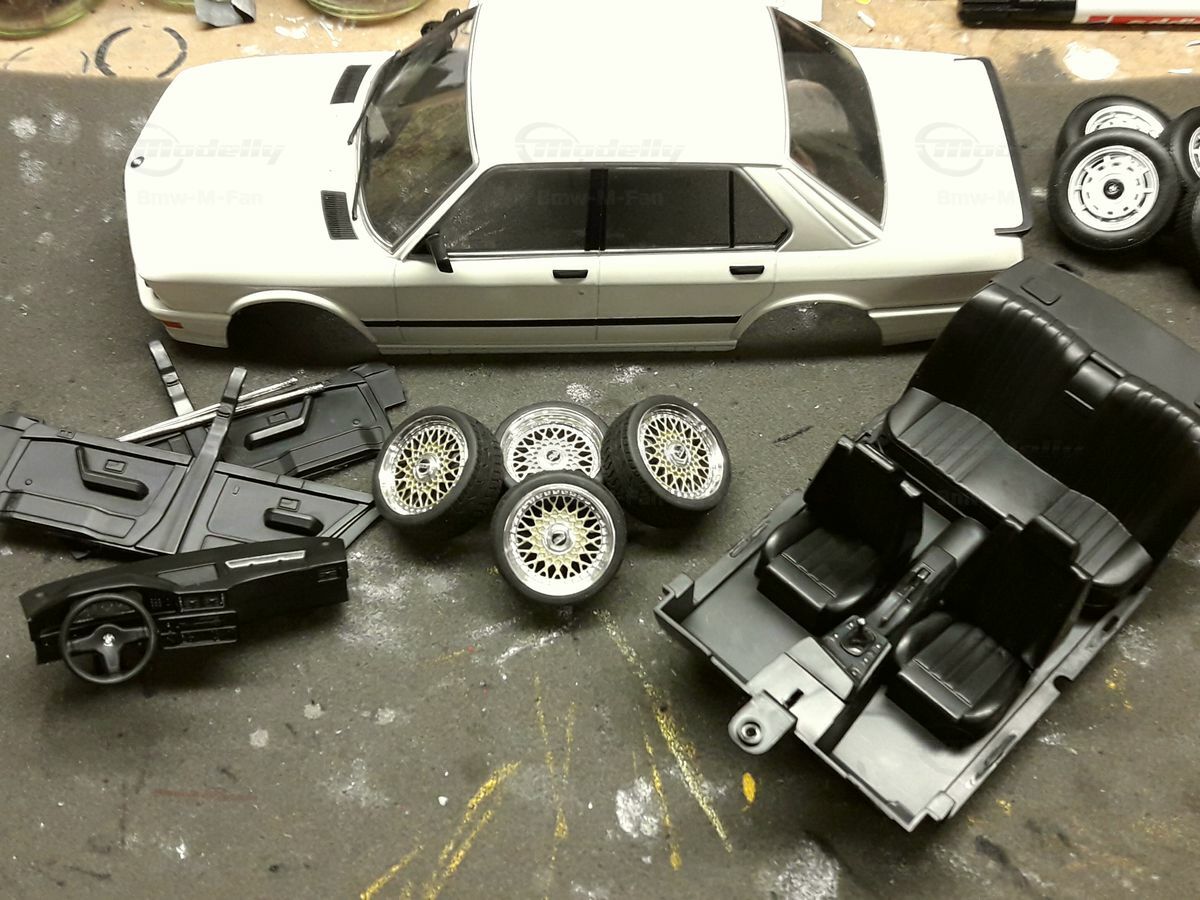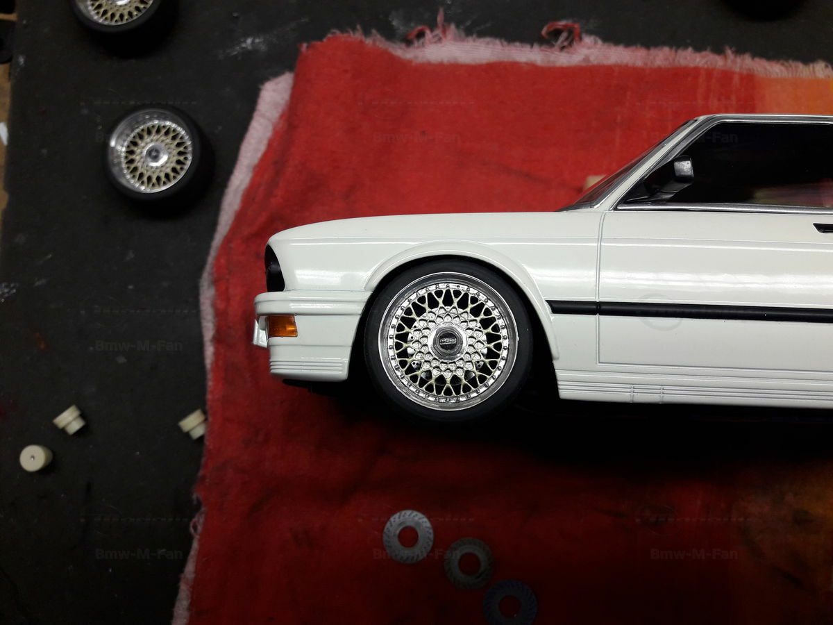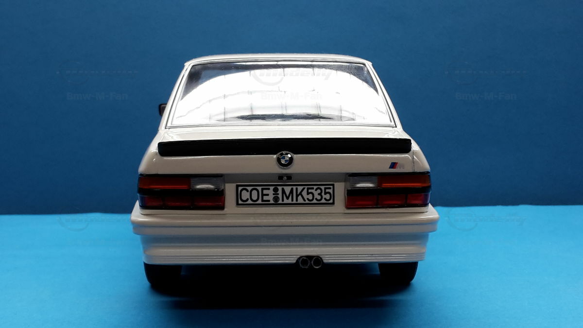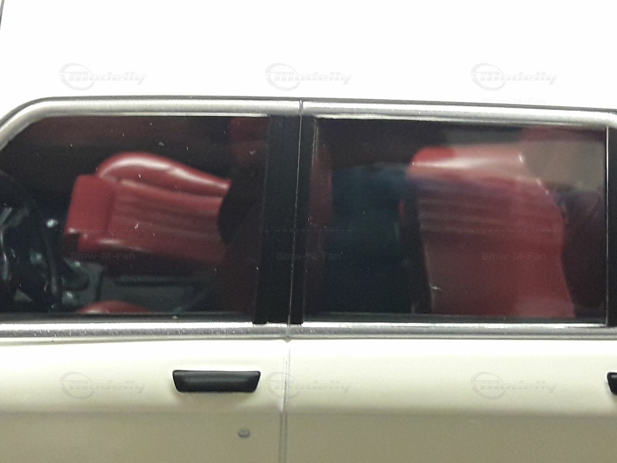 The model pictured here is a 1/18 scale replica of the BMW E28 M535i produced by Norev. The collector, who calls himself a "BMW-M-Fan," has this meticulously detailed replica in his collection. The model stands out for its precise attention to detail and excellent craftsmanship, typical of die-cast material production. The model's elegant white paint scheme is accentuated by fine black side stripes, while the red sports seats in the interior contrast effectively. The replicated BBS wheels are also striking, matching the original wheels of the BMW E28 M535i and completing the sporty design of the model. This 1/18 die-cast version by Norev showcases carefully crafted elements like the front spoiler, mirrors, and body details.