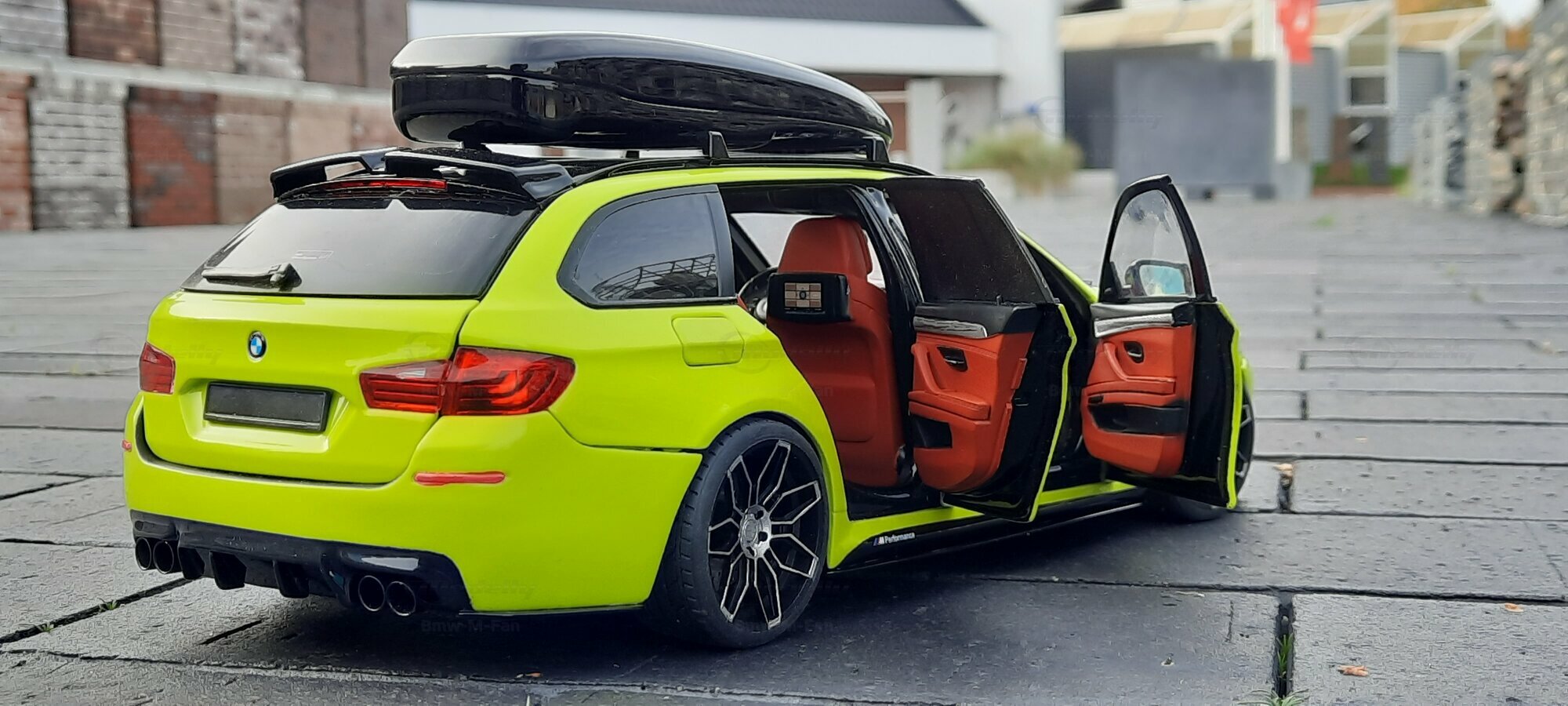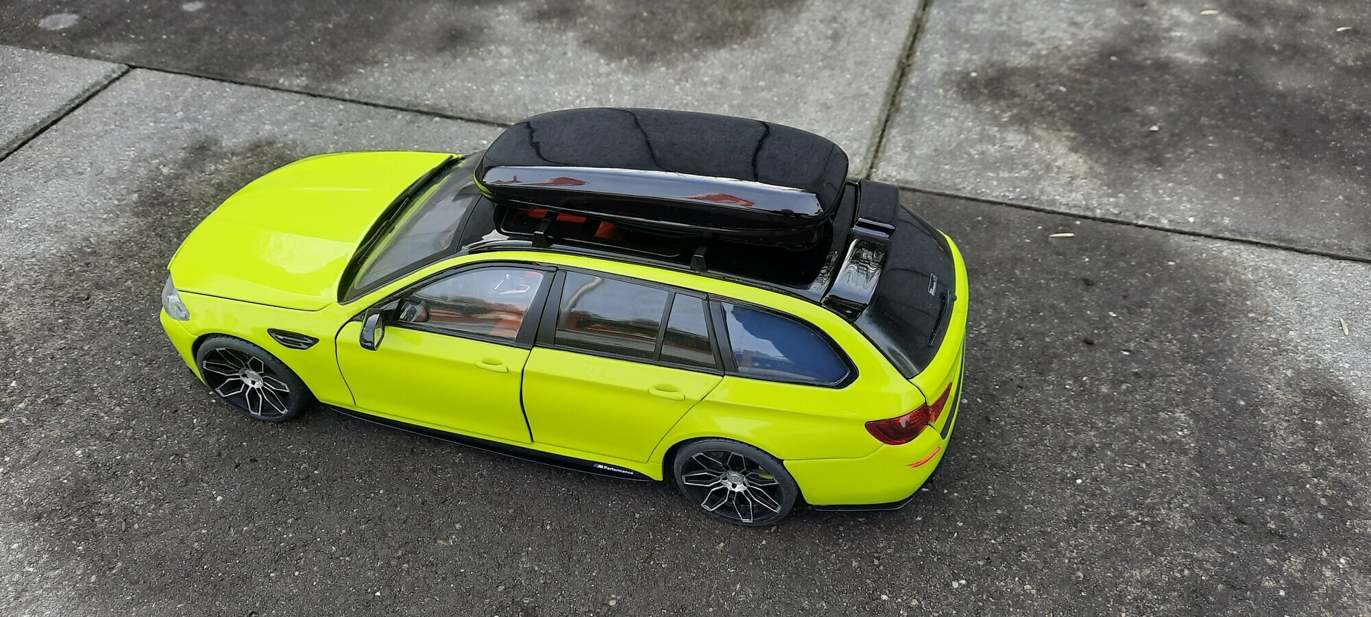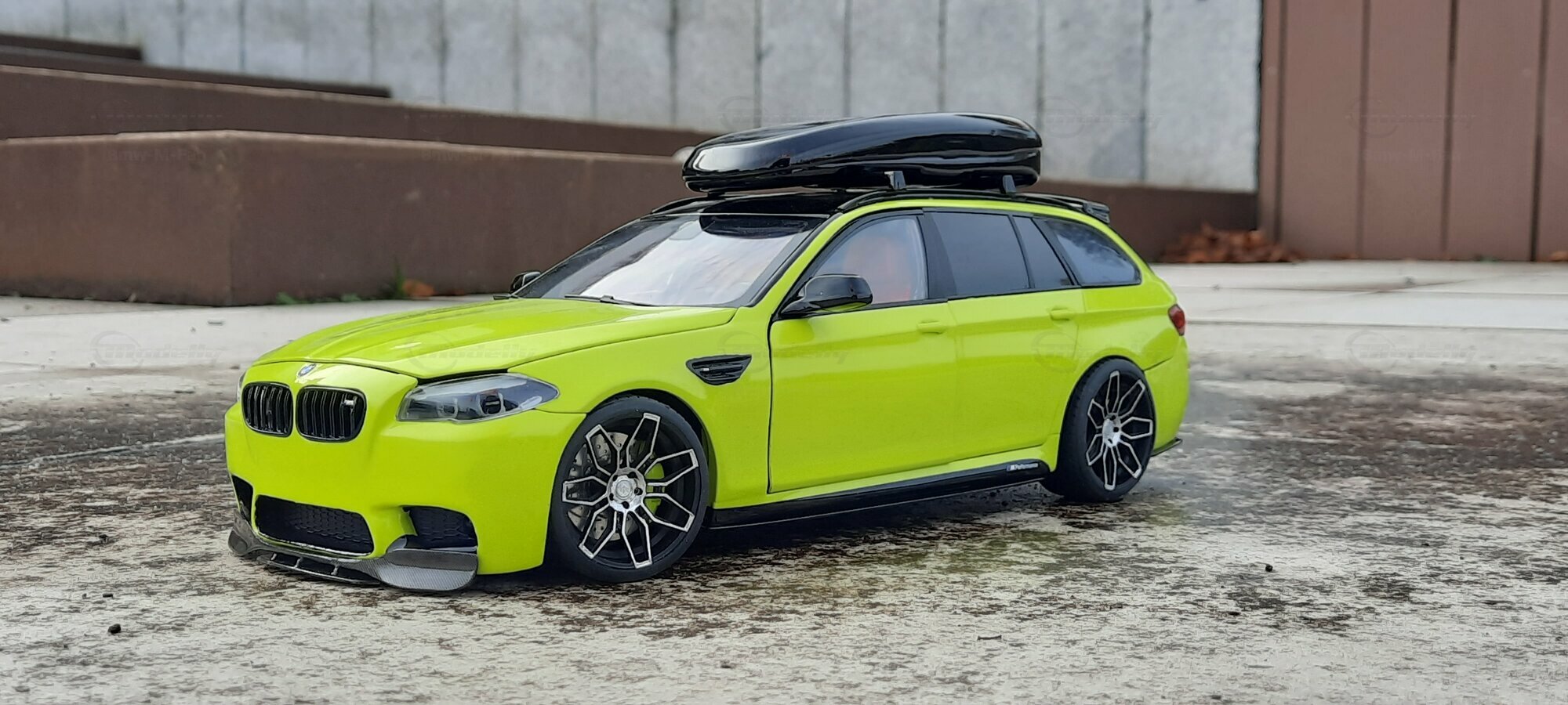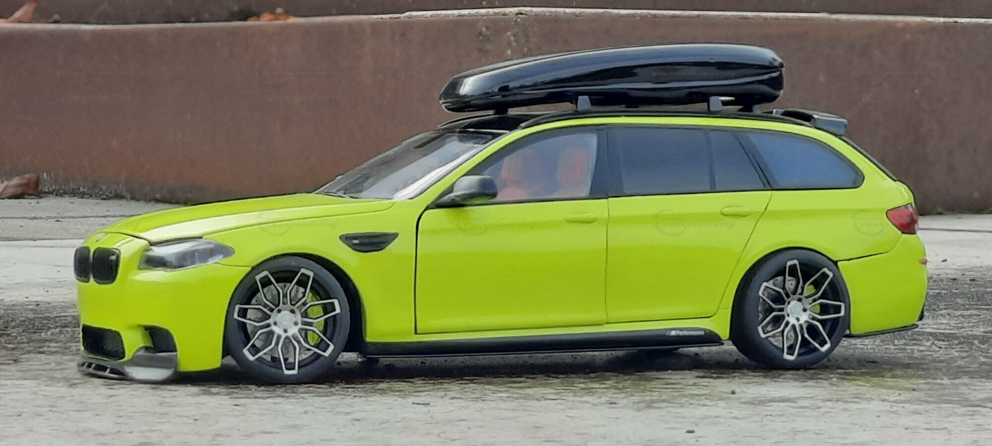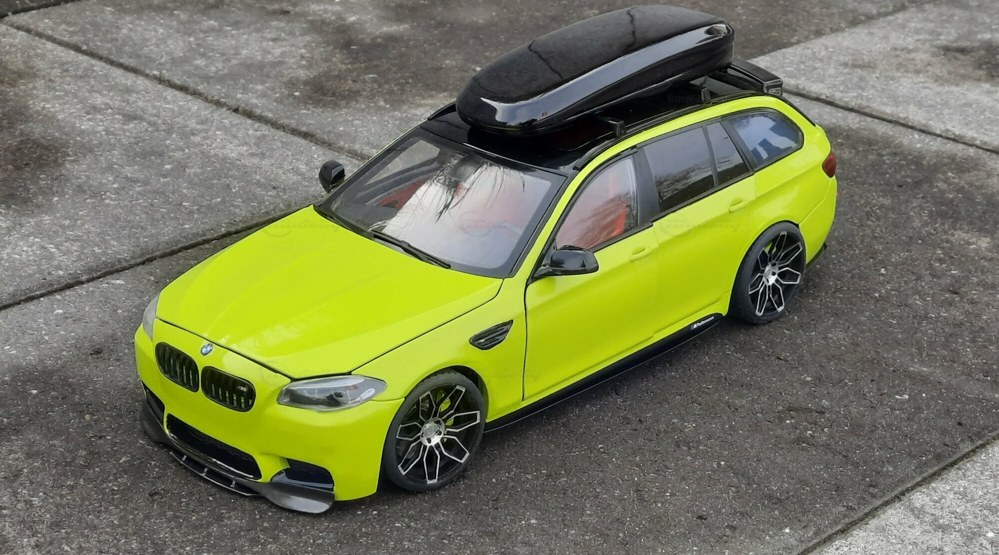 The most striking change to this model is the special paint job. The vibrant yellow hue with the contrasting black roof gives the vehicle a distinctive presence. This color combination is rare in the automotive realm, adding a special allure to the model. Equally notable are the mounted wheels sourced from BMW Performance, adding a sporty touch to the vehicle. Additionally, the roof box enhances the uniqueness of the model and underscores the practical utility of the F11 as a spacious Tourer.