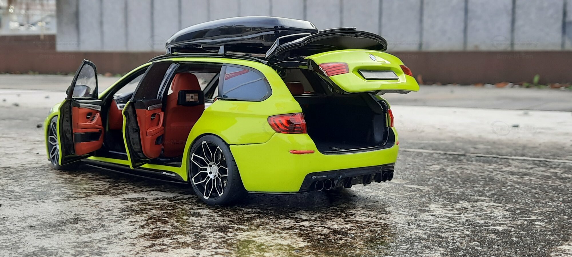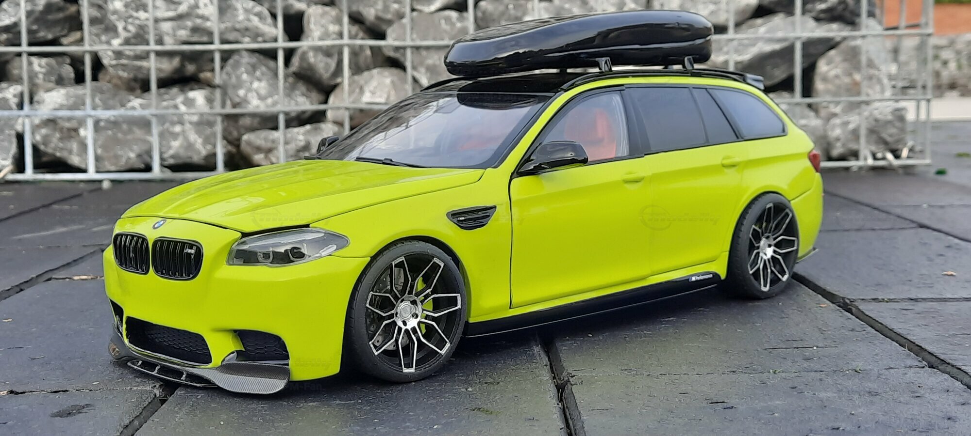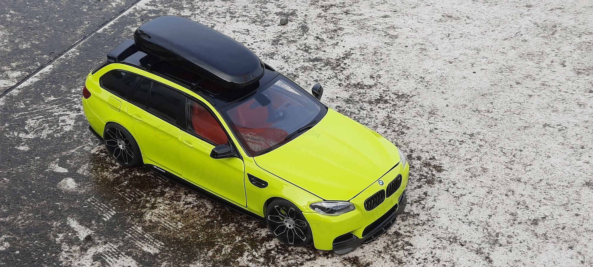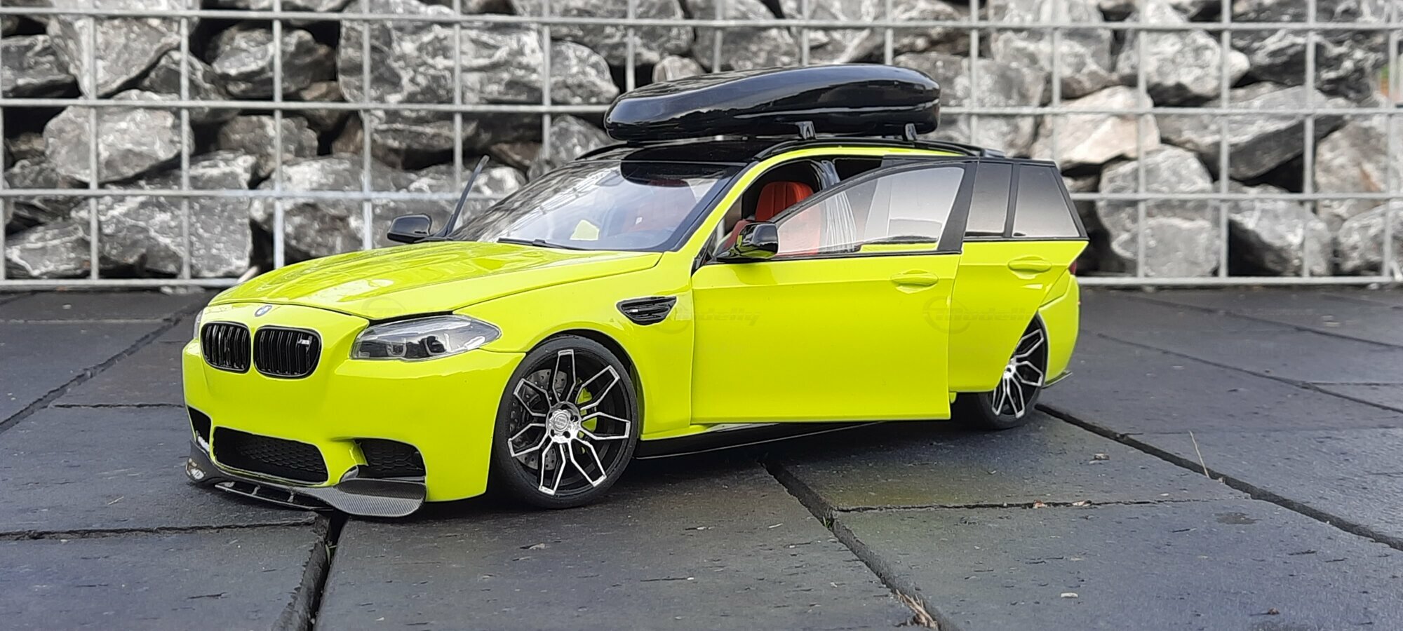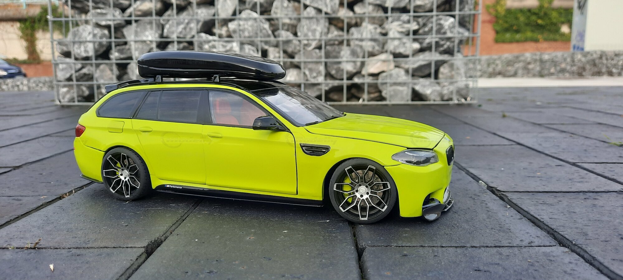 The most striking change to this model is the special paint job. The vibrant yellow hue with the contrasting black roof gives the vehicle a distinctive presence. This color combination is rare in the automotive realm, adding a special allure to the model. Equally notable are the mounted wheels sourced from BMW Performance, adding a sporty touch to the vehicle. Additionally, the roof box enhances the uniqueness of the model and underscores the practical utility of the F11 as a spacious Tourer.