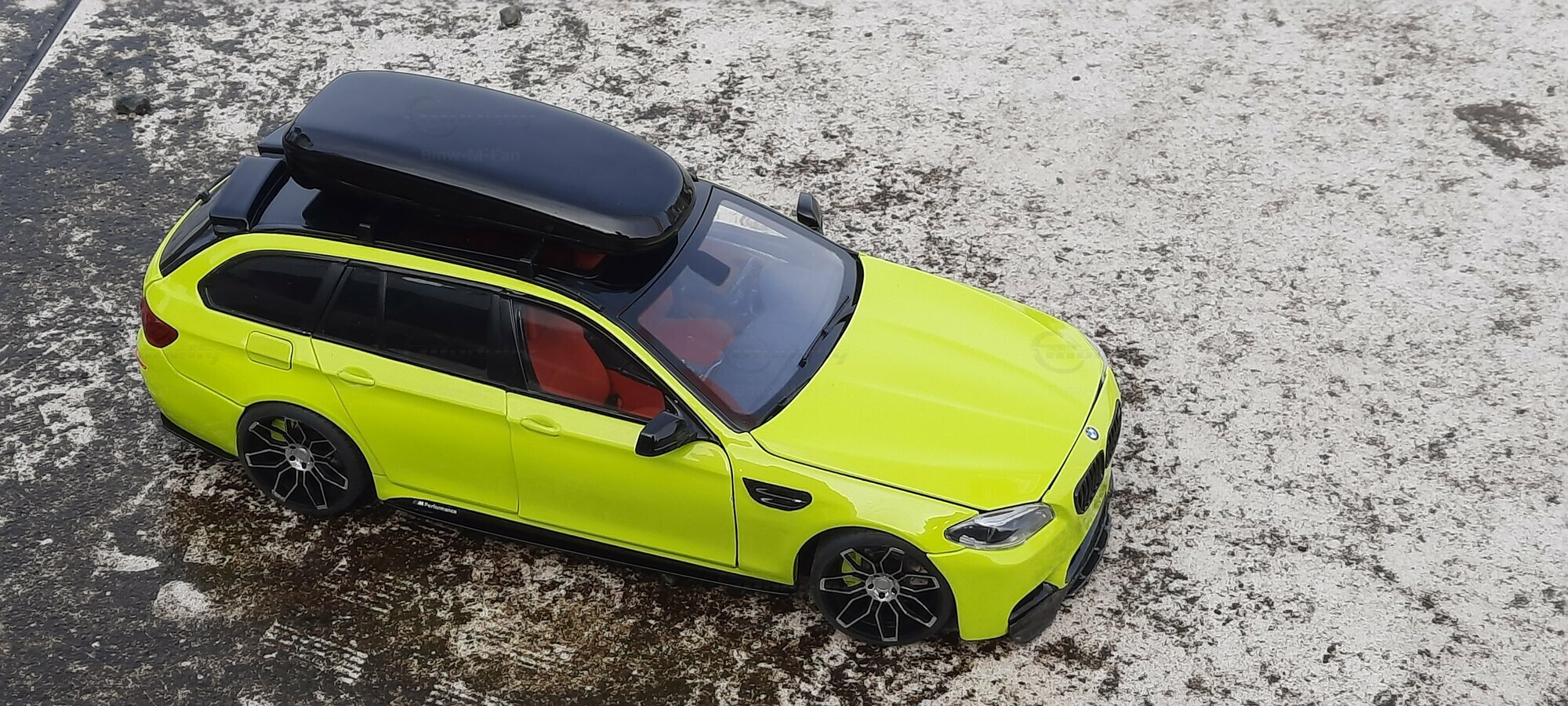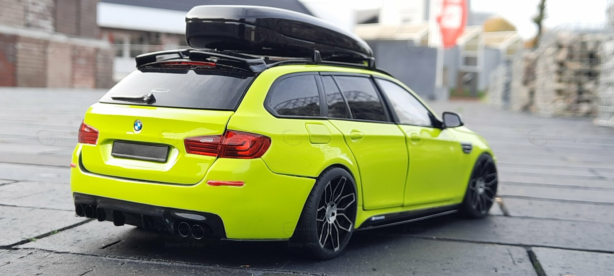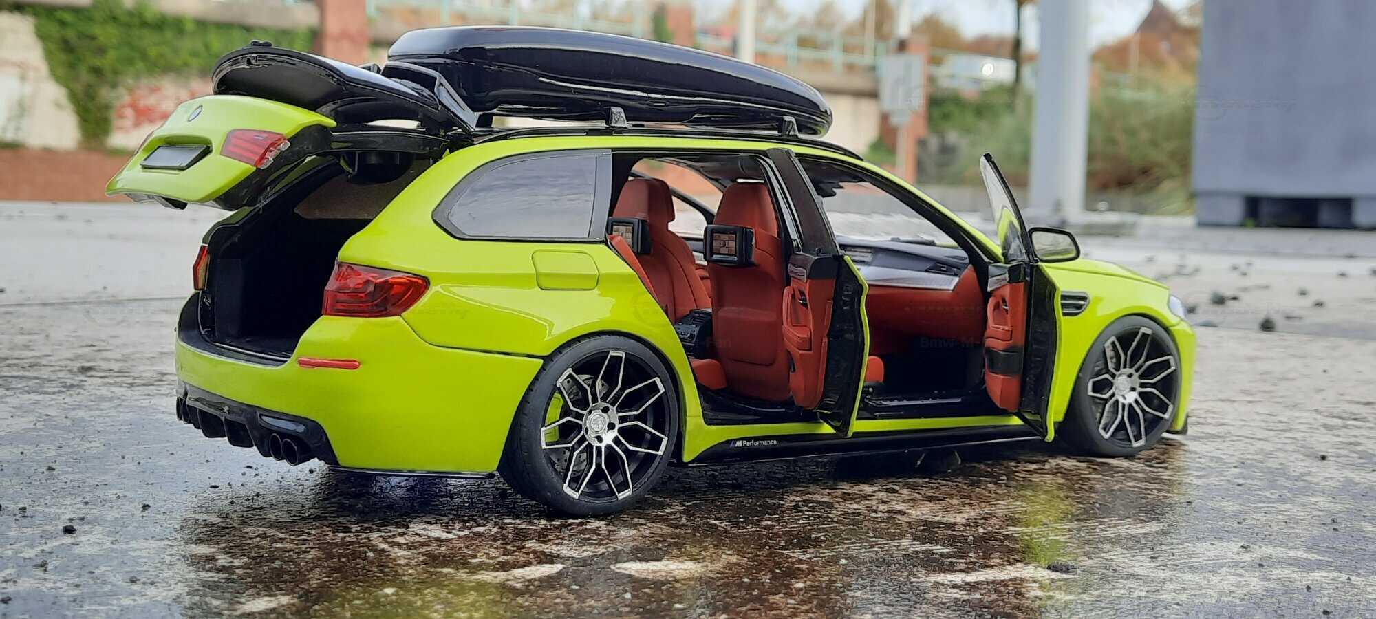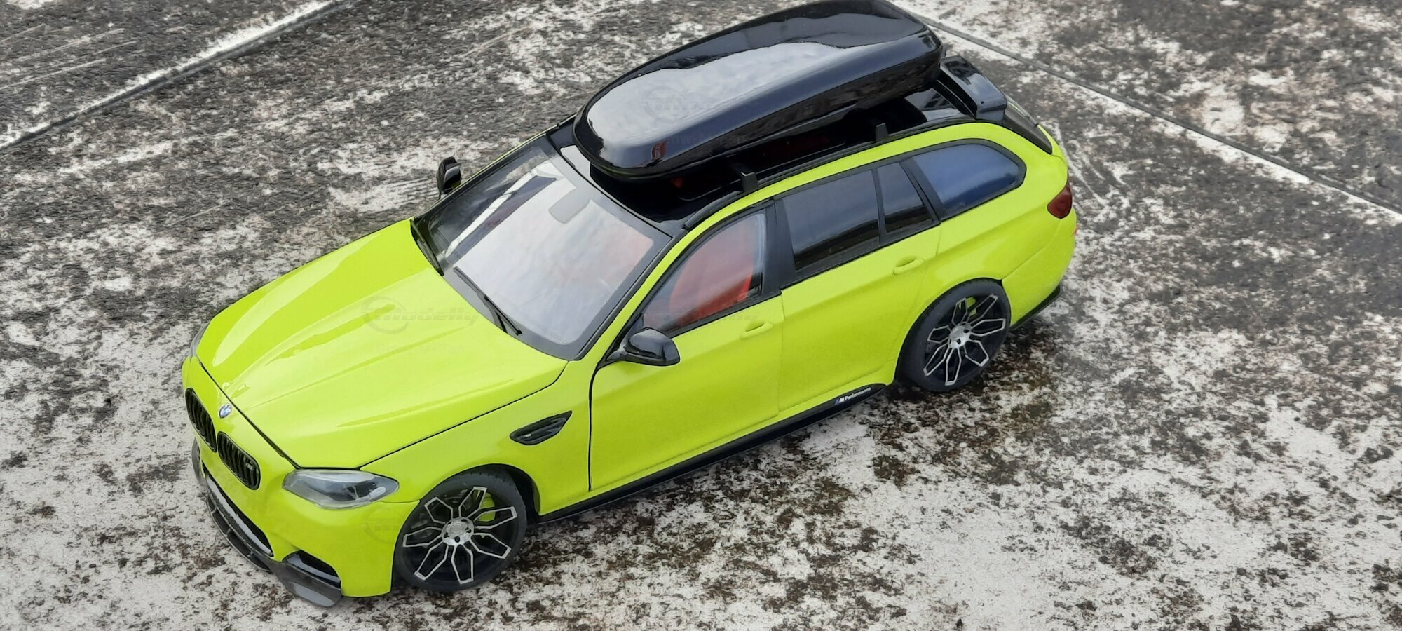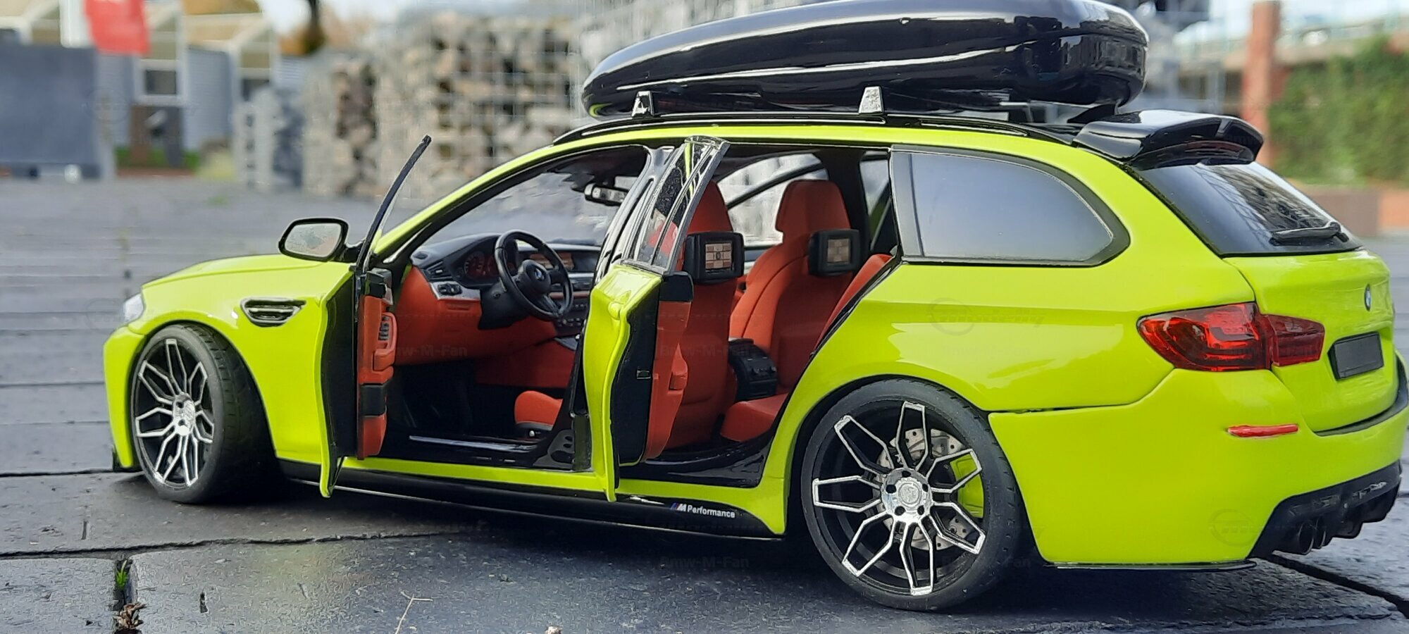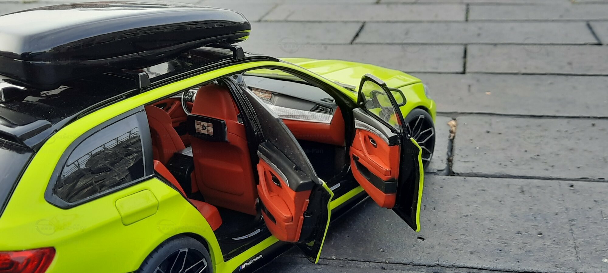 The most striking change to this model is the special paint job. The vibrant yellow hue with the contrasting black roof gives the vehicle a distinctive presence. This color combination is rare in the automotive realm, adding a special allure to the model. Equally notable are the mounted wheels sourced from BMW Performance, adding a sporty touch to the vehicle. Additionally, the roof box enhances the uniqueness of the model and underscores the practical utility of the F11 as a spacious Tourer.