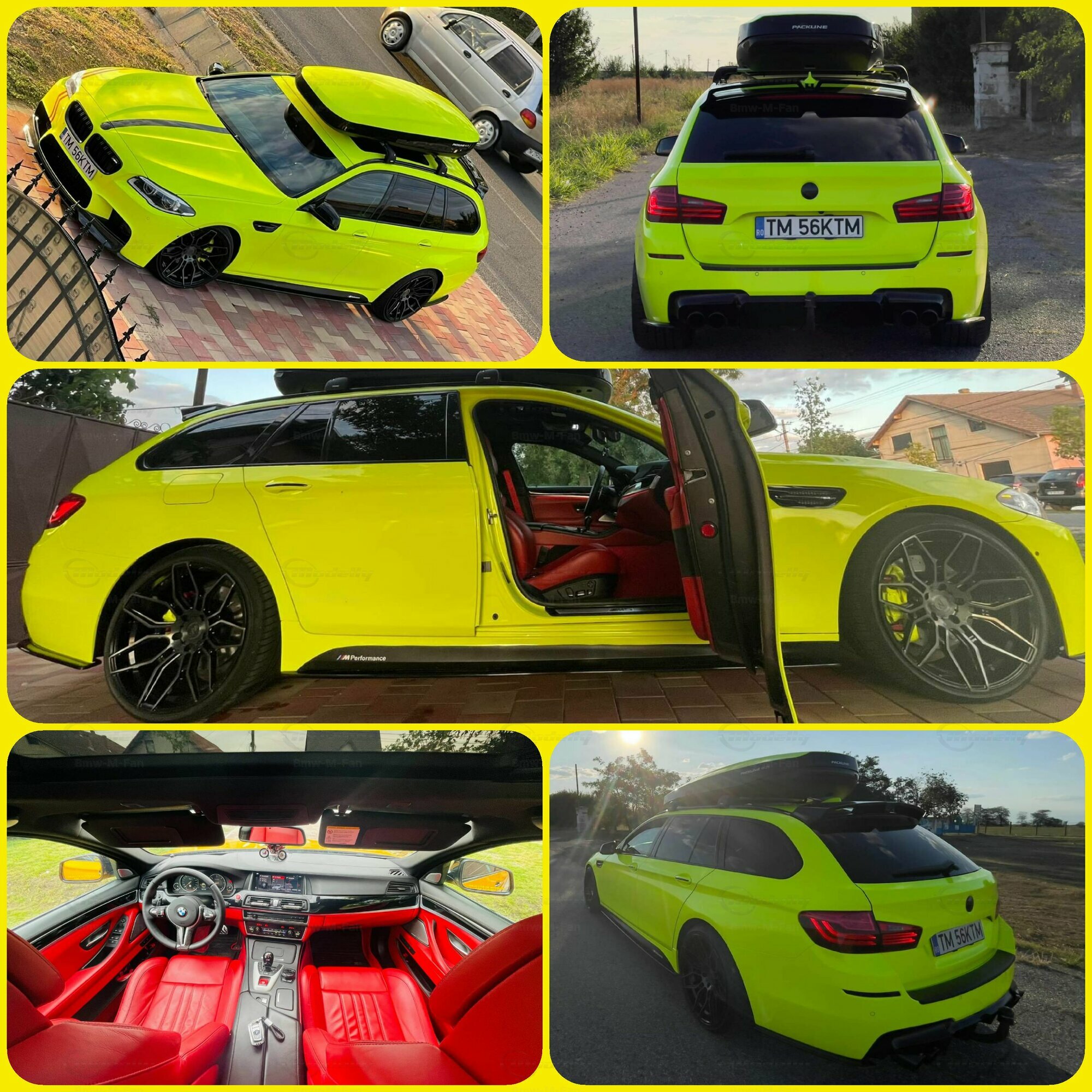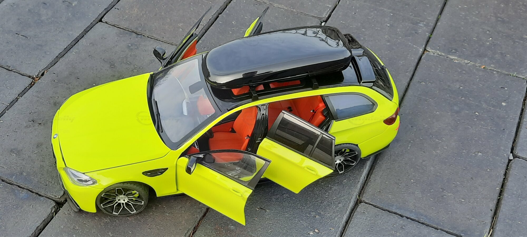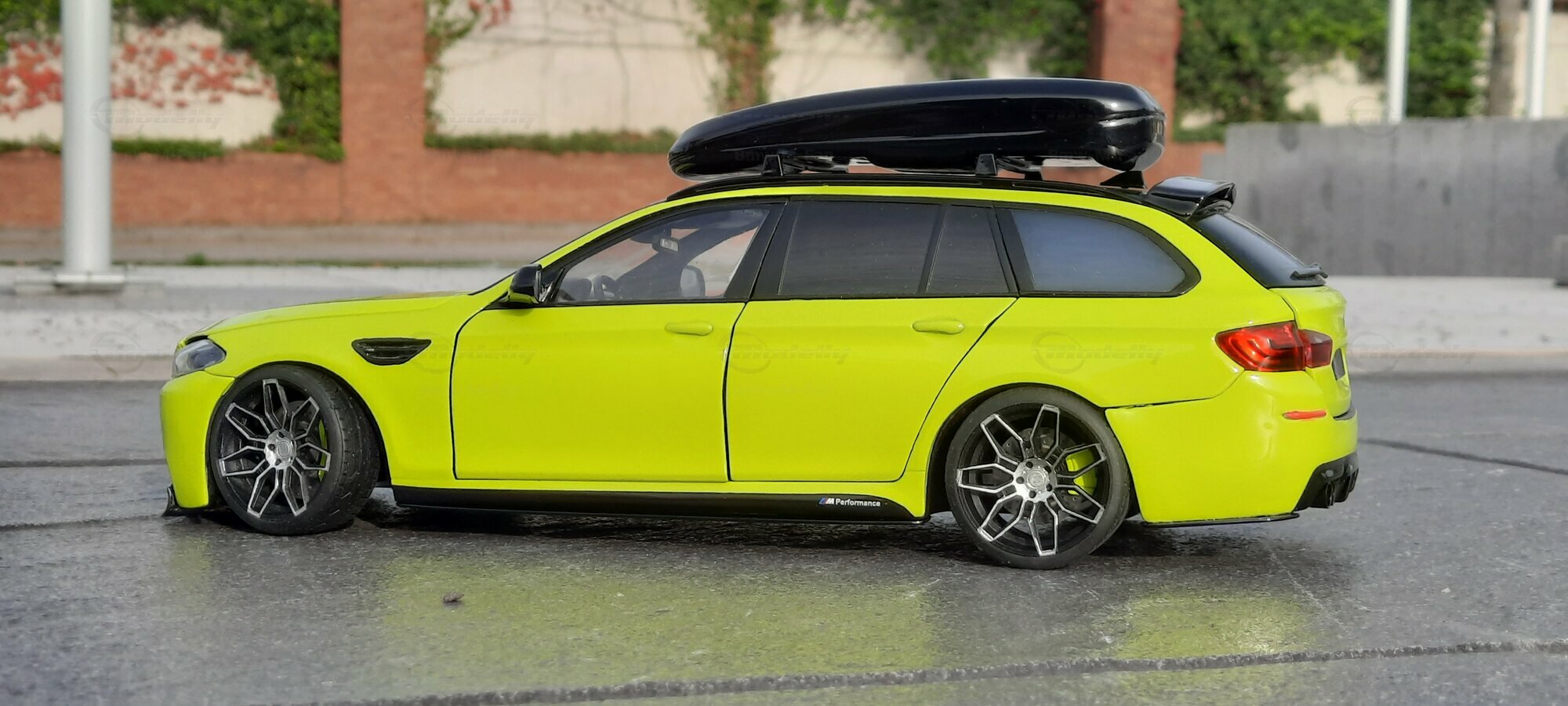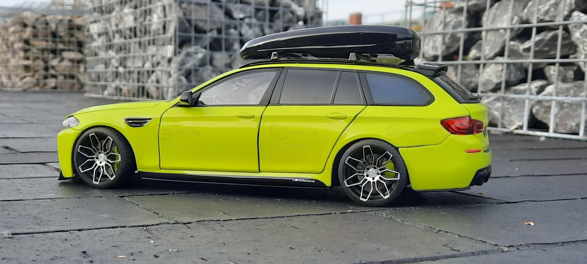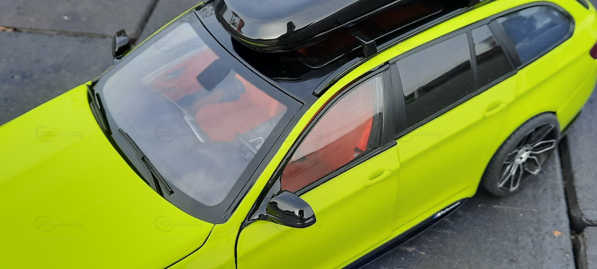 The most striking change to this model is the special paint job. The vibrant yellow hue with the contrasting black roof gives the vehicle a distinctive presence. This color combination is rare in the automotive realm, adding a special allure to the model. Equally notable are the mounted wheels sourced from BMW Performance, adding a sporty touch to the vehicle. Additionally, the roof box enhances the uniqueness of the model and underscores the practical utility of the F11 as a spacious Tourer.