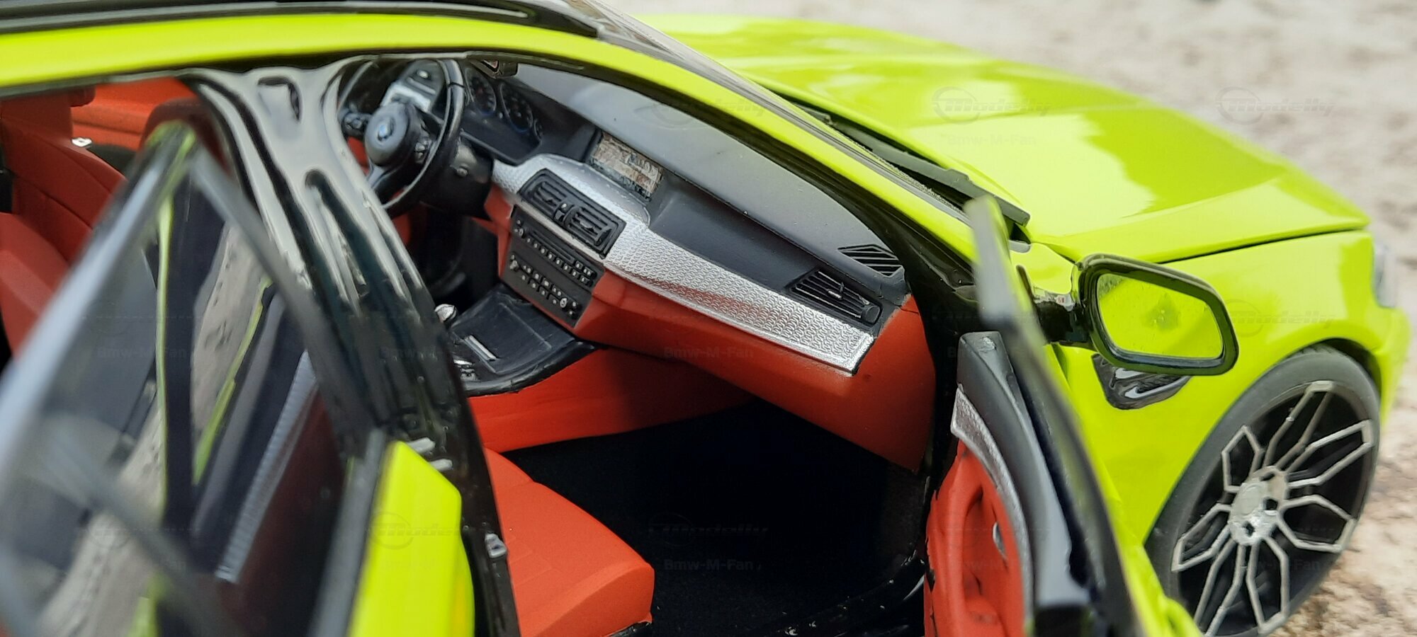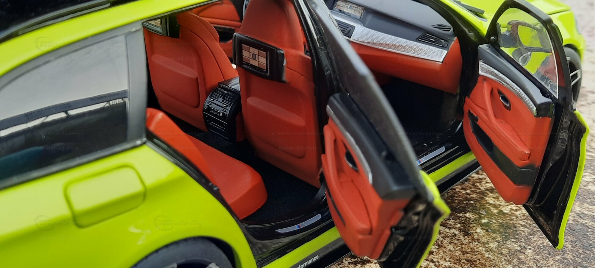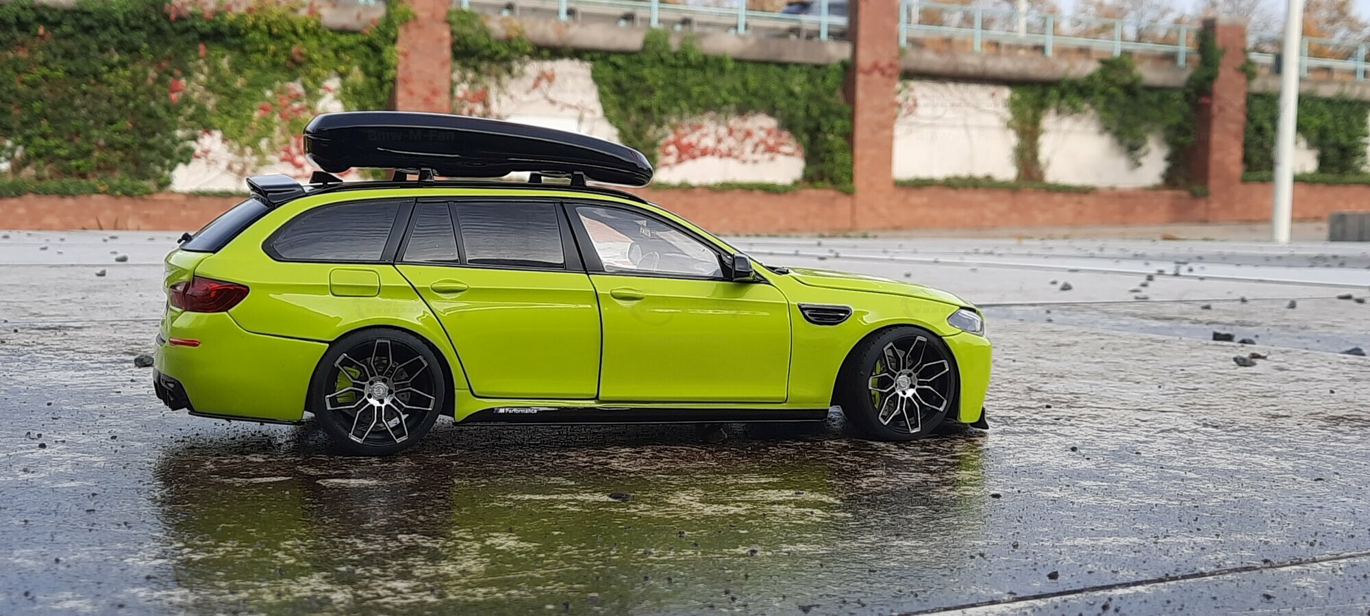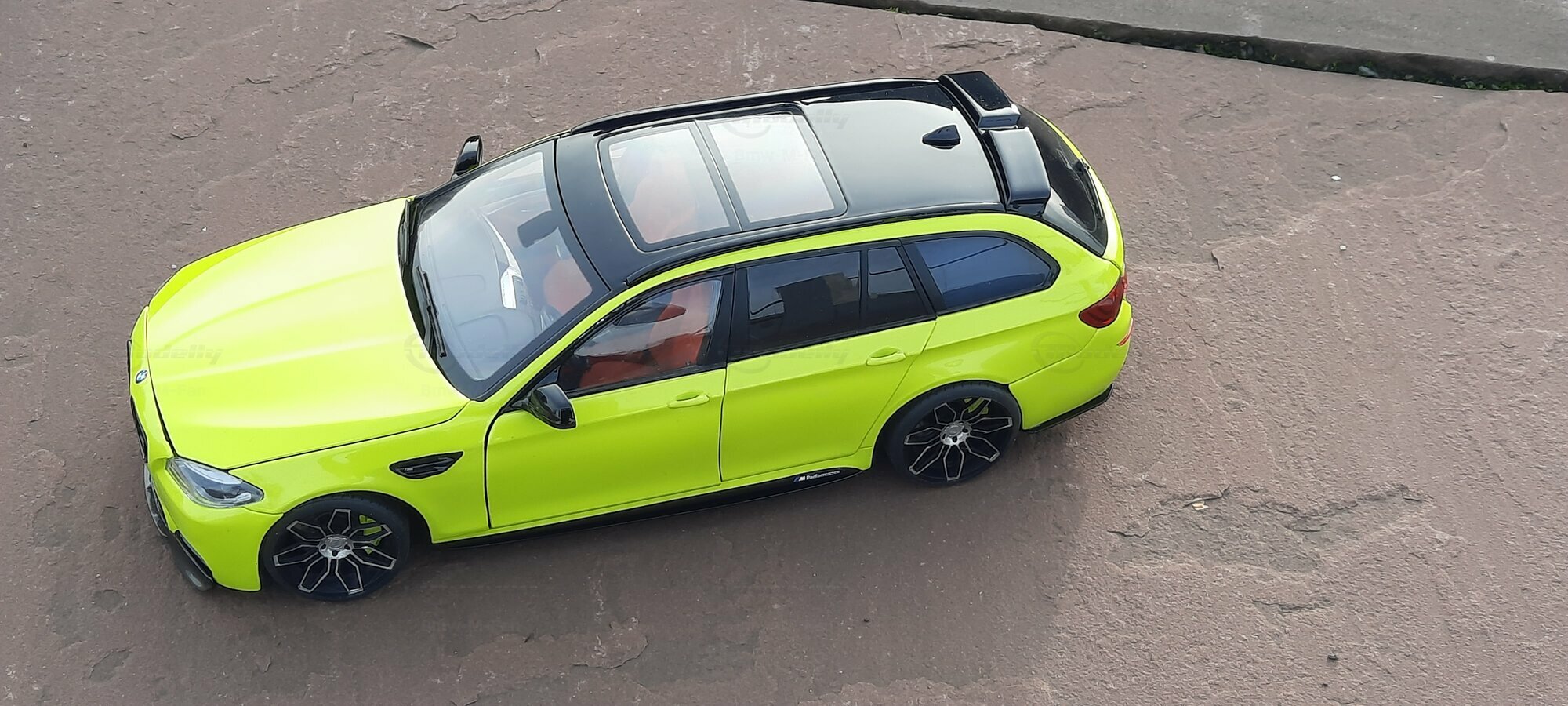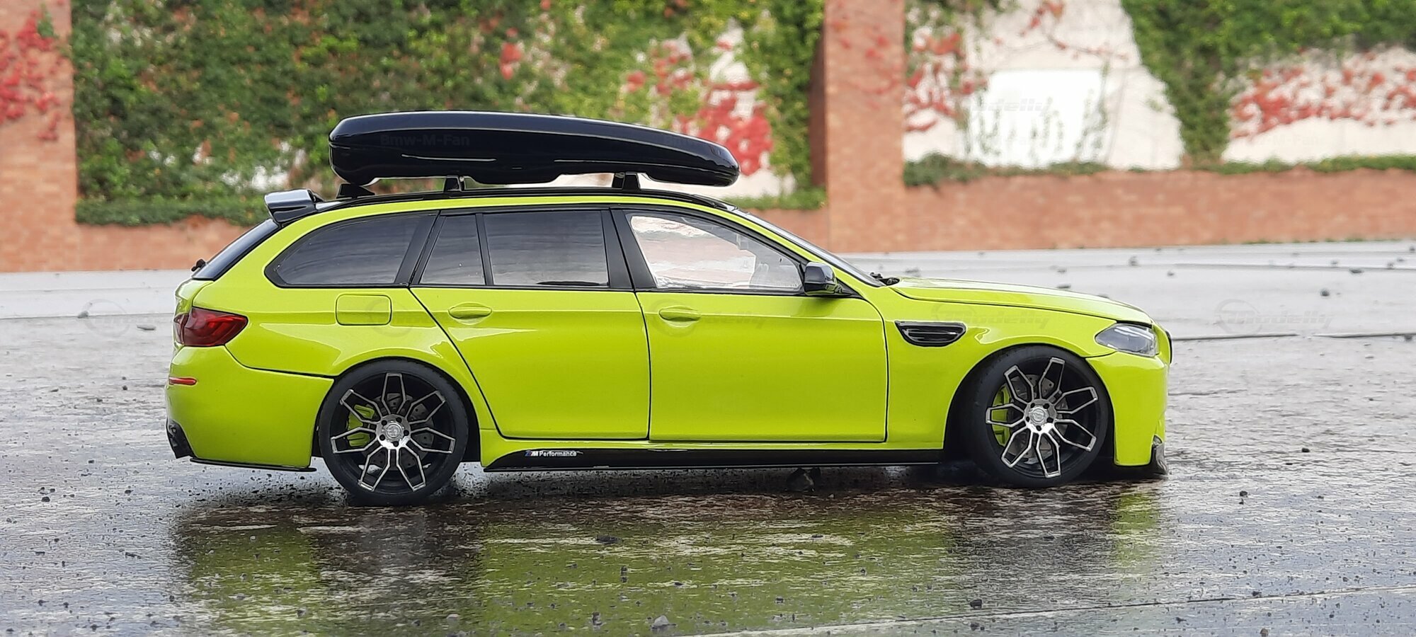 The most striking change to this model is the special paint job. The vibrant yellow hue with the contrasting black roof gives the vehicle a distinctive presence. This color combination is rare in the automotive realm, adding a special allure to the model. Equally notable are the mounted wheels sourced from BMW Performance, adding a sporty touch to the vehicle. Additionally, the roof box enhances the uniqueness of the model and underscores the practical utility of the F11 as a spacious Tourer.