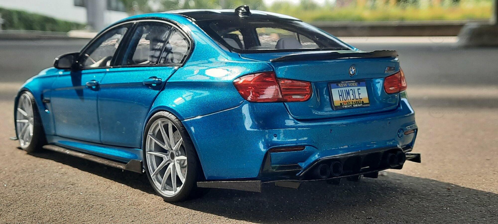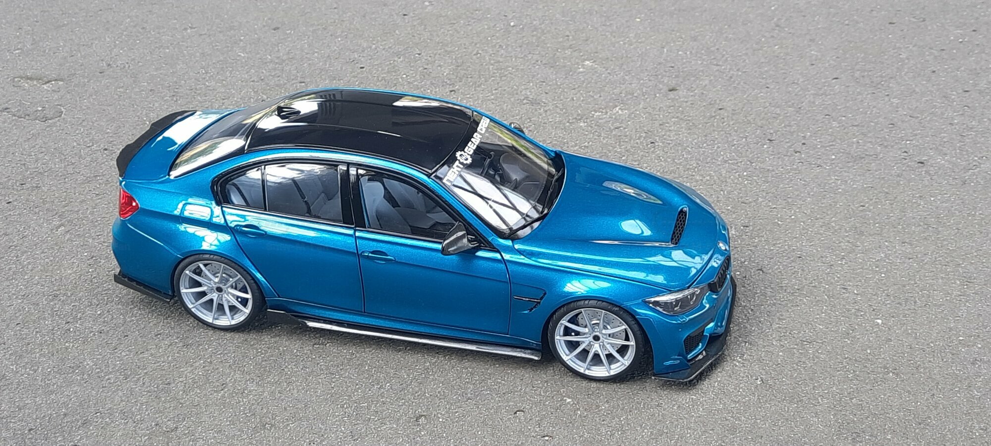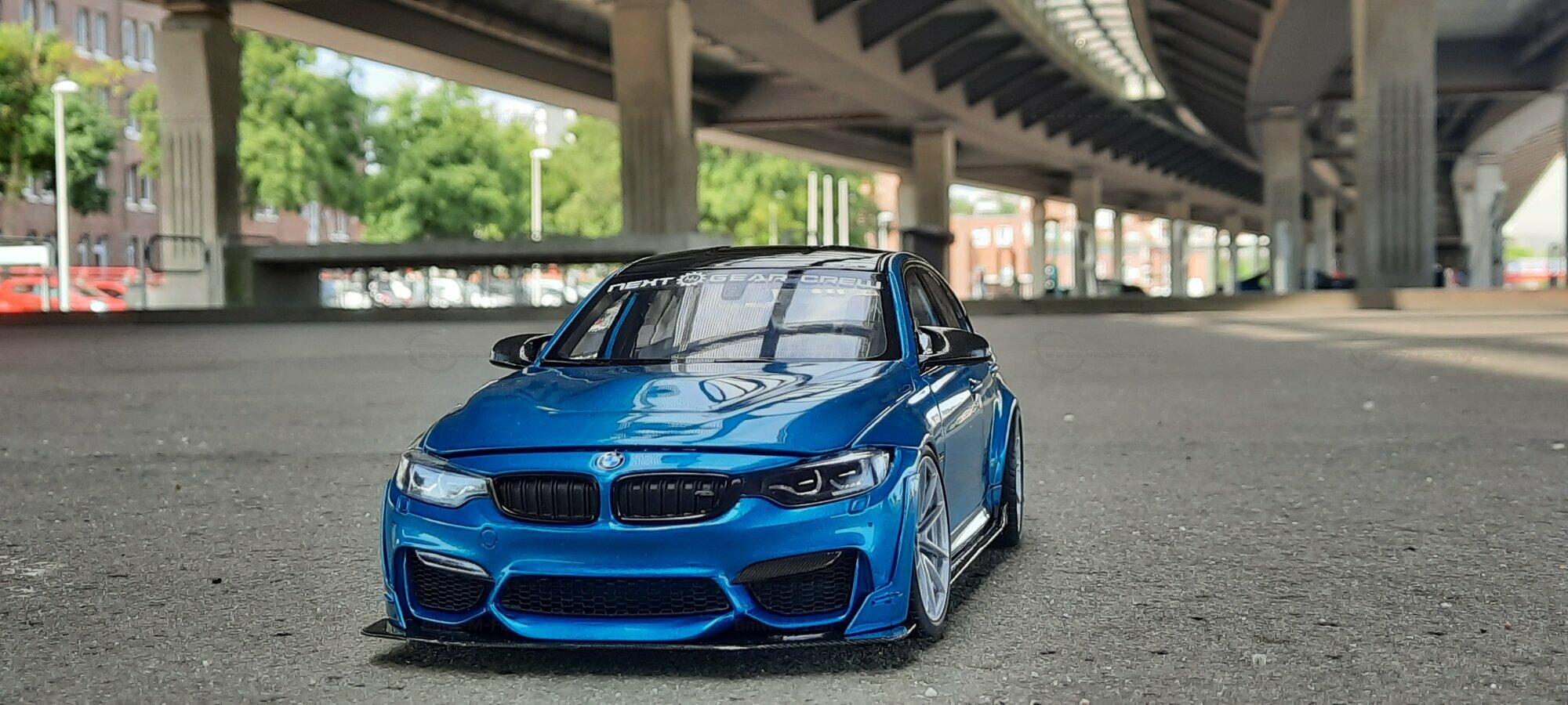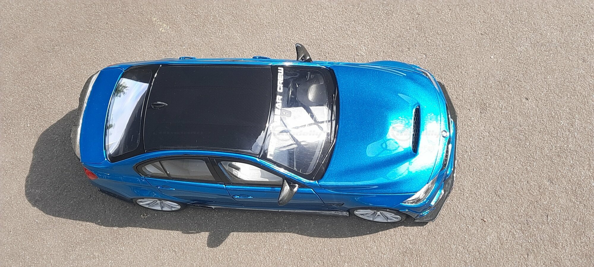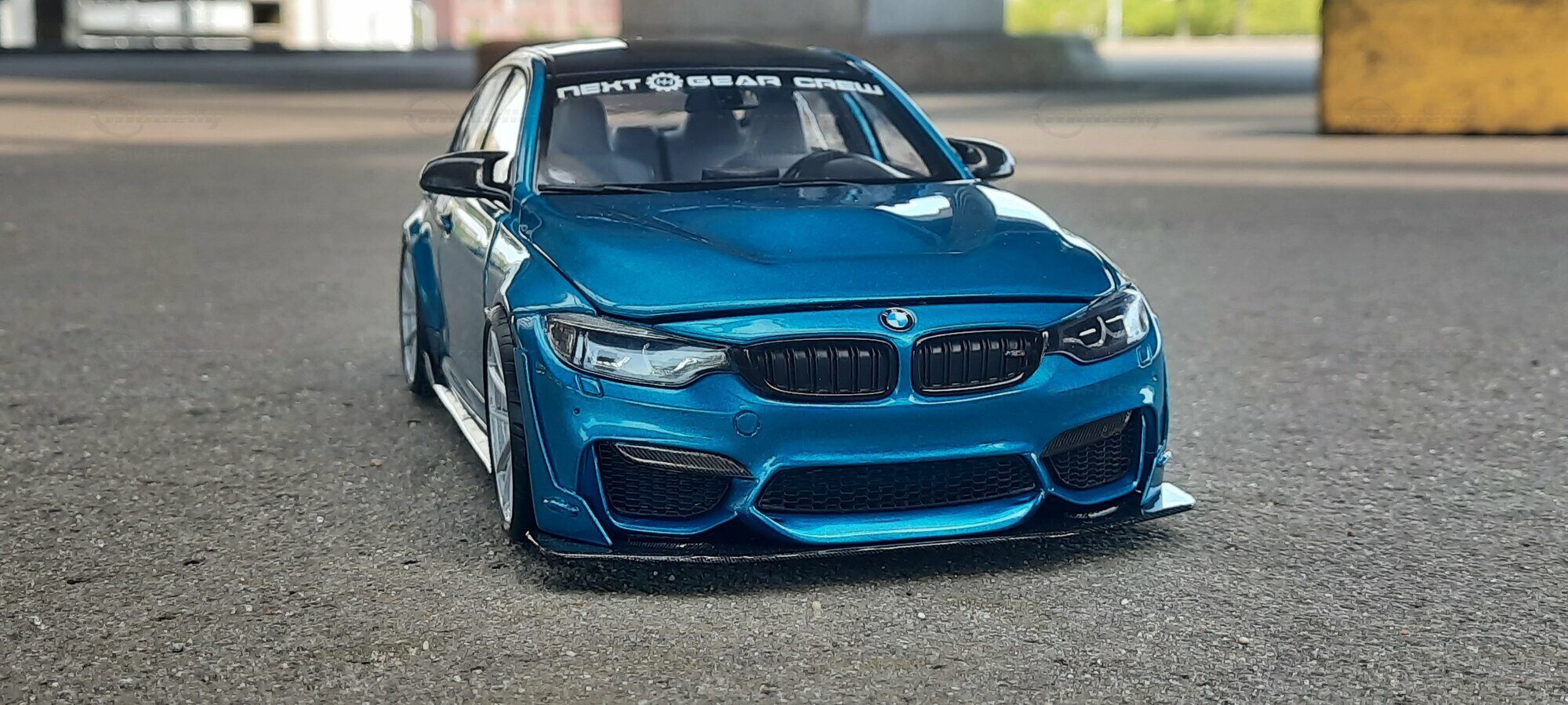 The model here is a modified replica of the BMW F80 M3 Competition in 1/18 scale. Originally made by Norev, a well-known model car manufacturer, this model is crafted from high-quality diecast material. However, it was extensively customized by a collector known as "Bmw-M-Fan." It's essential to point out that this version doesn’t represent the original model from Norev. Clearly, this vehicle features a unique paint job and tuning elements. The striking blue metallic paint really makes the model stand out, and the color has an impressive depth and reflection. You can spot a “Next Gear Crew” sticker on the windows, hinting at a possible community or team it represents.