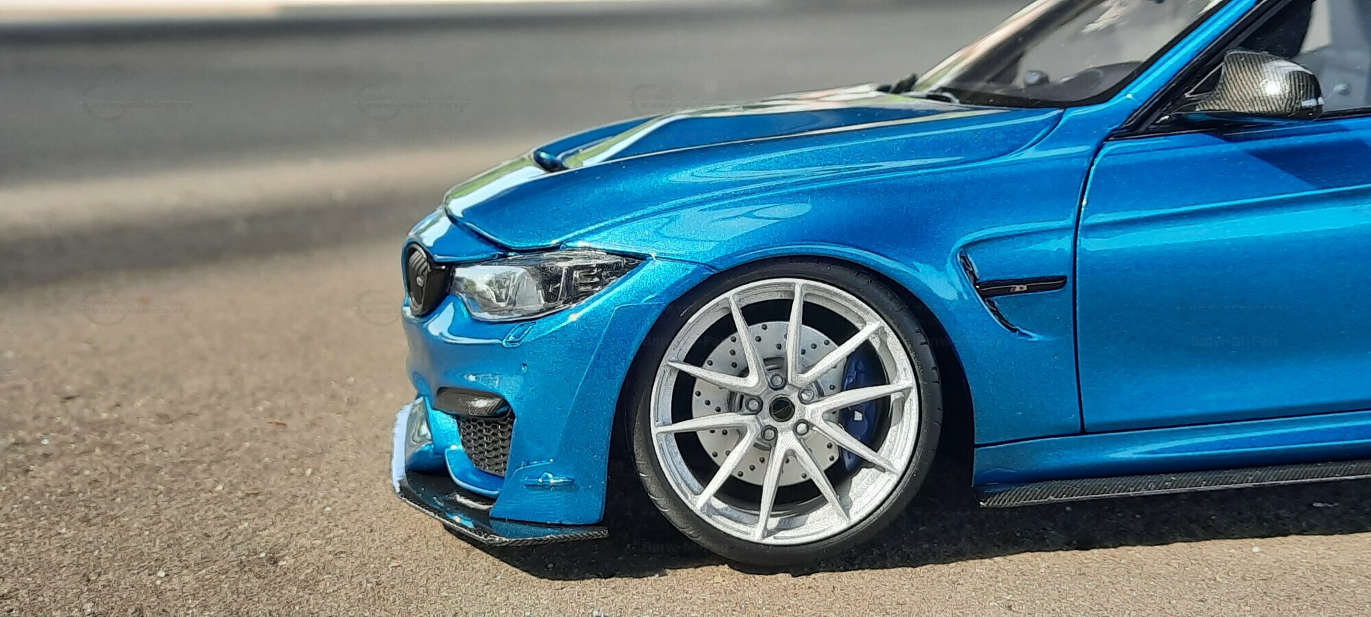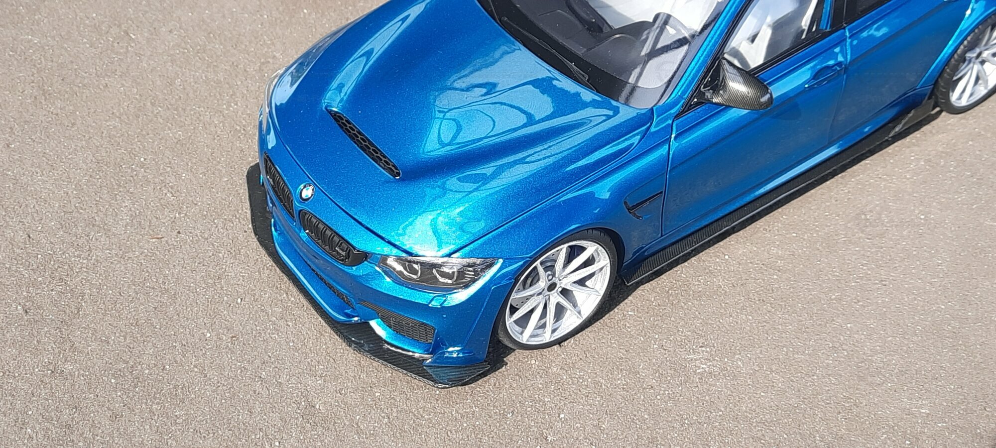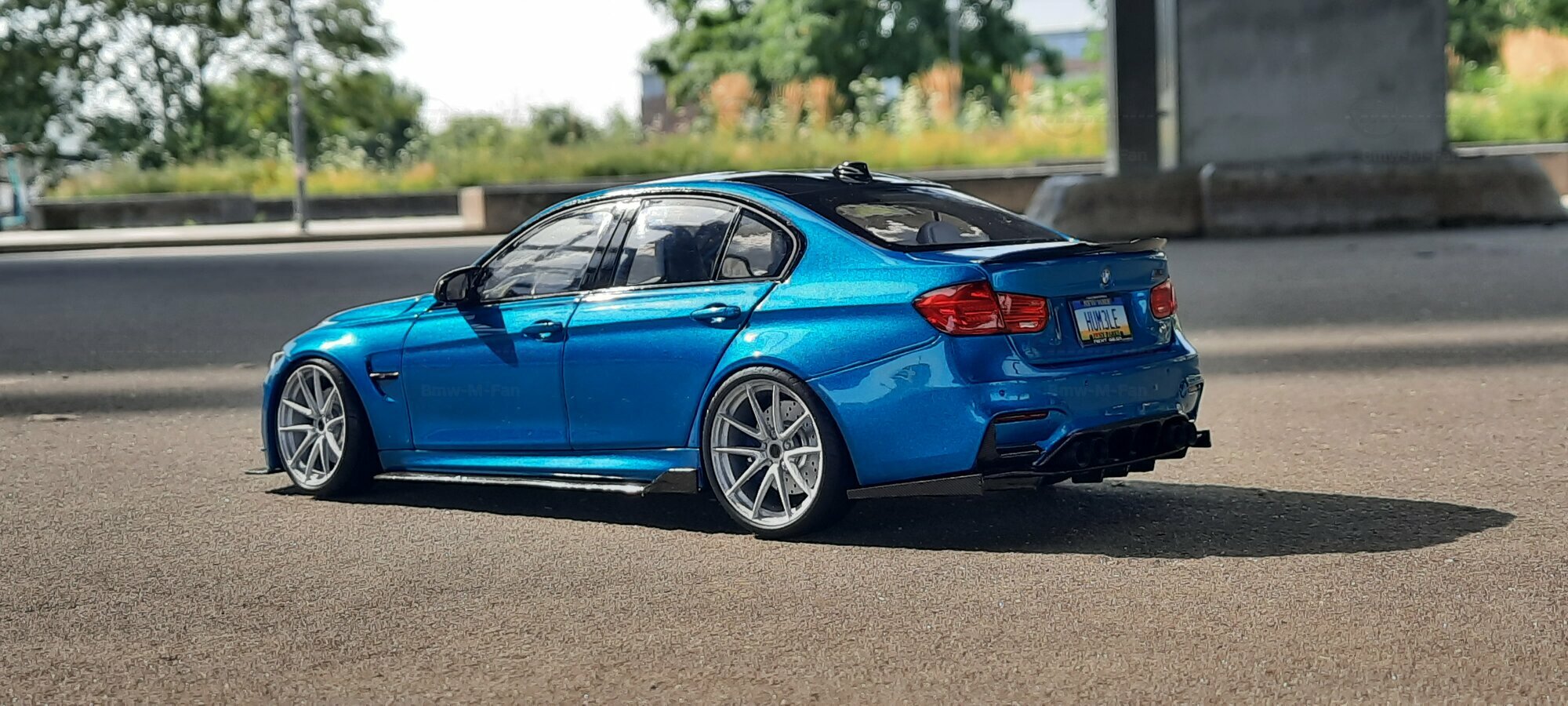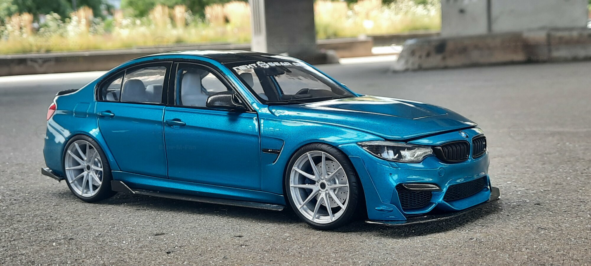 The model here is a modified replica of the BMW F80 M3 Competition in 1/18 scale. Originally made by Norev, a well-known model car manufacturer, this model is crafted from high-quality diecast material. However, it was extensively customized by a collector known as "Bmw-M-Fan." It's essential to point out that this version doesn’t represent the original model from Norev. Clearly, this vehicle features a unique paint job and tuning elements. The striking blue metallic paint really makes the model stand out, and the color has an impressive depth and reflection. You can spot a “Next Gear Crew” sticker on the windows, hinting at a possible community or team it represents.