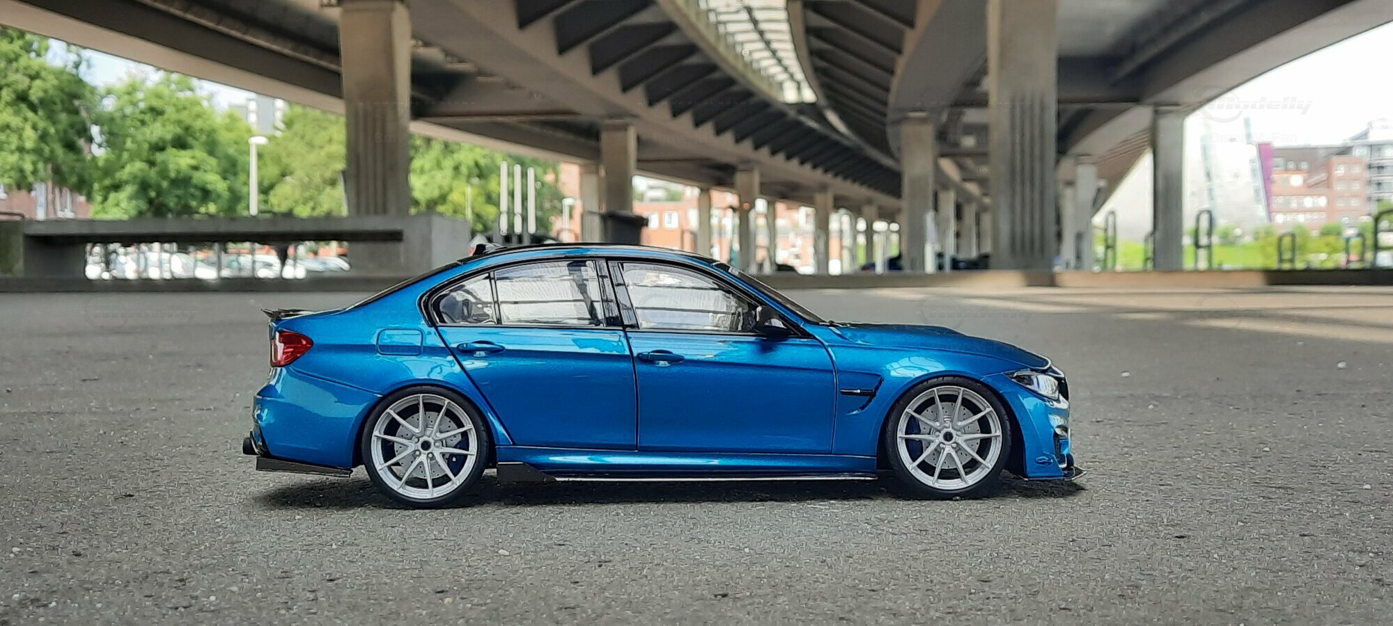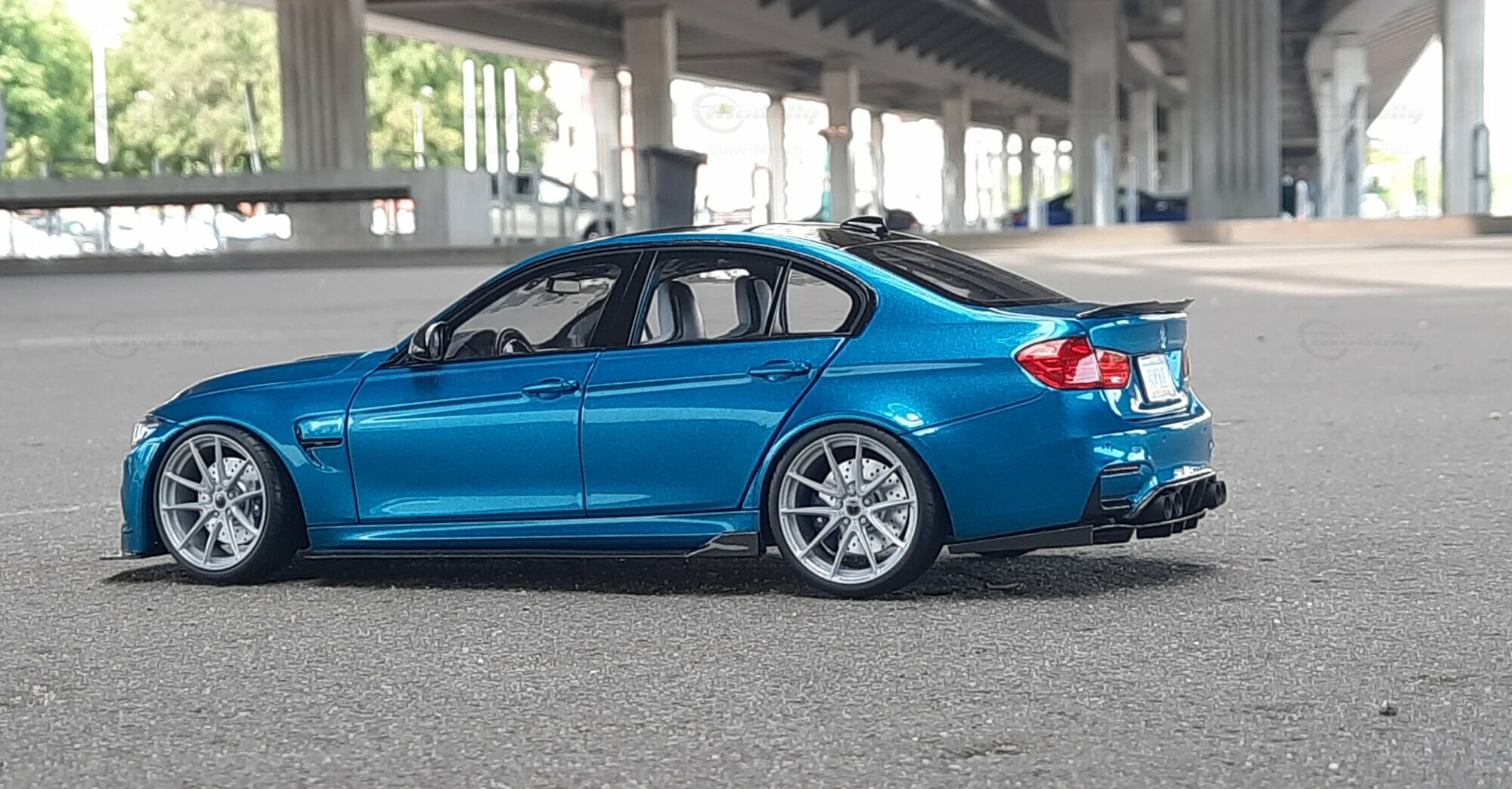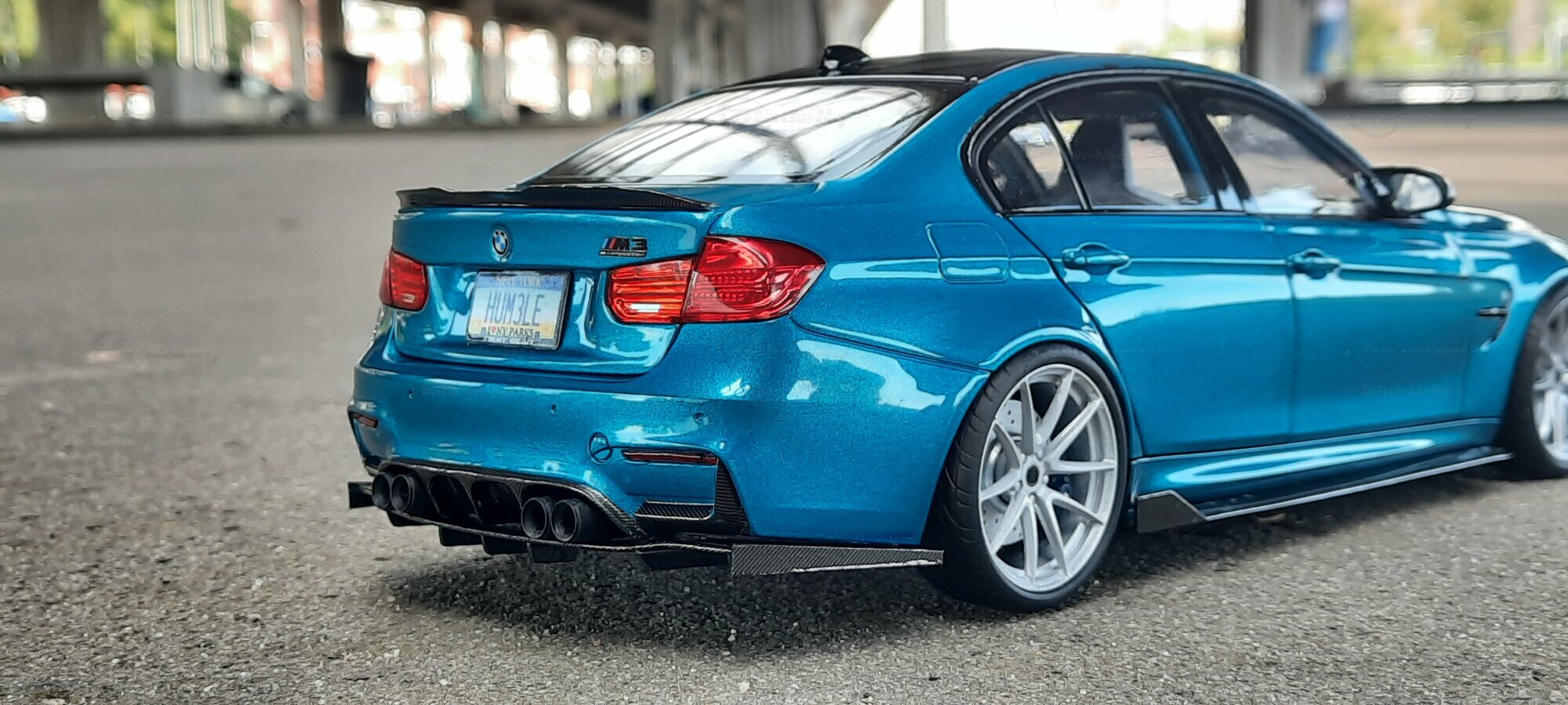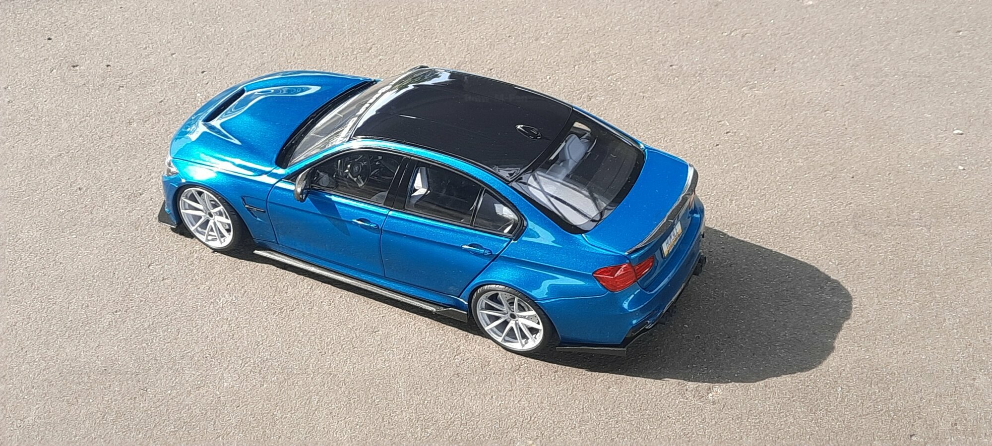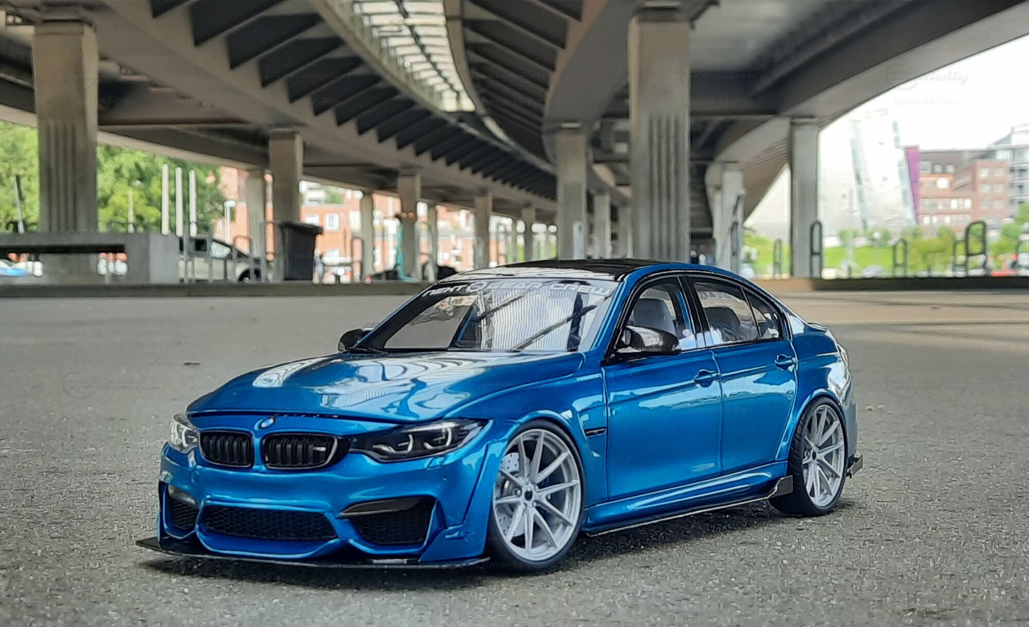 The model here is a modified replica of the BMW F80 M3 Competition in 1/18 scale. Originally made by Norev, a well-known model car manufacturer, this model is crafted from high-quality diecast material. However, it was extensively customized by a collector known as "Bmw-M-Fan." It's essential to point out that this version doesn’t represent the original model from Norev. Clearly, this vehicle features a unique paint job and tuning elements. The striking blue metallic paint really makes the model stand out, and the color has an impressive depth and reflection. You can spot a “Next Gear Crew” sticker on the windows, hinting at a possible community or team it represents.