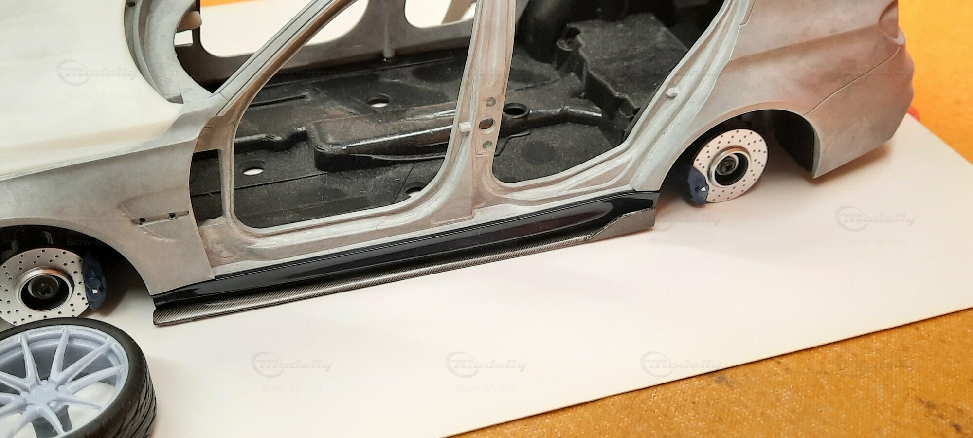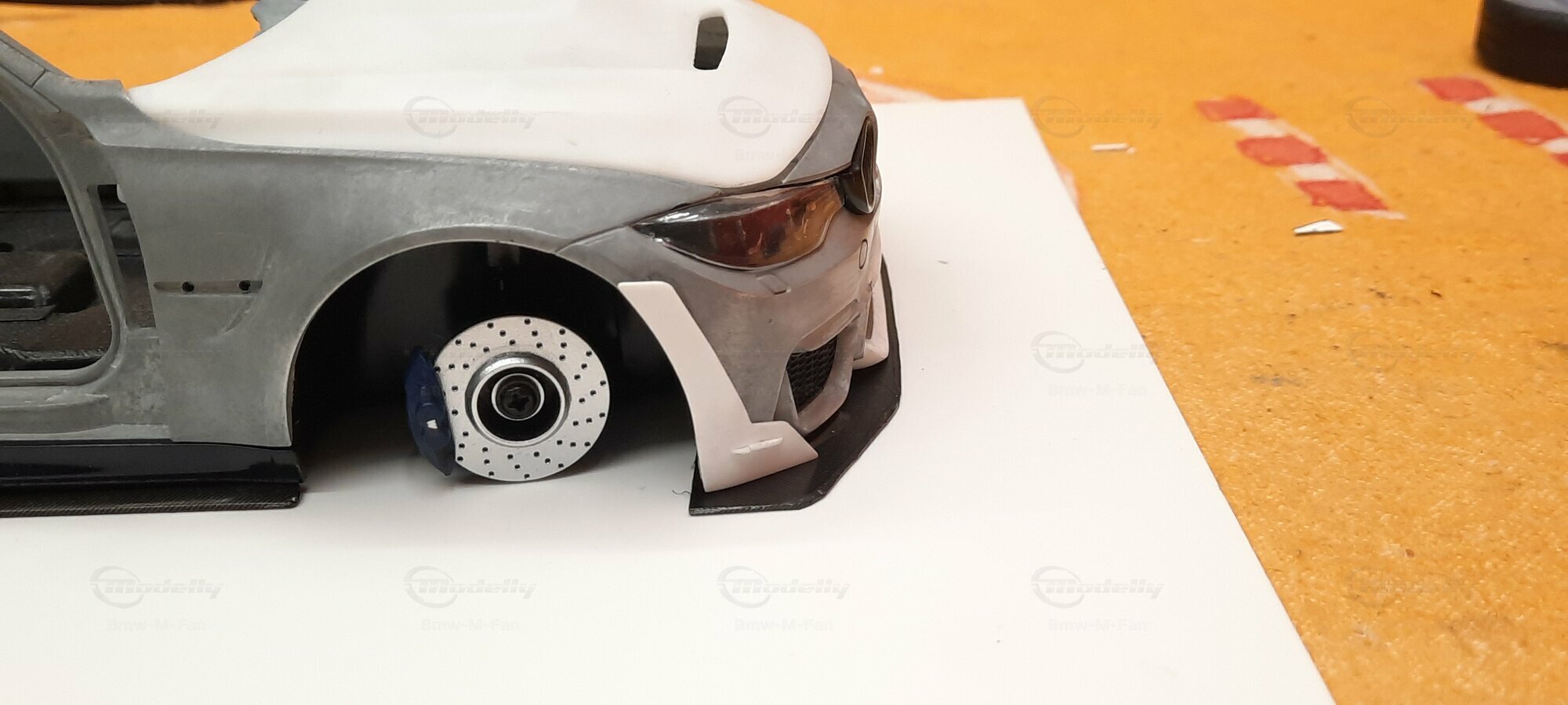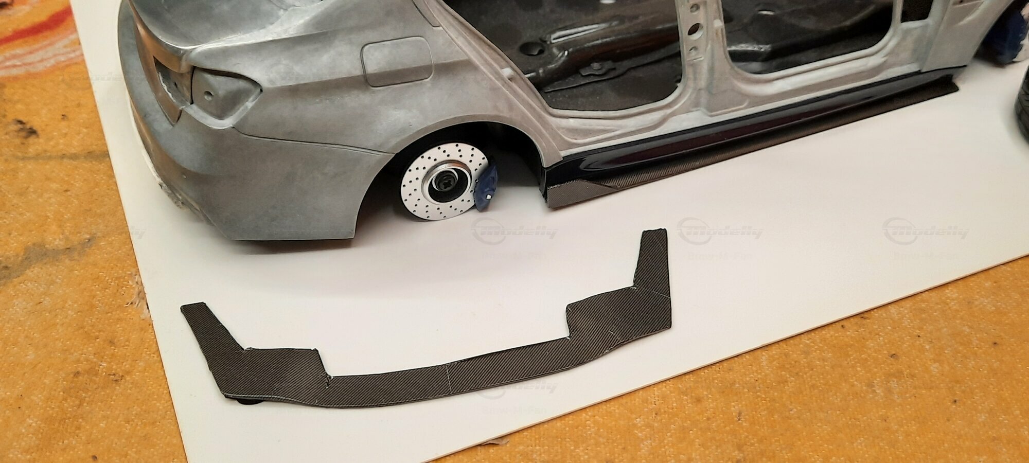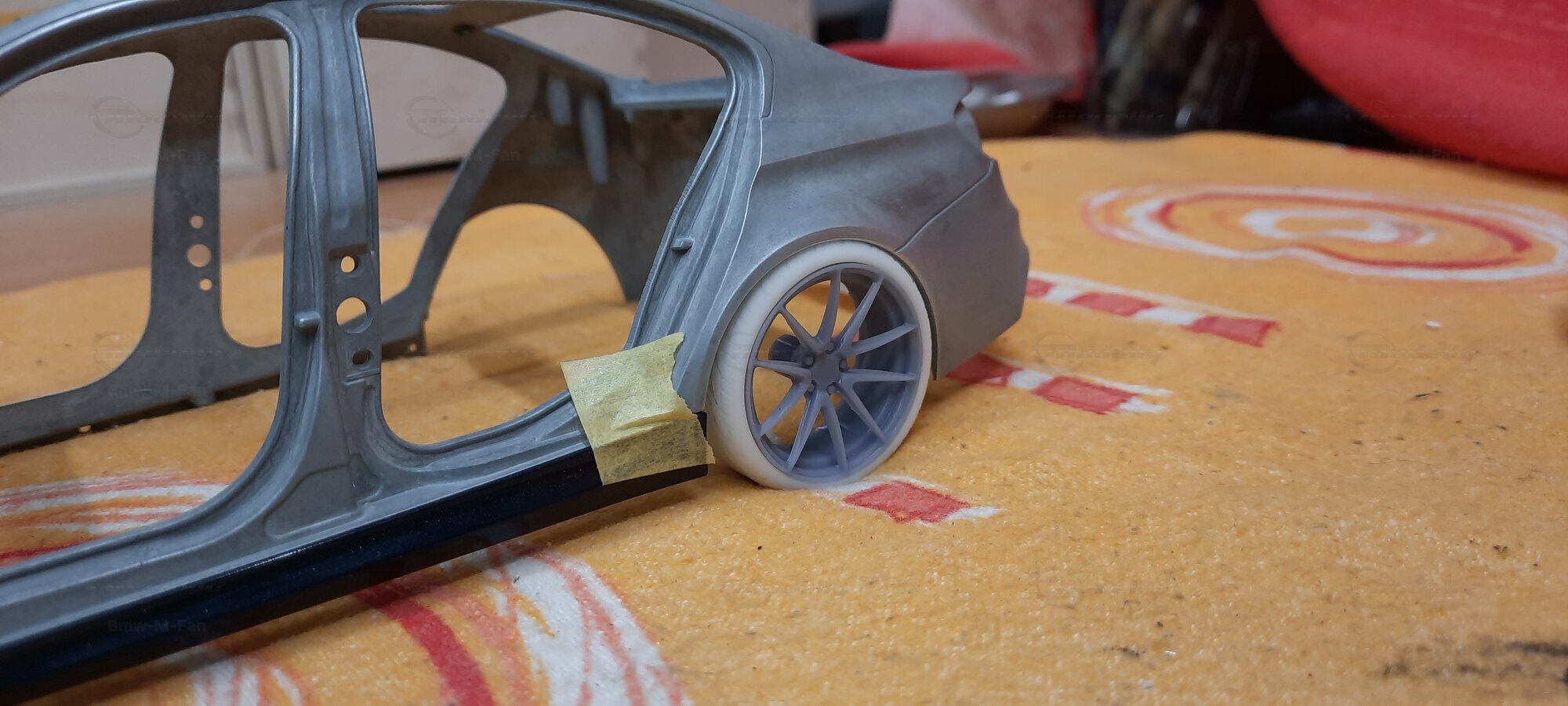 From the photos, you can see several modifications on the miniature, including a specially designed aerodynamic kit with large air vents and a front splitter. The wheels also look like they’ve been upgraded. Those forged rims could be from a European tuning company, even though the brand and model details are missing for now. The flared fenders and hinted “widebody” look of the model really catch your eye. The tiny antenna on the roof and the fine details on the mirrors add to the authenticity. Every tuning element and modification seems to have been transferred onto the model with high precision, making it super appealing to collectors.