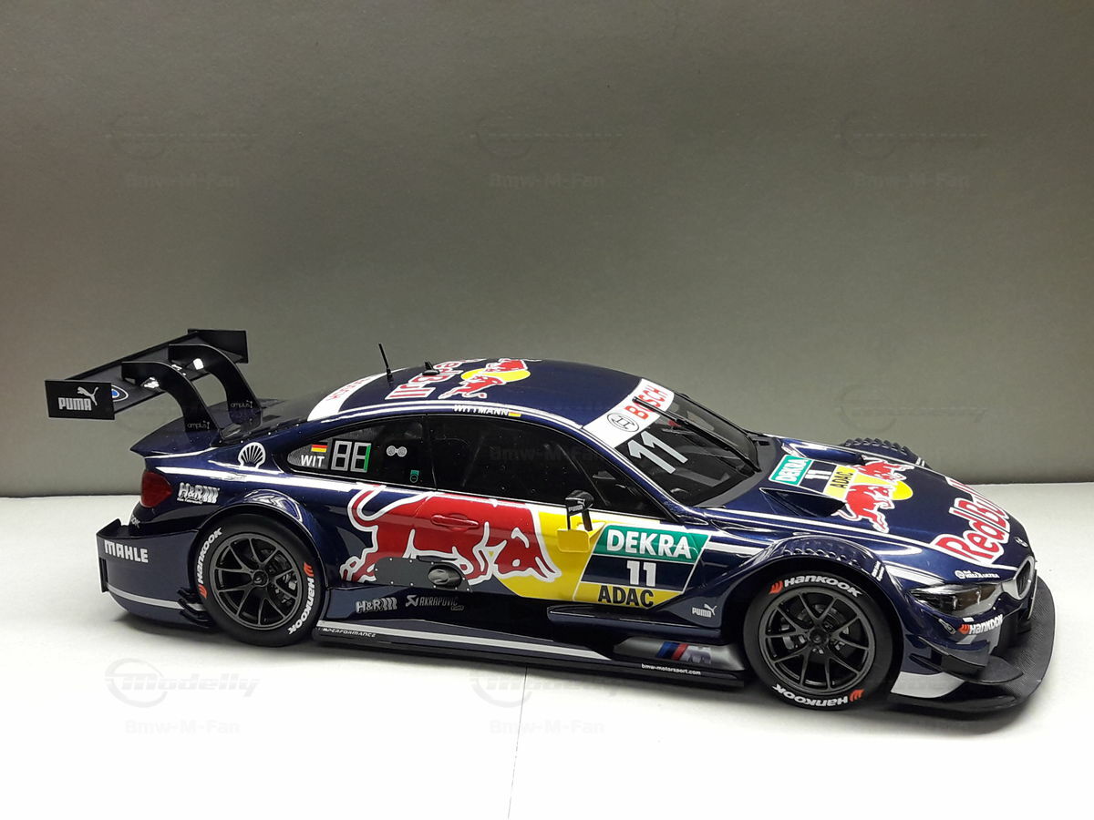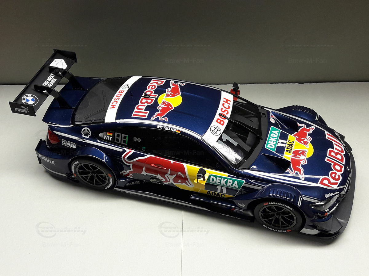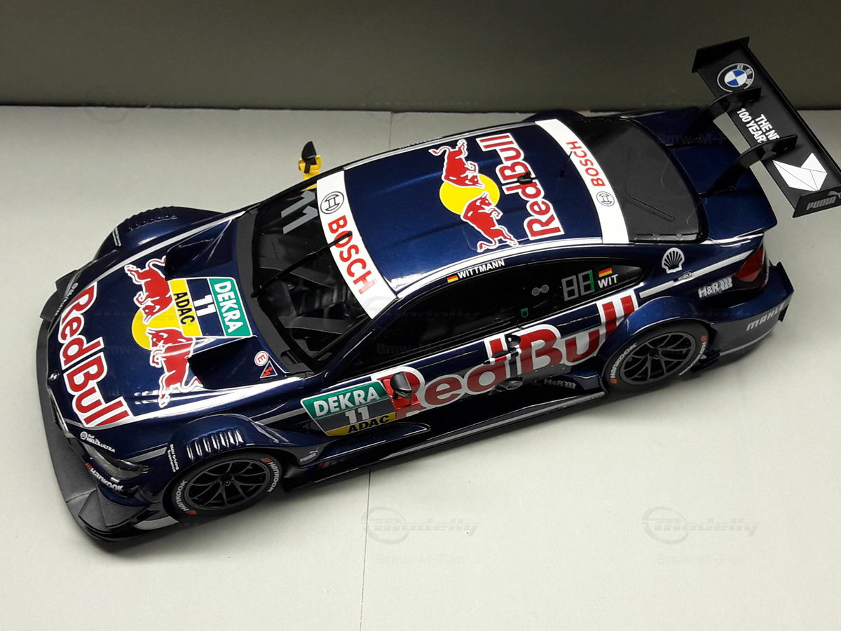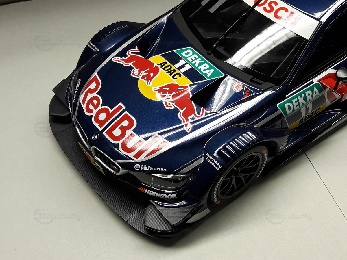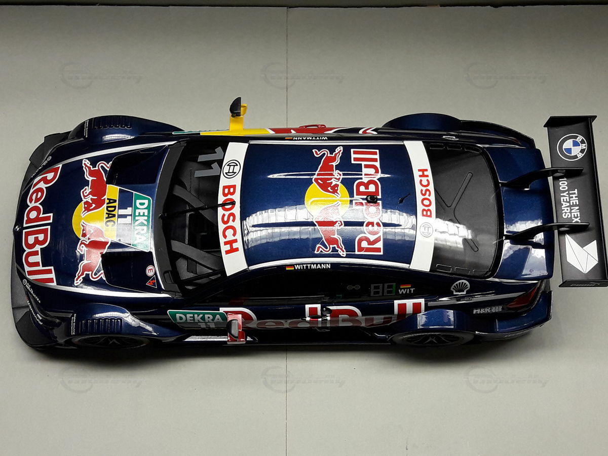 The Norev 1/18 scale model of the BMW F82 M4 DTM is a true collector's item and impresses with impressive attention to detail. This modeling was made based on diecast material, known for its durability and longevity. The model's wheels are accurately replicated, and the precise paintwork provides an authentic racing experience in miniature. The model car in the collection of Modelly member "Bmw-M-Fan" represents the 2016 DTM champion and is adorned with sponsorships like Red Bull, DEKRA, and ADAC, which are clearly visible in the photos.