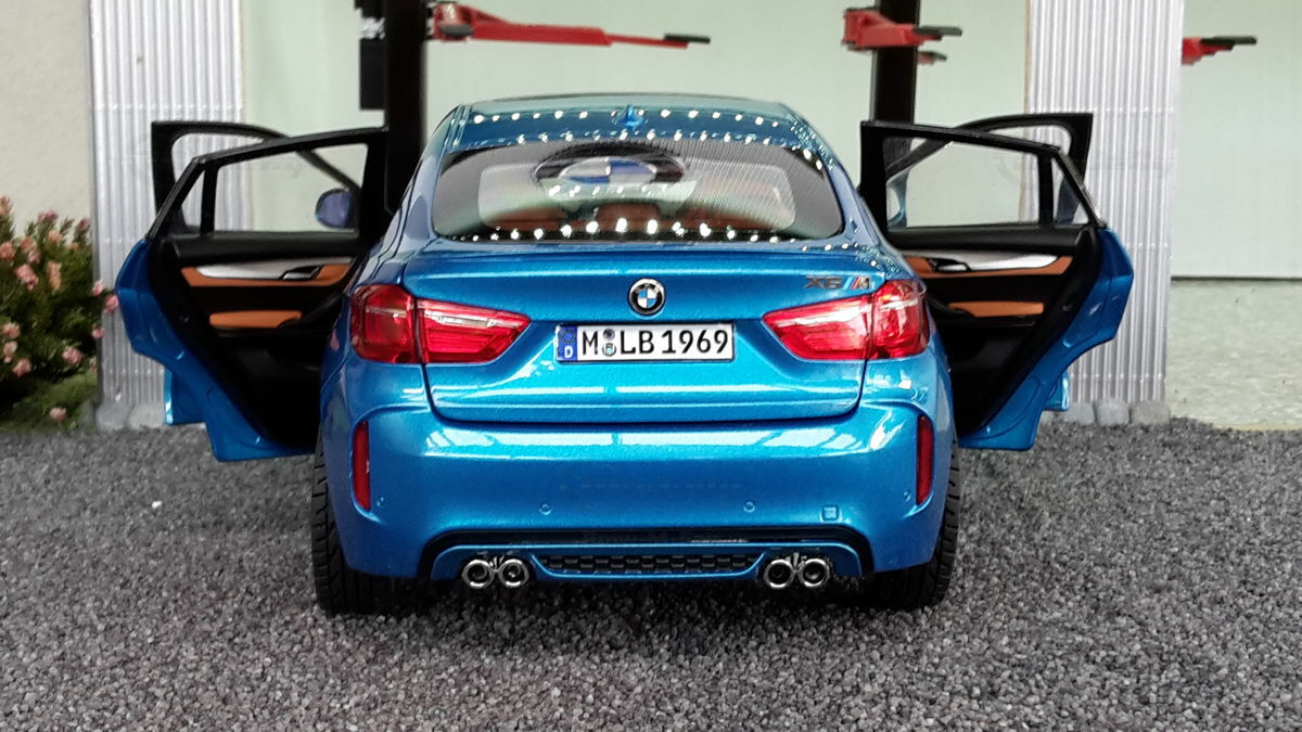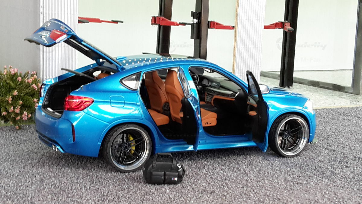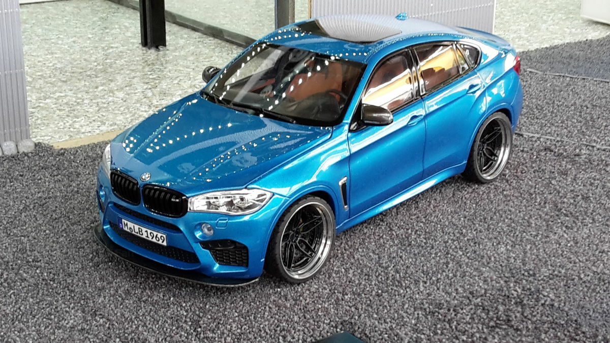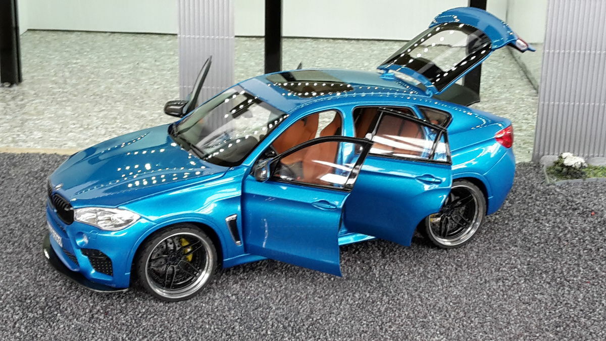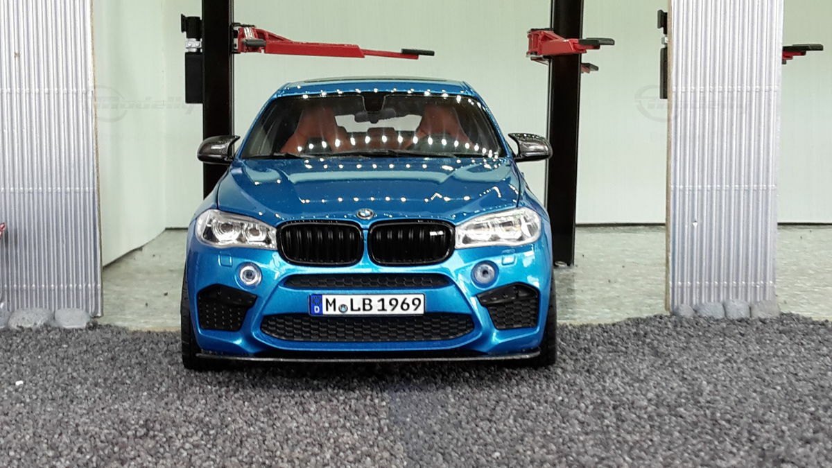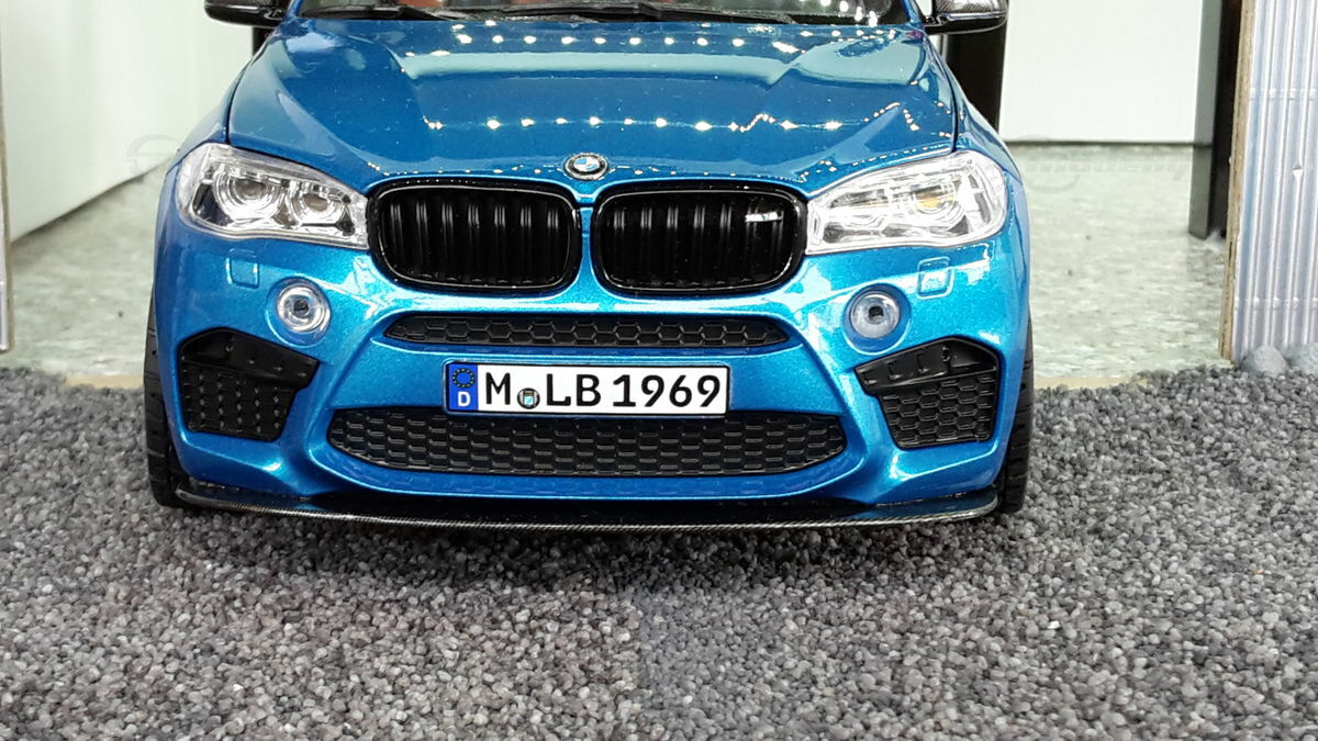 Special attention has been given to the adaptations, further emphasizing the visual and technical precision of the miniature model. The blue metallic elements of the paintwork and the black accents add a premium touch. The printed license plate and stylized mirror colors reflect the original components of the BMW F86 X6M. The BBS motorsport wheels mounted as shown in the photos complete the overall look. This is a 1/18 diecast model that has been specially modified and thus does not represent the standard issue by Norev. The lighting effects and reflective surfaces are remarkable and contribute to the authenticity of the model. The model is placed in a diorama in the collection of Modelly member "Bmw-M-Fan".