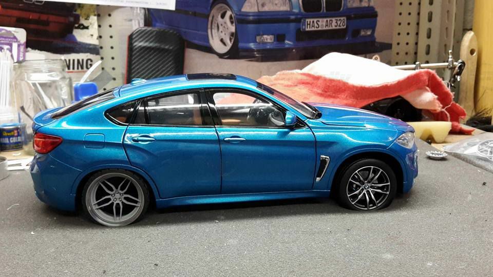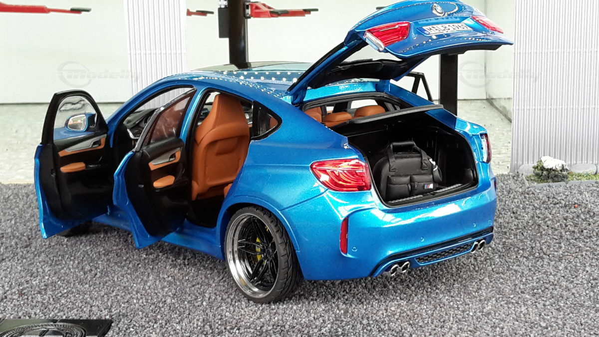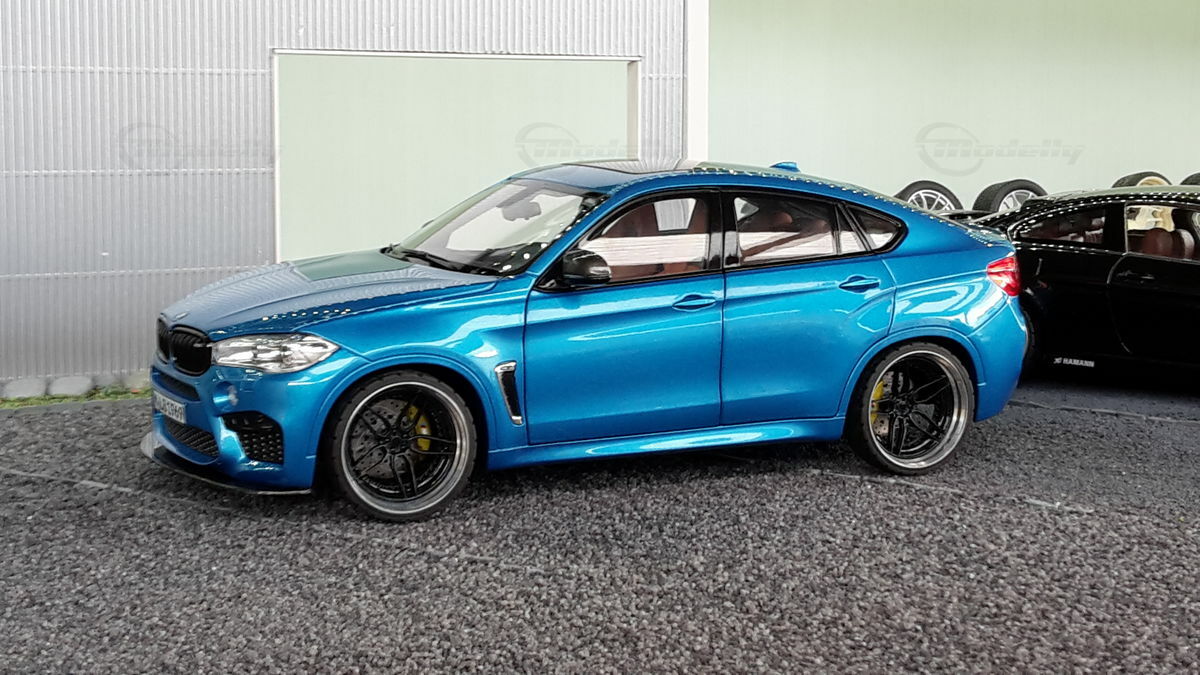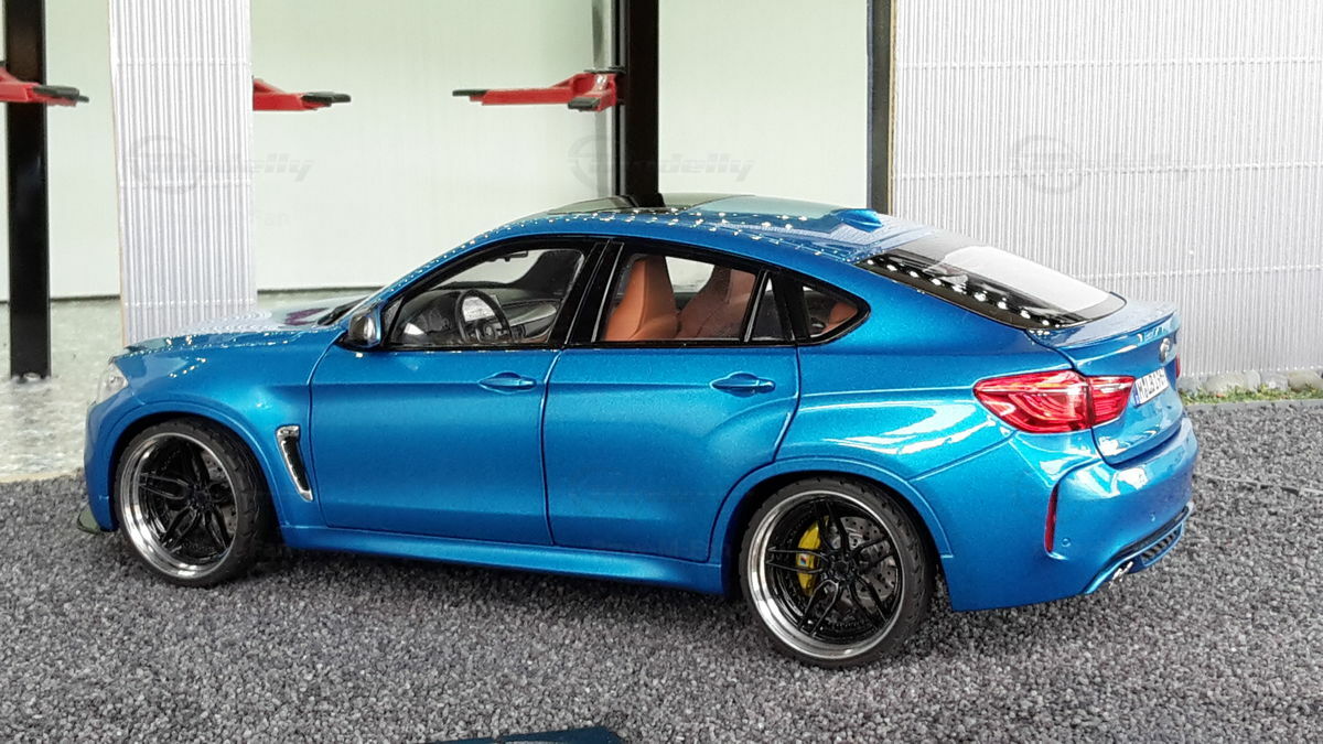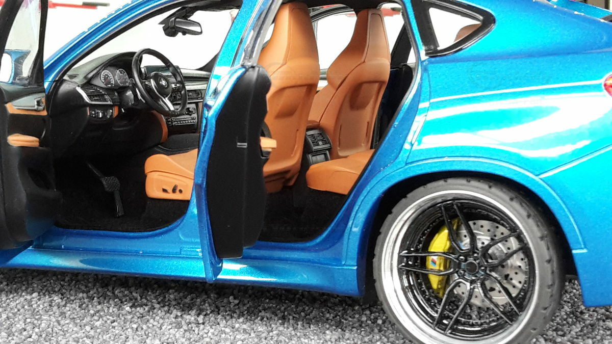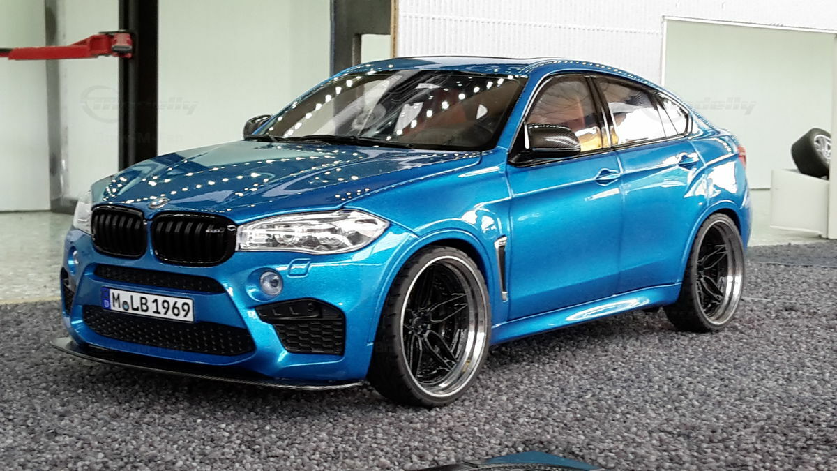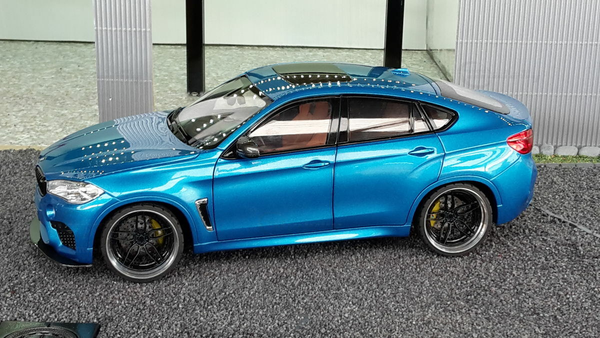 Special attention has been given to the adaptations, further emphasizing the visual and technical precision of the miniature model. The blue metallic elements of the paintwork and the black accents add a premium touch. The printed license plate and stylized mirror colors reflect the original components of the BMW F86 X6M. The BBS motorsport wheels mounted as shown in the photos complete the overall look. This is a 1/18 diecast model that has been specially modified and thus does not represent the standard issue by Norev. The lighting effects and reflective surfaces are remarkable and contribute to the authenticity of the model. The model is placed in a diorama in the collection of Modelly member "Bmw-M-Fan".