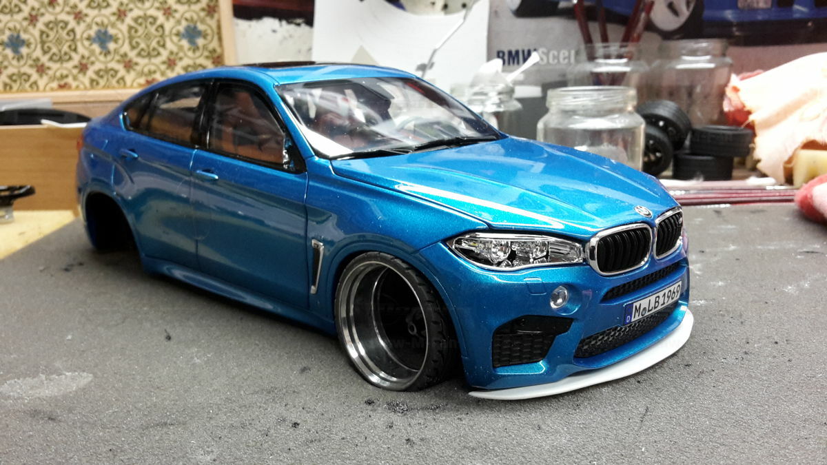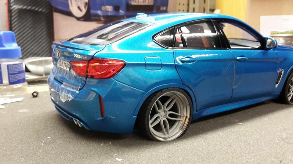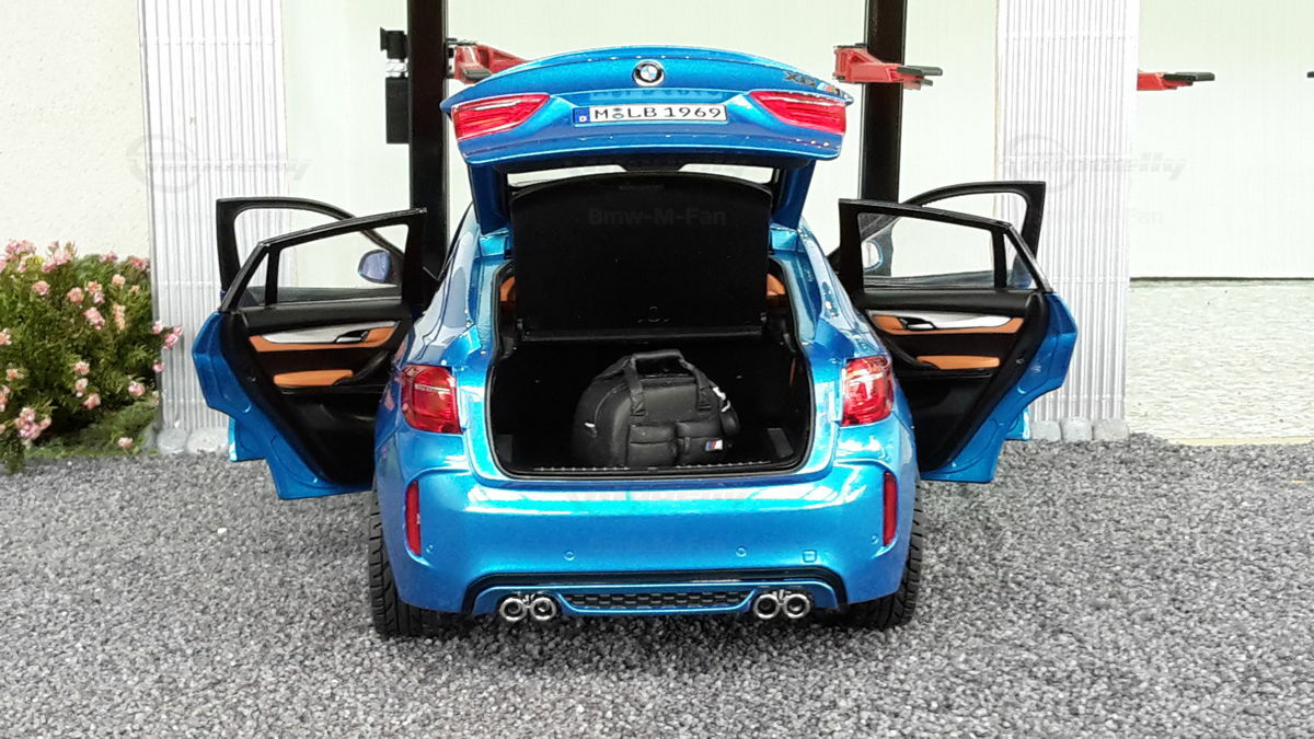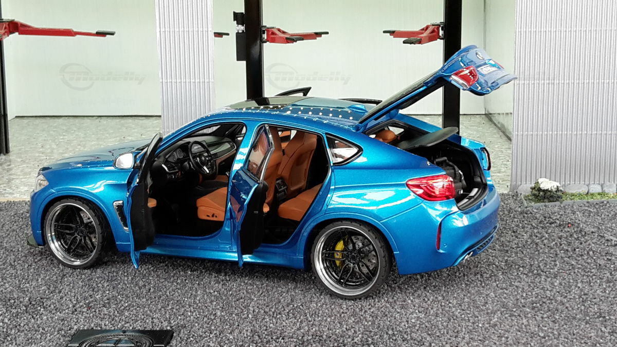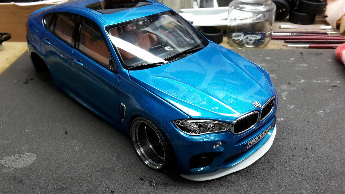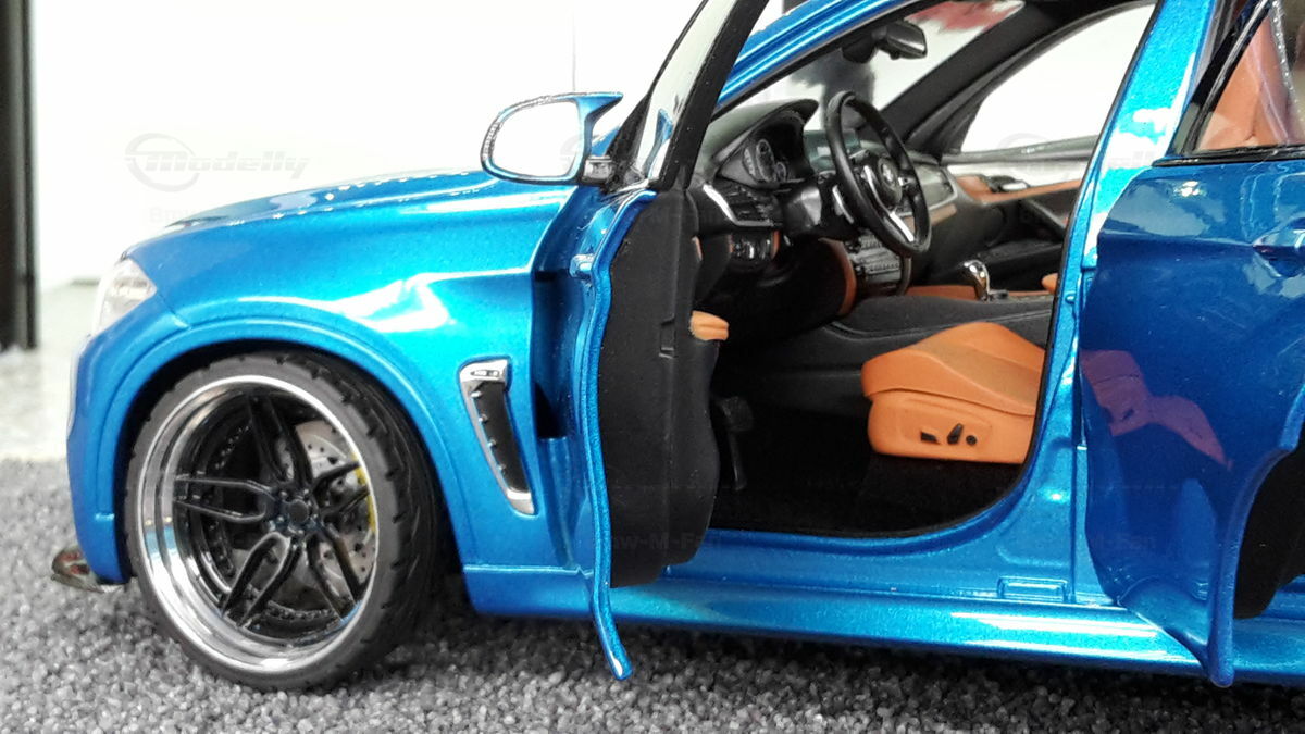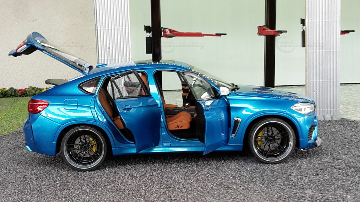 Special attention has been given to the adaptations, further emphasizing the visual and technical precision of the miniature model. The blue metallic elements of the paintwork and the black accents add a premium touch. The printed license plate and stylized mirror colors reflect the original components of the BMW F86 X6M. The BBS motorsport wheels mounted as shown in the photos complete the overall look. This is a 1/18 diecast model that has been specially modified and thus does not represent the standard issue by Norev. The lighting effects and reflective surfaces are remarkable and contribute to the authenticity of the model. The model is placed in a diorama in the collection of Modelly member "Bmw-M-Fan".