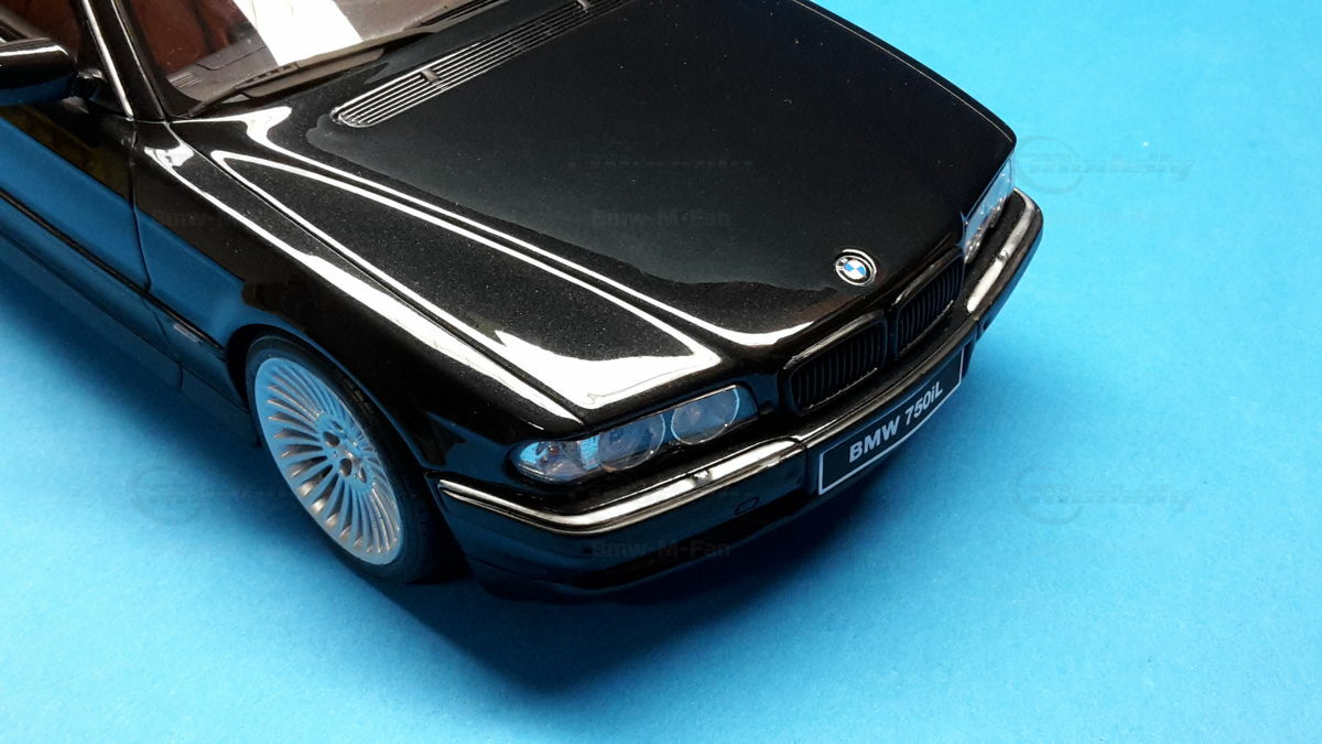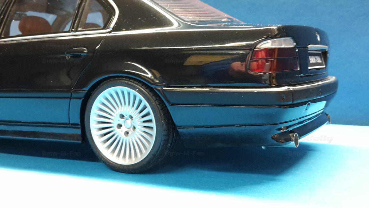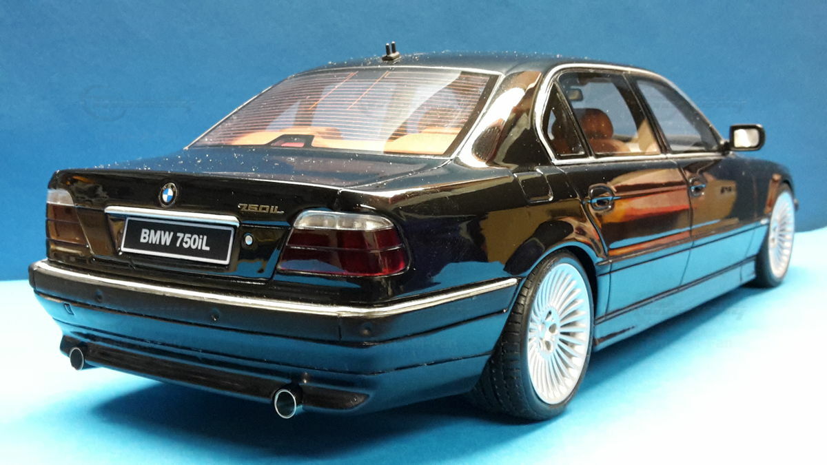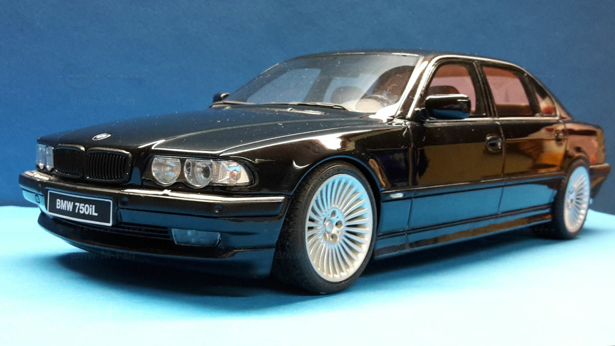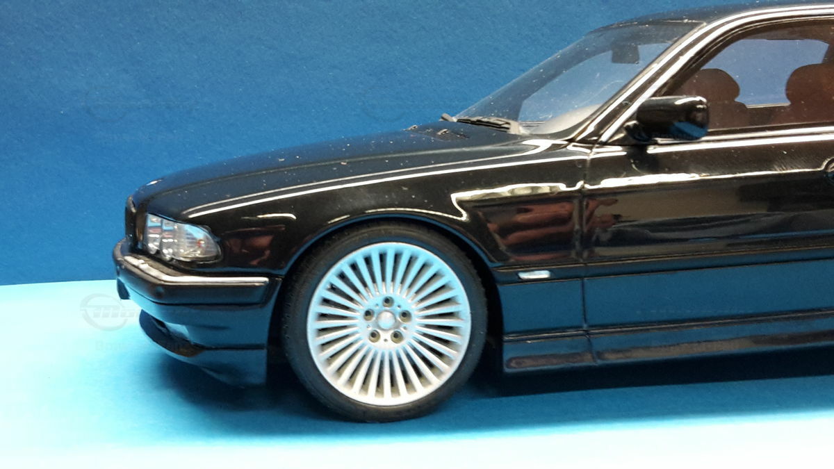 This 1/18 scale collectible model of the BMW E38 750iL is manufactured by Otto Models and is popular among model enthusiasts worldwide. Crafted from high-quality resin, the miniature allows for precise detailing and high authenticity. Owned by Modelly member "Bmw-M-Fan," this particular miniature showcases exceptional craftsmanship and attention to detail. It is important to note that this model has been modified and does not represent the original product produced by Otto Models.The Carbon Black paint finish of the model pays homage to the original color of the BMW E38. The glossy surface and accurately sculpted lines give the model an impressive aesthetic appeal. The precise replication of the headlights and the iconic BMW kidney grille immediately catch the eye. The model's wheels are also a highlight; they have been replaced with tuning wheels that further enhance the vehicle's sporty-elegant appearance.