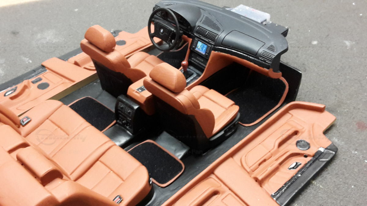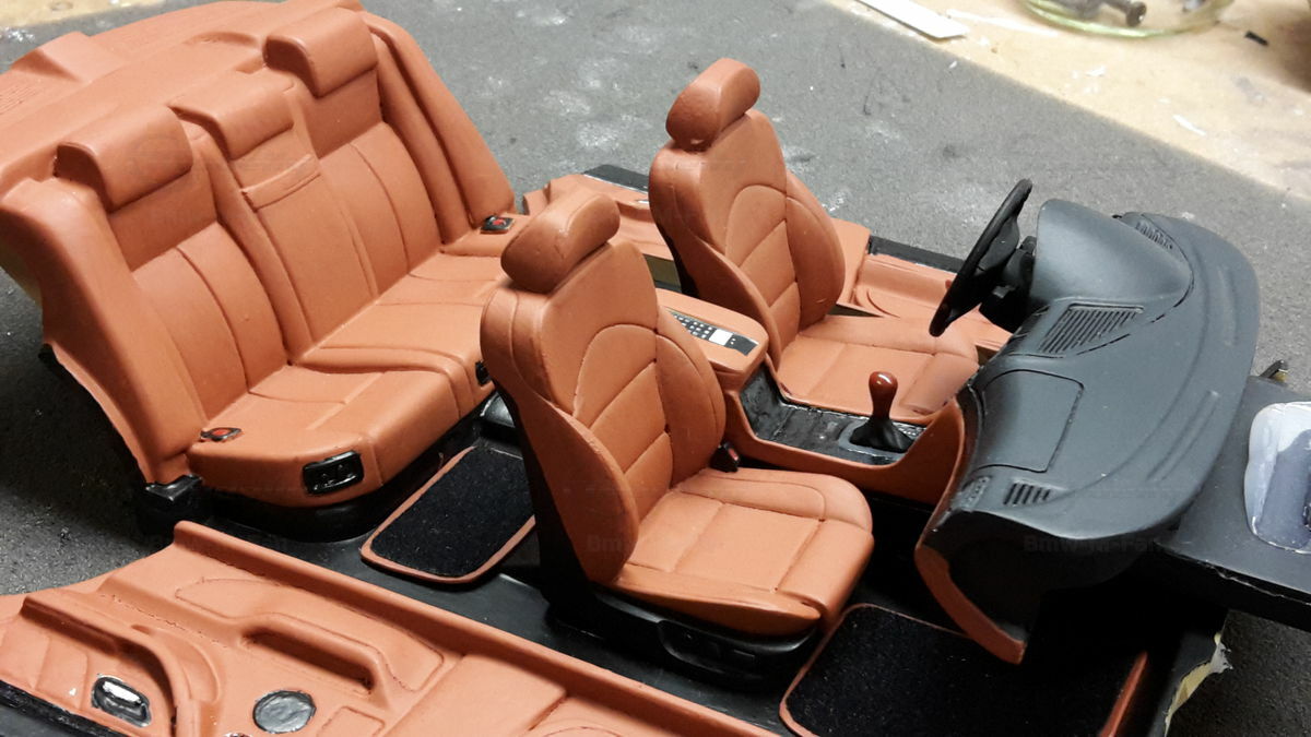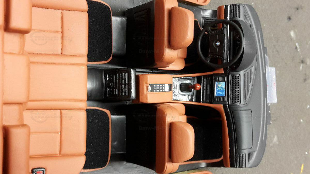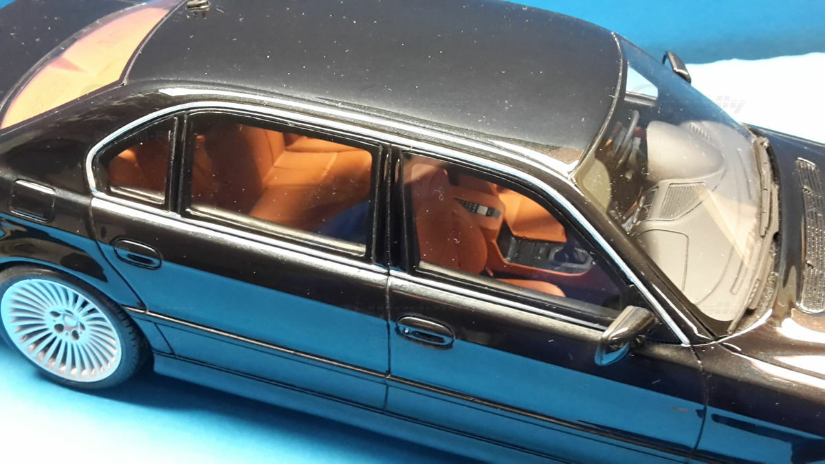 This modified 1/18 scale model stands out for its special tuning elements sourced from renowned tuning companies like Alpina. Established in Buchloe, Germany, in 1965, Alpina is known for its performance upgrades and exclusive design elements, which are evident in this model. Particularly striking are the Alpina Classic 21-inch wheels, replacing the stock wheels and adding a touch of luxury to the model.The interior elements of this collector's piece are also faithfully recreated. A glimpse inside reveals the brown leather seats and dashboard, meticulously replicated down to the smallest details. The authenticity is further emphasized by accurately placed insignias and various emblems that complete the true-to-life appearance. The arrangement of components and precision in replication make this model a special highlight for collectors.