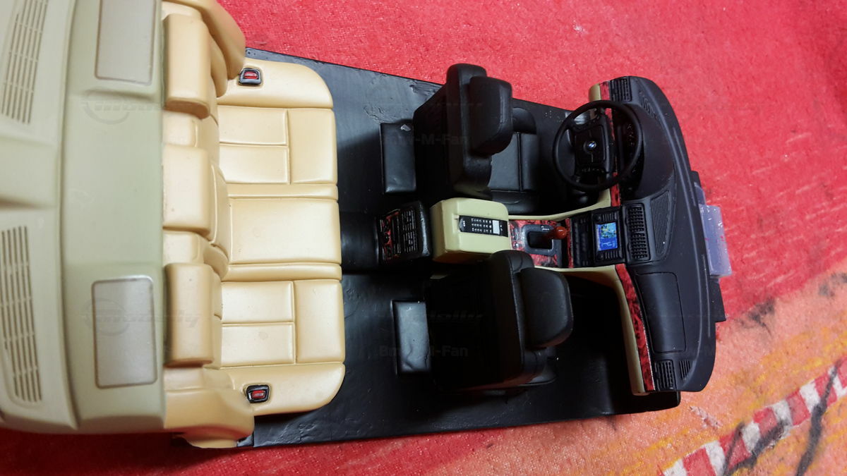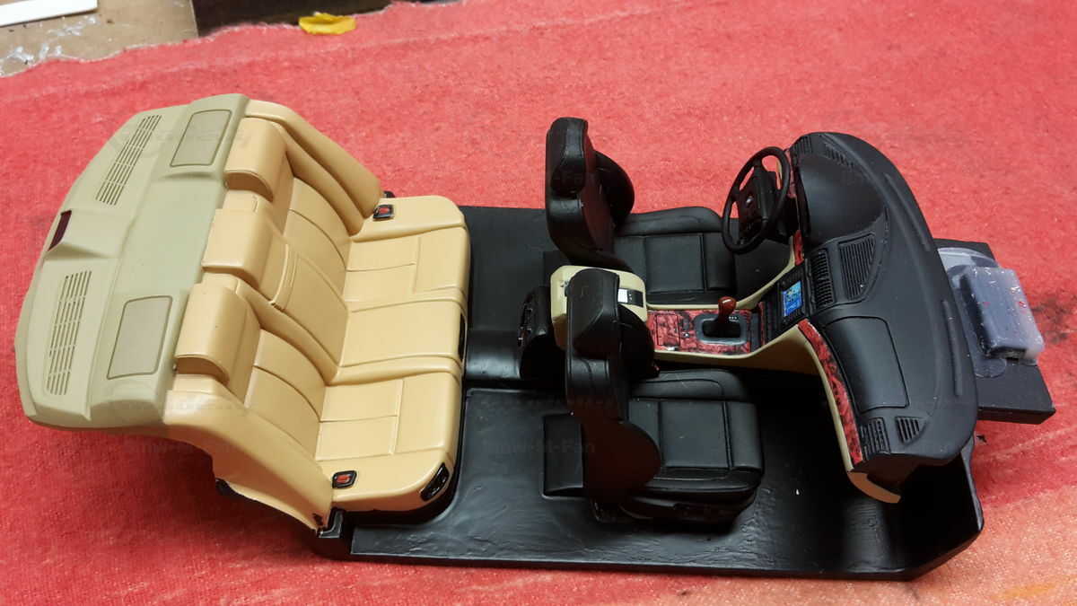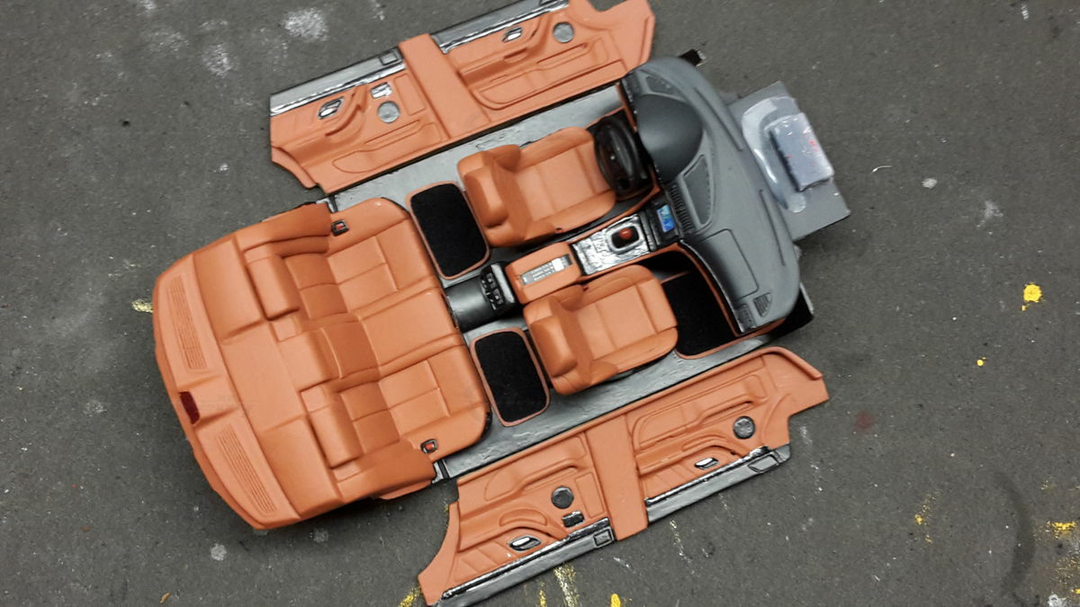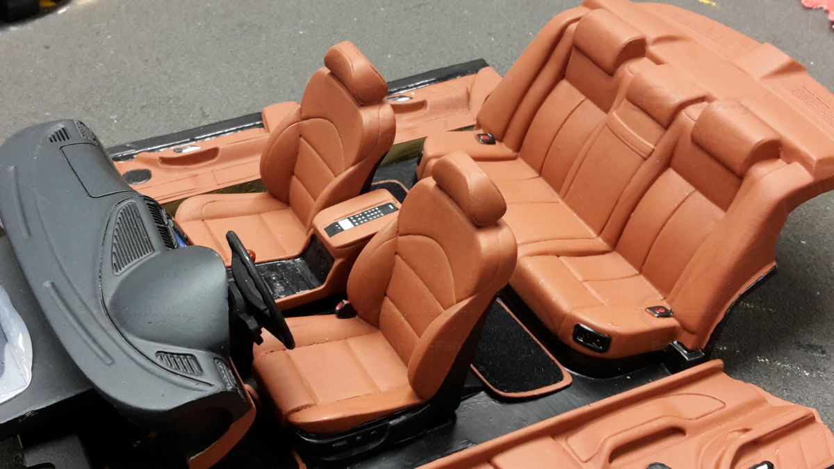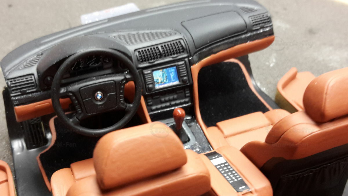This modified 1/18 scale model stands out for its special tuning elements sourced from renowned tuning companies like Alpina. Established in Buchloe, Germany, in 1965, Alpina is known for its performance upgrades and exclusive design elements, which are evident in this model. Particularly striking are the Alpina Classic 21-inch wheels, replacing the stock wheels and adding a touch of luxury to the model.The interior elements of this collector's piece are also faithfully recreated. A glimpse inside reveals the brown leather seats and dashboard, meticulously replicated down to the smallest details. The authenticity is further emphasized by accurately placed insignias and various emblems that complete the true-to-life appearance. The arrangement of components and precision in replication make this model a special highlight for collectors.