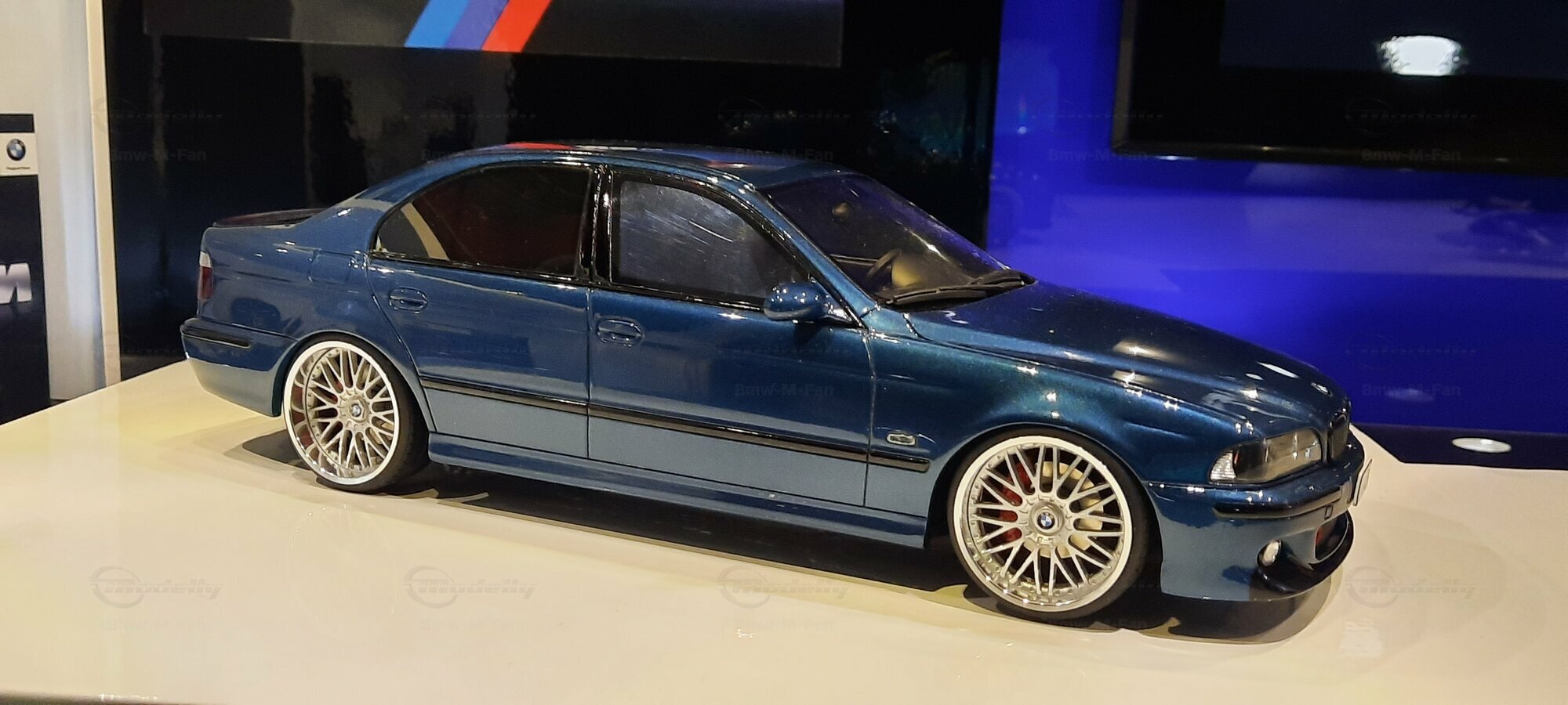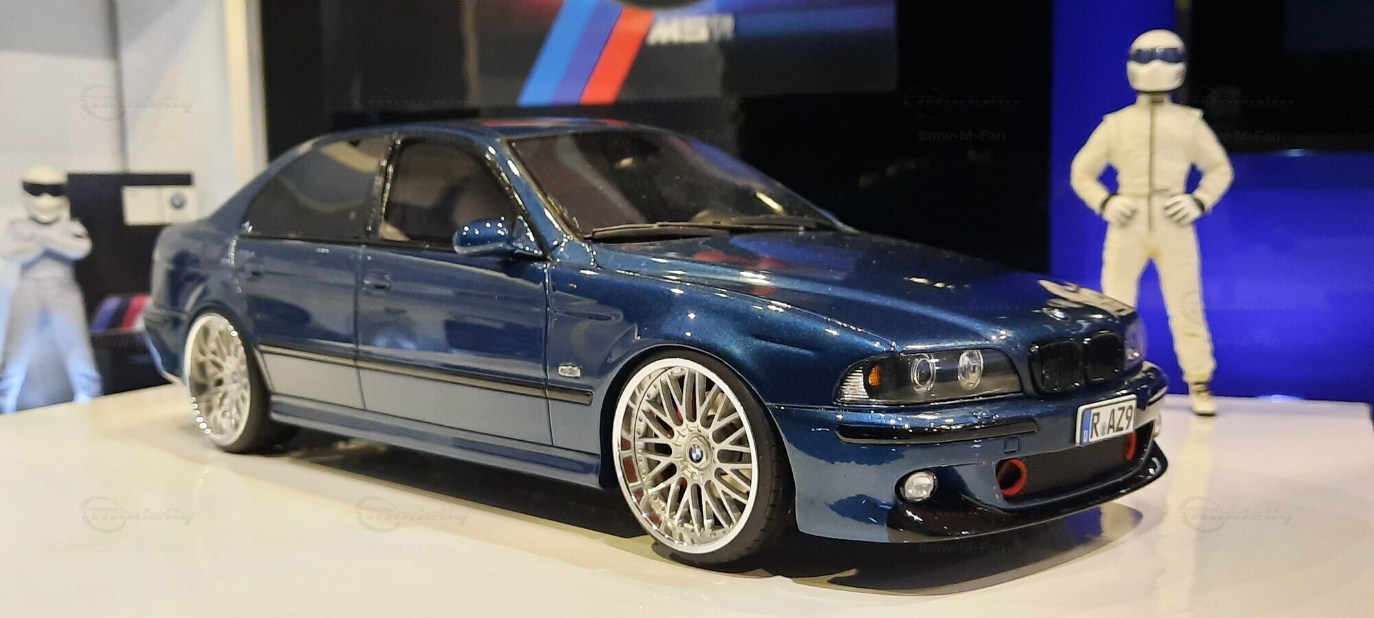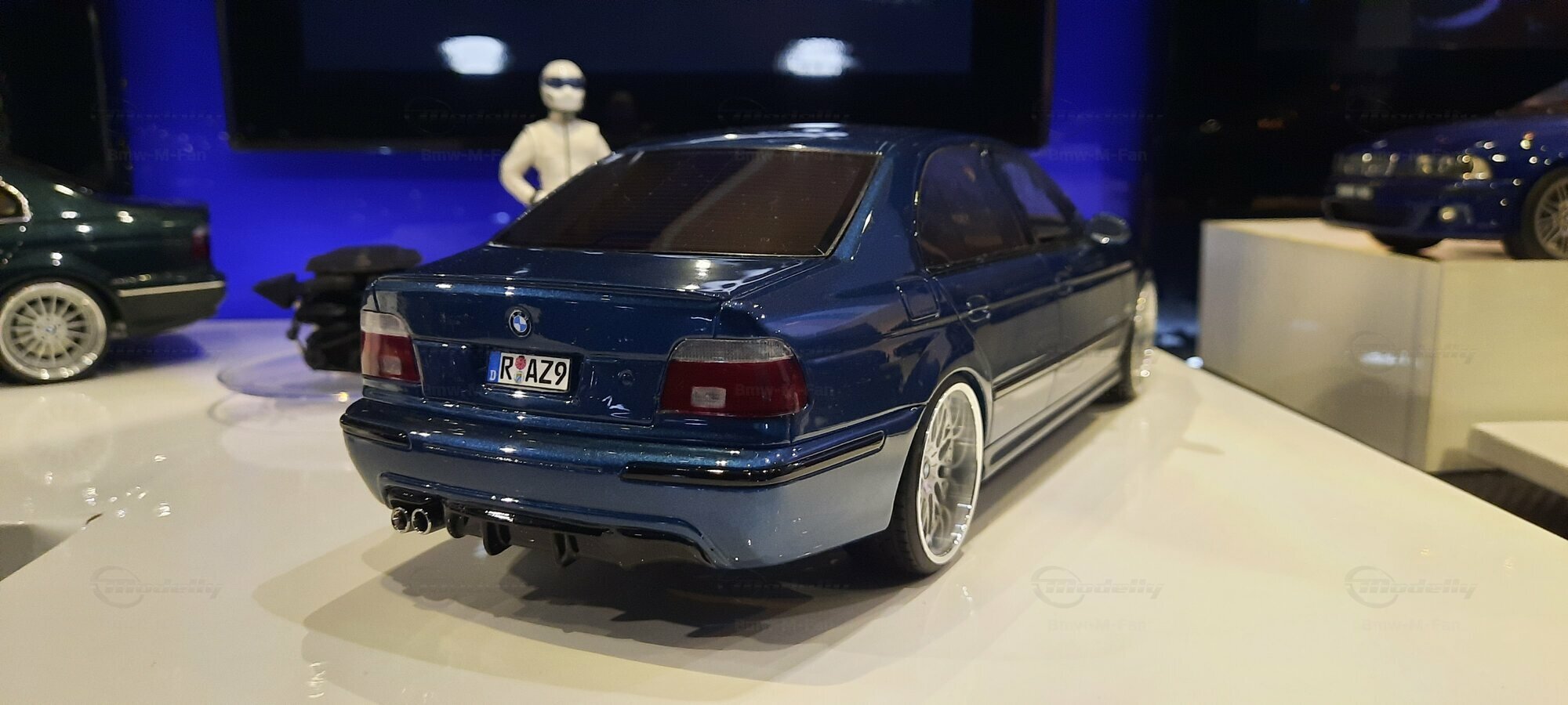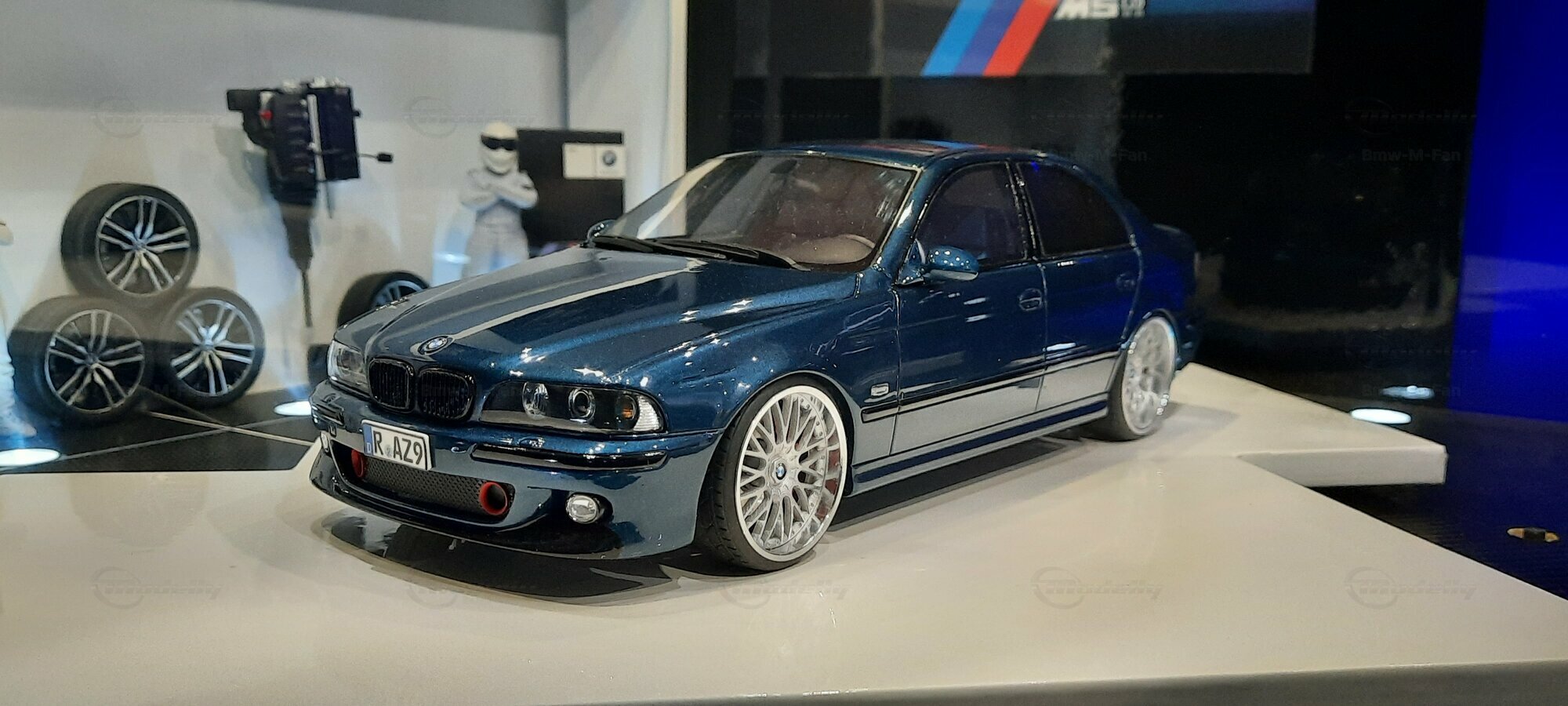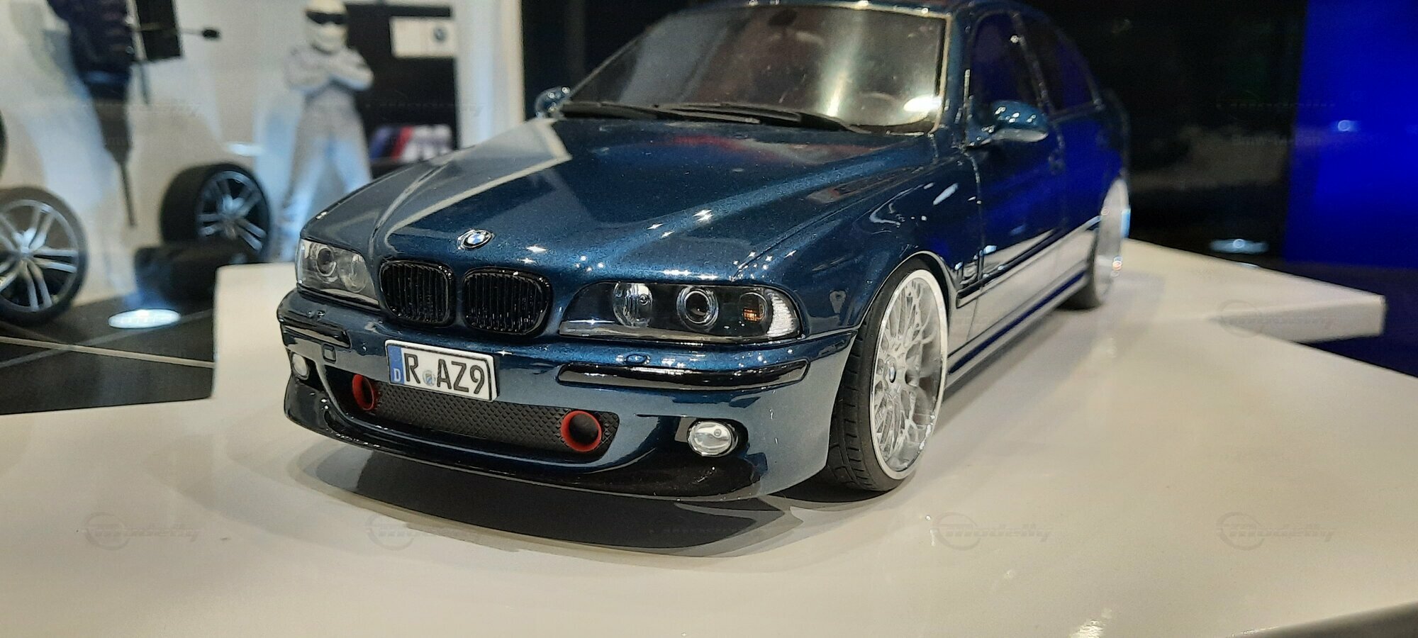 The model car shown here in 1/18 scale, manufactured by Otto Models, represents the BMW E39 530i FL "individual" impressively. However, it is important to note that this model has been modified and does not represent the original car produced by Otto Models. Visible modifications include the striking rims made by BBS. These rims give the model a sporty yet elegant look. Another striking detail is the special paintwork shimmering in a deep blue, giving the vehicle a noble shine.