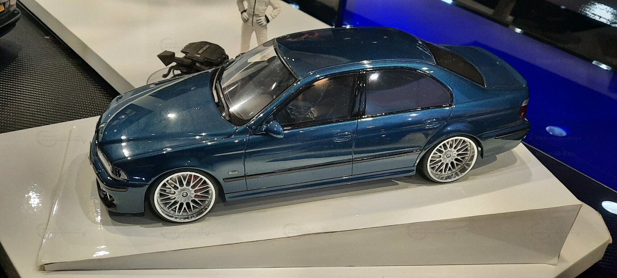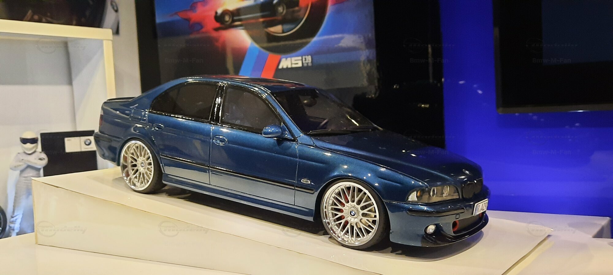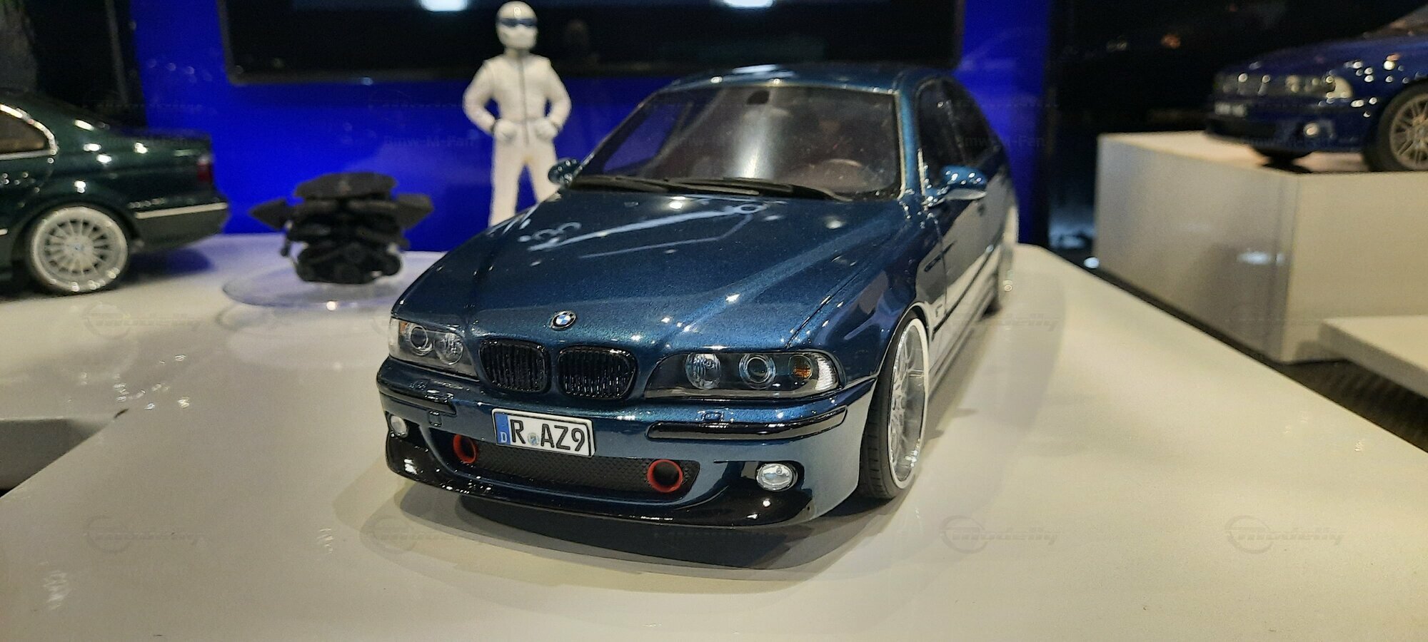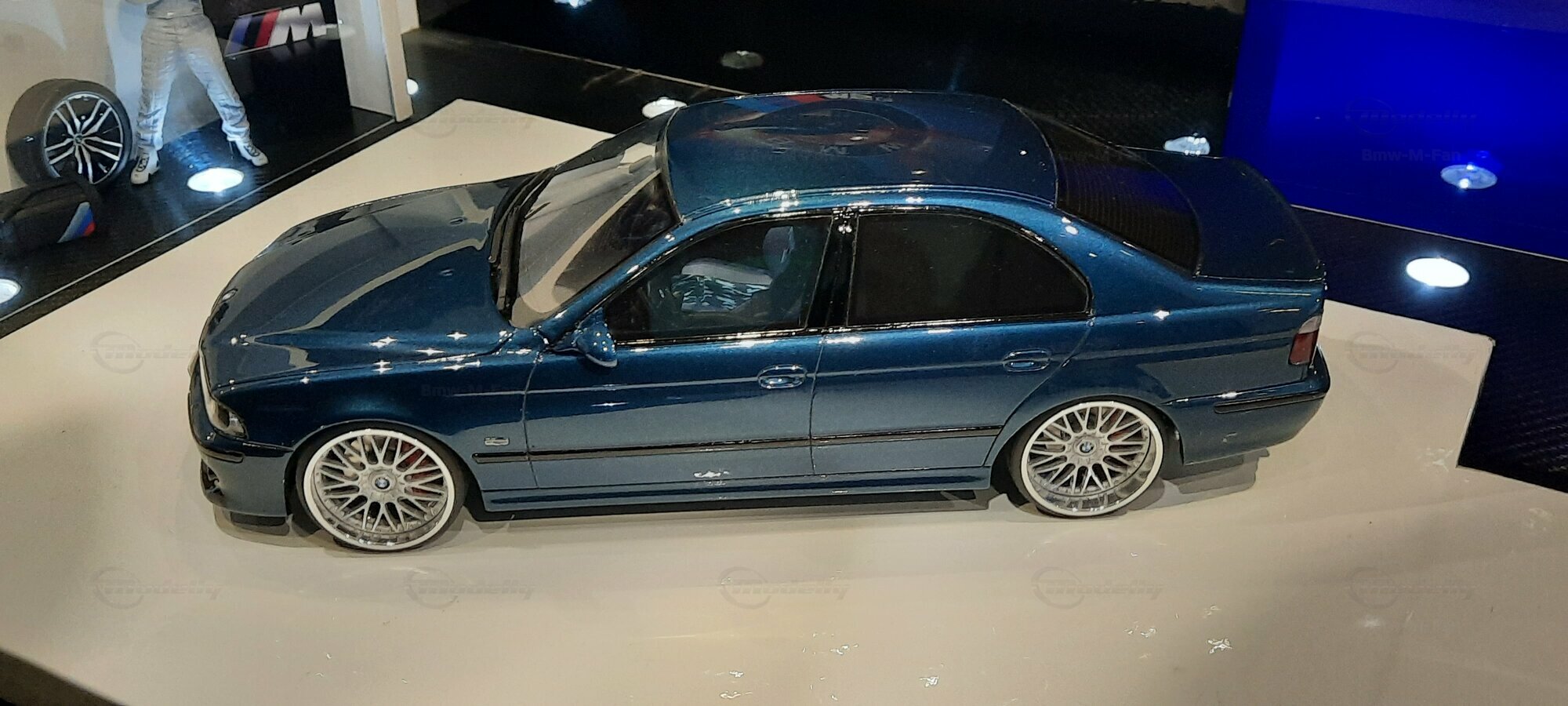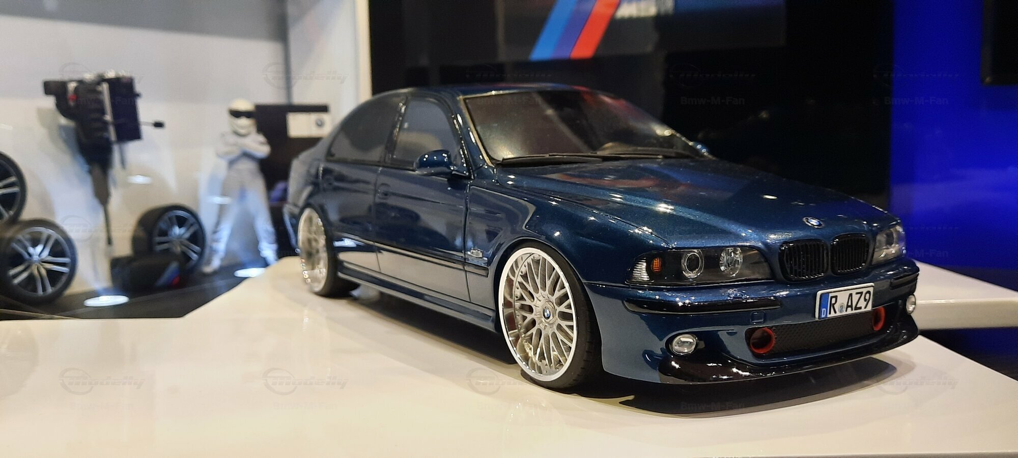The model car shown here in 1/18 scale, manufactured by Otto Models, represents the BMW E39 530i FL "individual" impressively. However, it is important to note that this model has been modified and does not represent the original car produced by Otto Models. Visible modifications include the striking rims made by BBS. These rims give the model a sporty yet elegant look. Another striking detail is the special paintwork shimmering in a deep blue, giving the vehicle a noble shine.