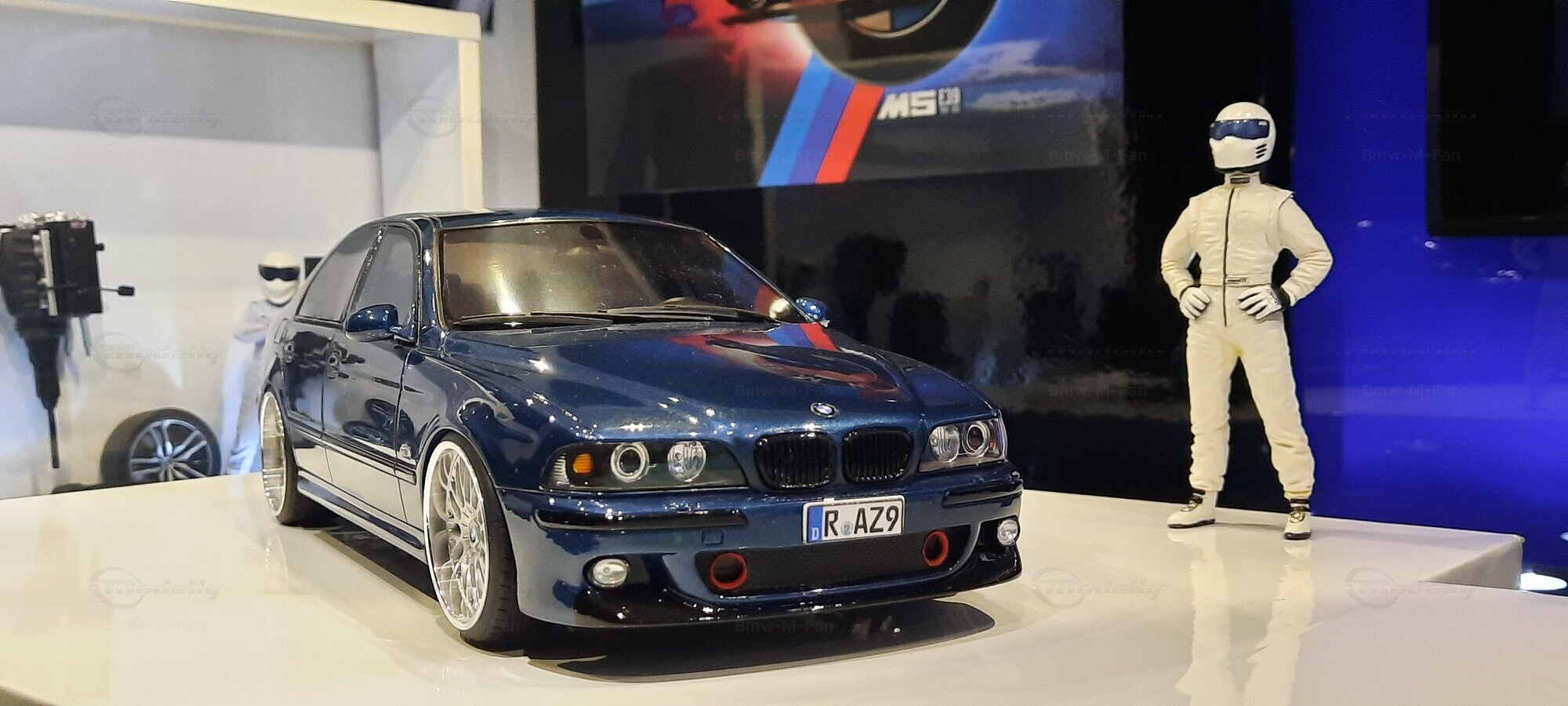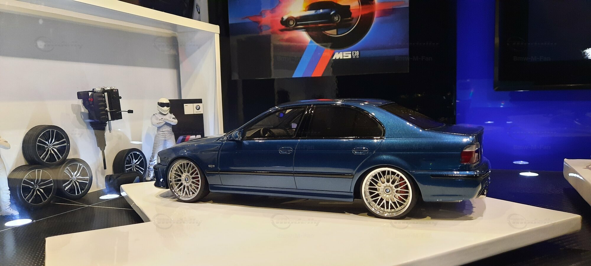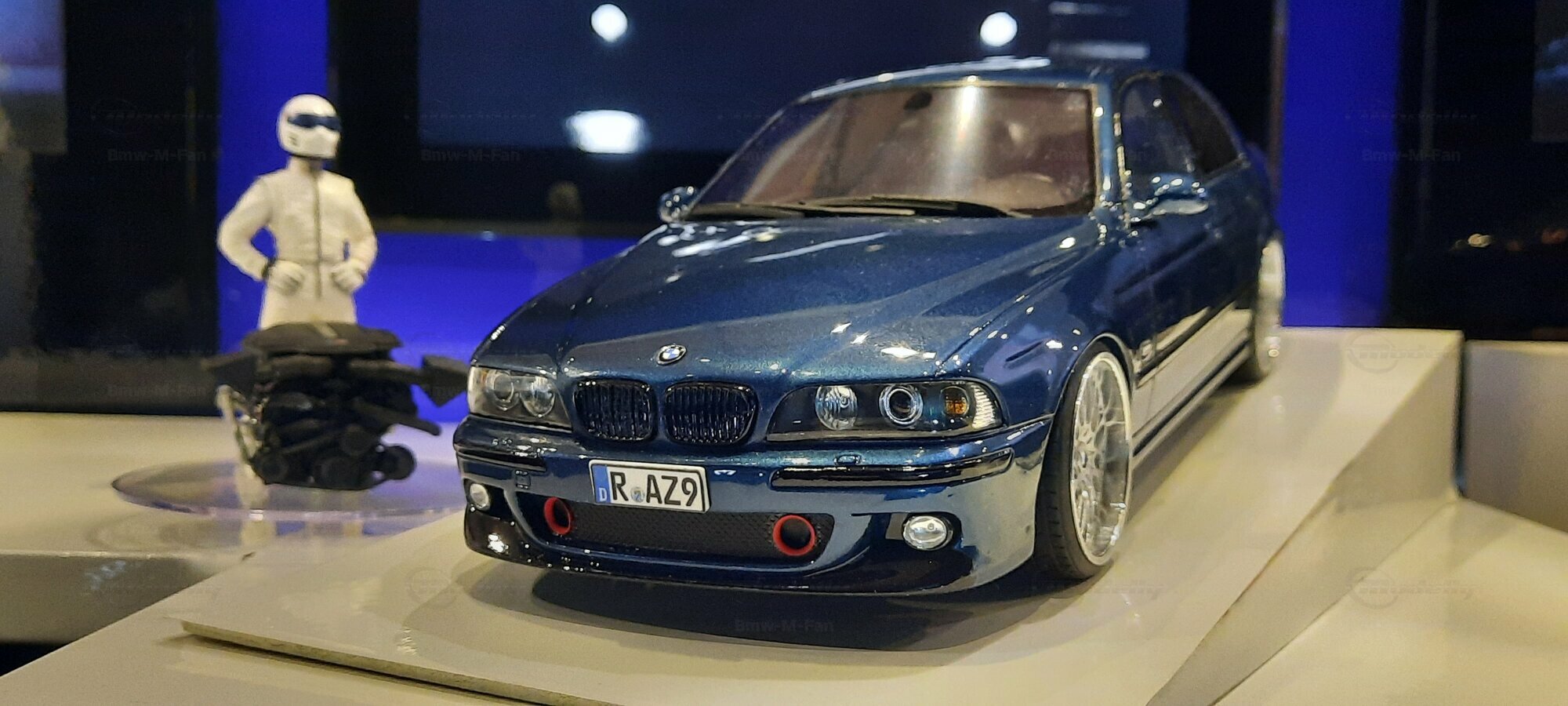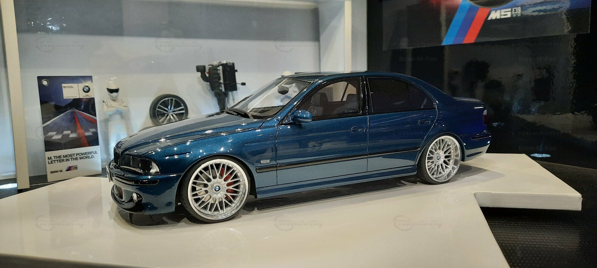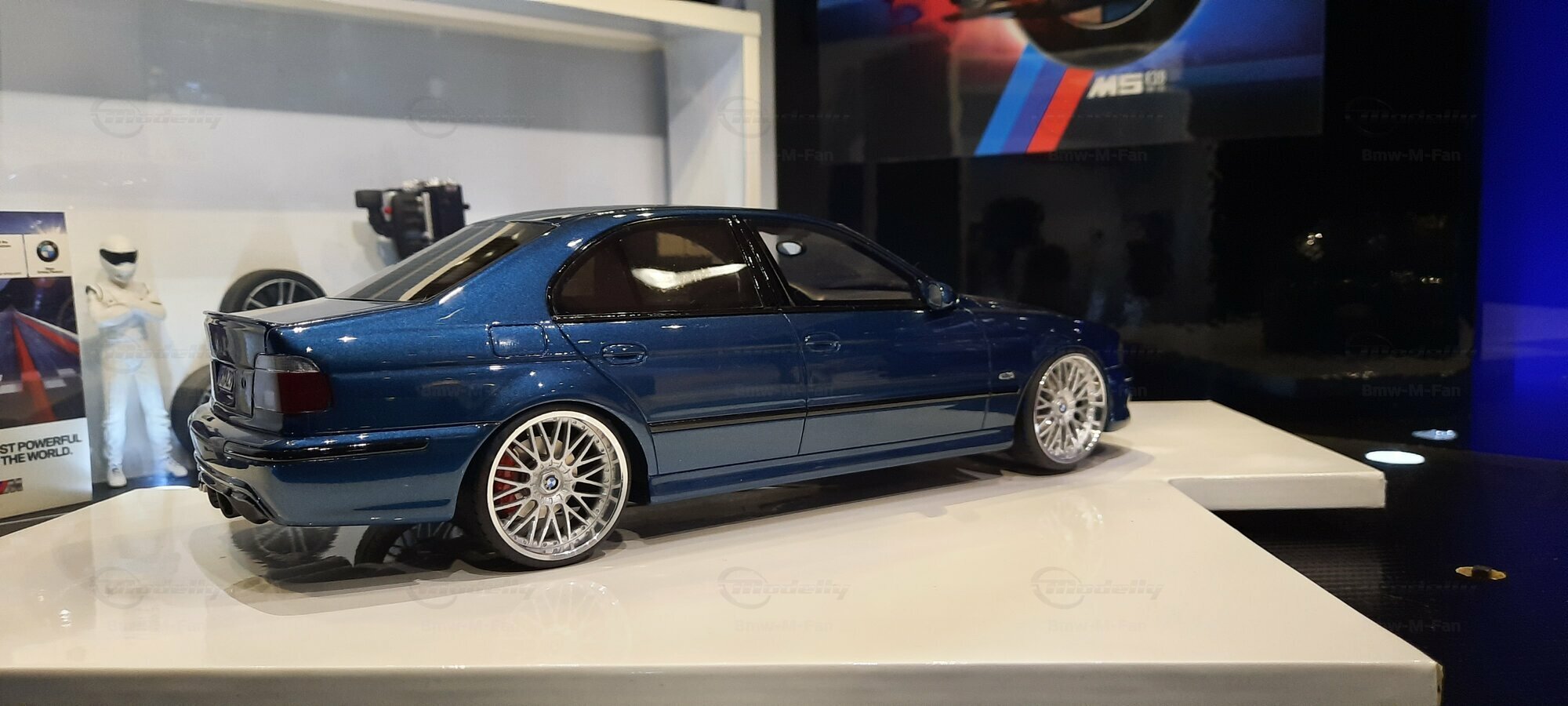 The model car shown here in 1/18 scale, manufactured by Otto Models, represents the BMW E39 530i FL "individual" impressively. However, it is important to note that this model has been modified and does not represent the original car produced by Otto Models. Visible modifications include the striking rims made by BBS. These rims give the model a sporty yet elegant look. Another striking detail is the special paintwork shimmering in a deep blue, giving the vehicle a noble shine.