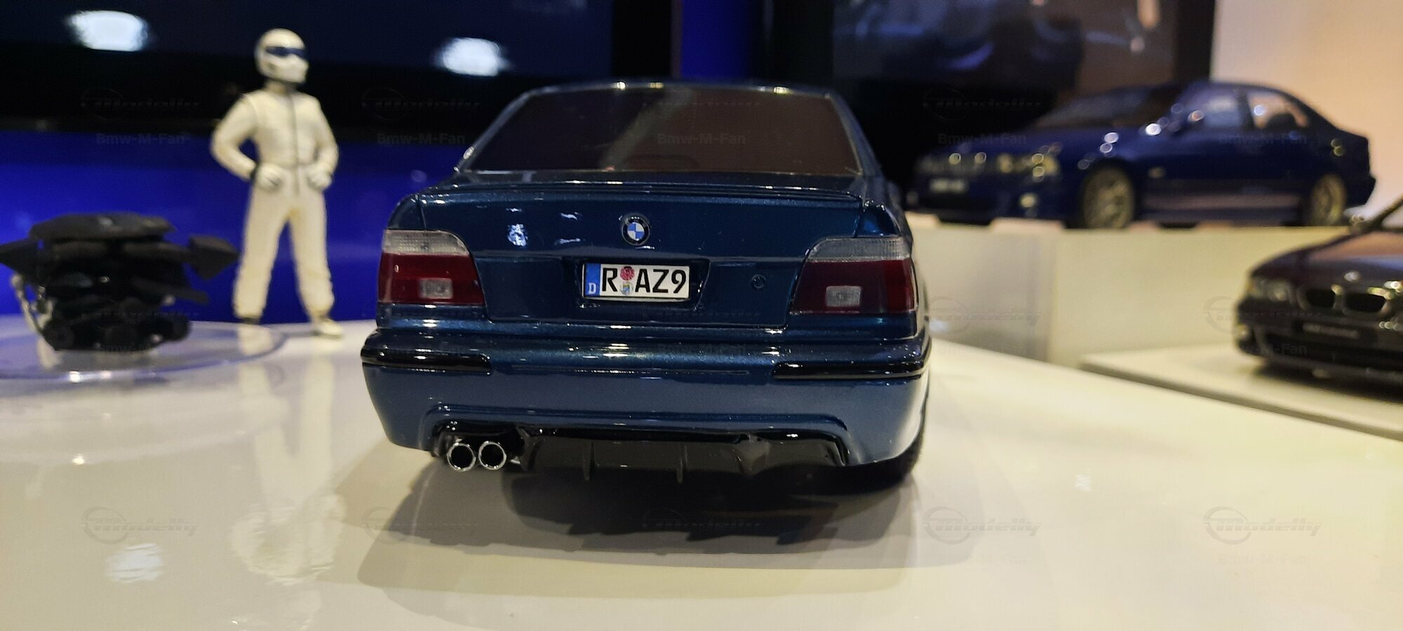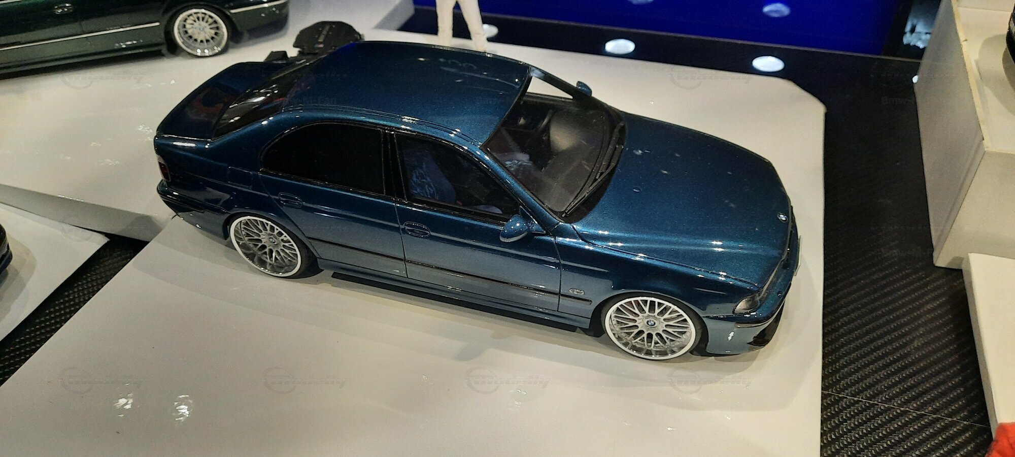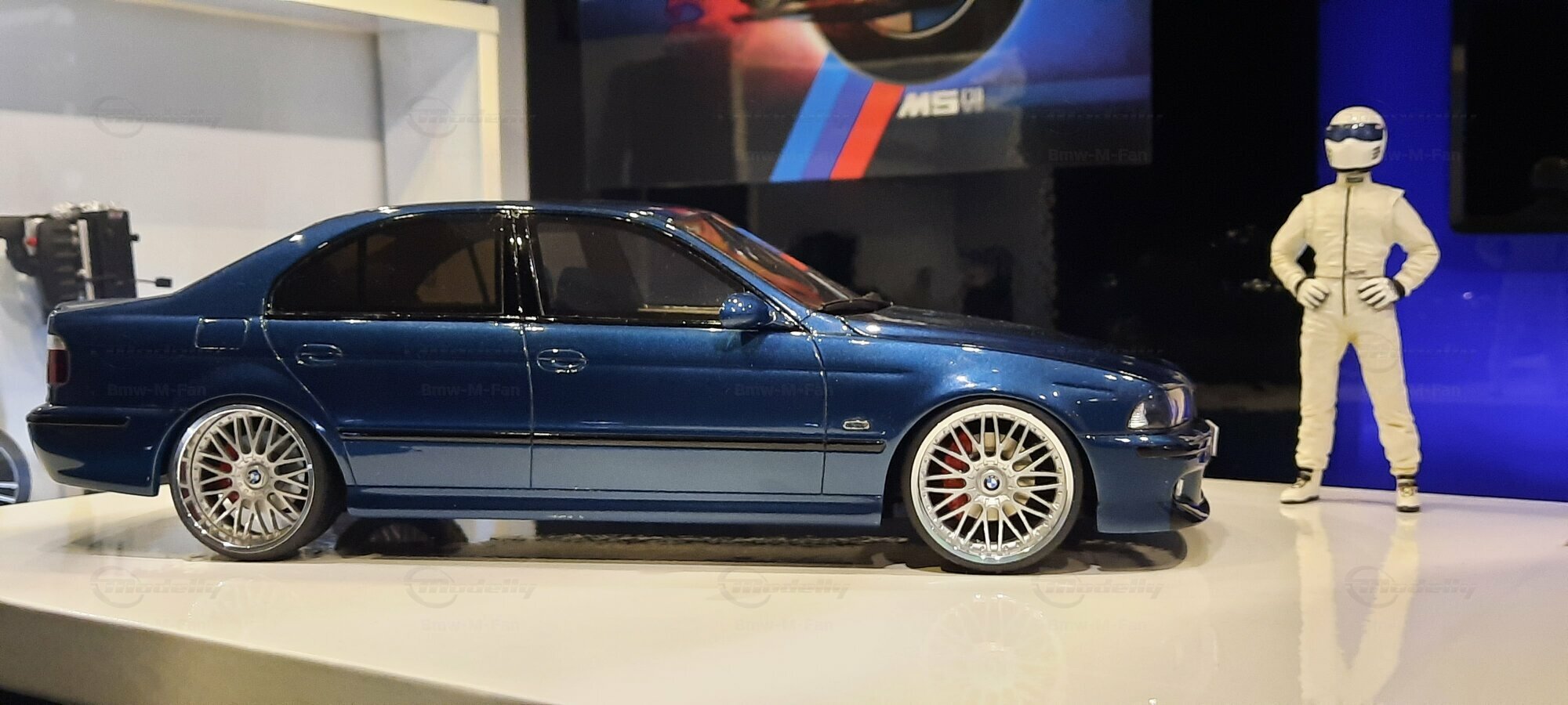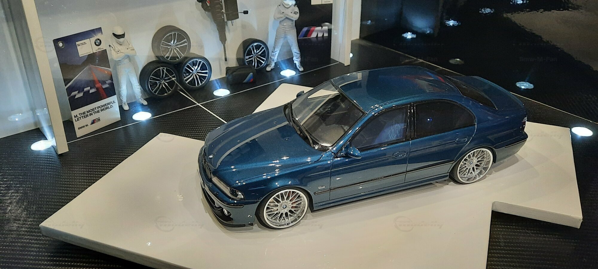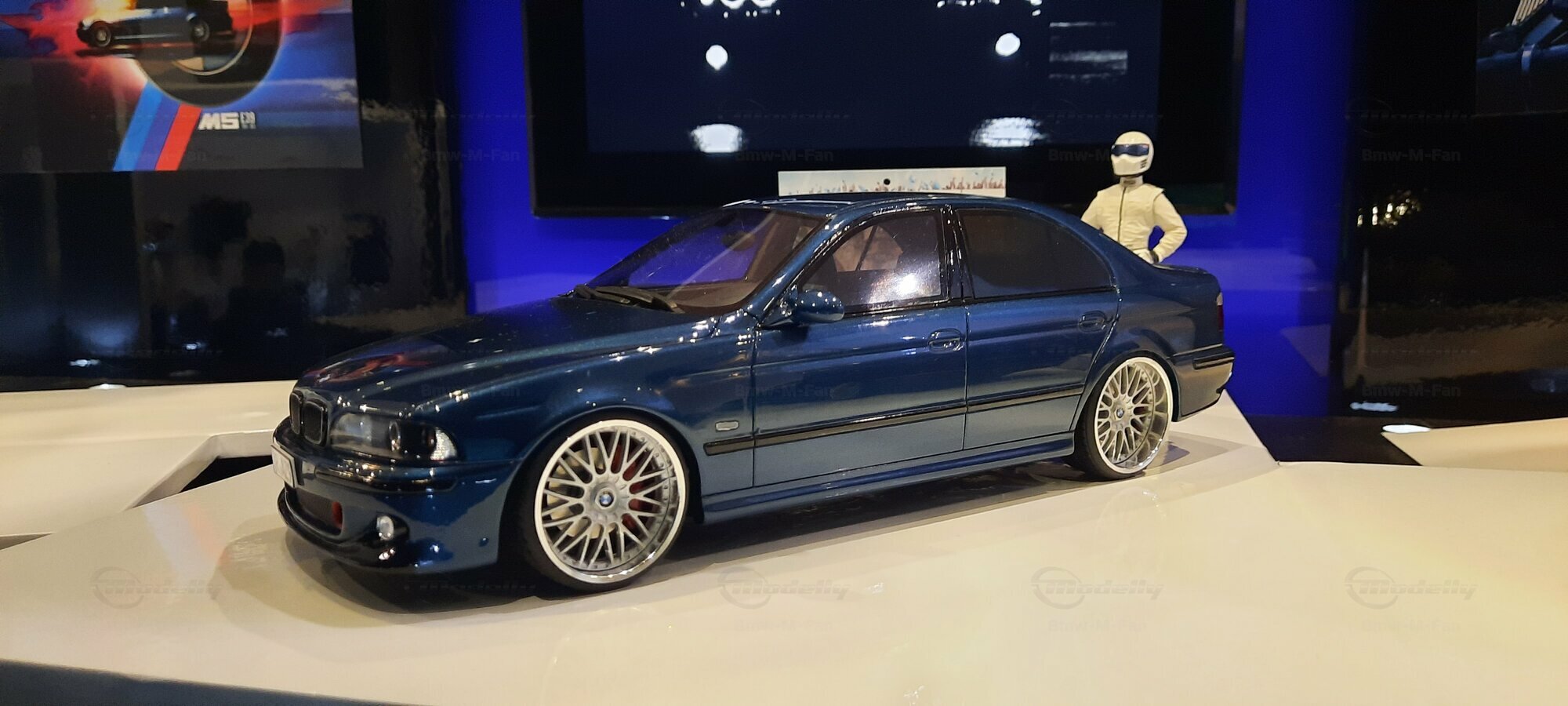 The model car shown here in 1/18 scale, manufactured by Otto Models, represents the BMW E39 530i FL "individual" impressively. However, it is important to note that this model has been modified and does not represent the original car produced by Otto Models. Visible modifications include the striking rims made by BBS. These rims give the model a sporty yet elegant look. Another striking detail is the special paintwork shimmering in a deep blue, giving the vehicle a noble shine.