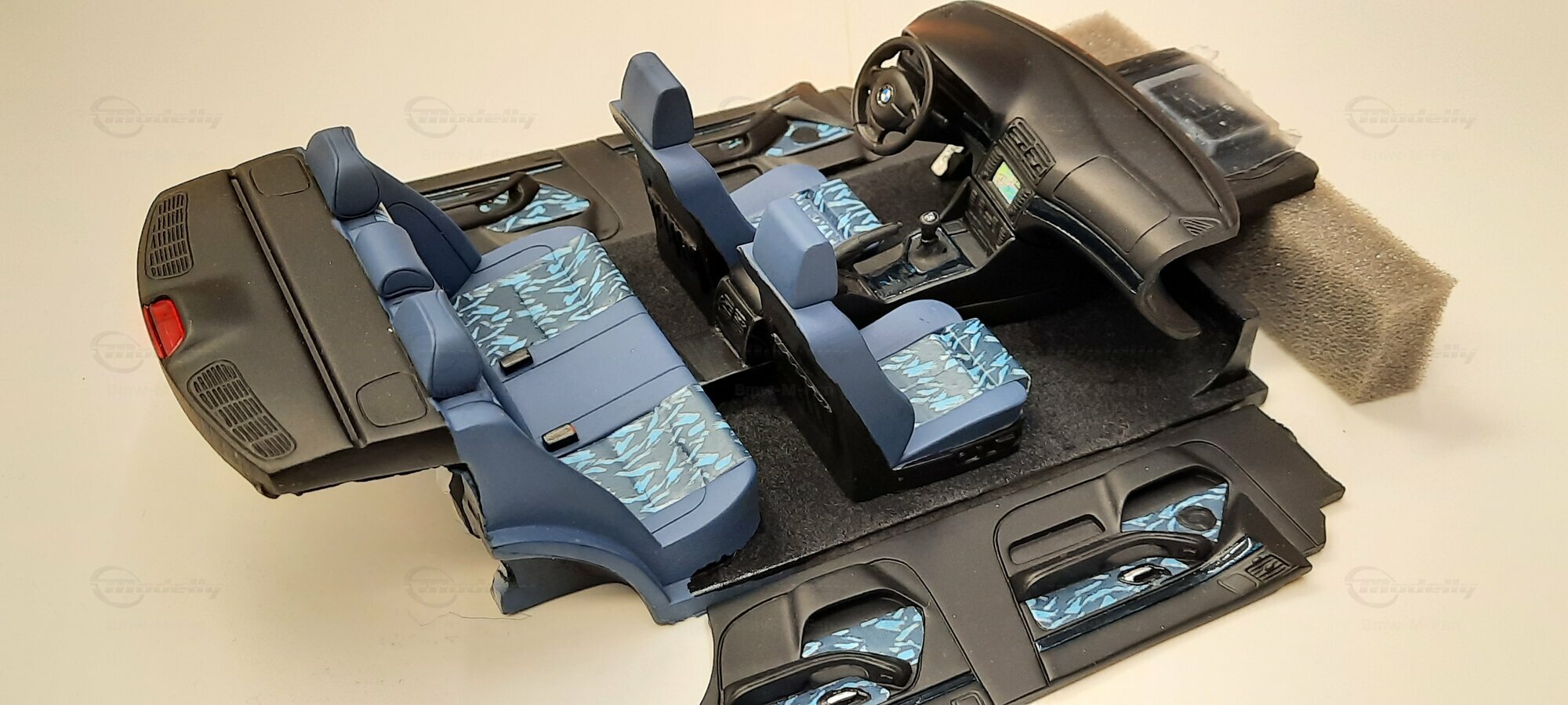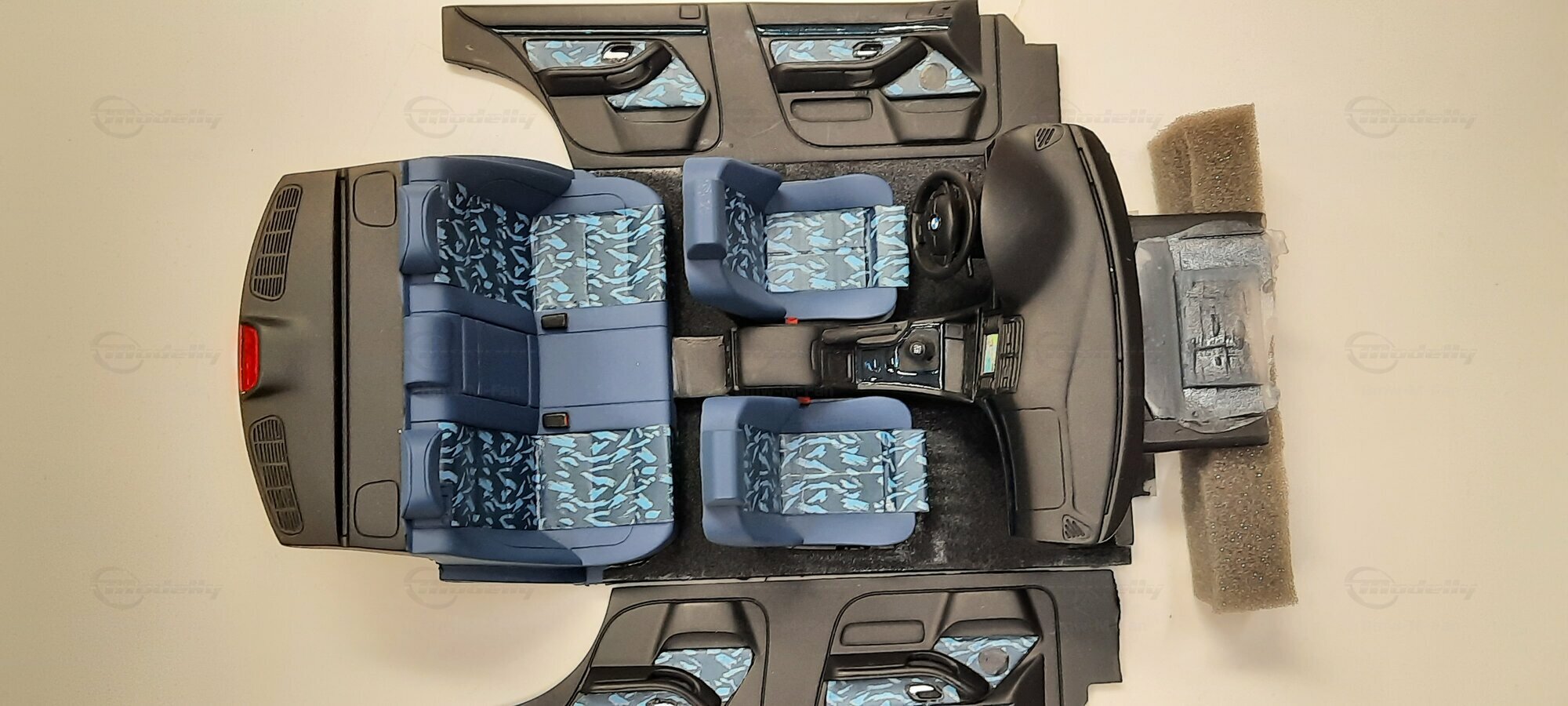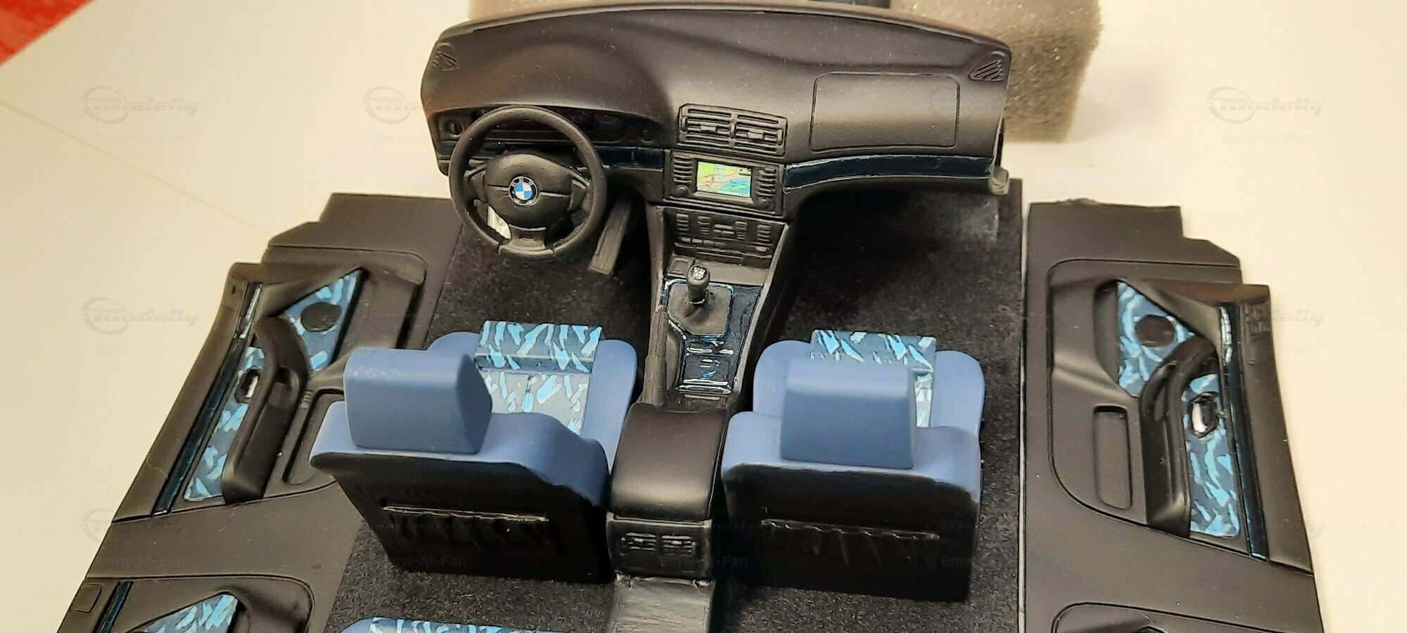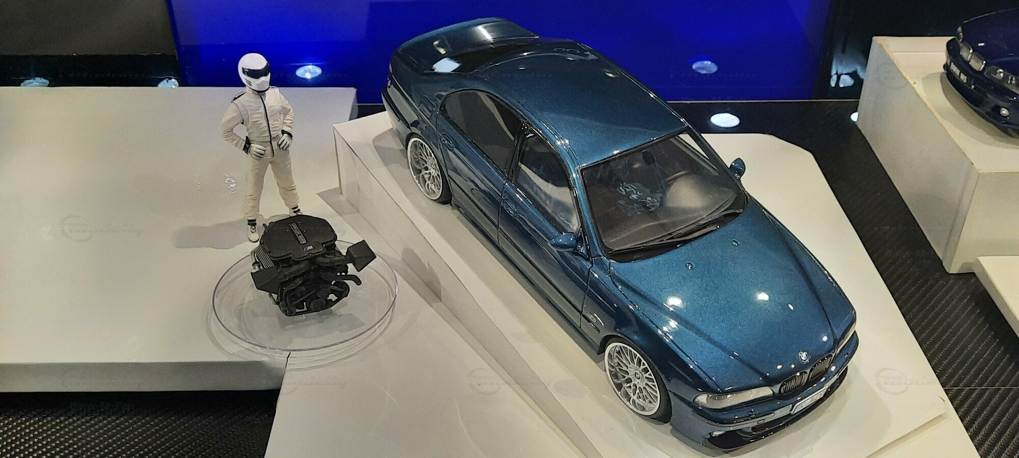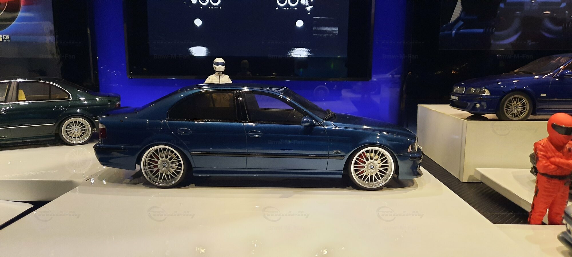 The model car shown here in 1/18 scale, manufactured by Otto Models, represents the BMW E39 530i FL "individual" impressively. However, it is important to note that this model has been modified and does not represent the original car produced by Otto Models. Visible modifications include the striking rims made by BBS. These rims give the model a sporty yet elegant look. Another striking detail is the special paintwork shimmering in a deep blue, giving the vehicle a noble shine.