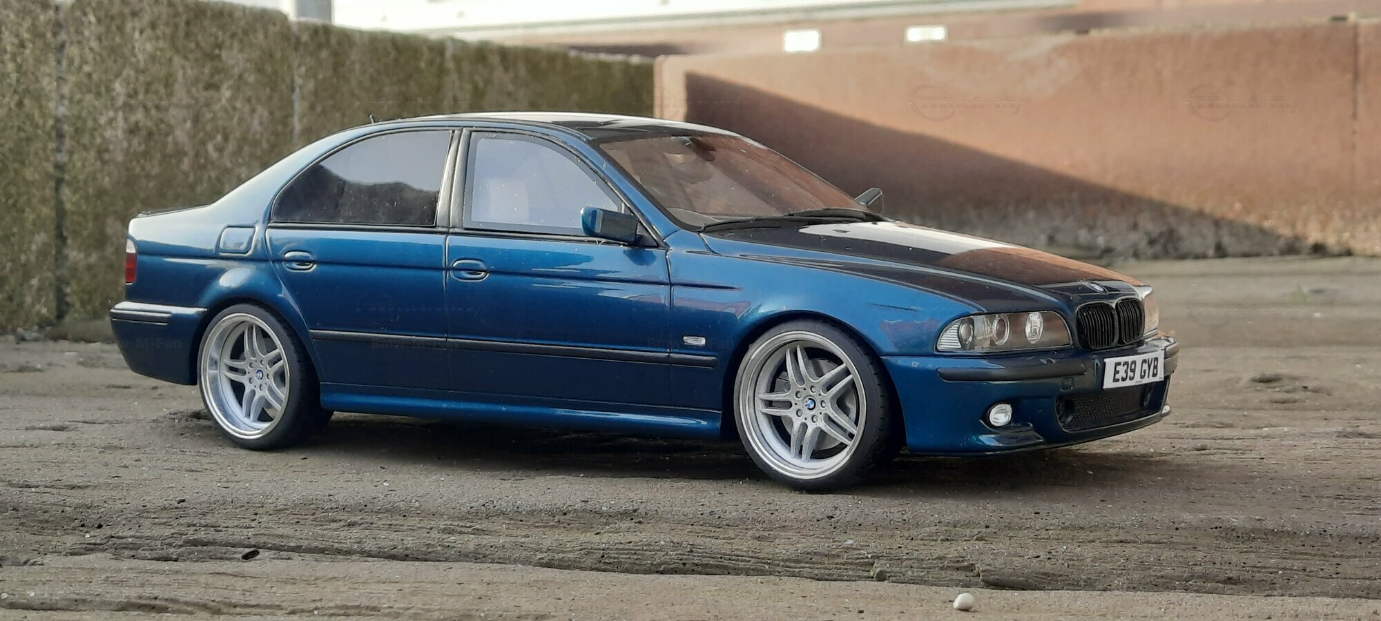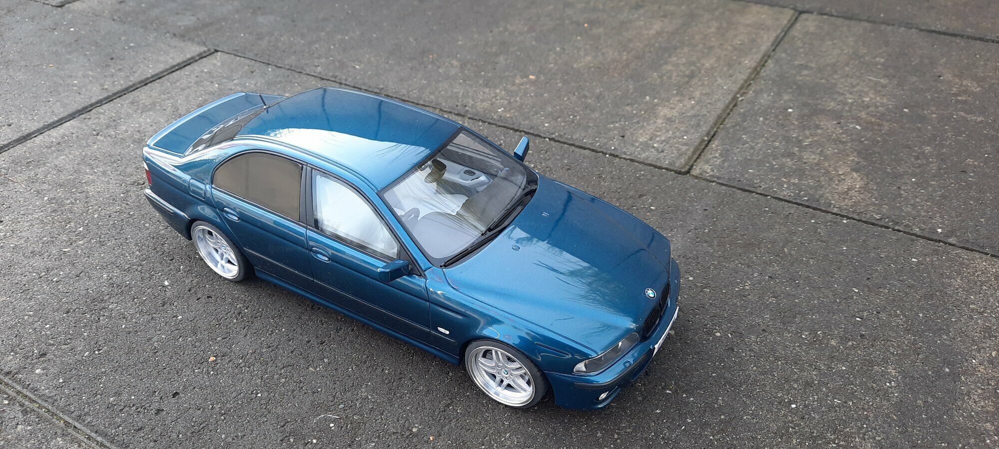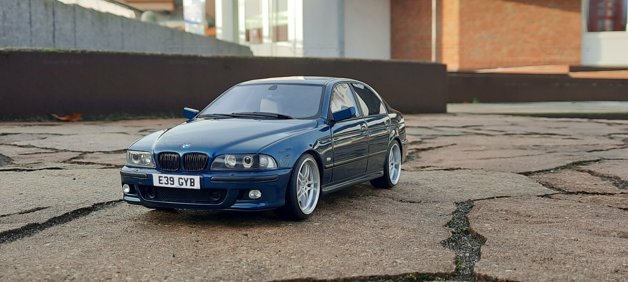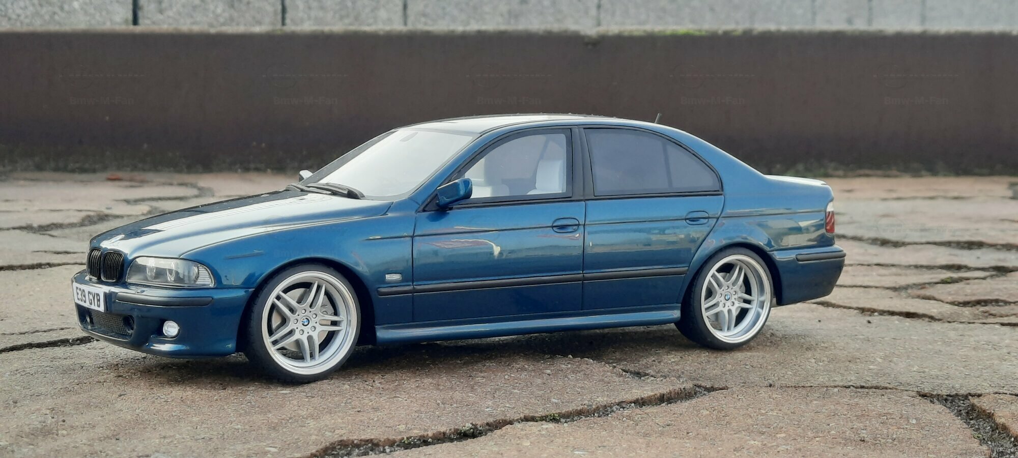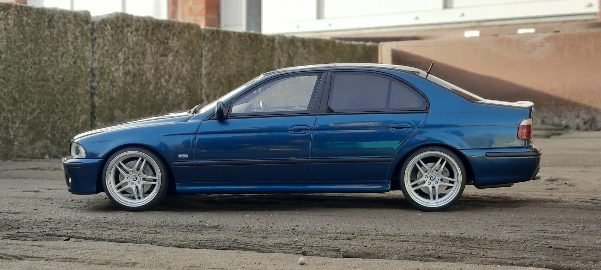 This detailed scale model measuring 1/18 was manufactured by Otto Models. It represents a modified version of the BMW E39 530i FL and is crafted from high-quality resin. The modifications on this model are apparent, as they do not reflect the original state produced by Otto Models. Some alterations such as the installed tuning components and rims were not part of Otto Models' original design. The model is finished in a glossy blue paint and showcases impressive details like the front headlights and the iconic BMW kidney grilles.