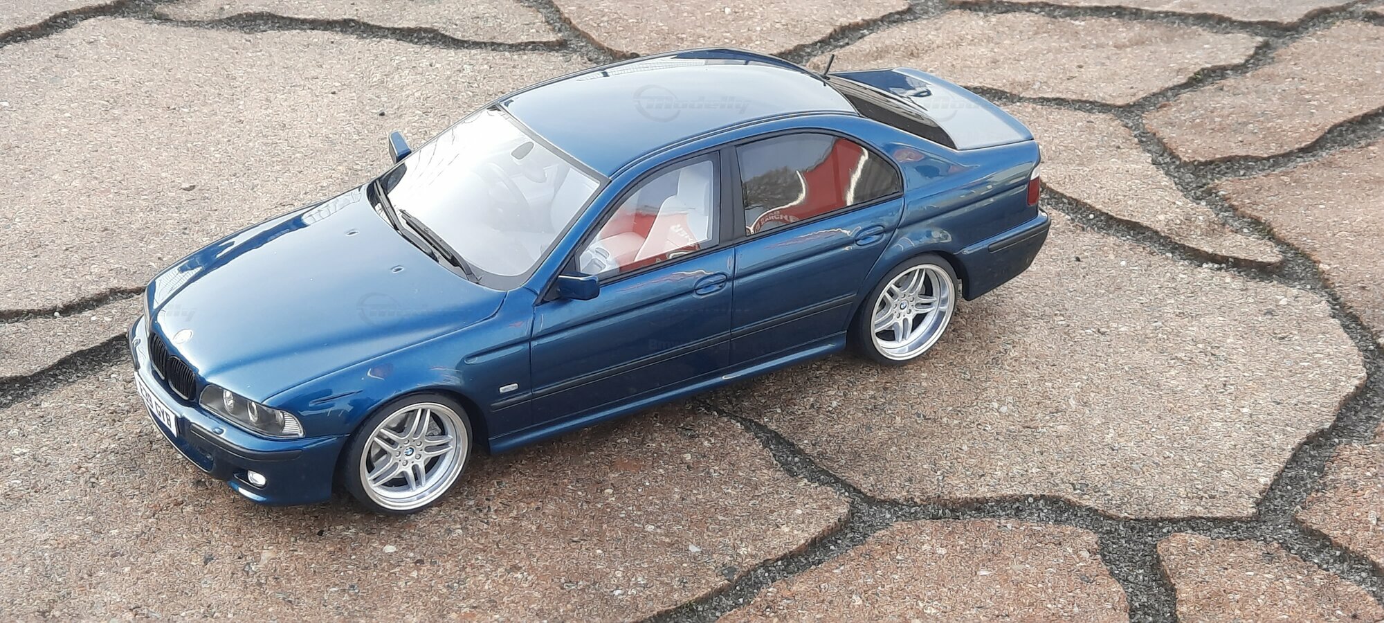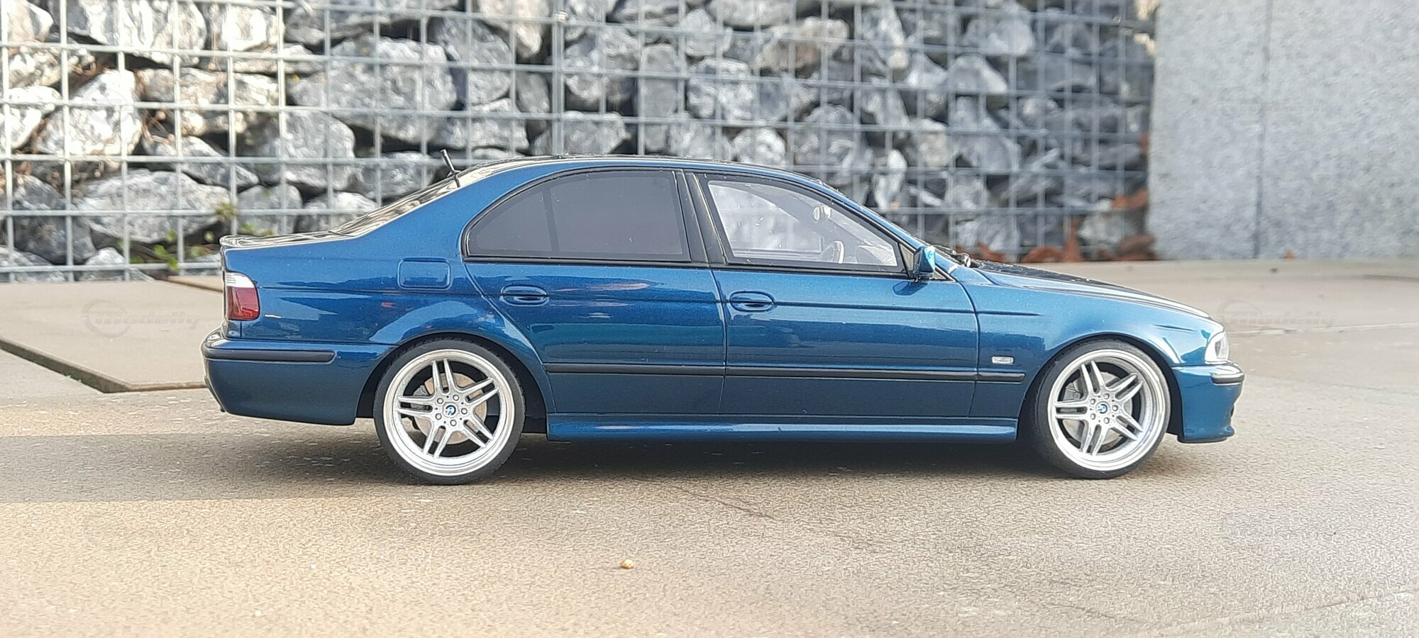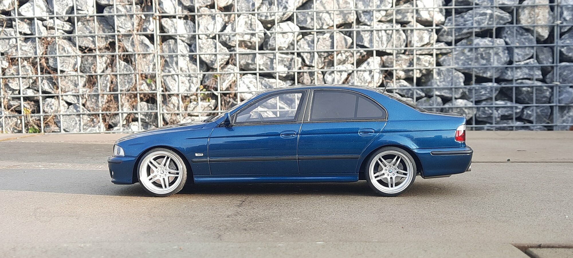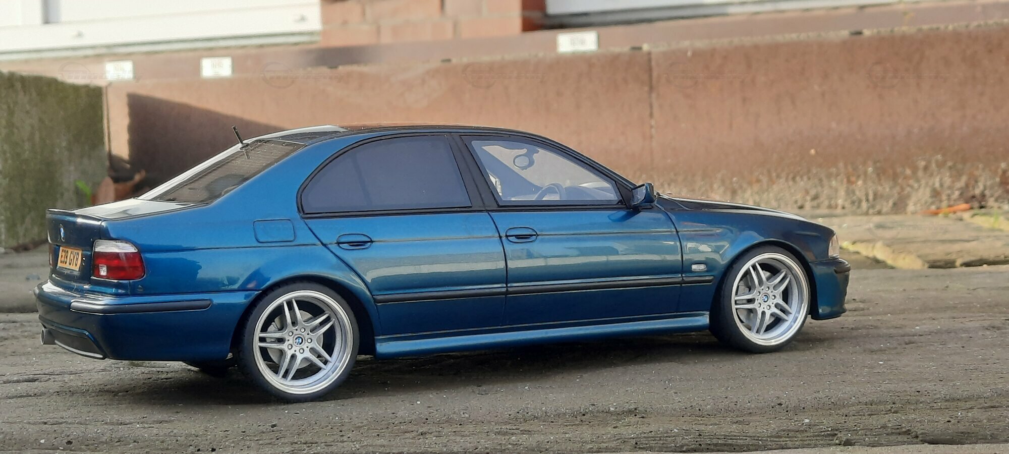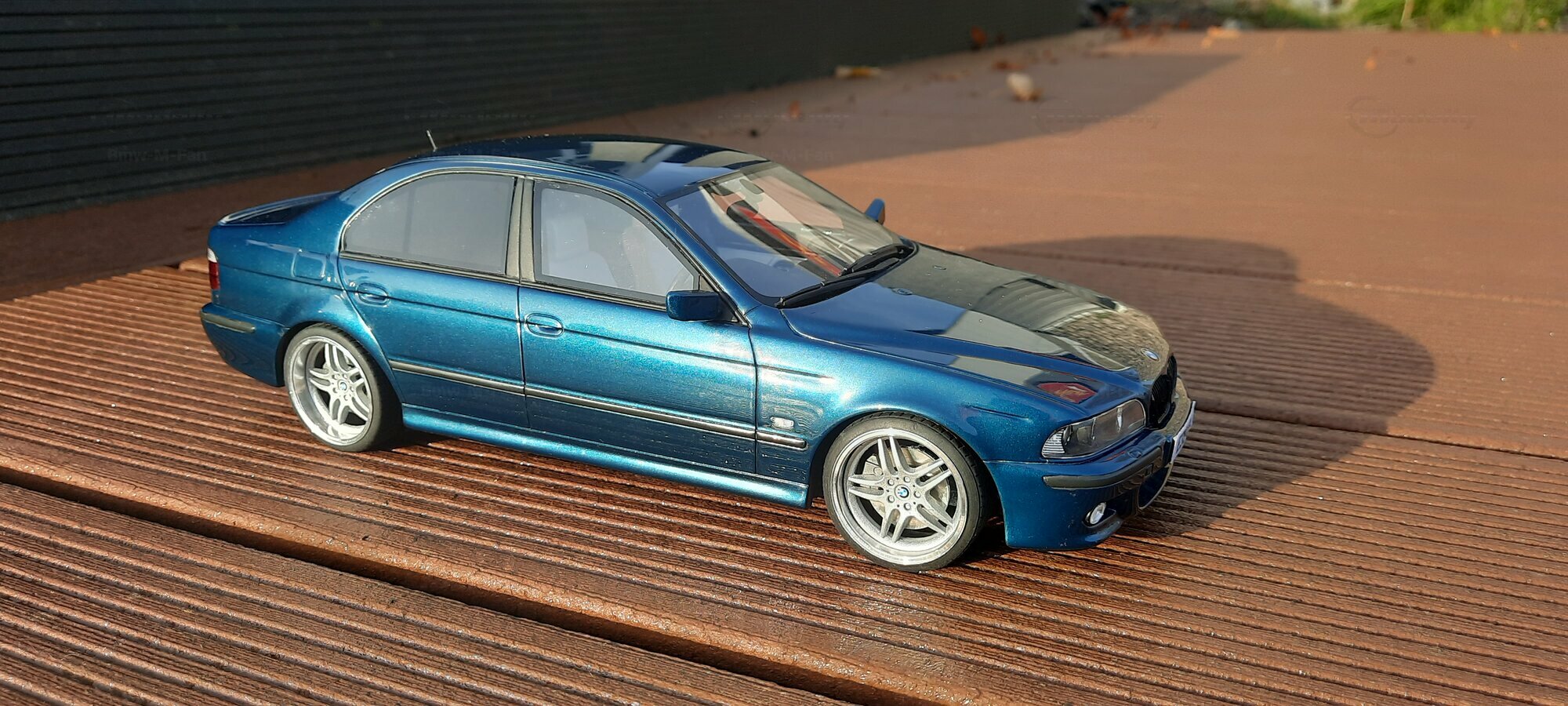This detailed scale model measuring 1/18 was manufactured by Otto Models. It represents a modified version of the BMW E39 530i FL and is crafted from high-quality resin. The modifications on this model are apparent, as they do not reflect the original state produced by Otto Models. Some alterations such as the installed tuning components and rims were not part of Otto Models' original design. The model is finished in a glossy blue paint and showcases impressive details like the front headlights and the iconic BMW kidney grilles.