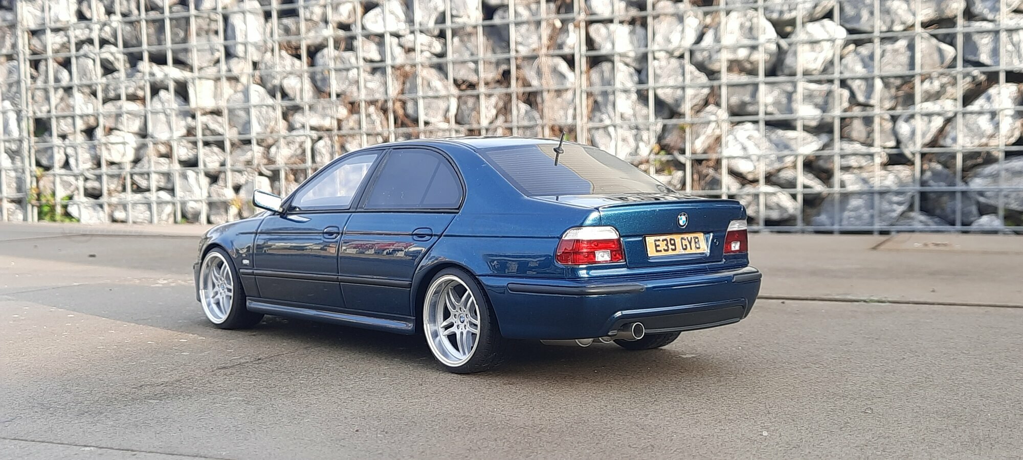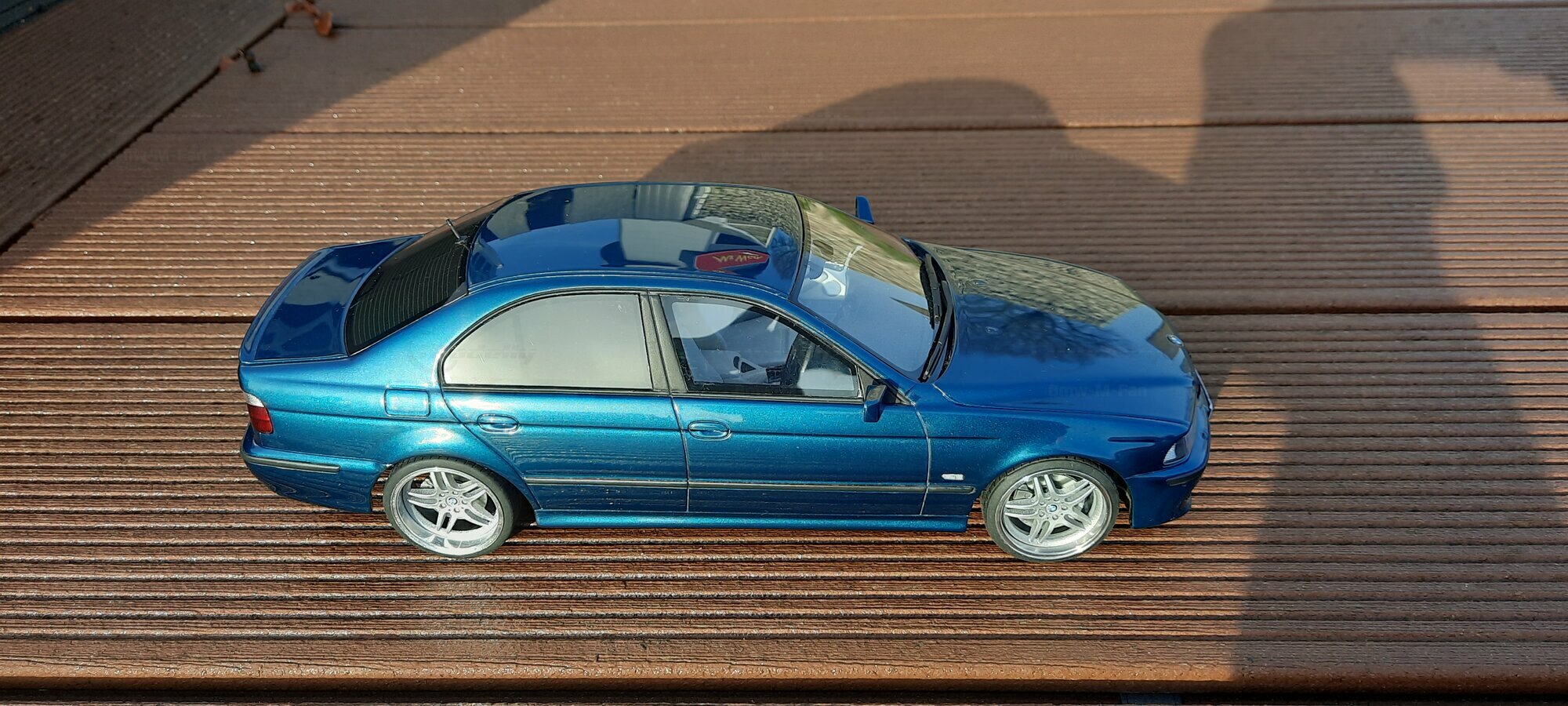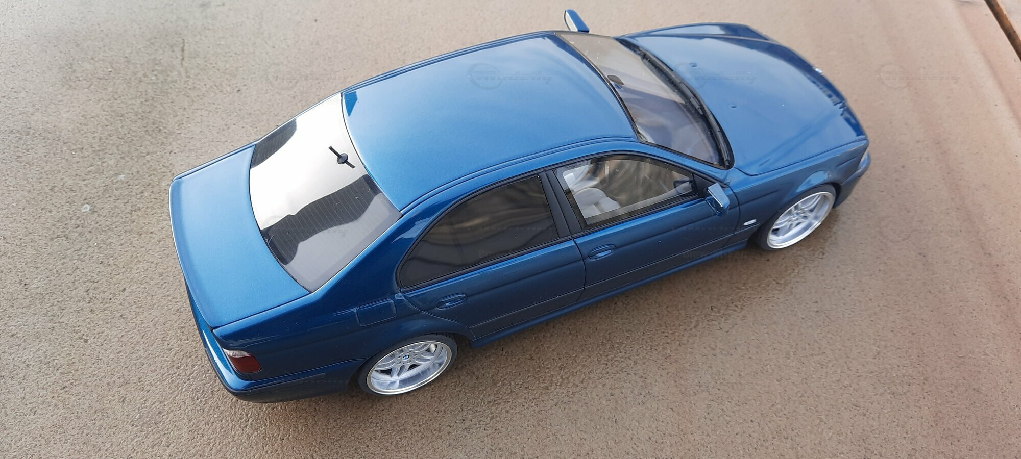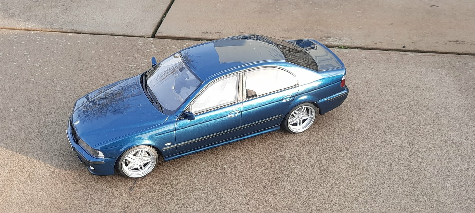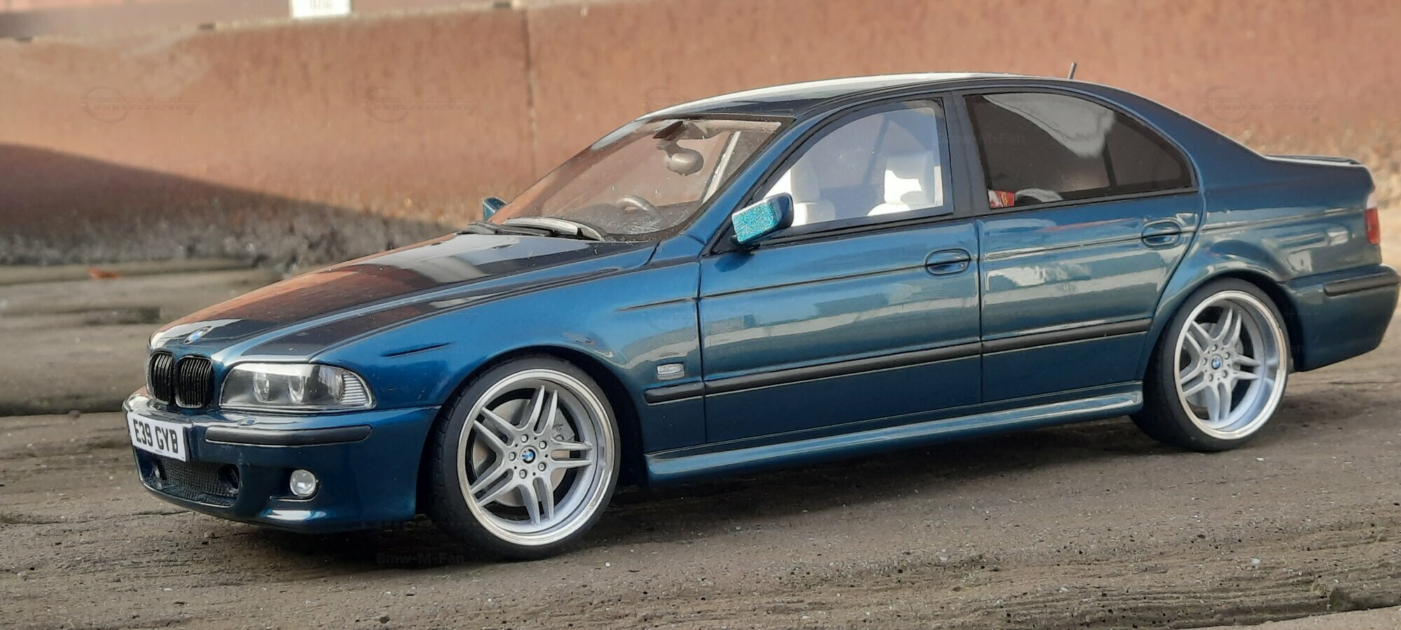 This detailed scale model measuring 1/18 was manufactured by Otto Models. It represents a modified version of the BMW E39 530i FL and is crafted from high-quality resin. The modifications on this model are apparent, as they do not reflect the original state produced by Otto Models. Some alterations such as the installed tuning components and rims were not part of Otto Models' original design. The model is finished in a glossy blue paint and showcases impressive details like the front headlights and the iconic BMW kidney grilles.