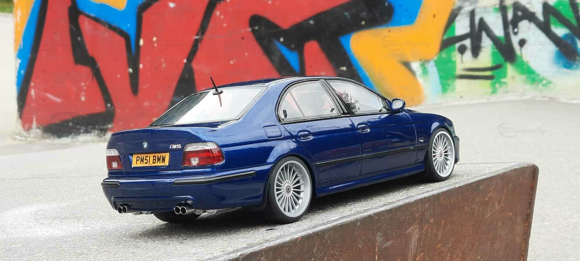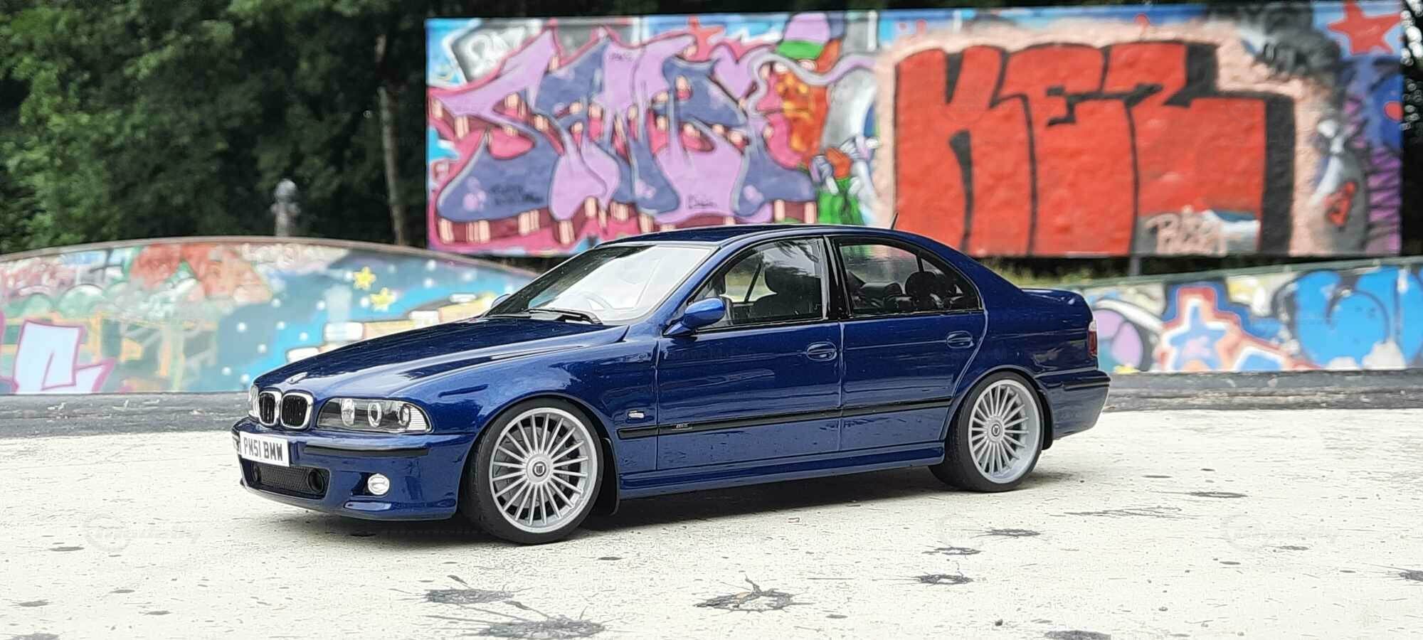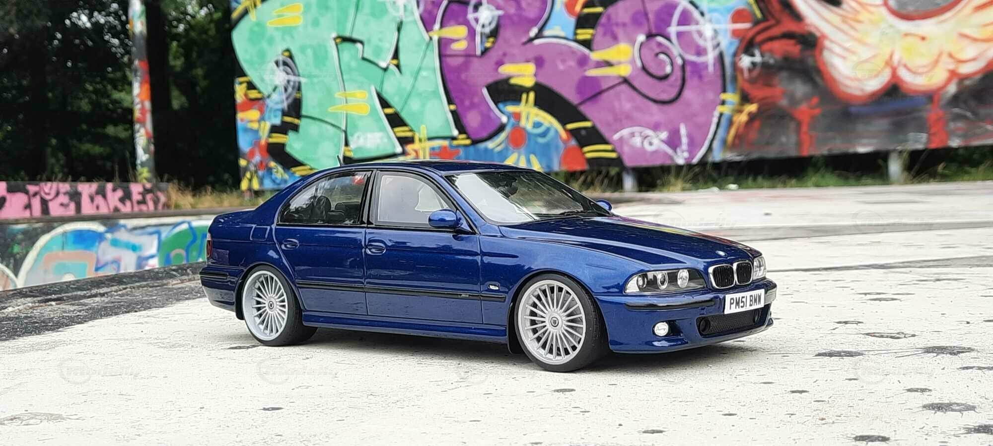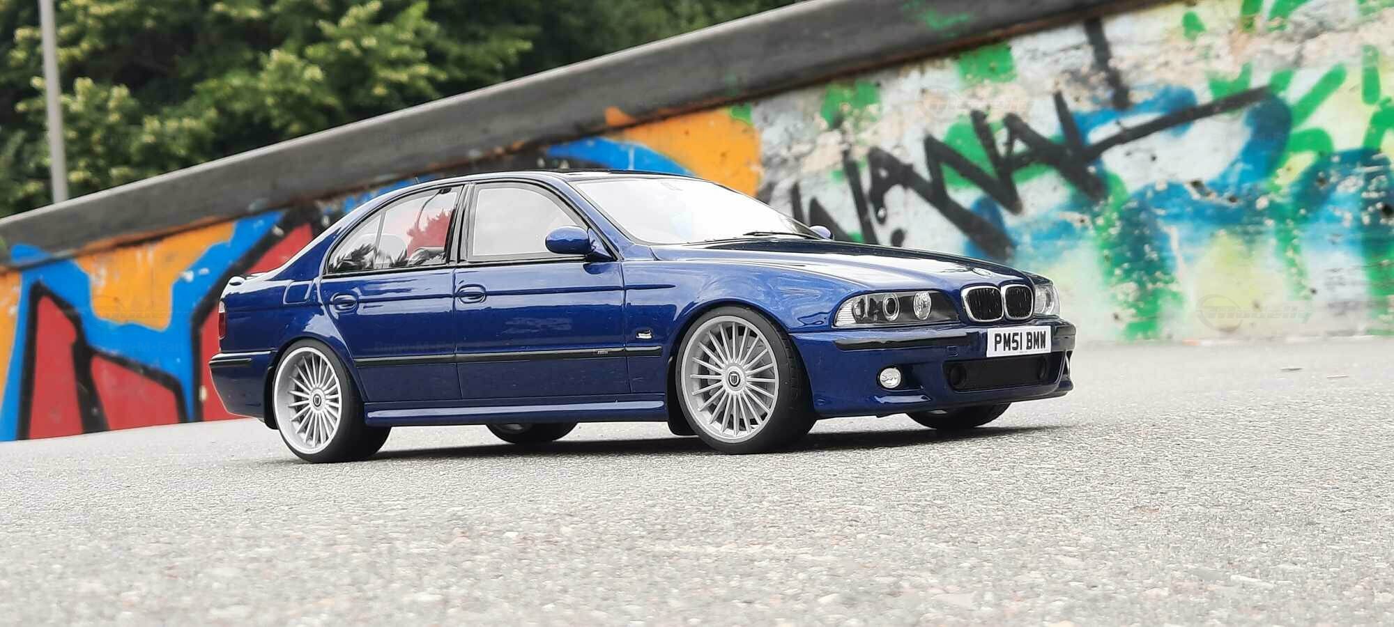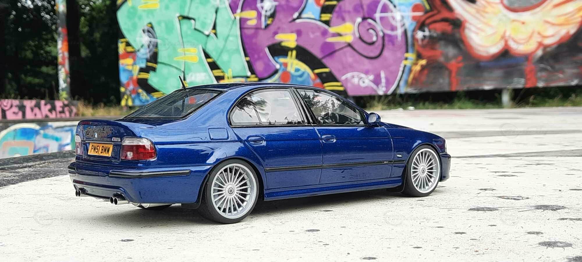 For collectors, the BMW E39 M5 model in 1/18 scale produced by Otto Models is a remarkable replica. The model impresses with its precise representation of the body and fine details. This model car is made of resin, a material known for its ability to allow detailed and finely structured reproductions. One of the distinctive features of the miniature car are the special wheels. The displayed wheels could be from Alpina, known for their high-quality and unique designs. However, it cannot be definitively confirmed whether the wheels are actually from Alpina. This model from Otto Models is not in its original condition but has been modified afterwards, and therefore does not represent the product initially produced by the manufacturer.