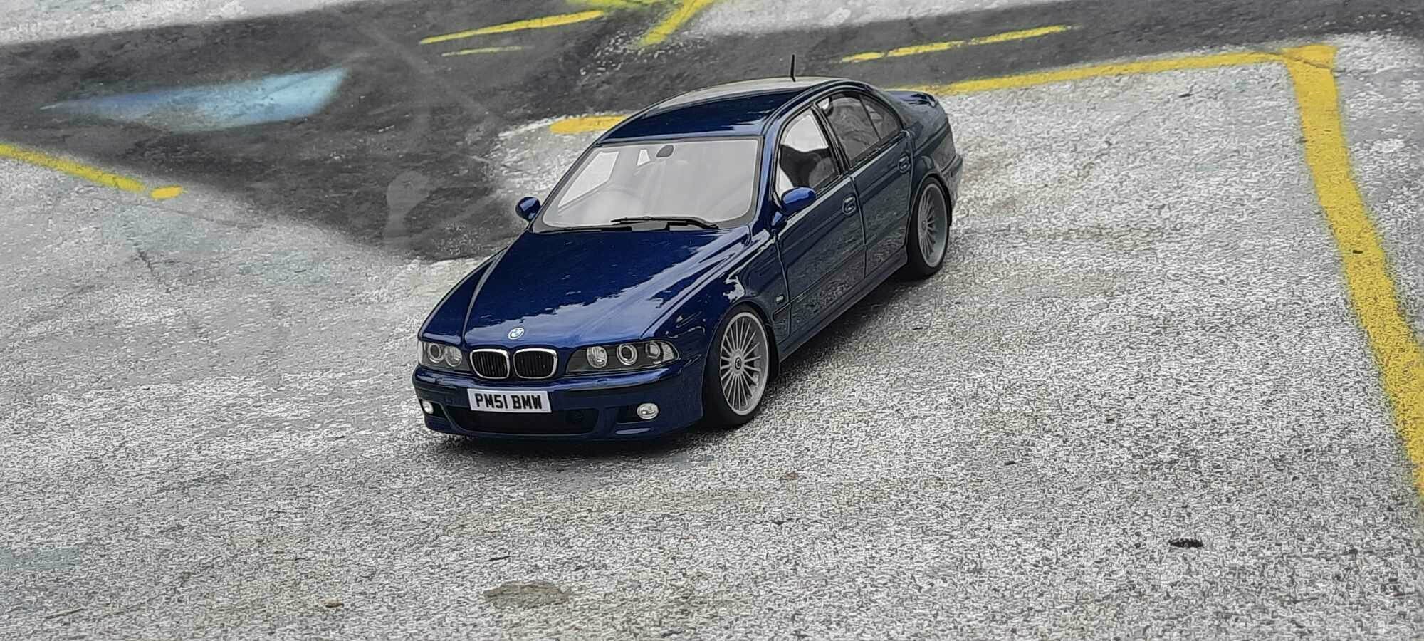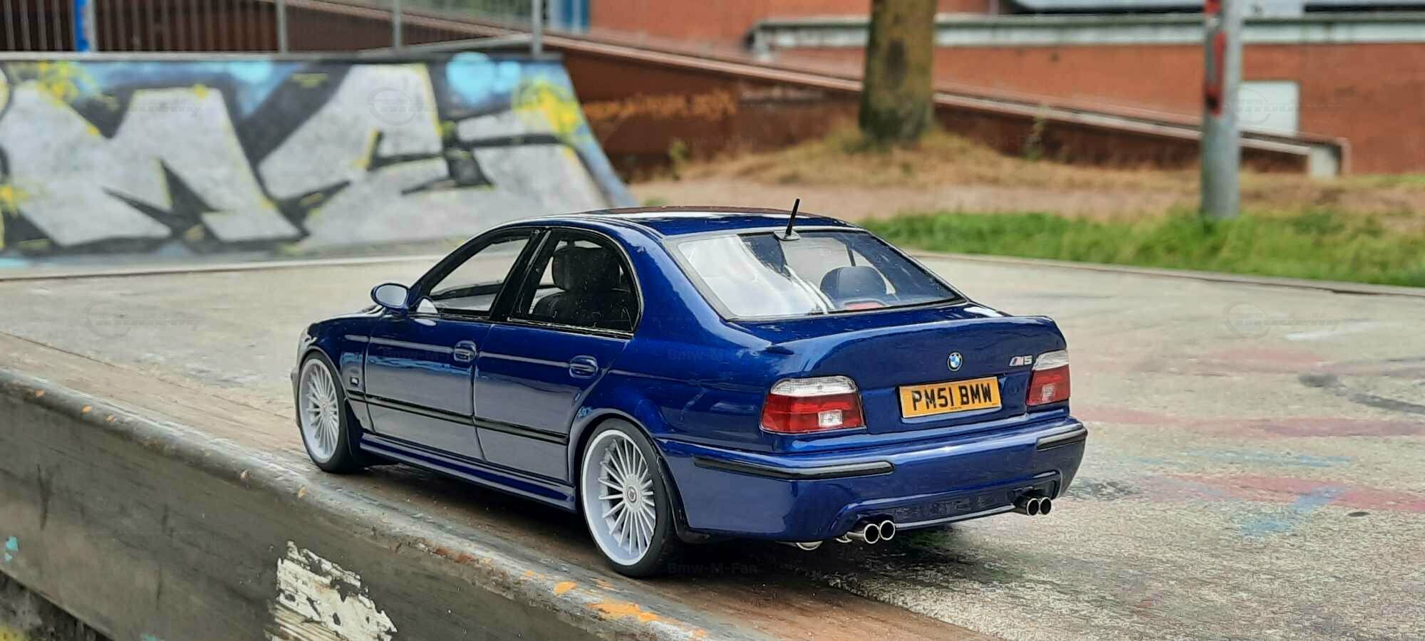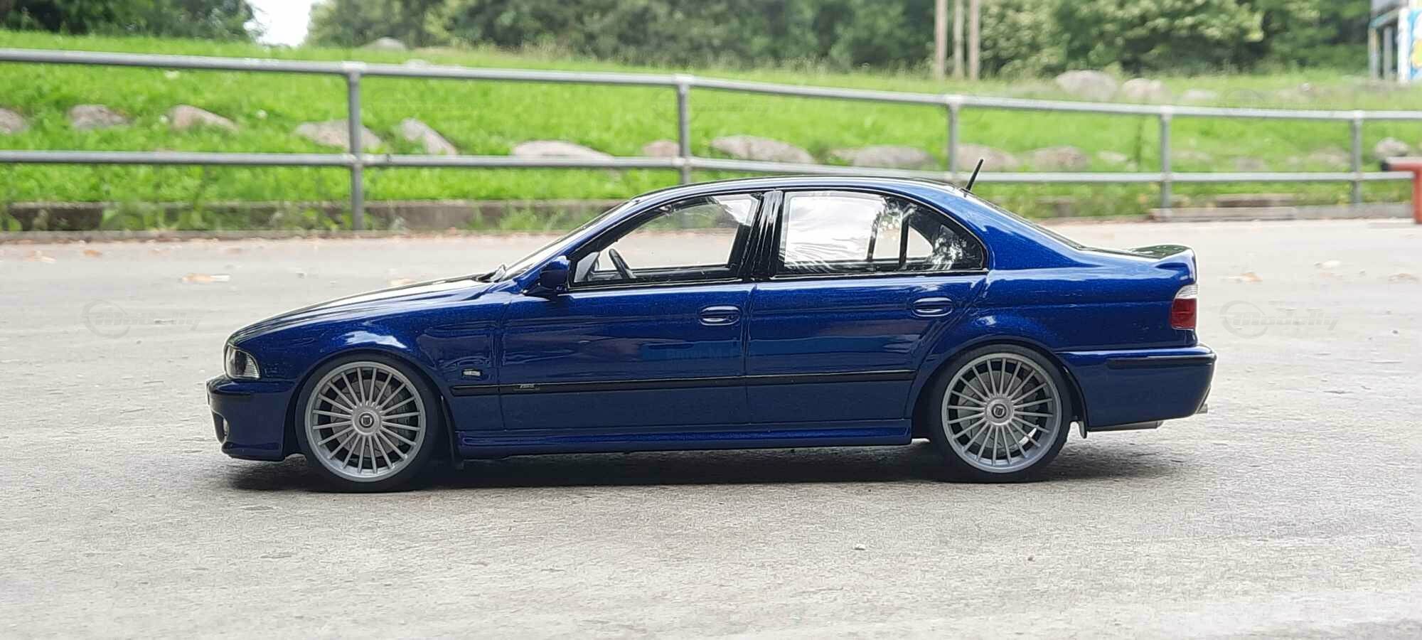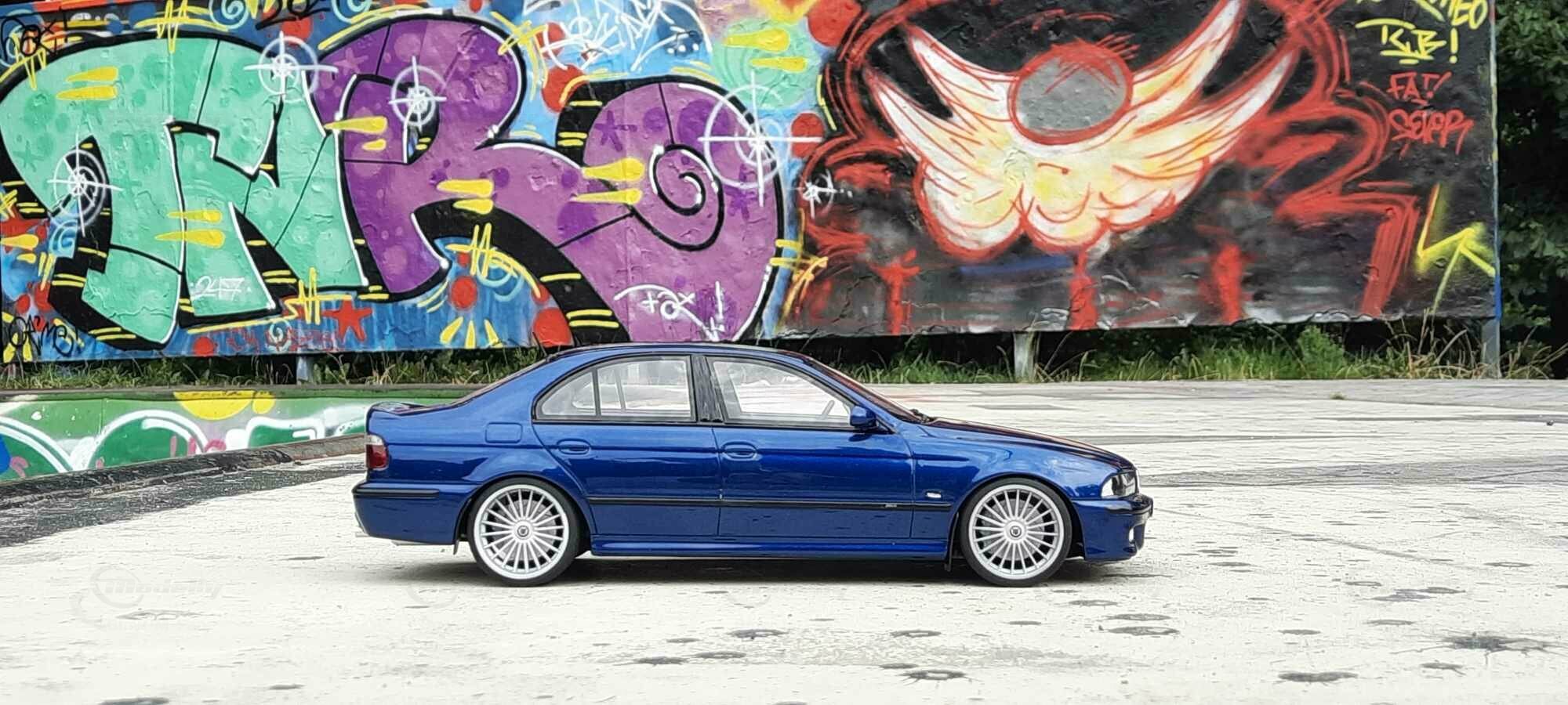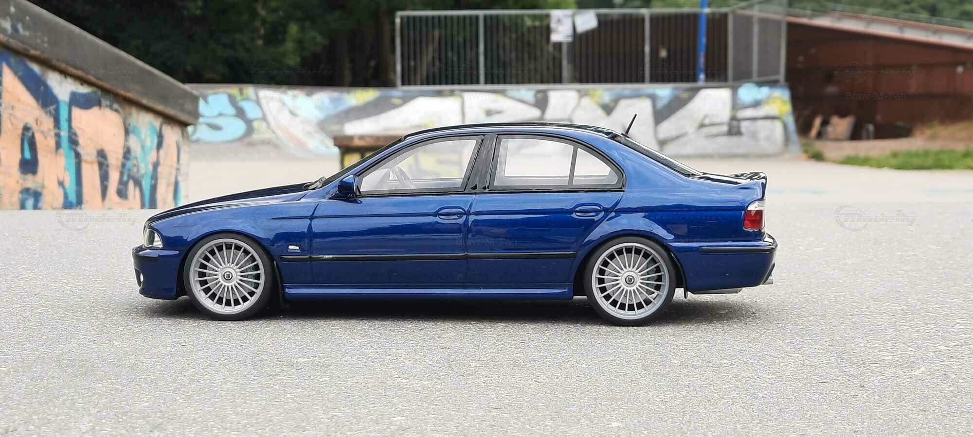 The miniature of BMW E39 M5 in 1/18 scale impresses with its deep blue paintwork, reflecting the elegant and sporty character of the original. The collector "Bmw-M-Fan" has added a special piece to his collection with this model. The wheels and possibly other specific details indicate modifications that individualize the model. The headlights, taillights, and grille have been meticulously replicated, giving the model an extremely realistic appearance. These customizations and details ensure that this model car possesses a high degree of authenticity and collector value.